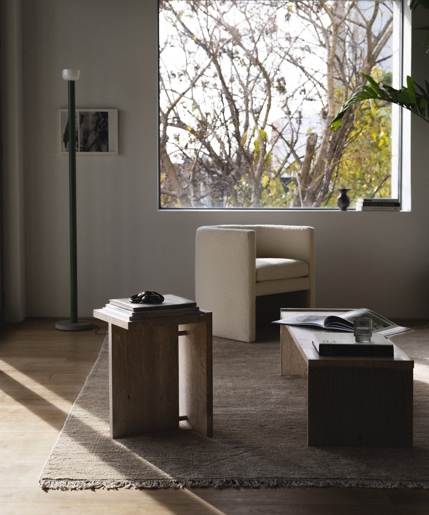 For bringing this collection to life, we turned to Portugal - a country with a centuries-old history of stone artisanship. Each table is using thick, solid slabs of raw travertine or honed stone and marble combined with metal rods for material contrast and unyielding structural support. (Please note, raw travertine has open pores, giving it an organic, textural surface.)