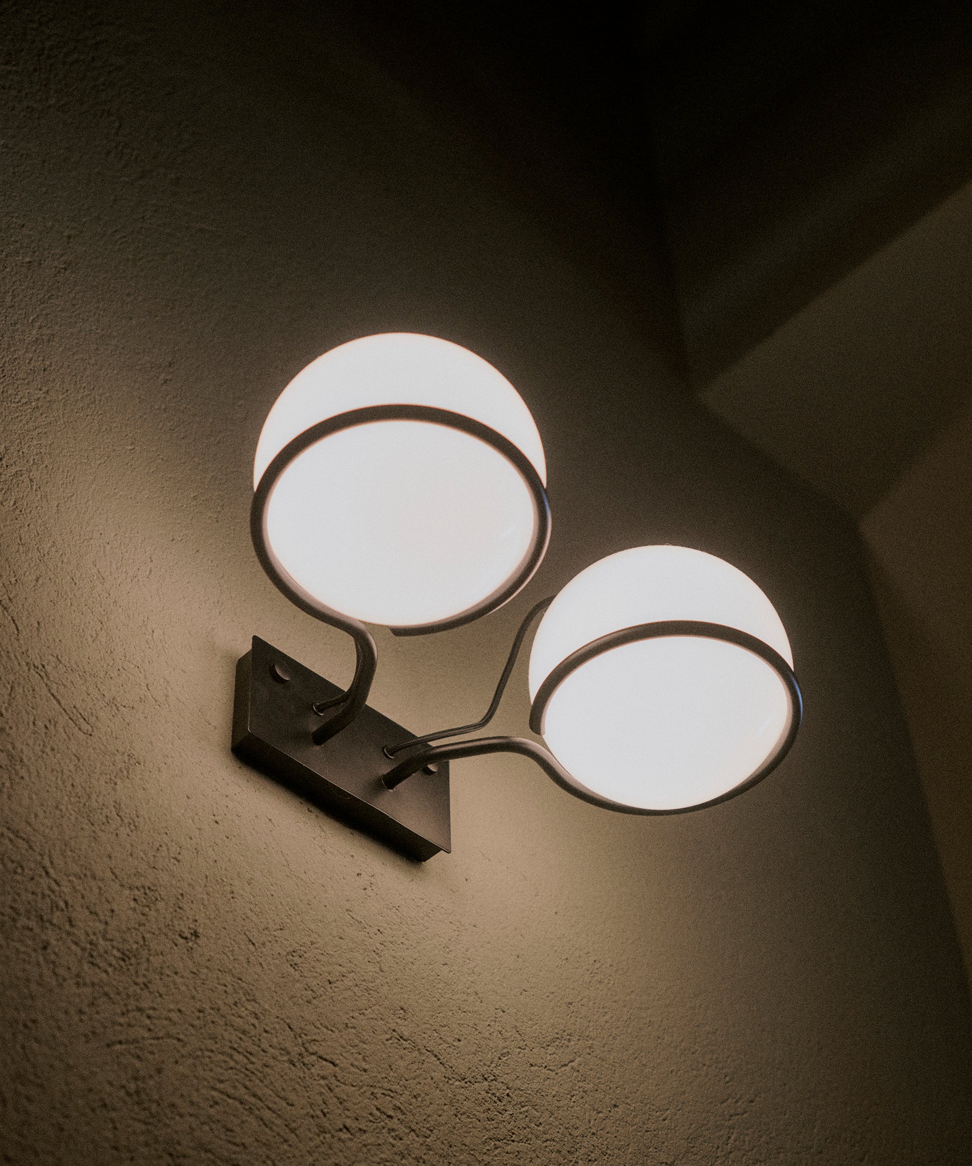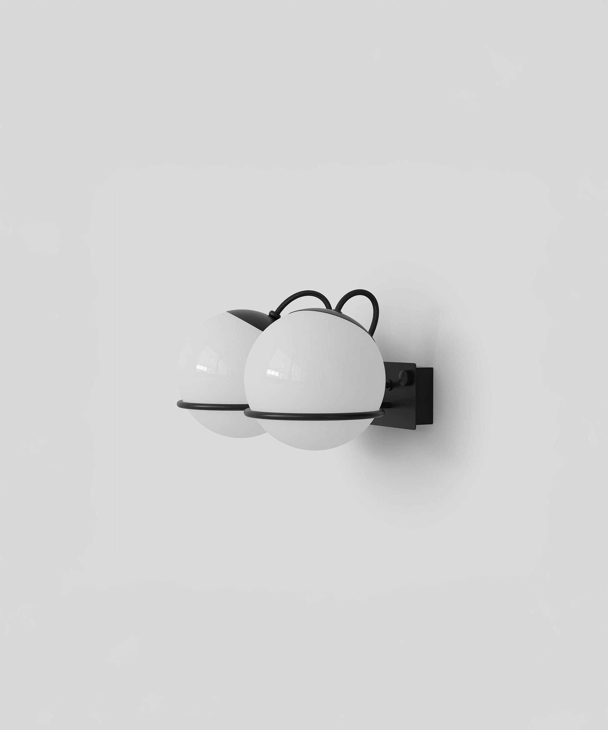 The two blown opaline glass spheres are gently held in place by two Black, or Champagne, painted steel rings.