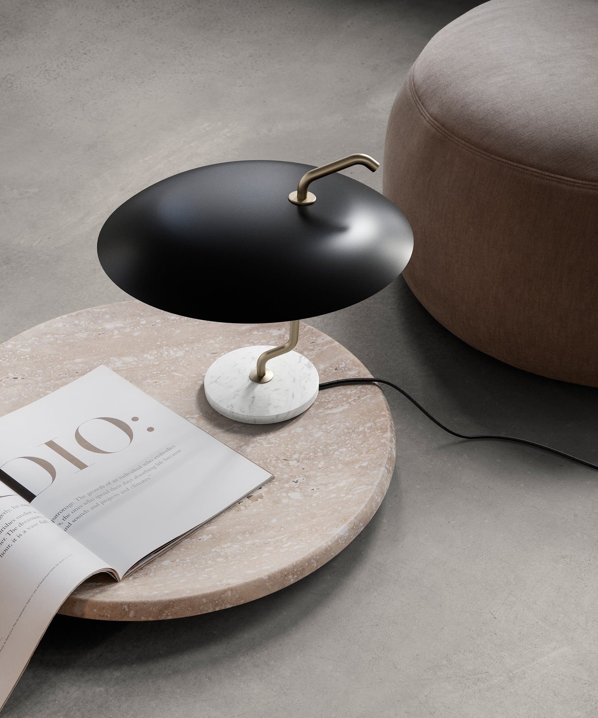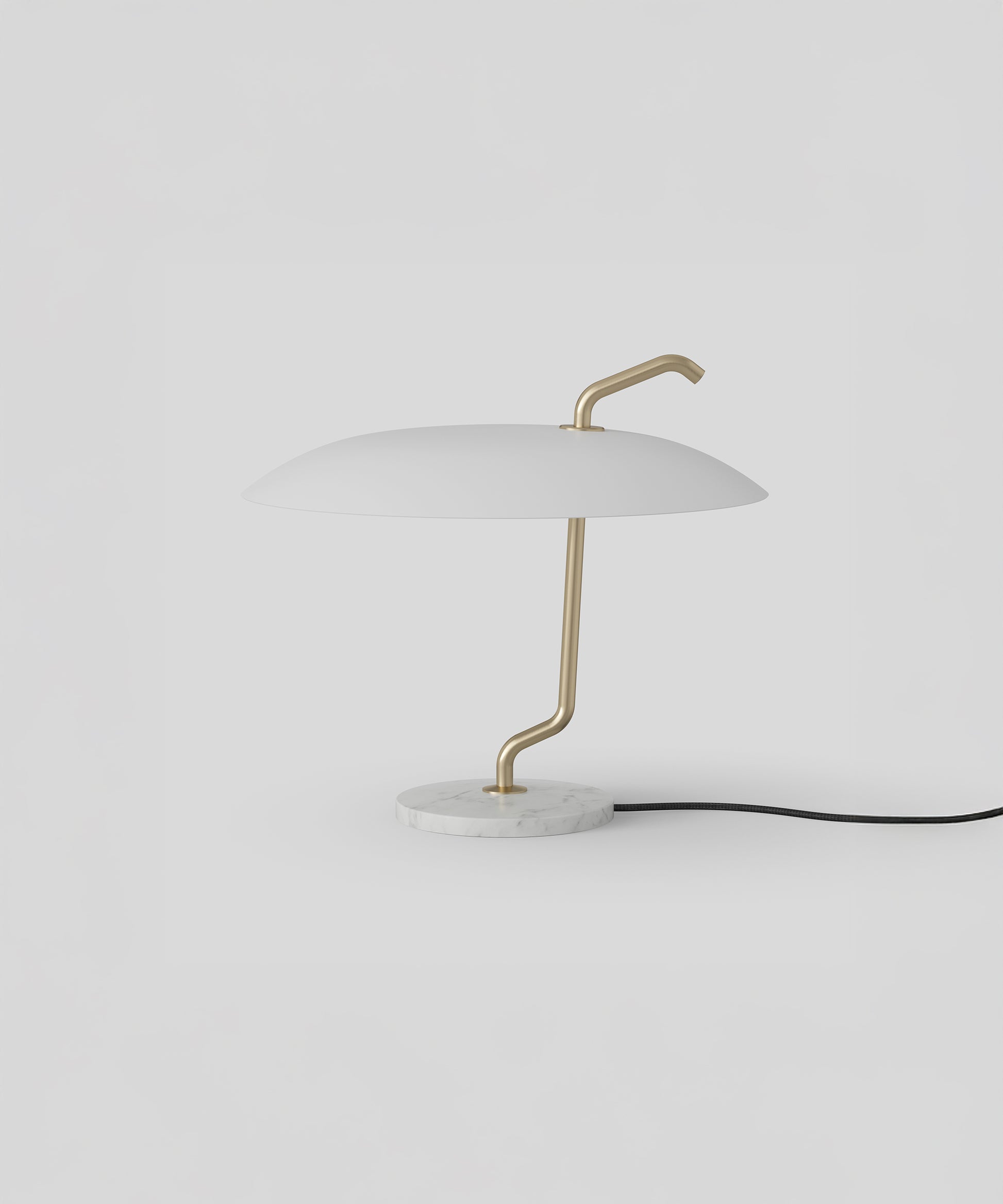 The large aluminium reflector in black or white is mounted asymmetrically on a lacquered or brushed brass stem, which is carefully twisted in a beautiful balancing act, coming to rest on an elegant marble base. As a vital part of the design, the stem reaches out through the reflector and beyond in a backward motion, giving the top of the stem a dual function as playful feature and practical handle.