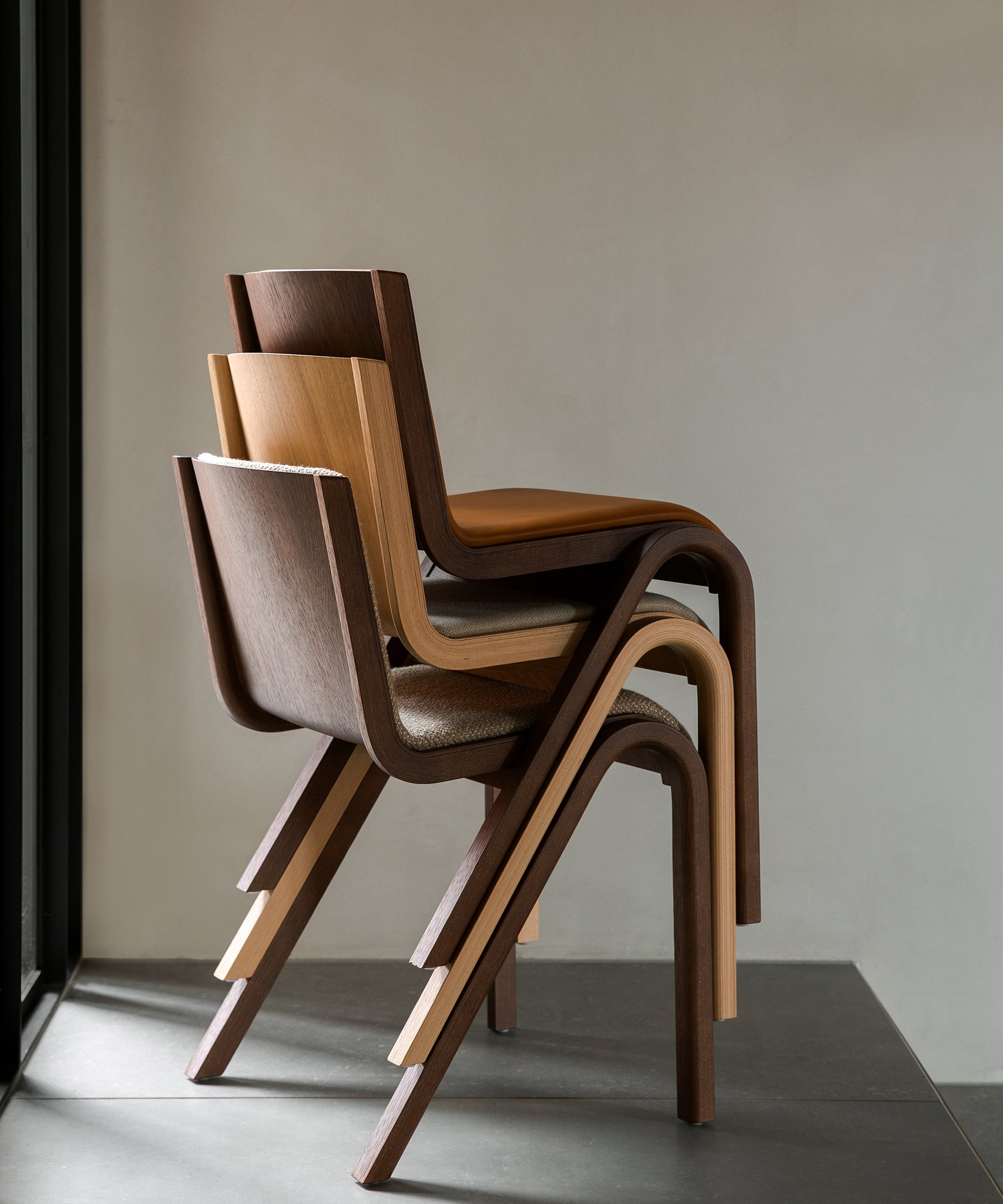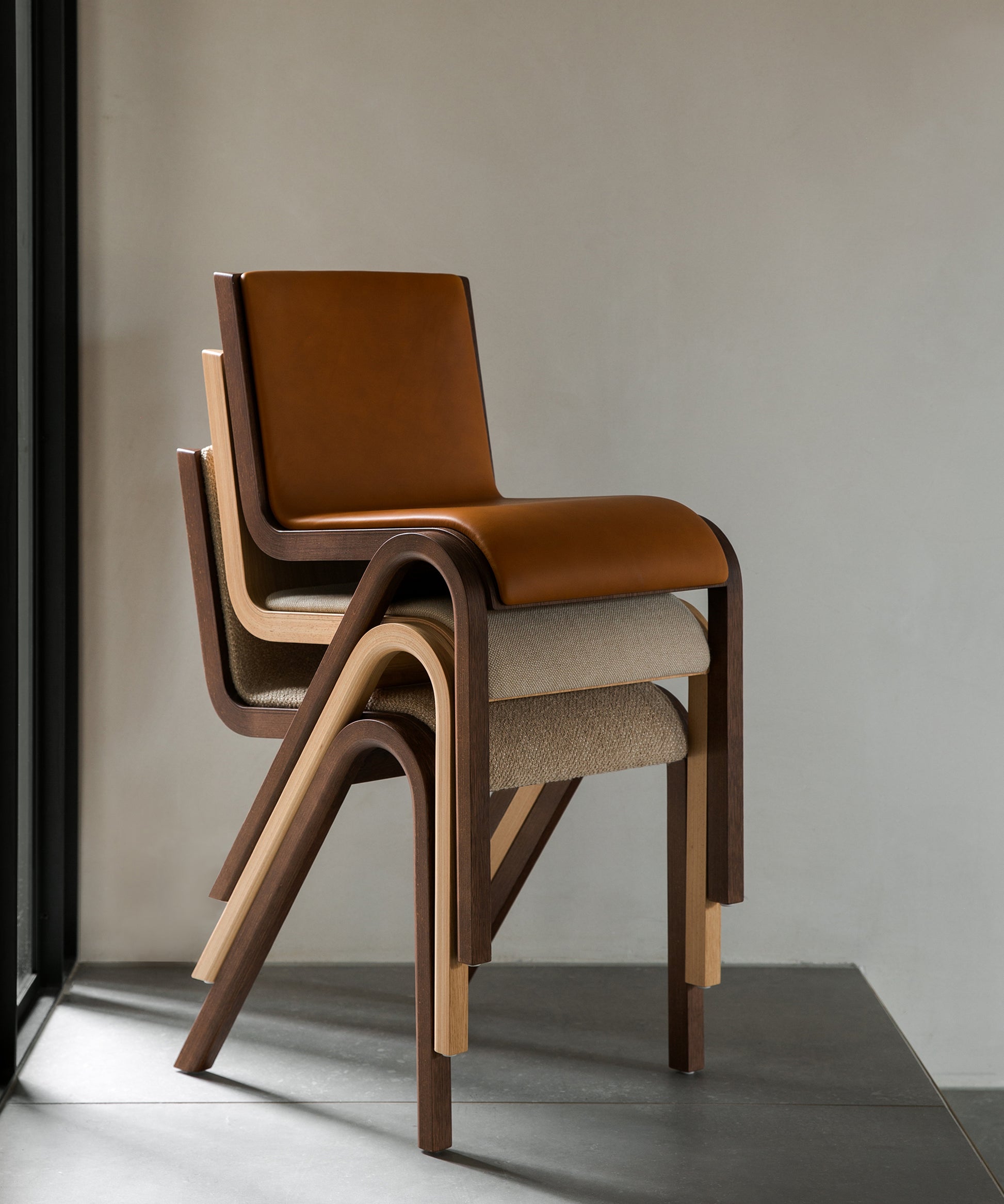 Deceptively simple in its design yet featuring a wealth of details, Ready's cantilevered seat and backrest appear as if suspended on air. Curved anterior legs add to the sense of lightness while visible joints draw the eye. Shaped from FSC-certified oak veneer, it is offered in a natural or red stained oak with a water based lacquered finish and offered with or without seat or full front upholstery, the pared-back dining chair showcases precise craft and natural materials to functionally beautiful effect. As an added feature, the upholstery can easily be changed by loosening 4 screws. Row Connection allows you to join individual Ready Dining Chairs together in a line, making it ideal for use in conference facilities. The bracket is made of strong aluminium and is easy to connect and disconnect. It can be turned under the seat when not in use. The Ready Dining Chair can be stacked with 10 chairs with and without the Row Connection.