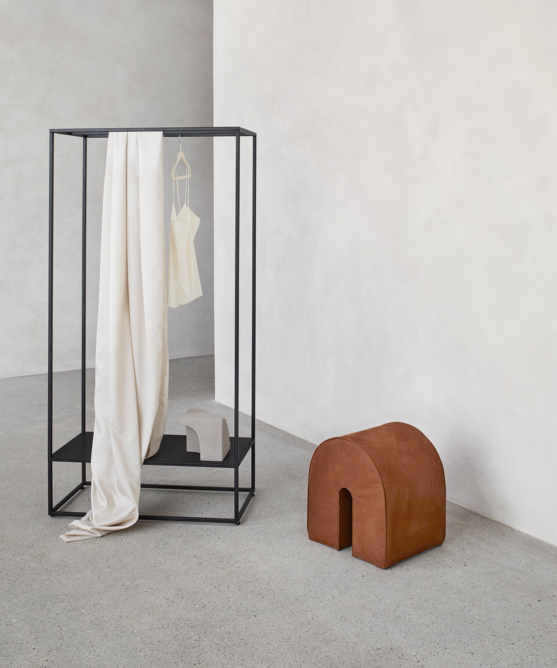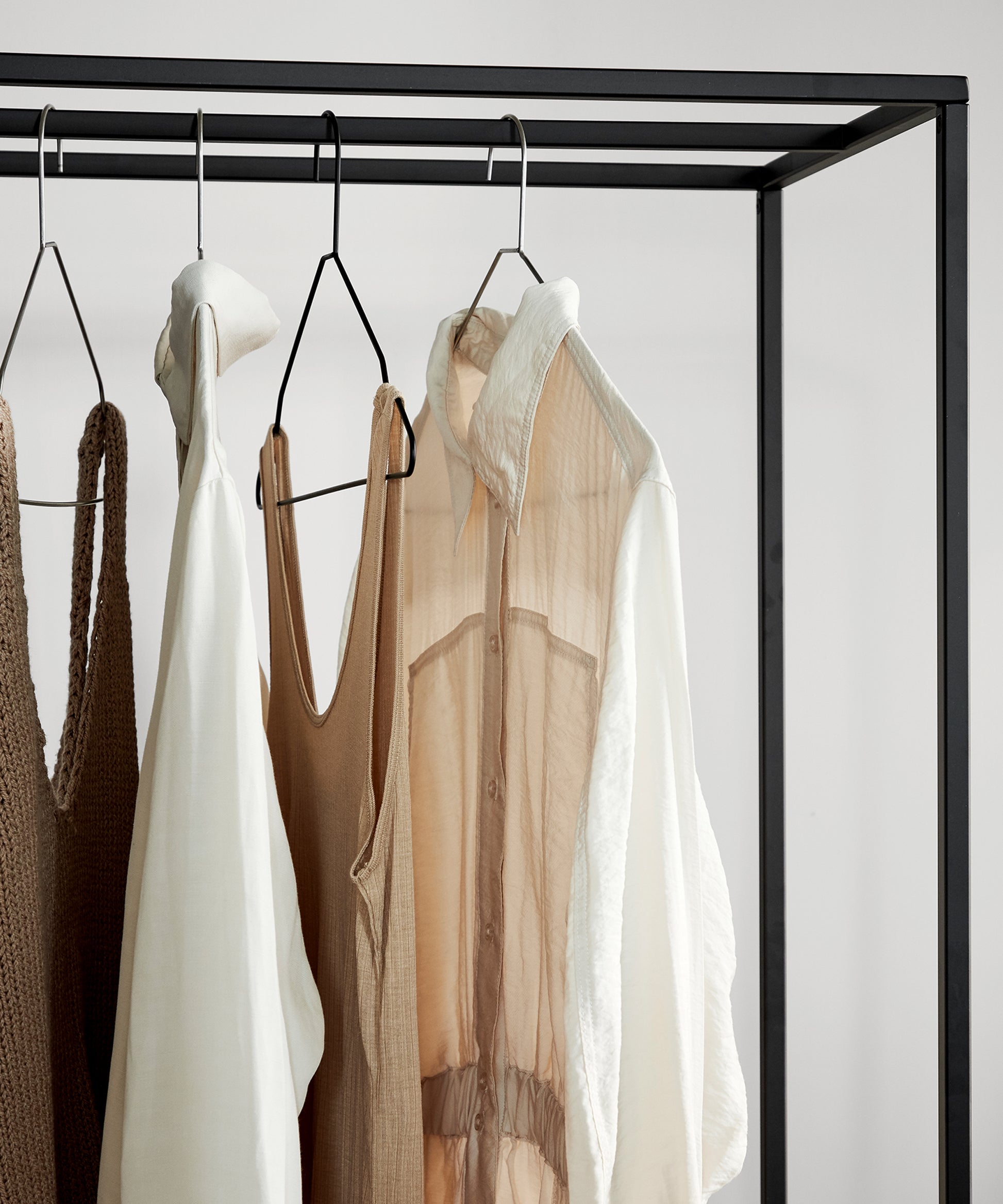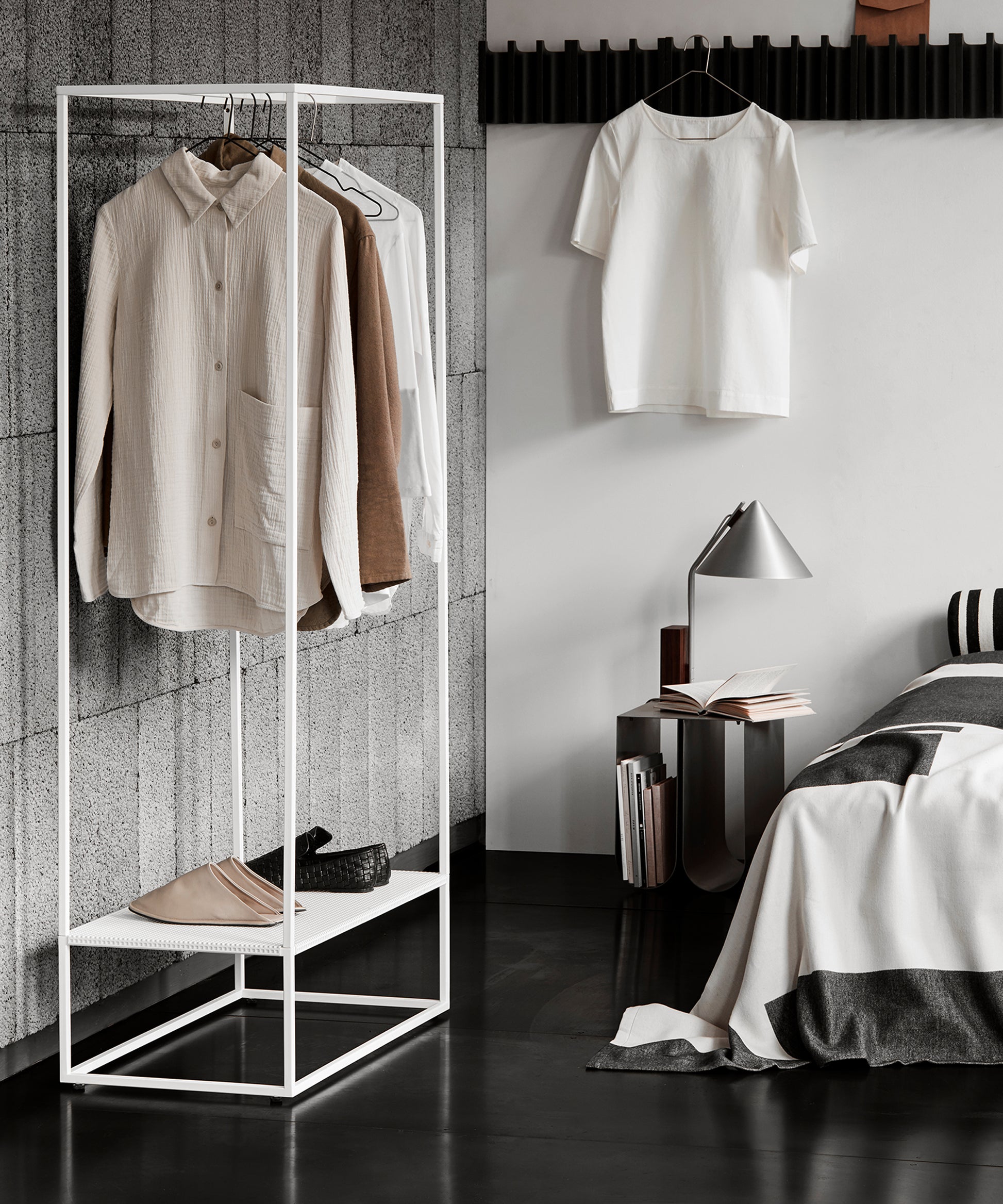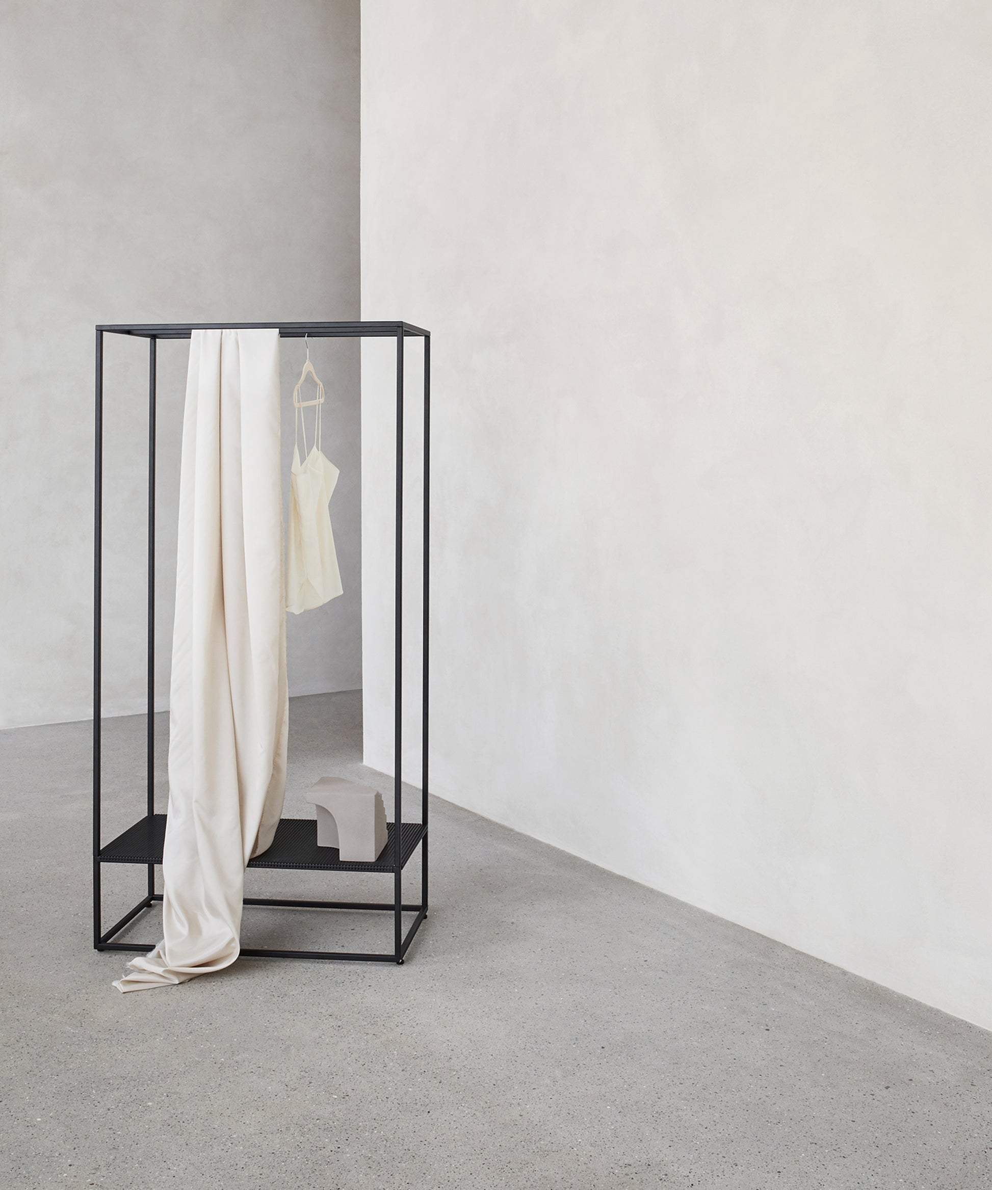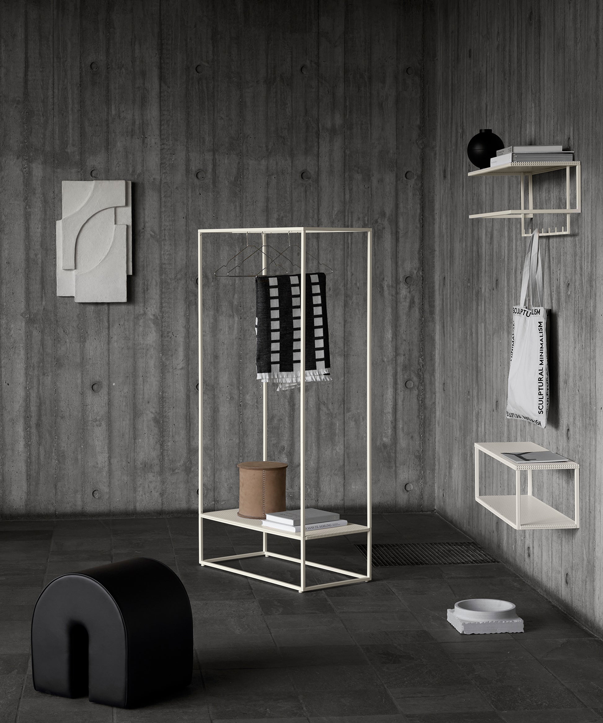 The steel frame of the rack is simple, elegant, and stable. Grid Coat Stand is available in black and beige powder-coated steel.