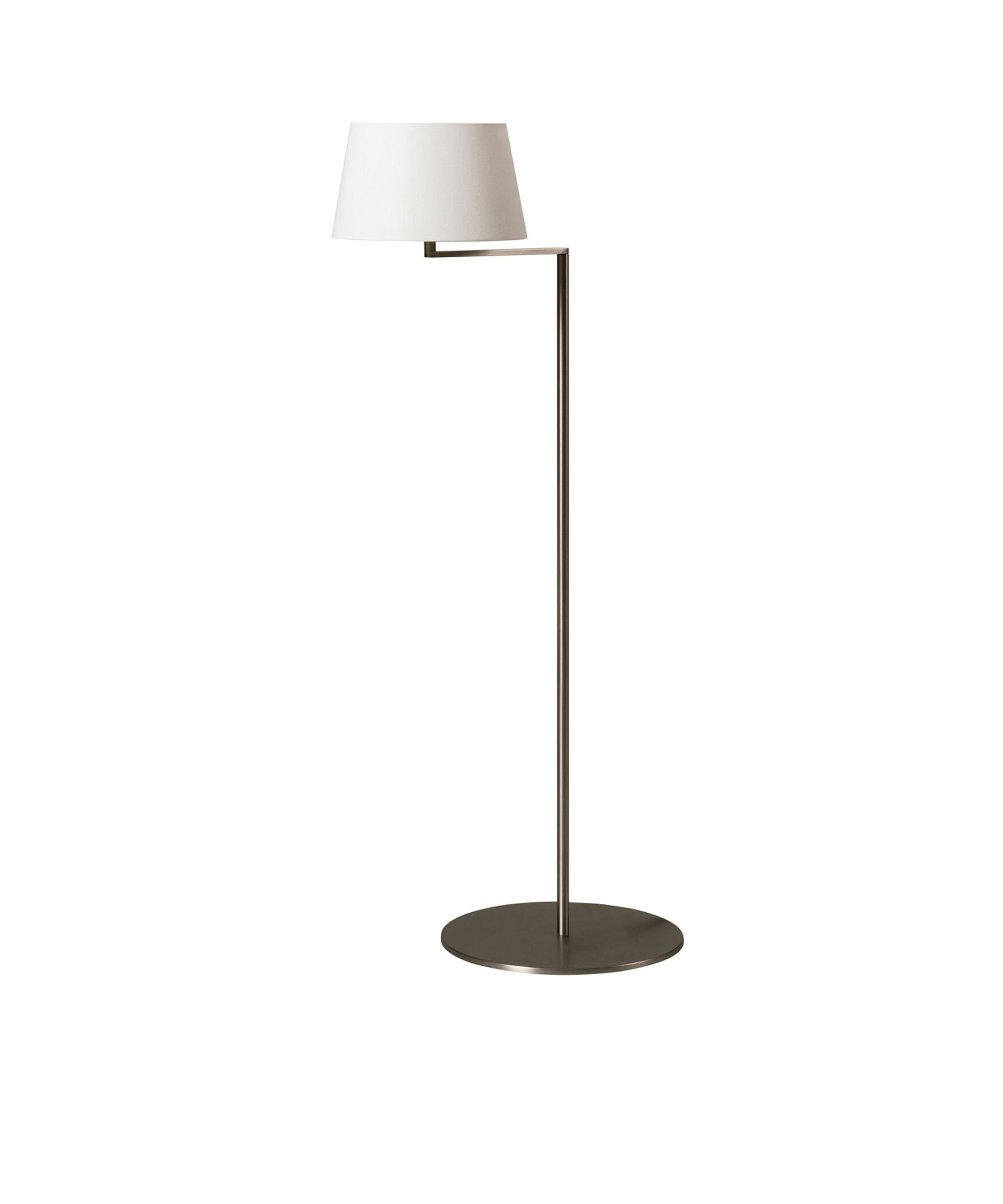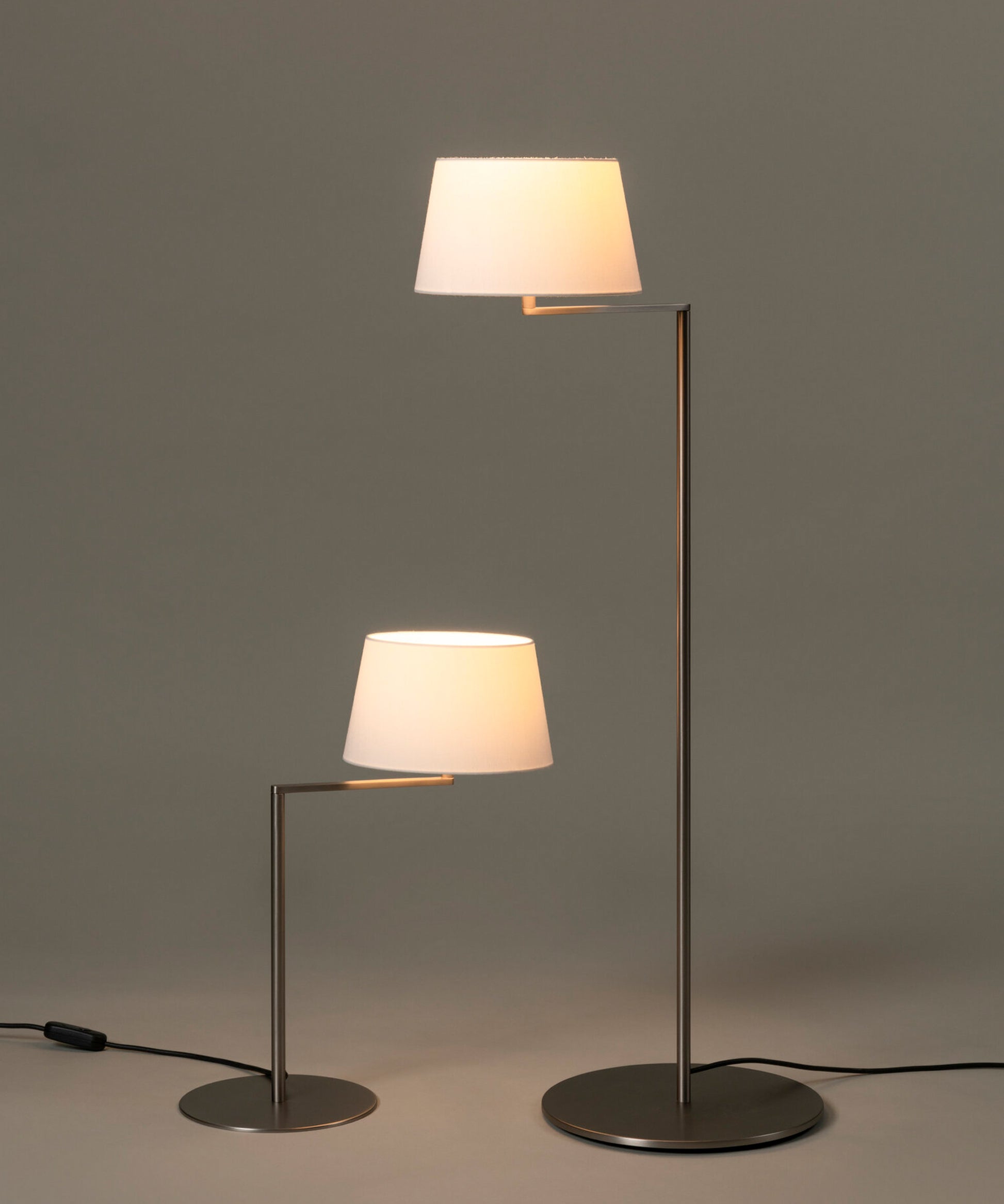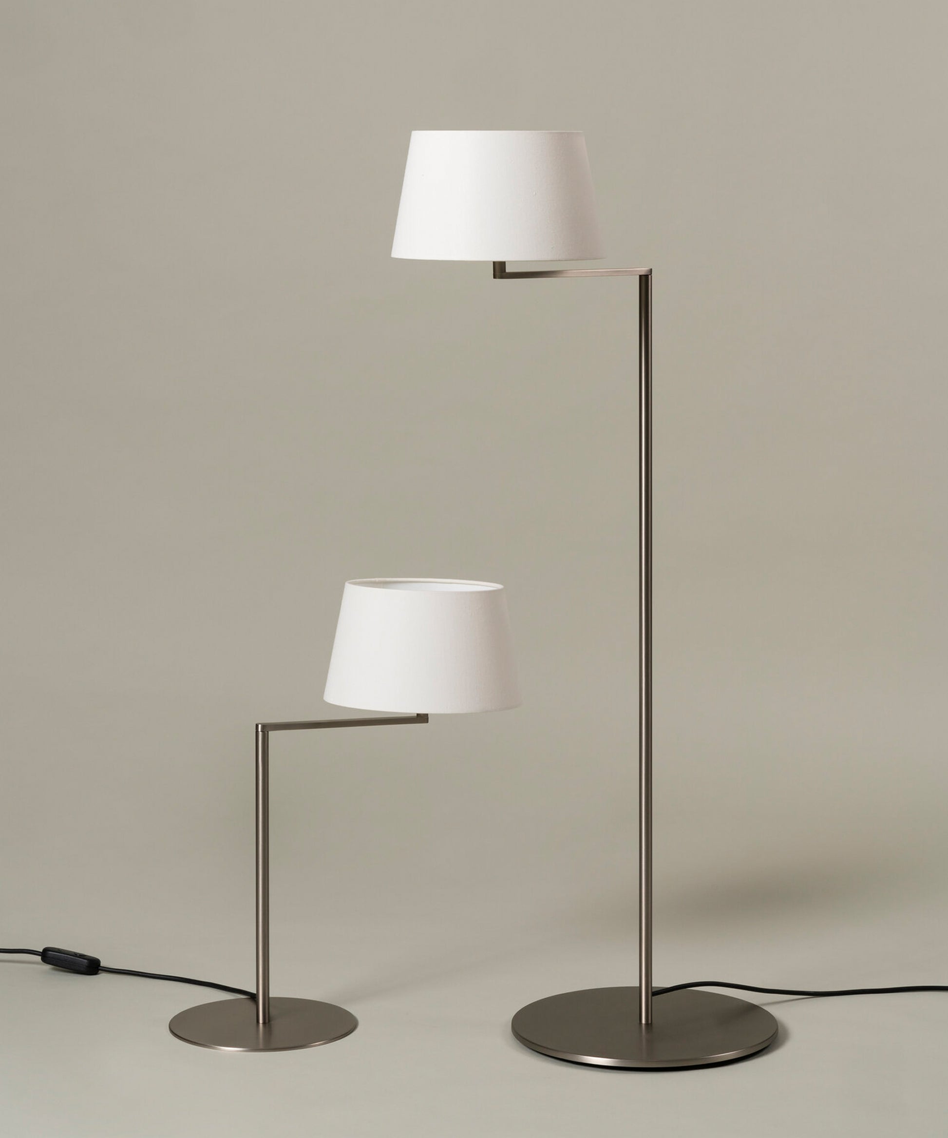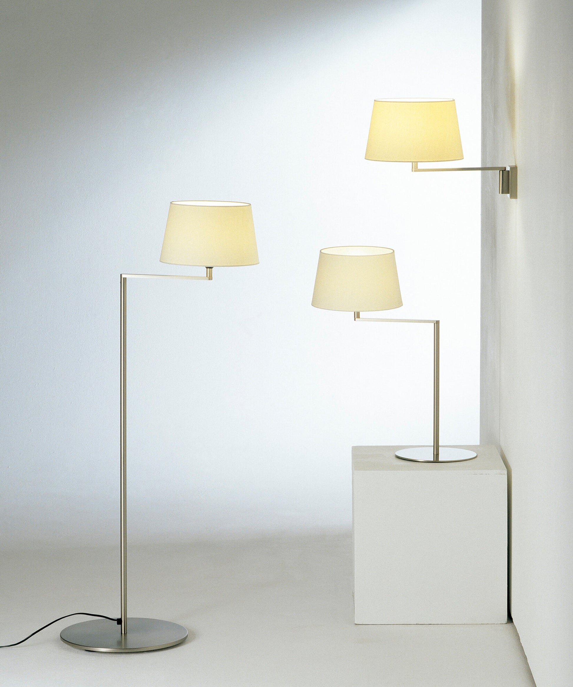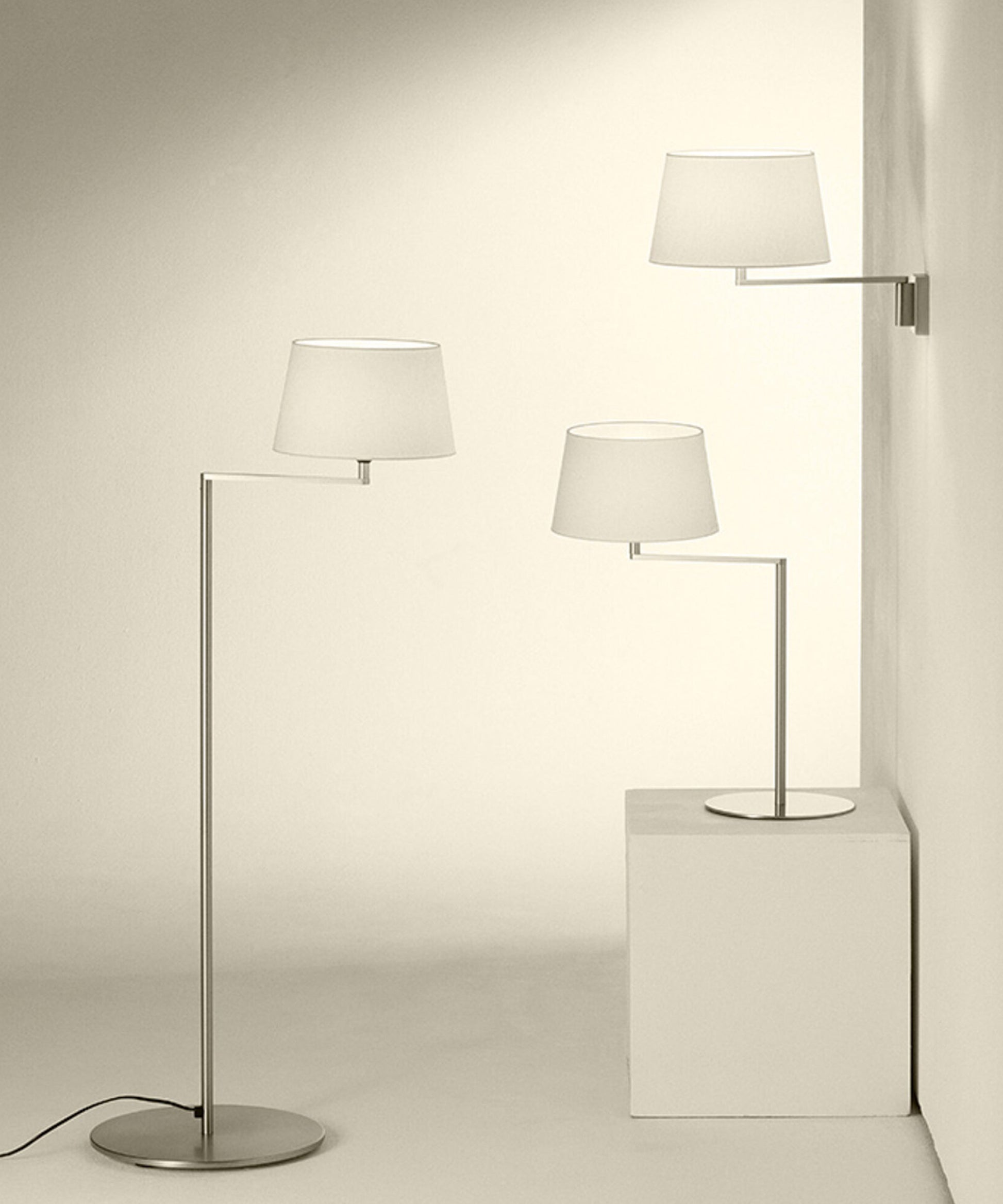 The Americana series is built around a satin nickel articulated arm that supports an elegant white linen shade.