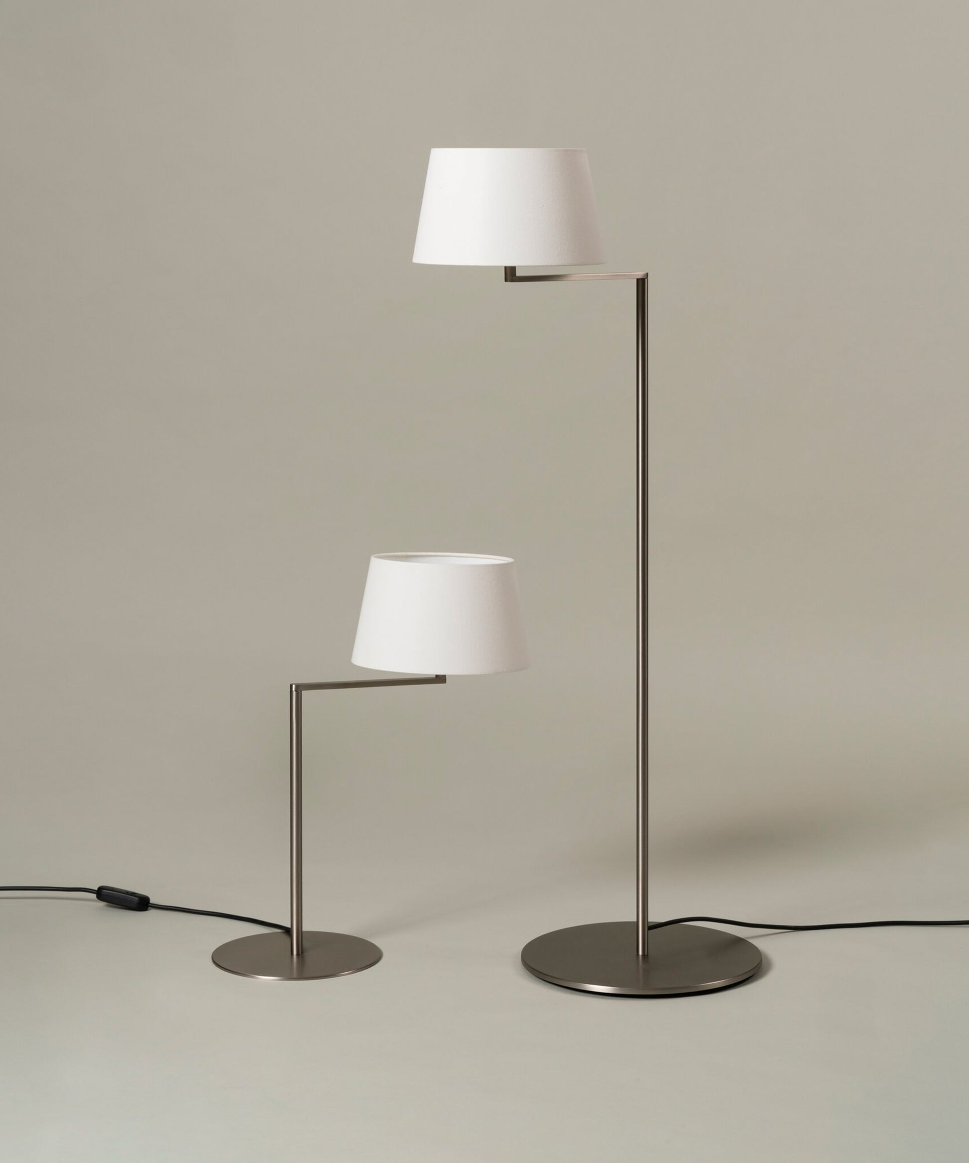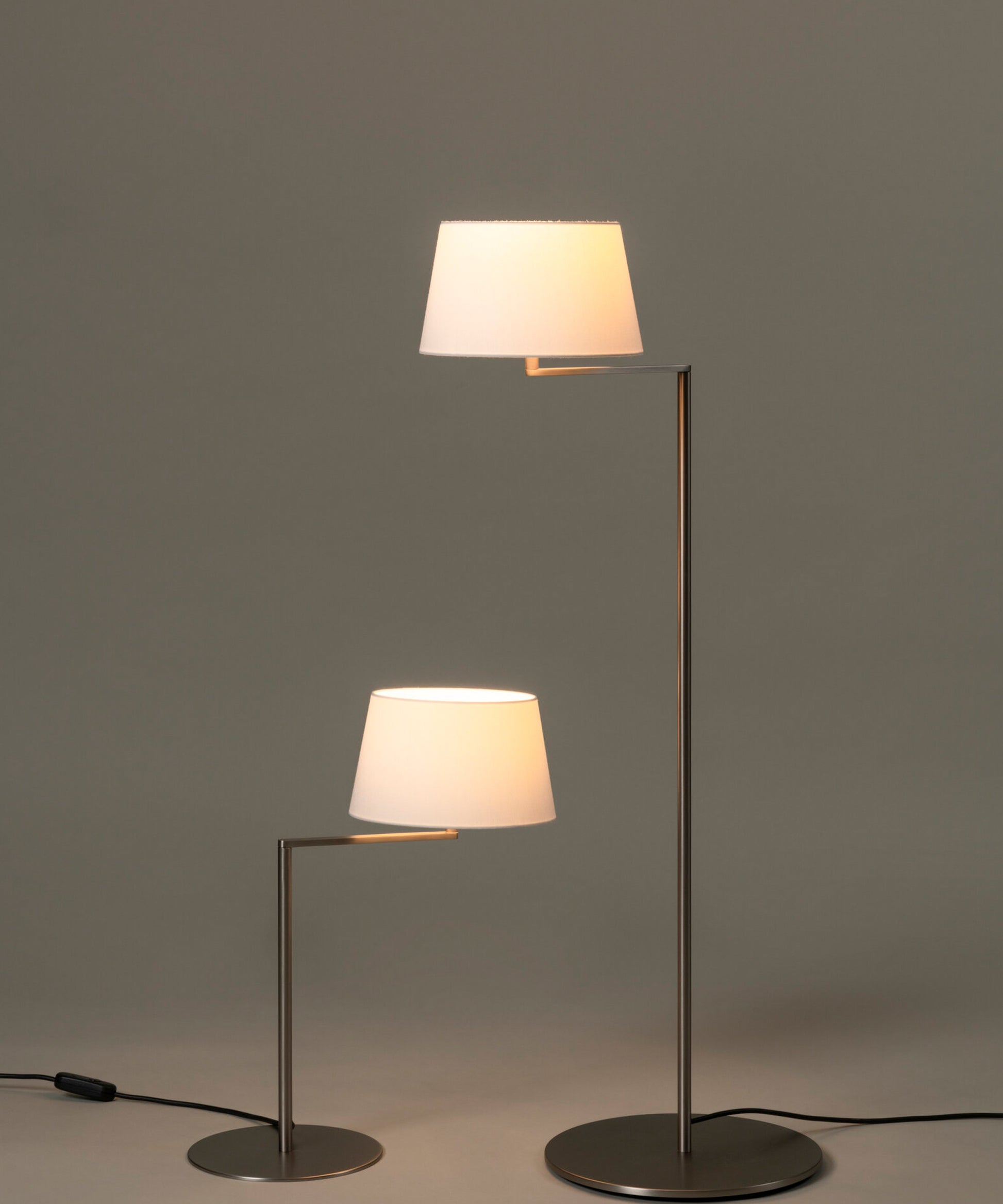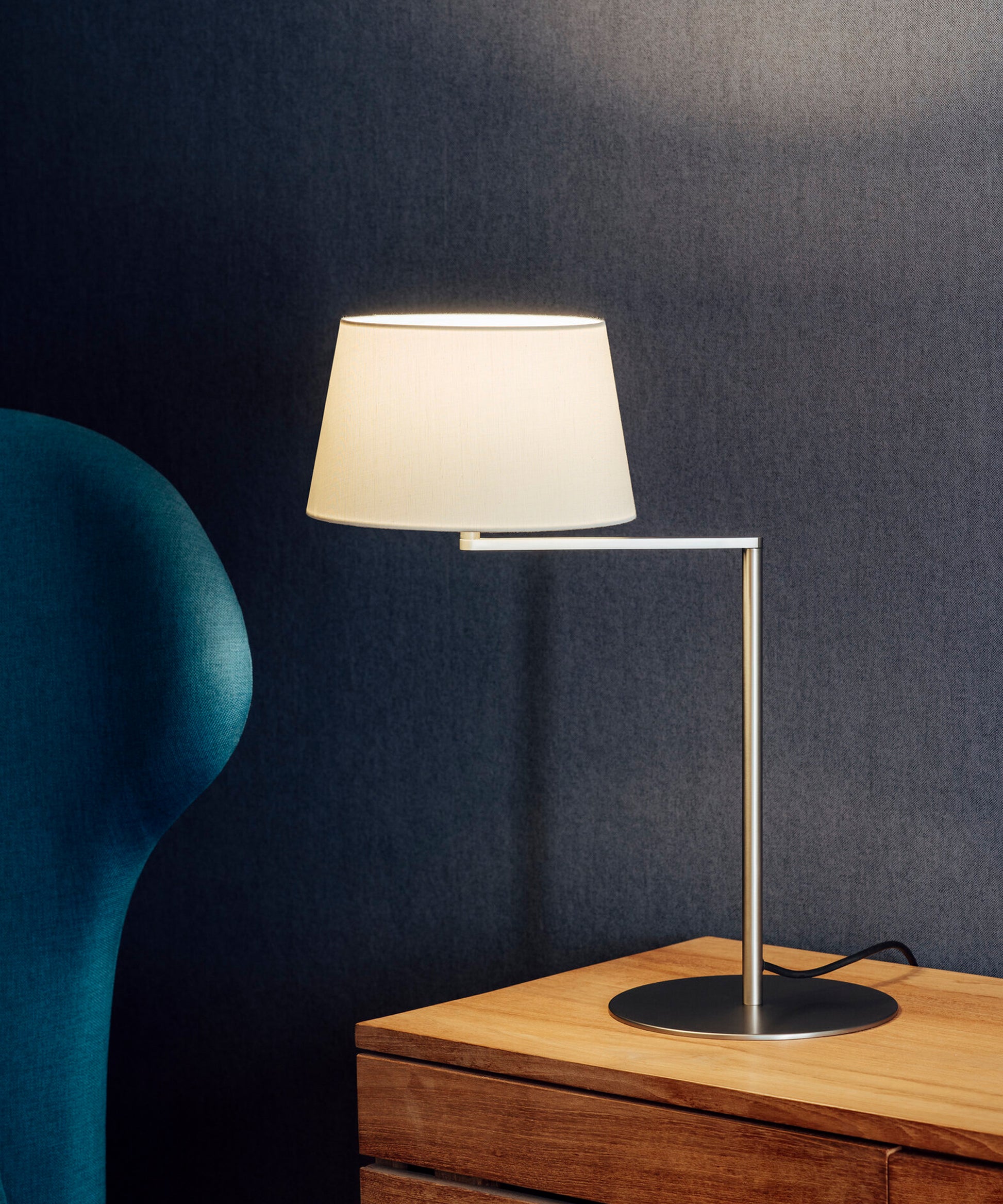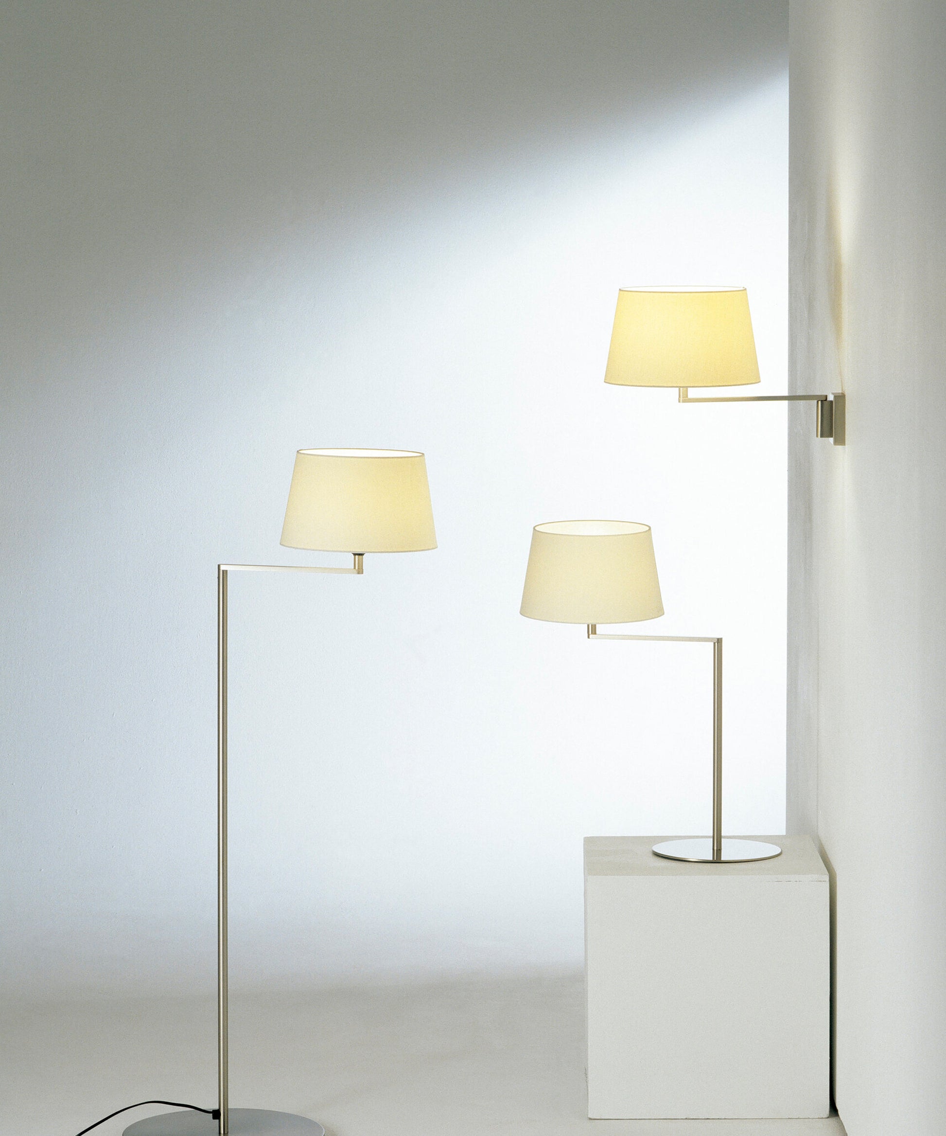 The Americana series is built around a satin nickel articulated arm that supports an elegant white linen shade.