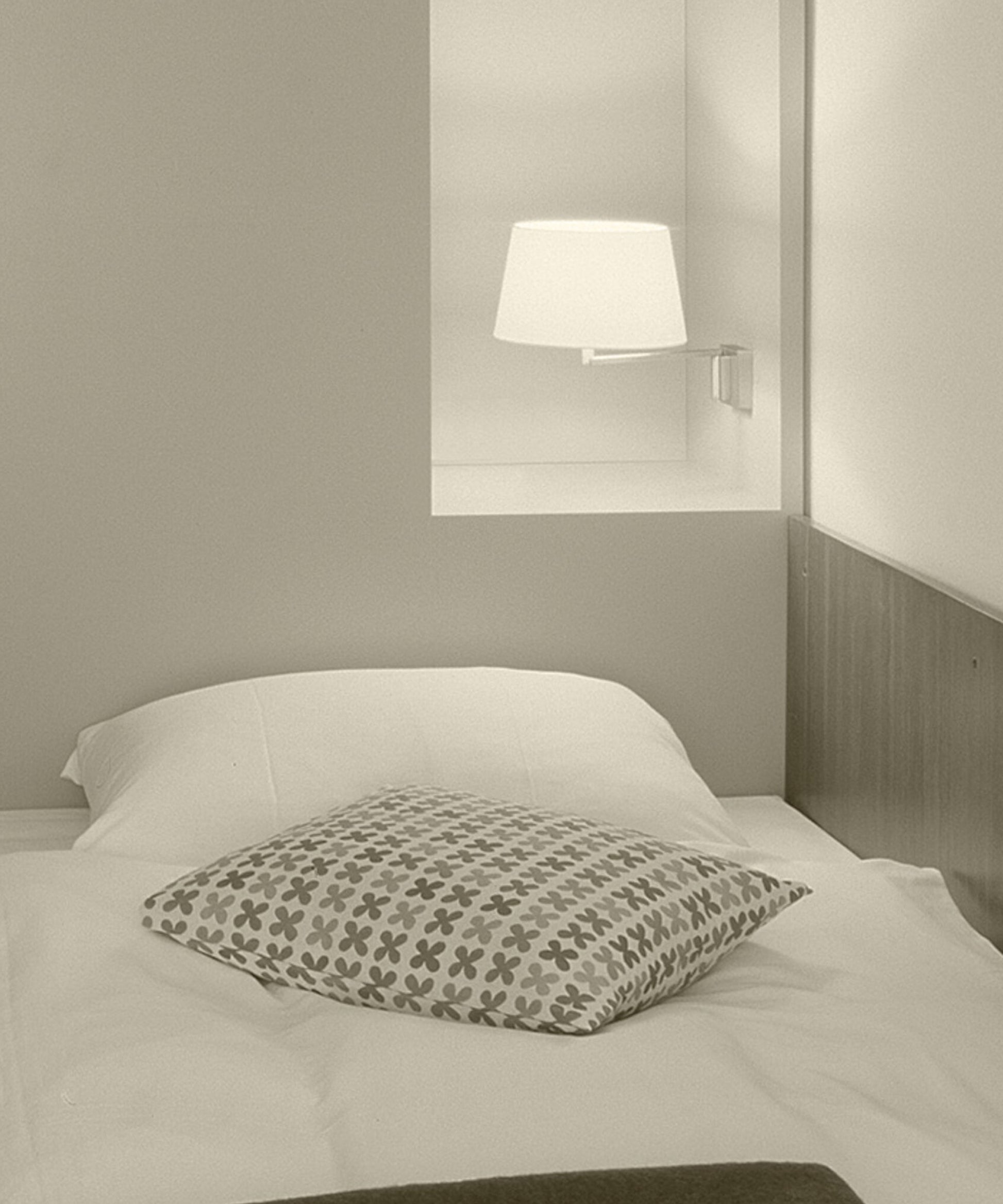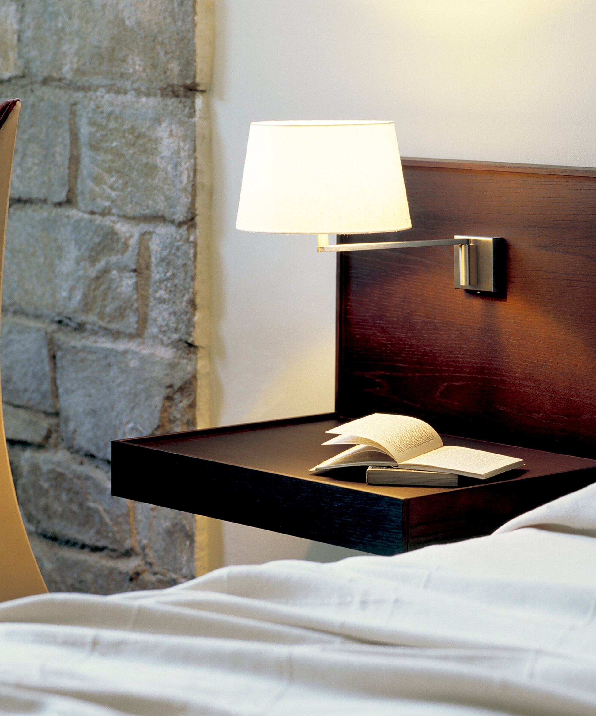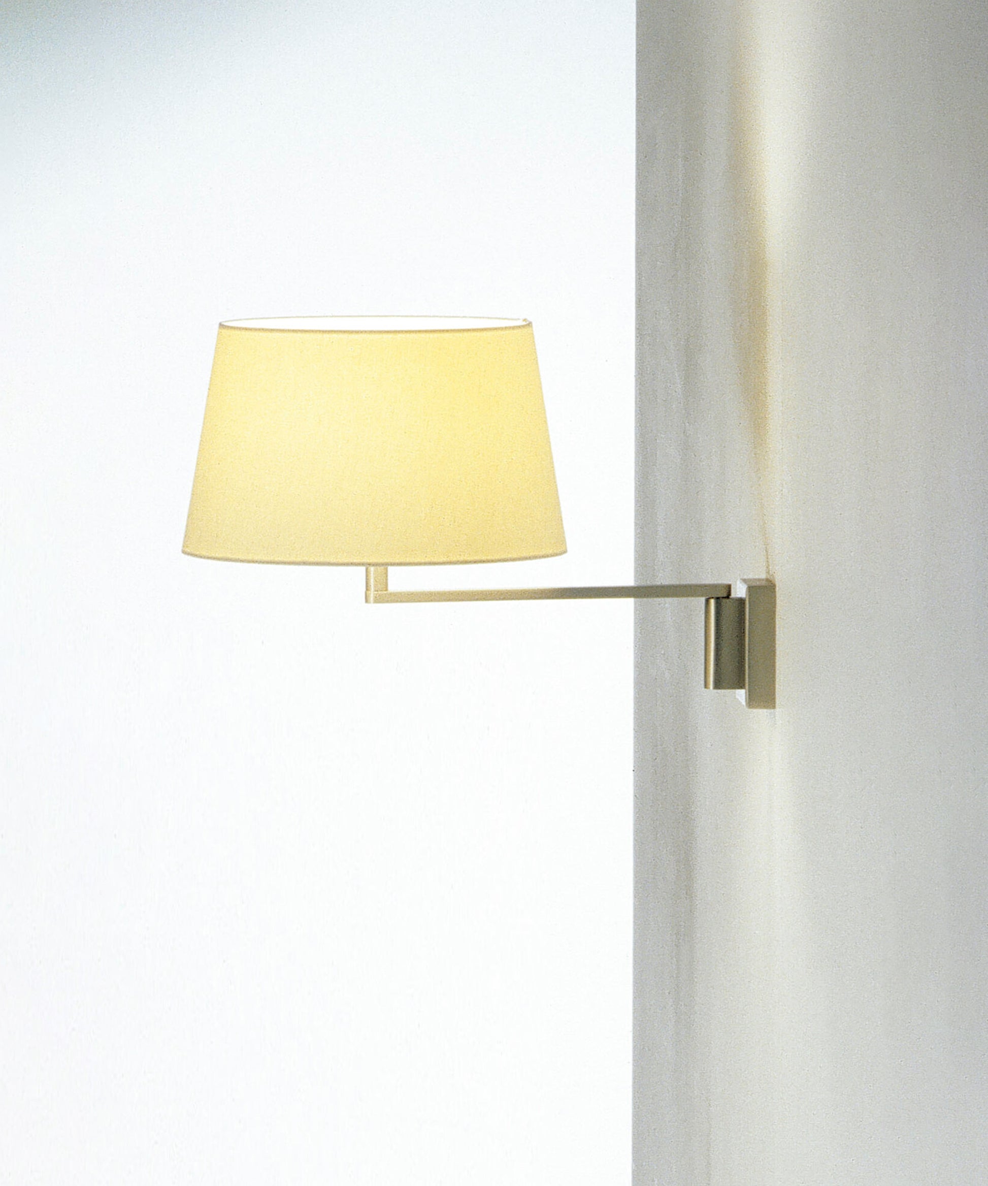 The arm moves it closer or further away by pivoting on its anchorage to the wall, in an evocation of the harmonic movement of the swing.