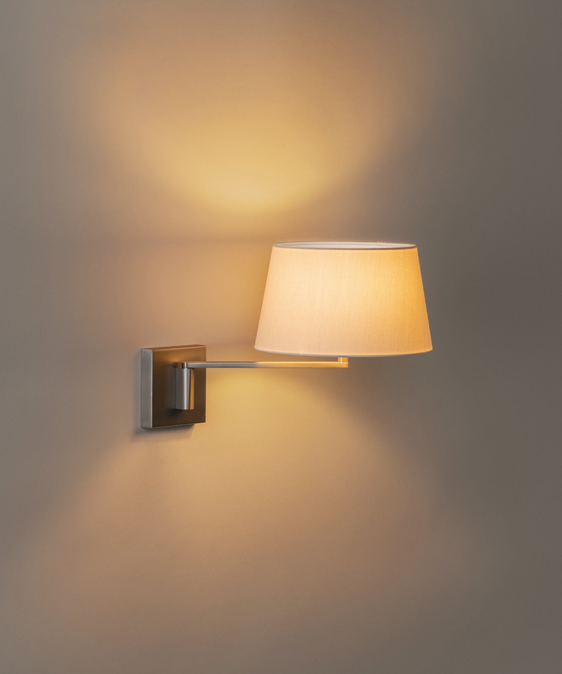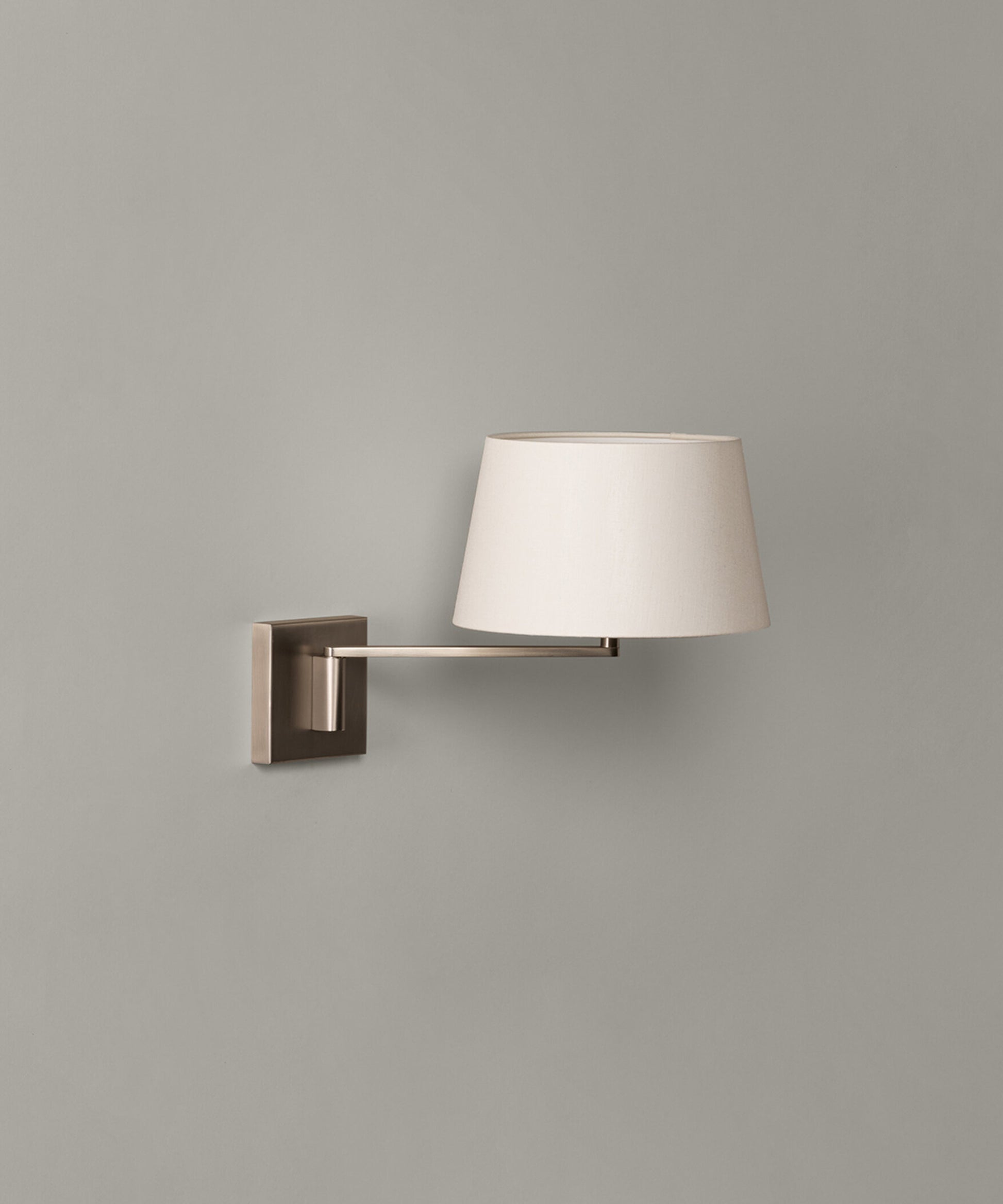 The Americana series is built around a satin nickel articulated arm that supports a white linen shade.