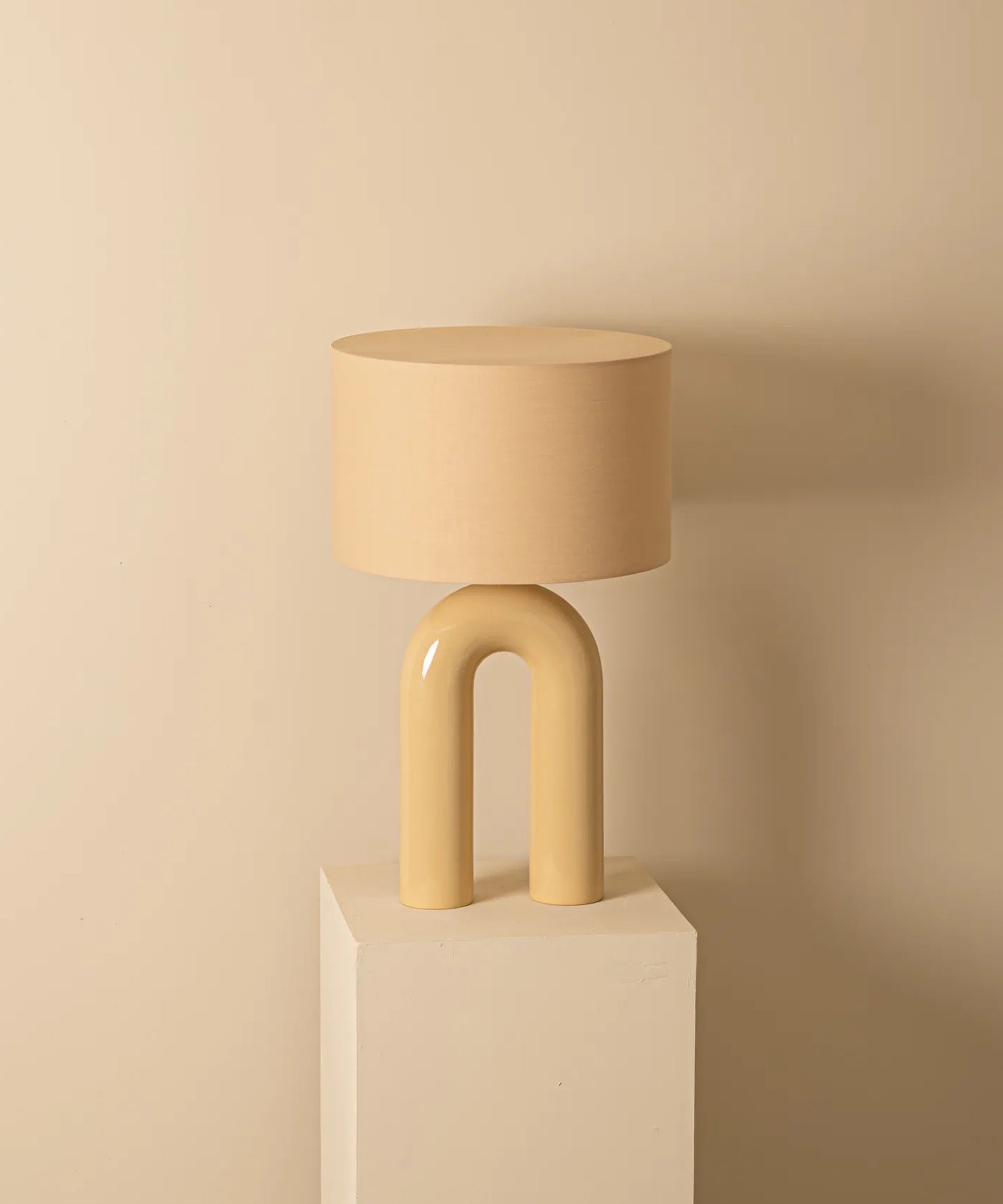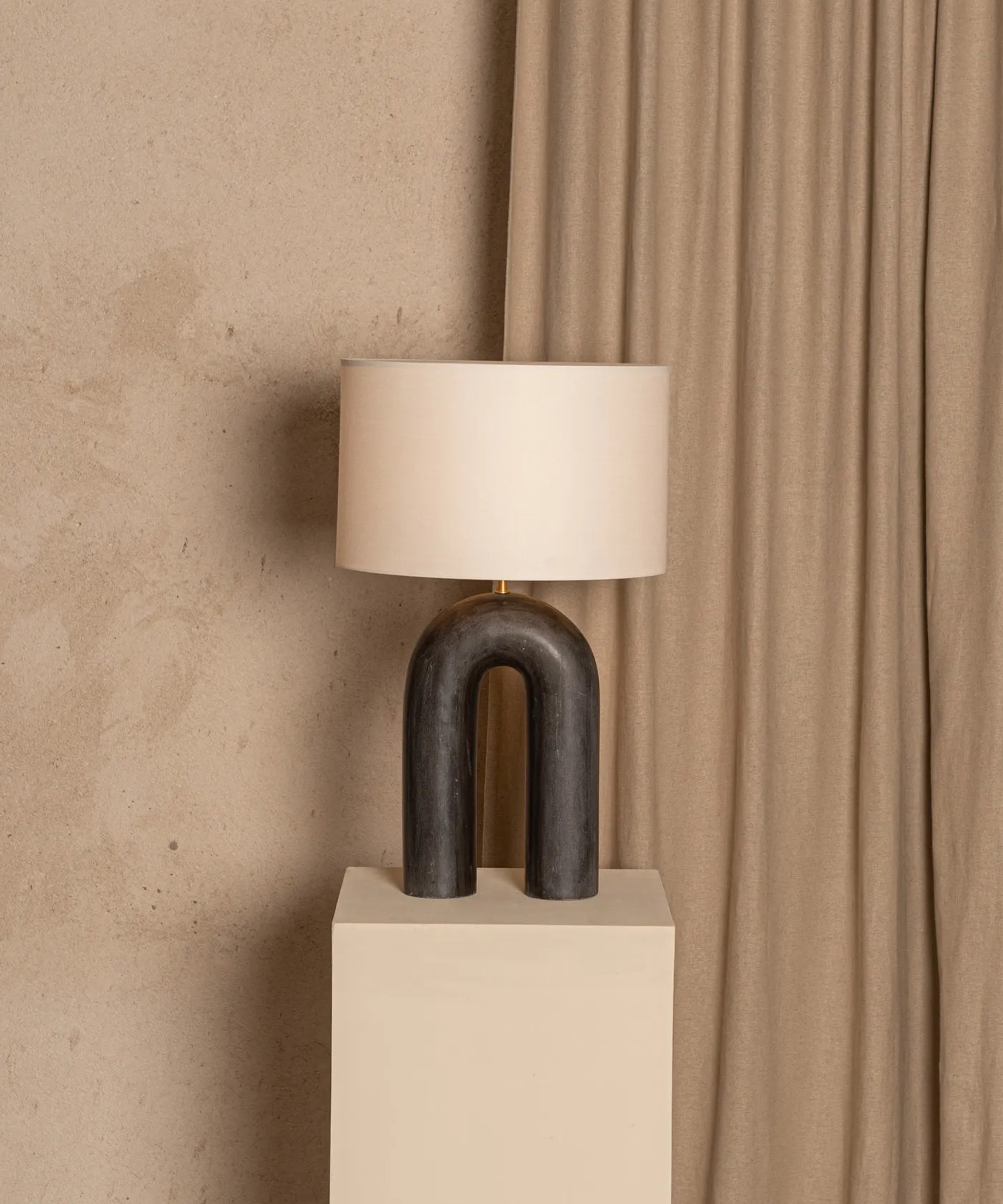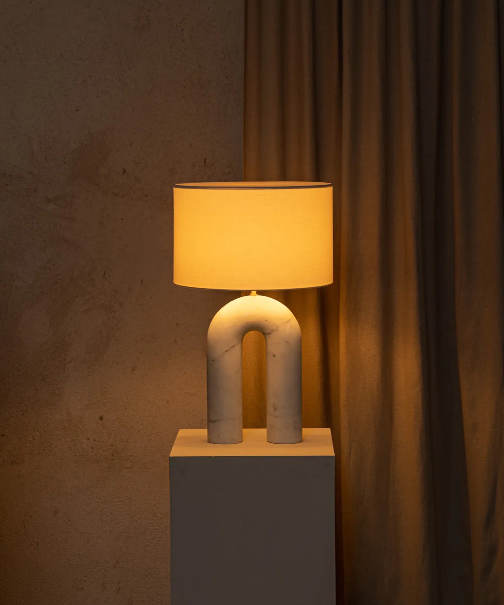 A unique cotton lampshade diffusing a soft and harmonious light and a wide selection of colors through two finish options, ceramic or marble.