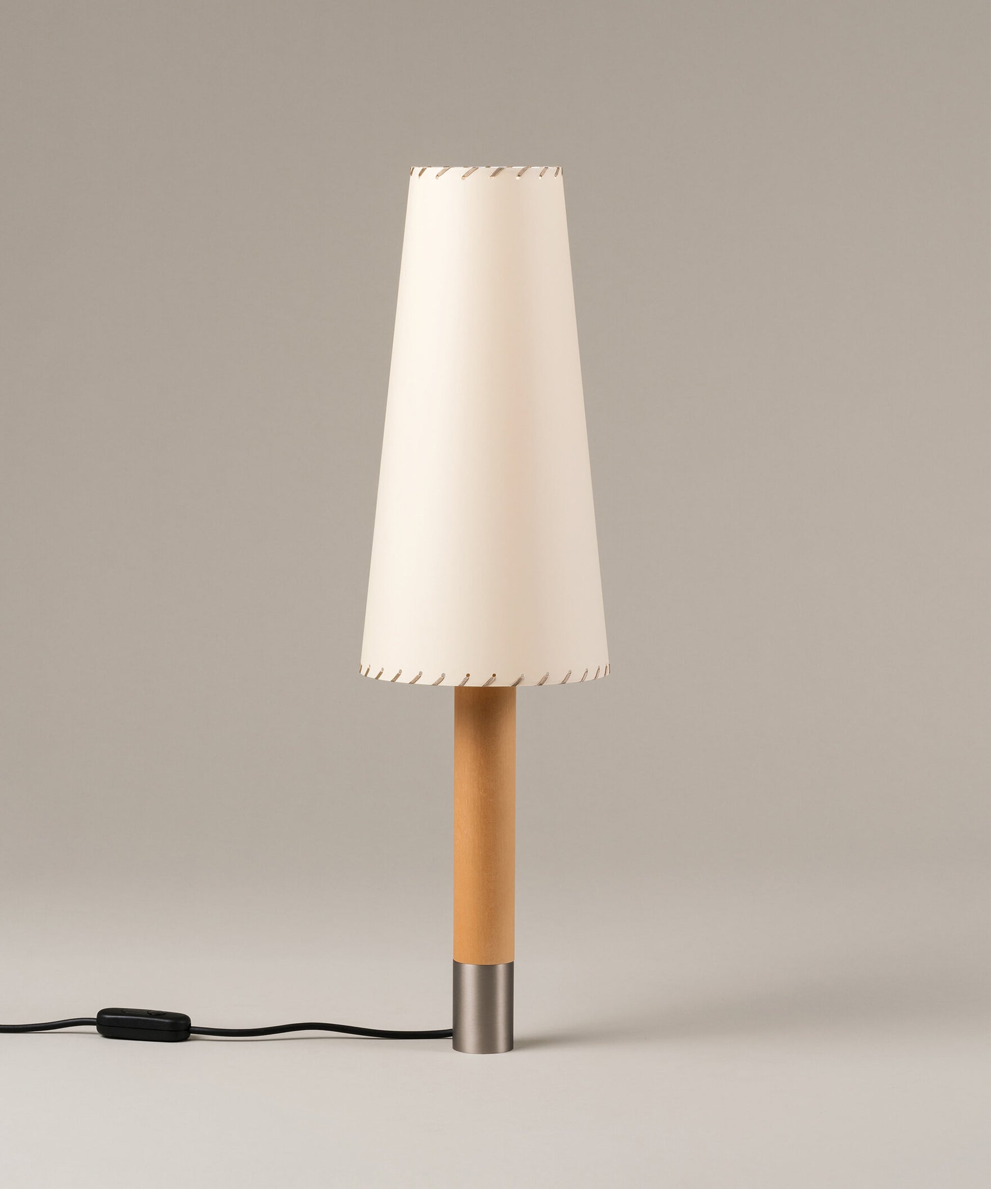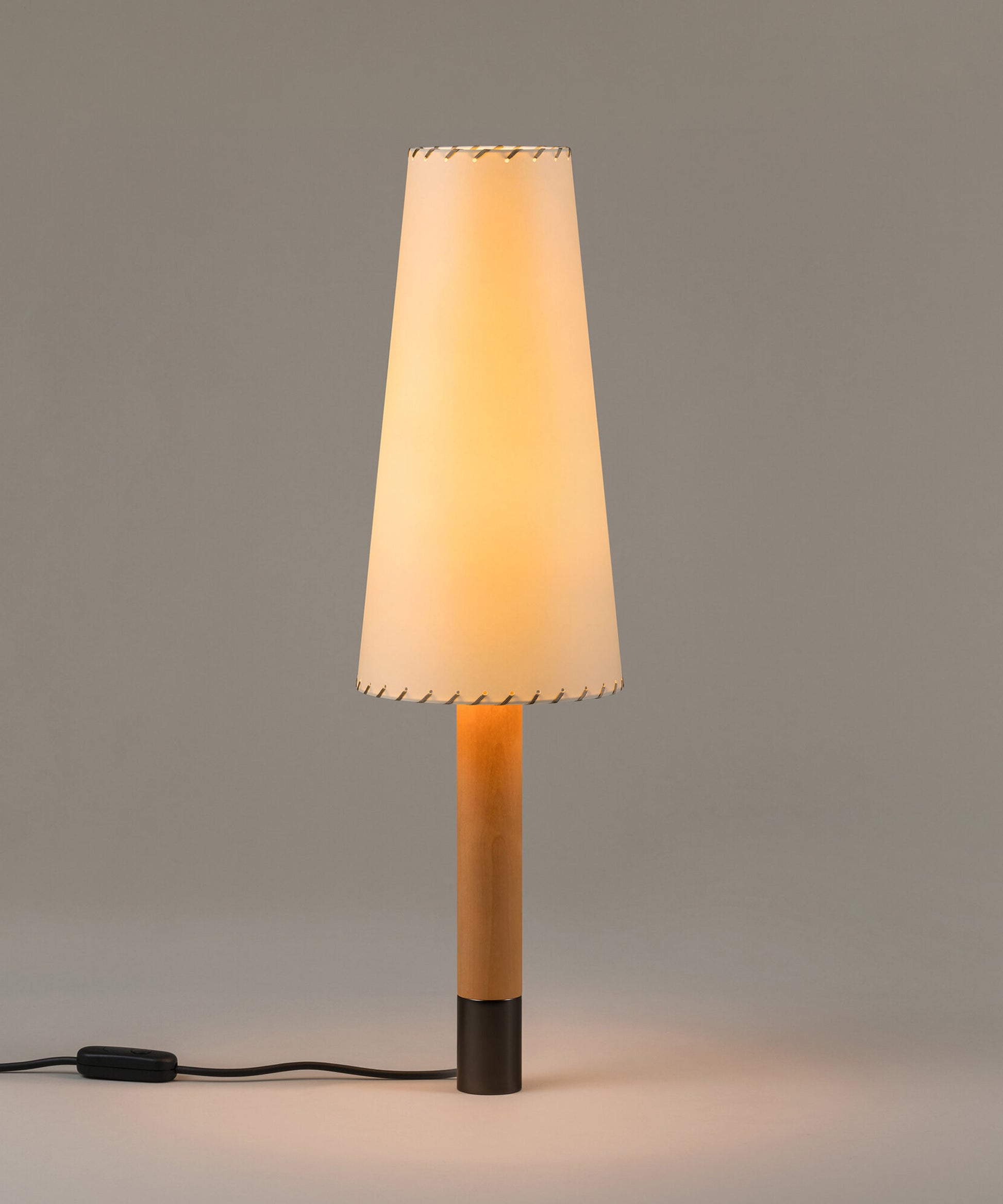 A wooden column, held up by a heavy metal base with the same diameter, supports a range of shades in different shapes and colors. Although the lamp balances well in this format, an optional, wider base may be placed underneath. The Básica lamp heralded a revival of natural materials, such as wood, stitched cardboard, or ribbons, and provided Santa & Cole with a springboard for international expansion, generating an alternating current in Europe that challenged prevalent tastes. A more familiar, craftsman-like, and gentle form of modernity was being advocated.