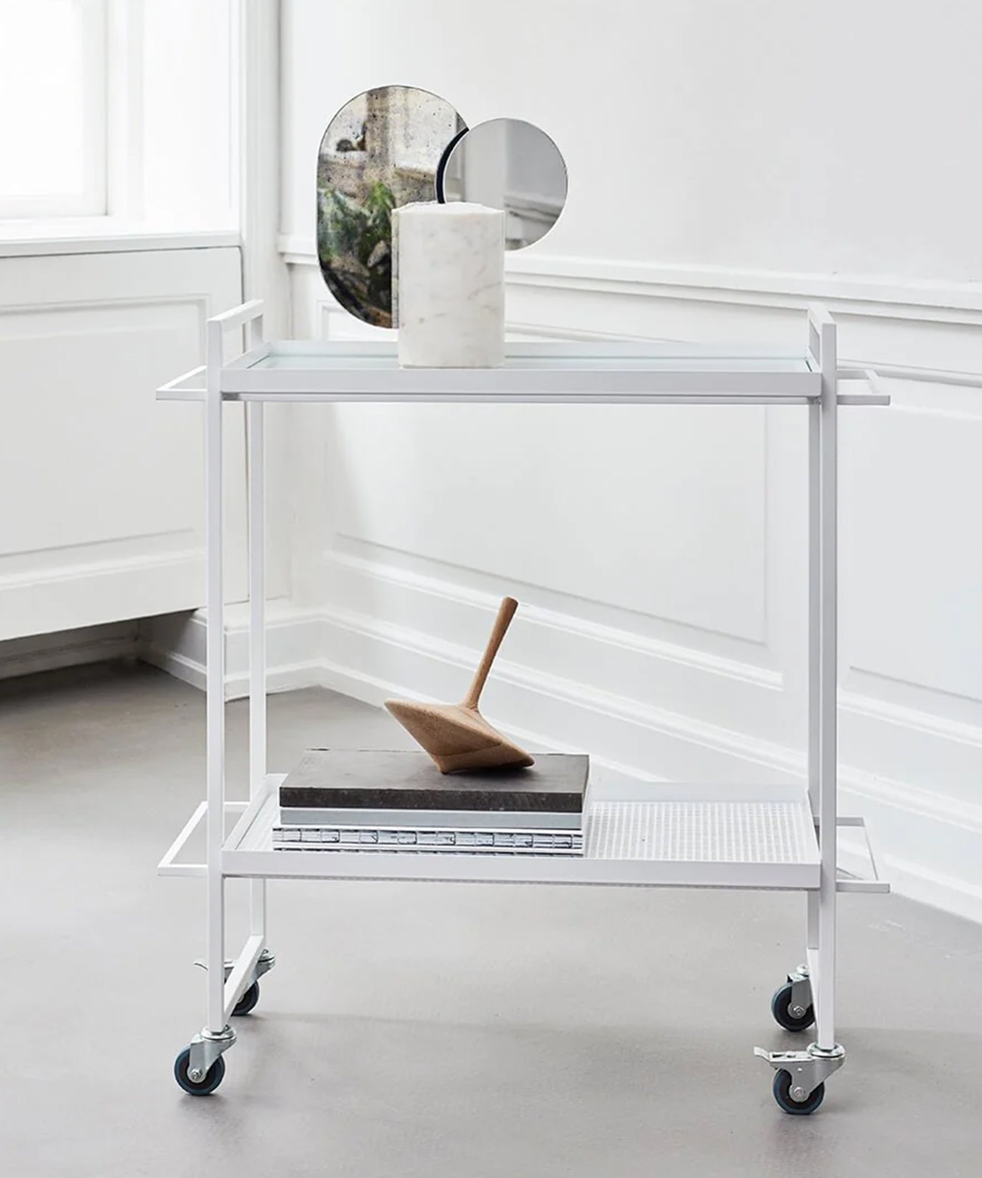 A functional and extremely versatile trolley perfect when used as a movable serving trolley or bar cart. In fact, you can easily use it for anything from a bedside table to a coffee table. The Bauhaus Trolley is already an all-time best seller in the collection and a unique two-storage table and a mobile piece of furniture on wheels. Useful in virtually any room of your house and will fit in any home interior. The Bauhaus Trolley is available in black and white powder-coated steel and includes two trays - one in hardened glass and one made of perforated steel. The Bauhaus Trolley series is a modern and minimalistic trolley in Scandinavian / Danish design. The wheels of the trolley can be fastened thus making it a stationary small table. This elegant piece of furniture is designed by architect Kristina Dam, it is shipped flat-packed and is assembled with screws. Kristina Dam Studios' design ethos and philosophy could be described as Nordic Minimalism, with a focus on simple graphic lines, attention to detail, and carefully selected materials. The entire range of designs is produced within the EU and shipped worldwide.