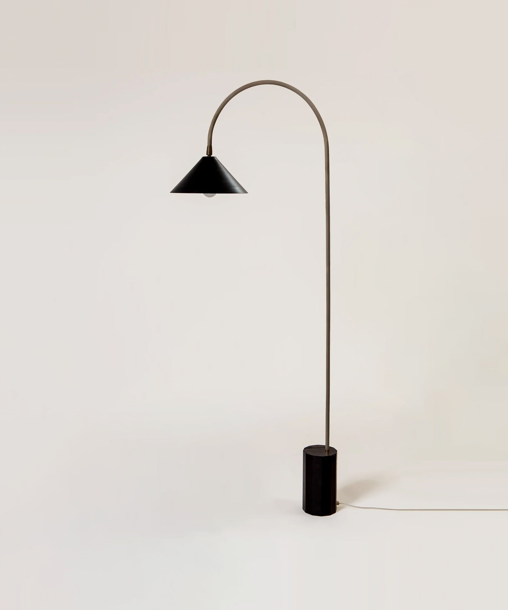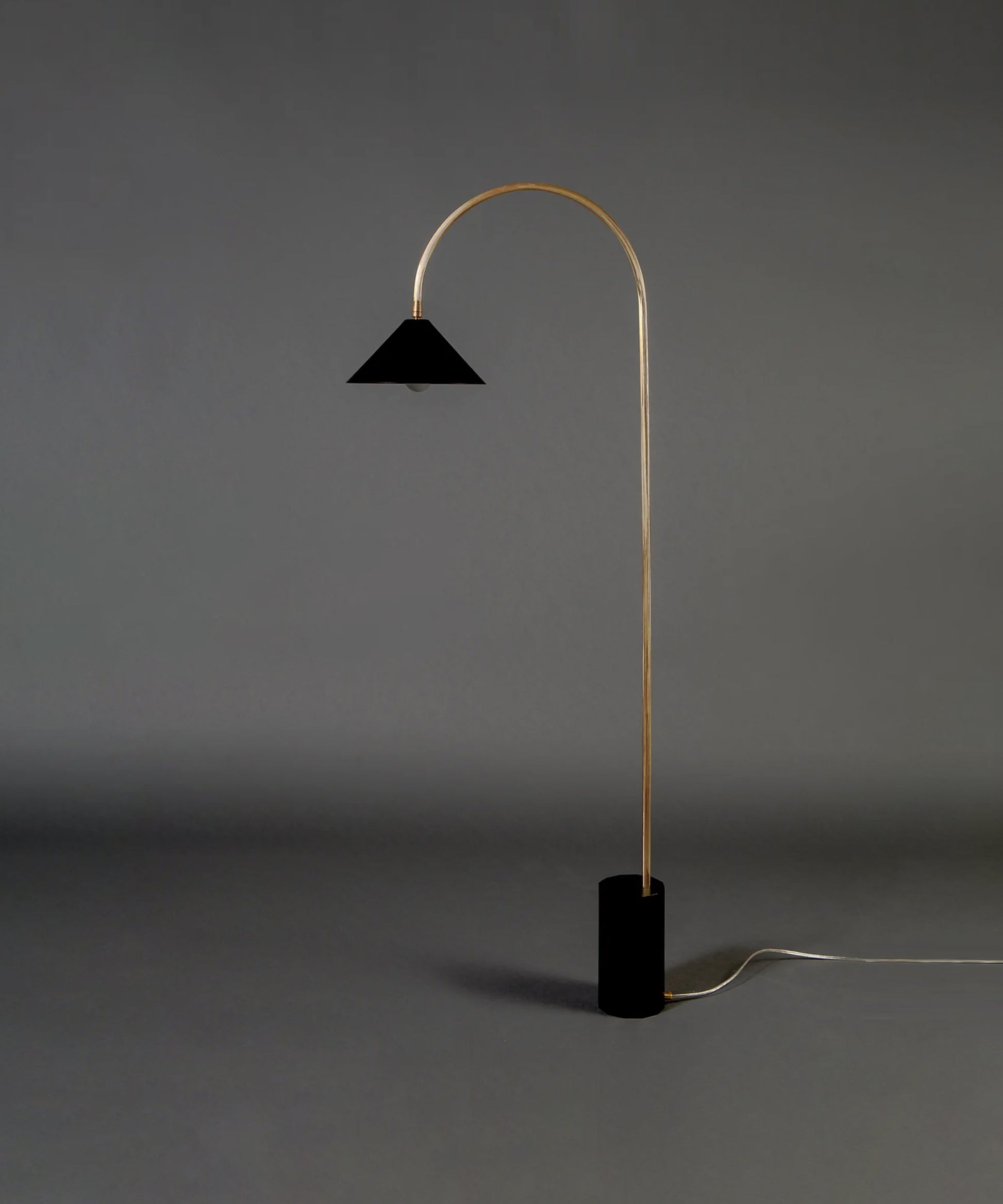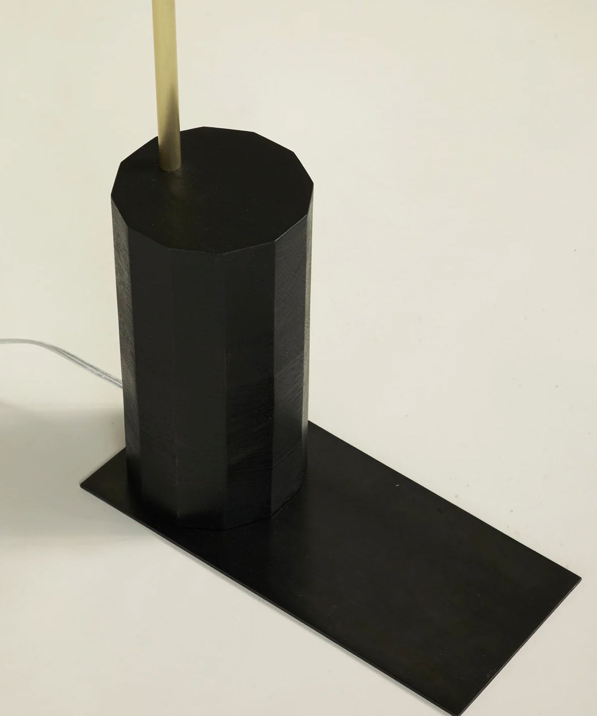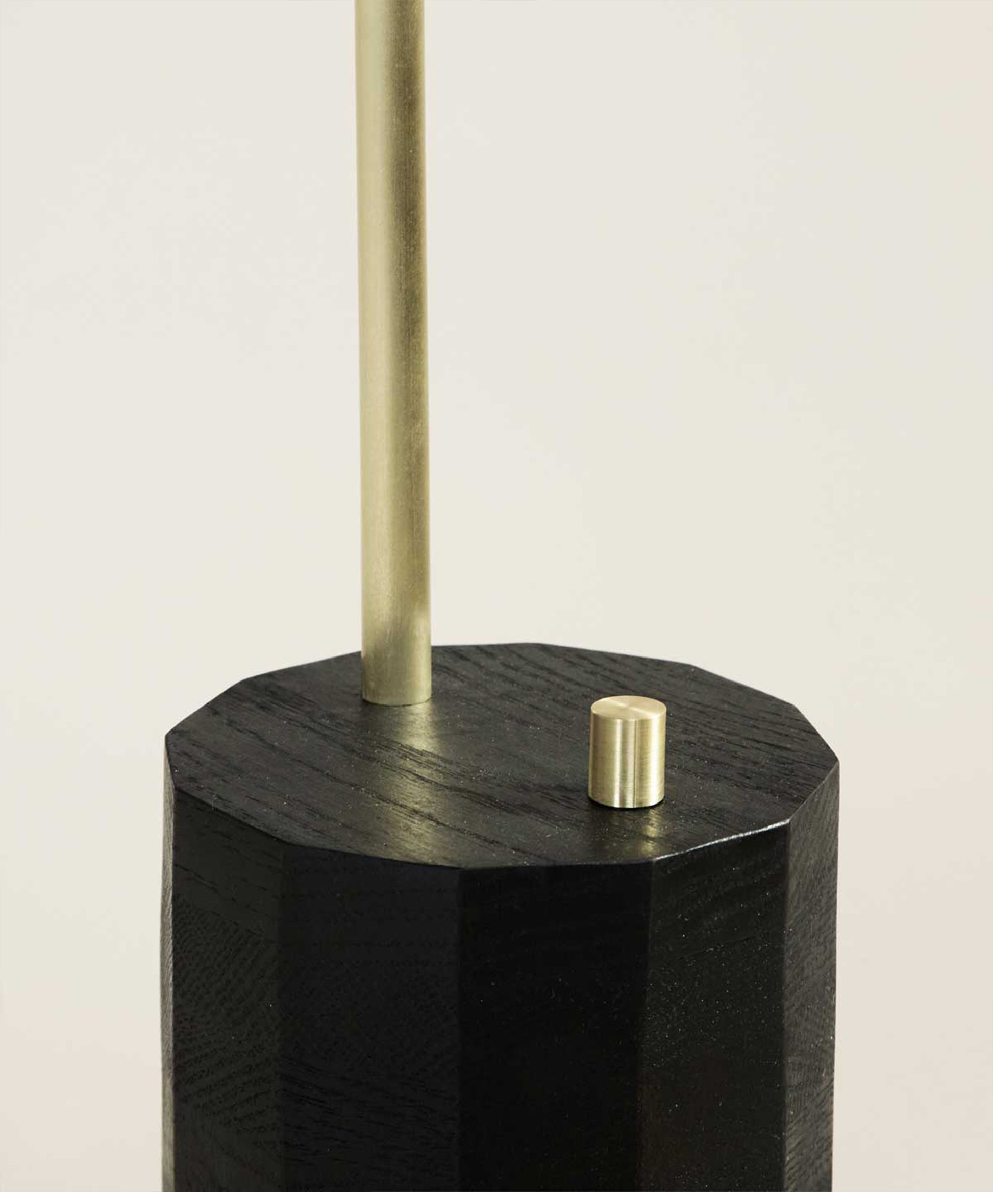 The lamps feature a hexagonal wood base (available in a range of finishes), heavily weighted for stability. The floor lamp versions also come with a removable metal base plate for added stability in high-traffic areas. The lamps are furnished with a clear cord with an on/off switch. Pictured with a blackened-steel hand-spun shade, brushed-brass curved neck, and ebony-stained ash-wood base, the latter two components are available in a range of finishes.