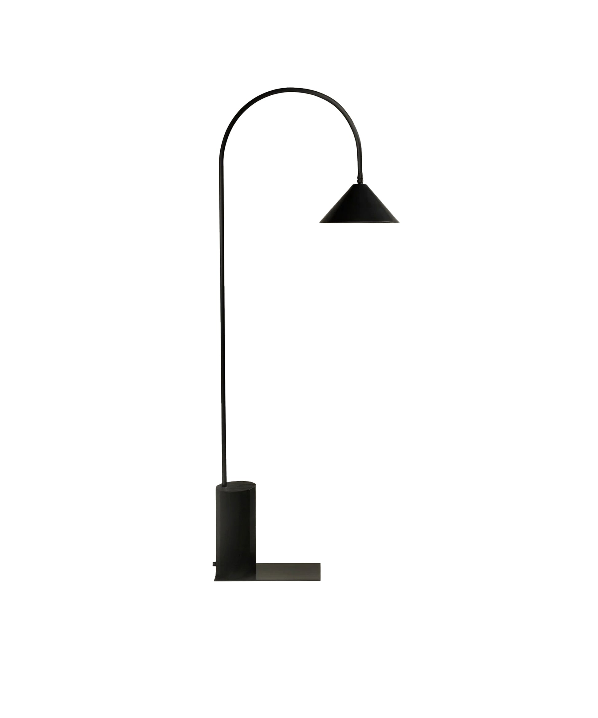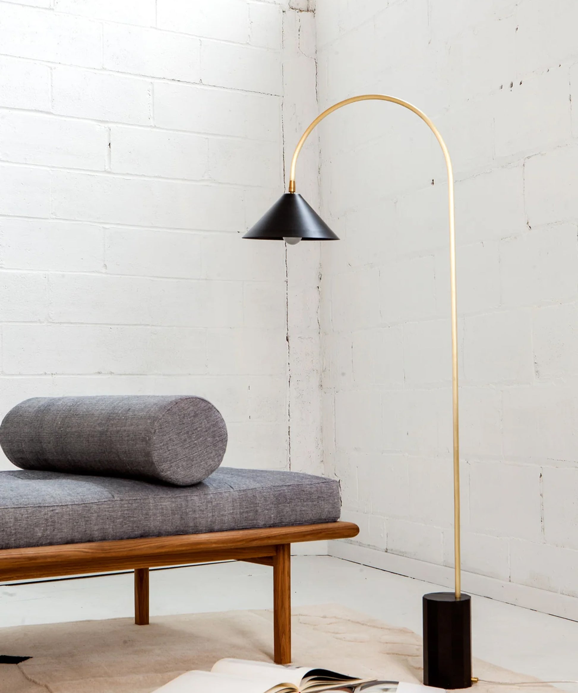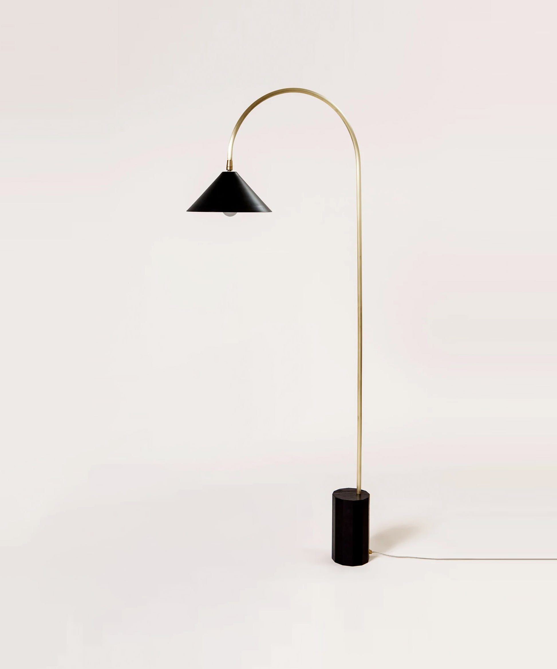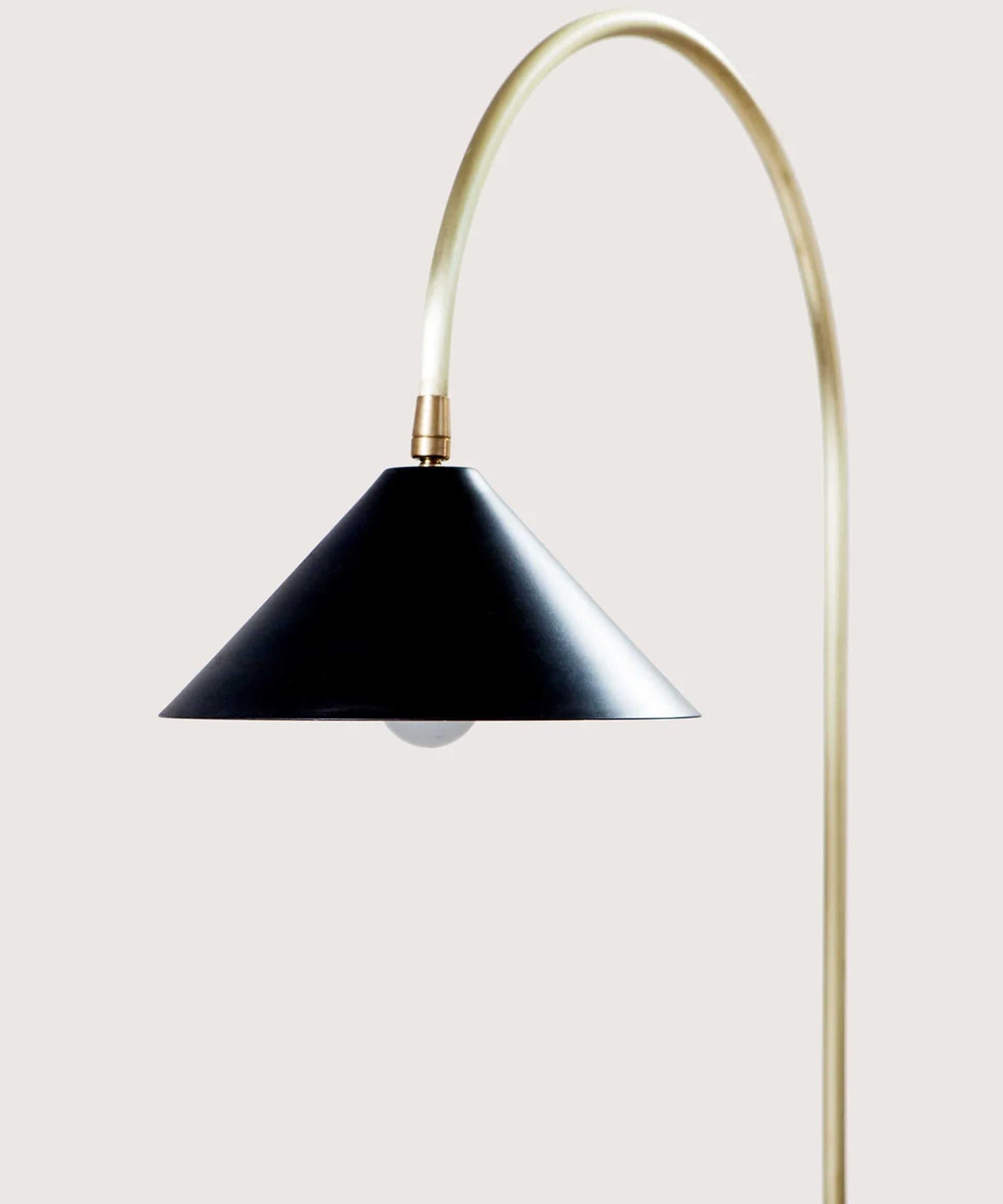 The lamps feature a hexagonal wood base (available in a range of finishes), heavily weighted for stability. The floor lamp versions also come with a removable metal base plate for added stability in high-traffic areas. The lamps are furnished with a clear cord with an on/off switch. Pictured with a blackened-steel hand-spun shade, brushed-brass curved neck, and ebony-stained ash-wood base, the latter two components are available in a range of finishes.