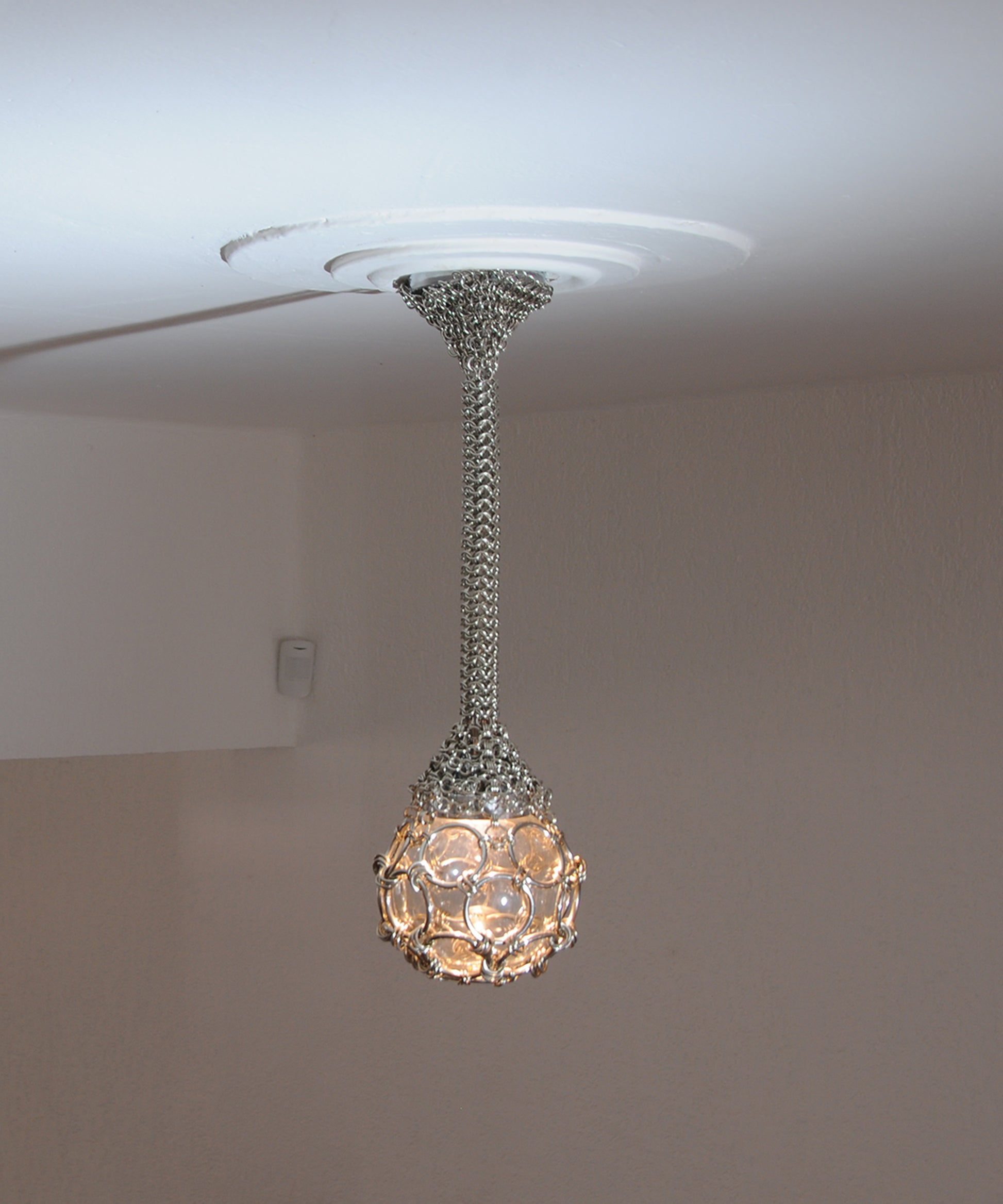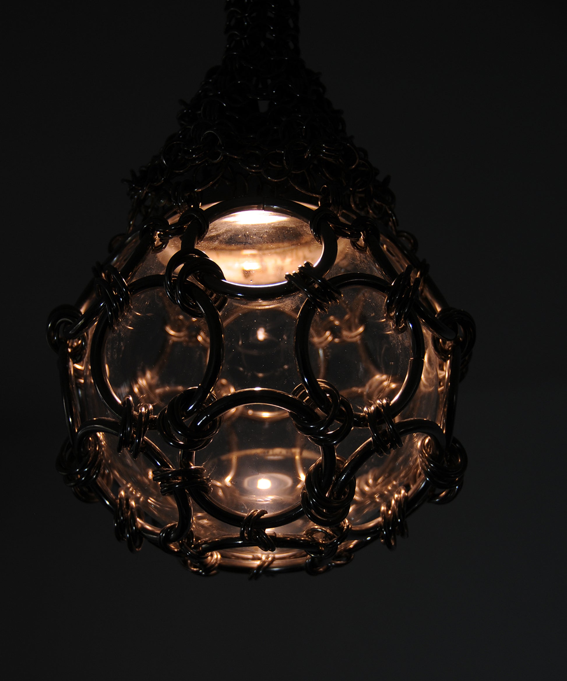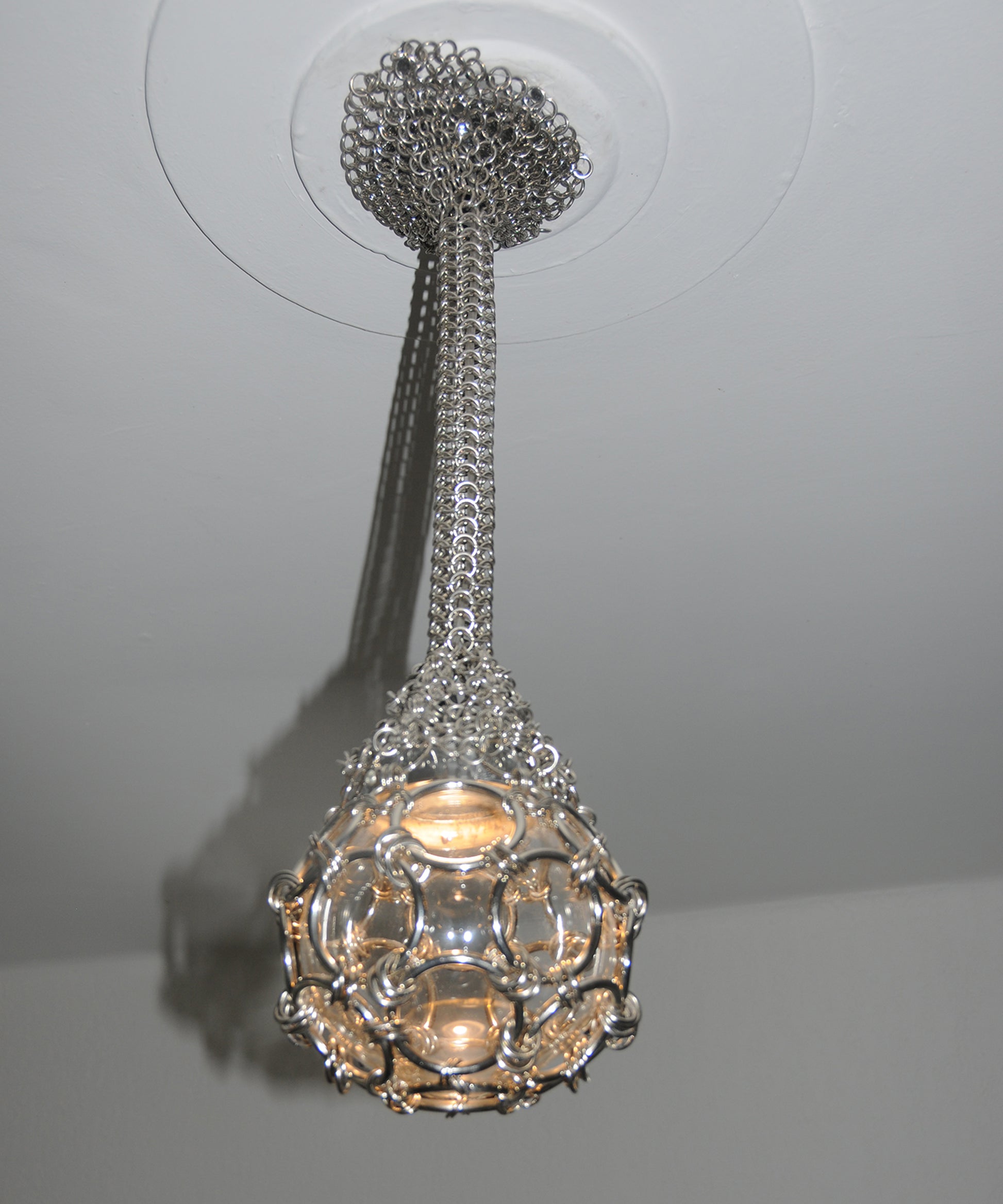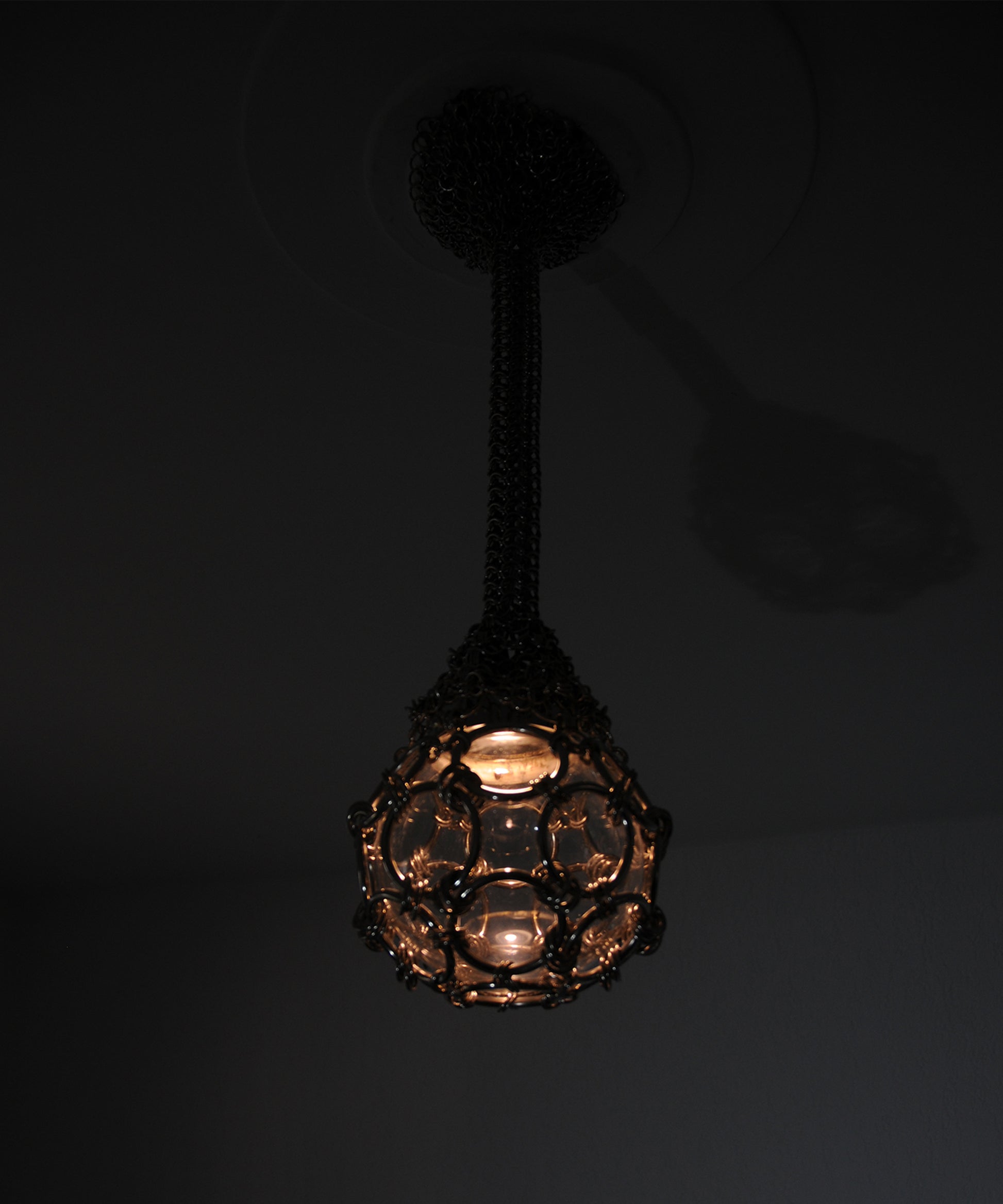 A chainmail web hugs the lamp’s canopy, as the knit gets tighter the chainmail envelopes into a rope that hangs to finally suspend a glass globe. All the while the lamp’s warm light source remains hidden. In Chainmail Droplet Chandelier there is an evident contradiction between material and form as the chainmail takes on an organic cocoon-like appearance.