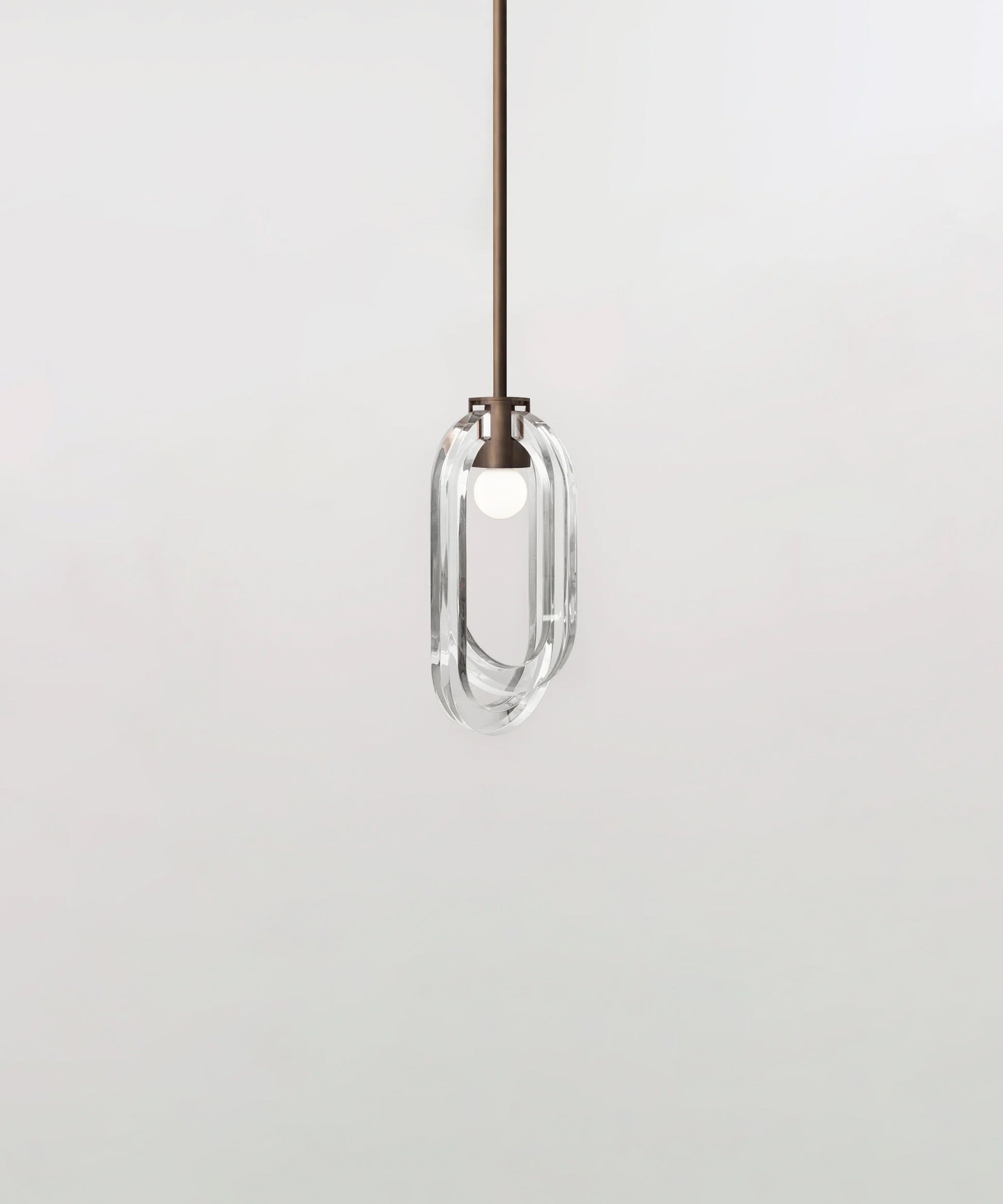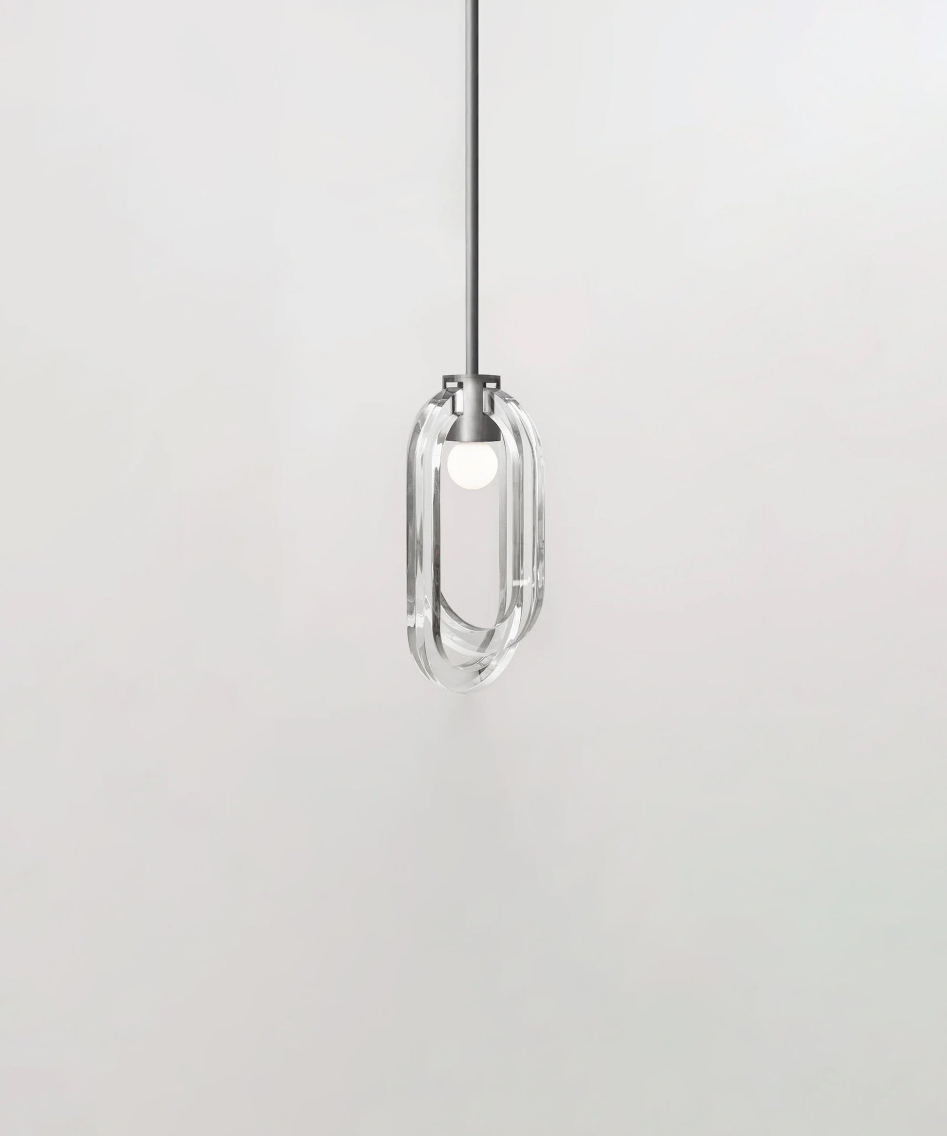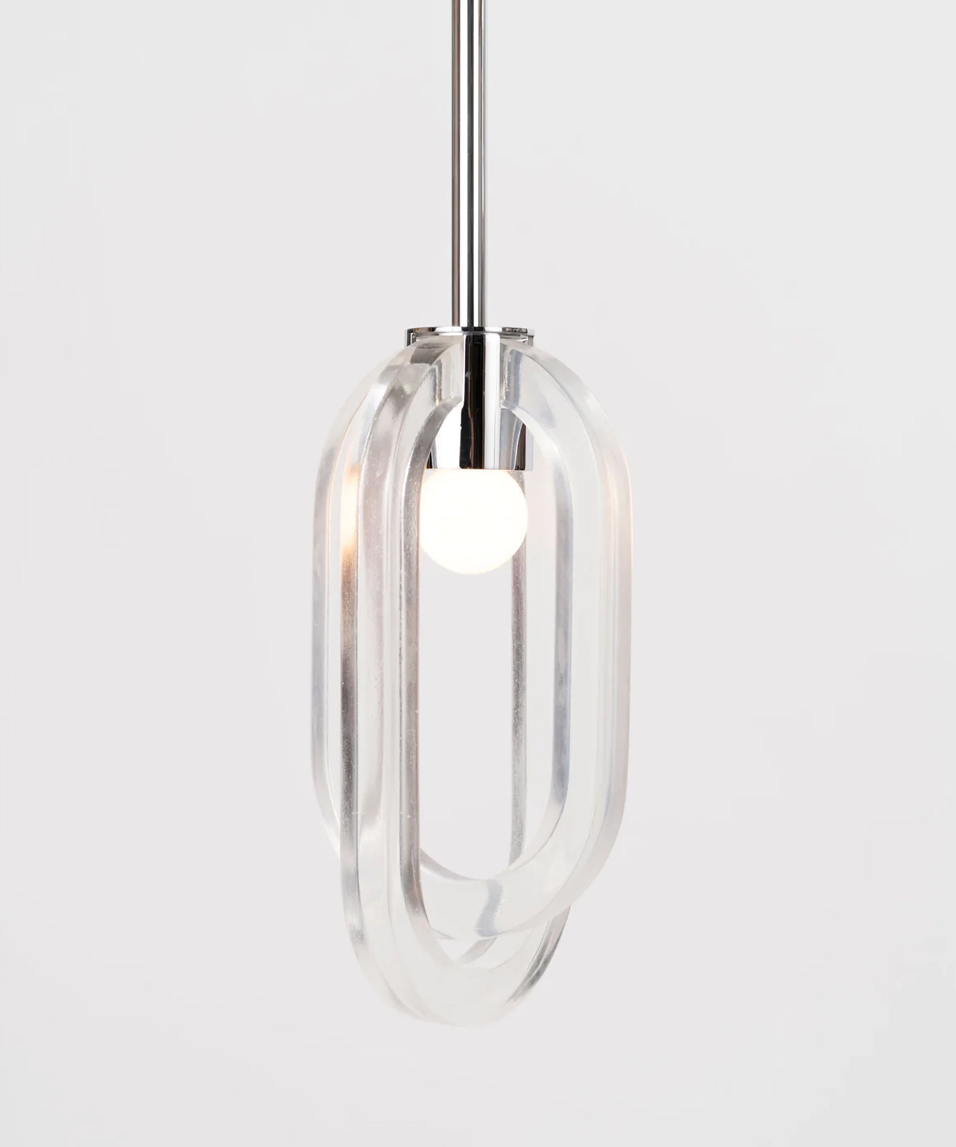 The resin rings are designed to evoke bubble-filled glass while offering the strength and durability of resin. The inside facing of each ring is fogged, allowing the light to carry through the entirety of the ring's loop. The fixture is available in a variety of metal finishes. Please note, that it assumes a 25" rod length, however, it is easily customizable upon request (please email us at help@trnk-nyc.com with your specifications).