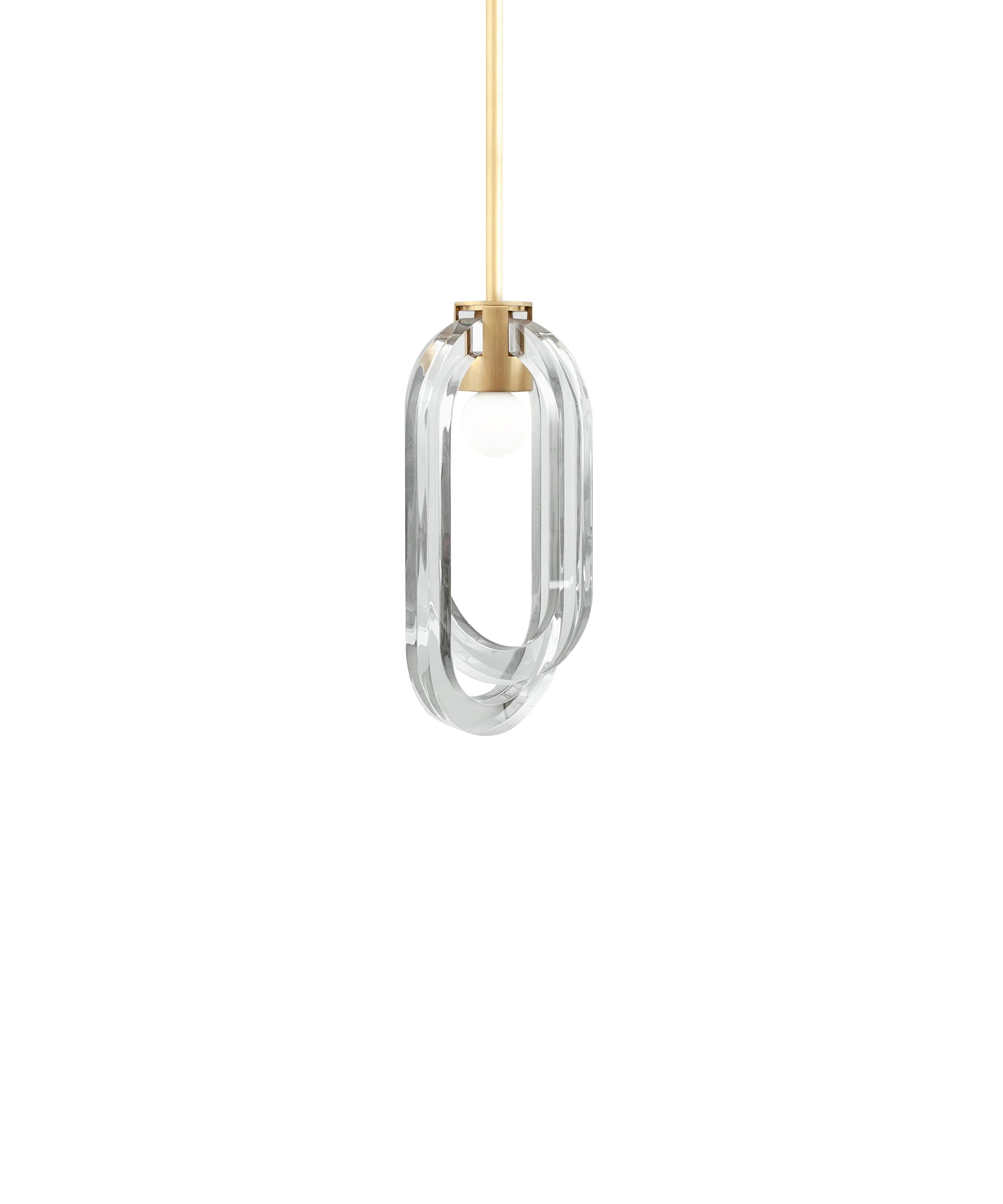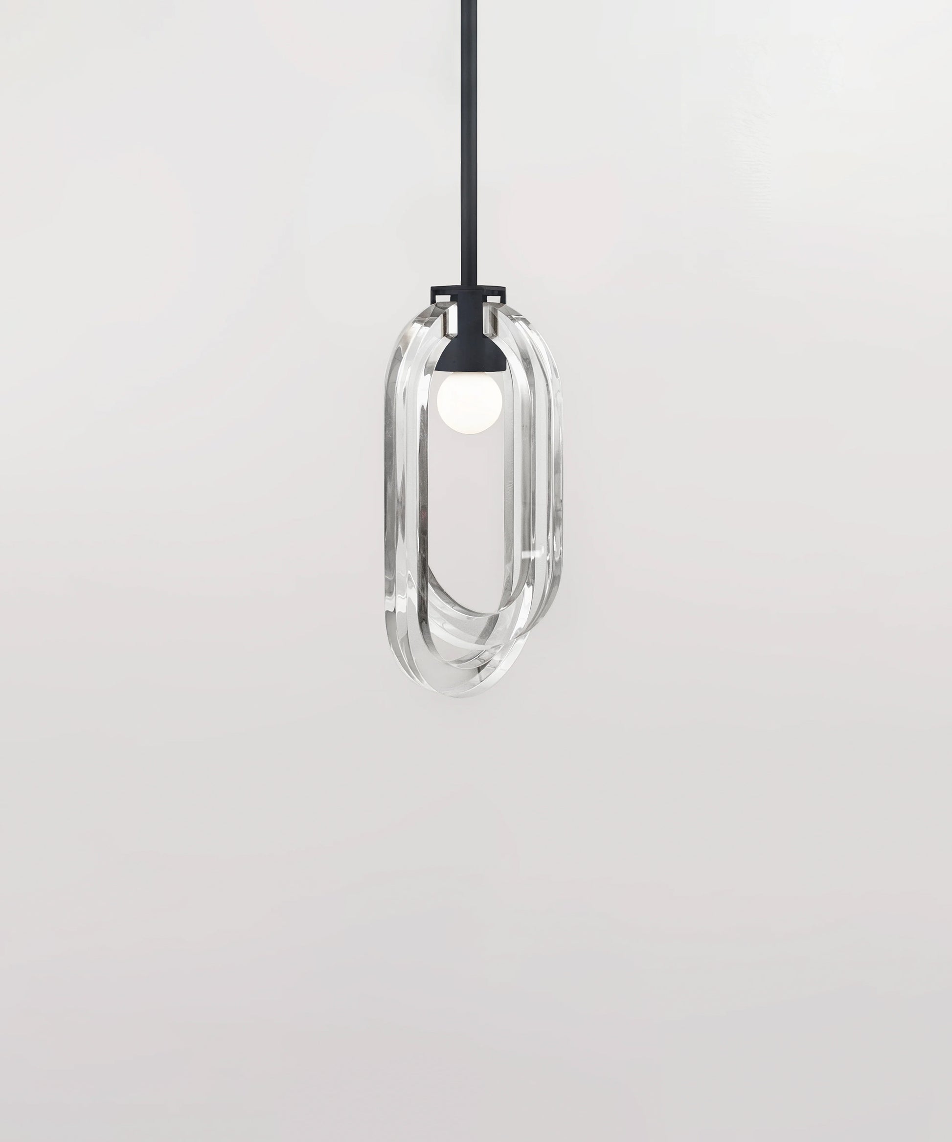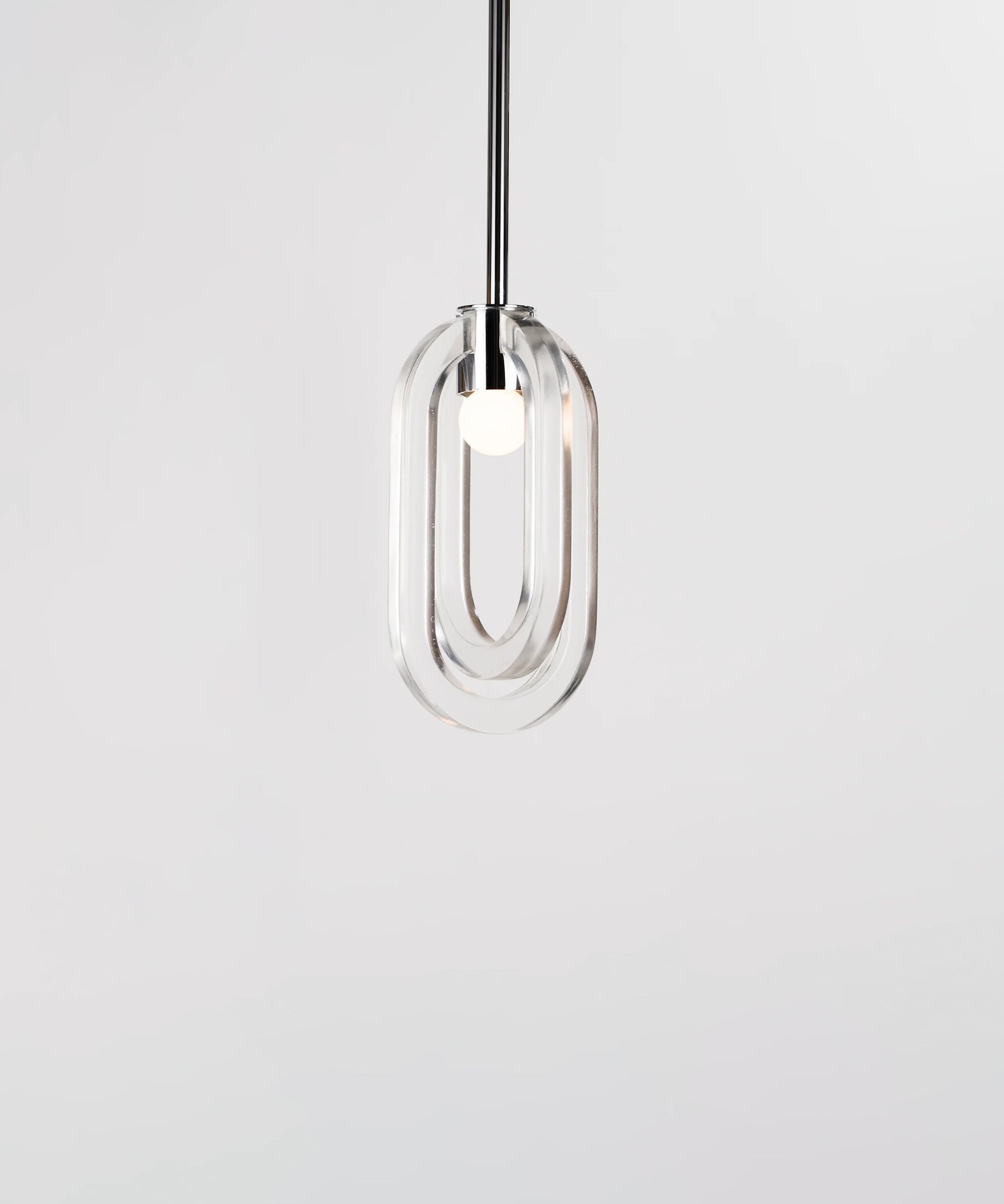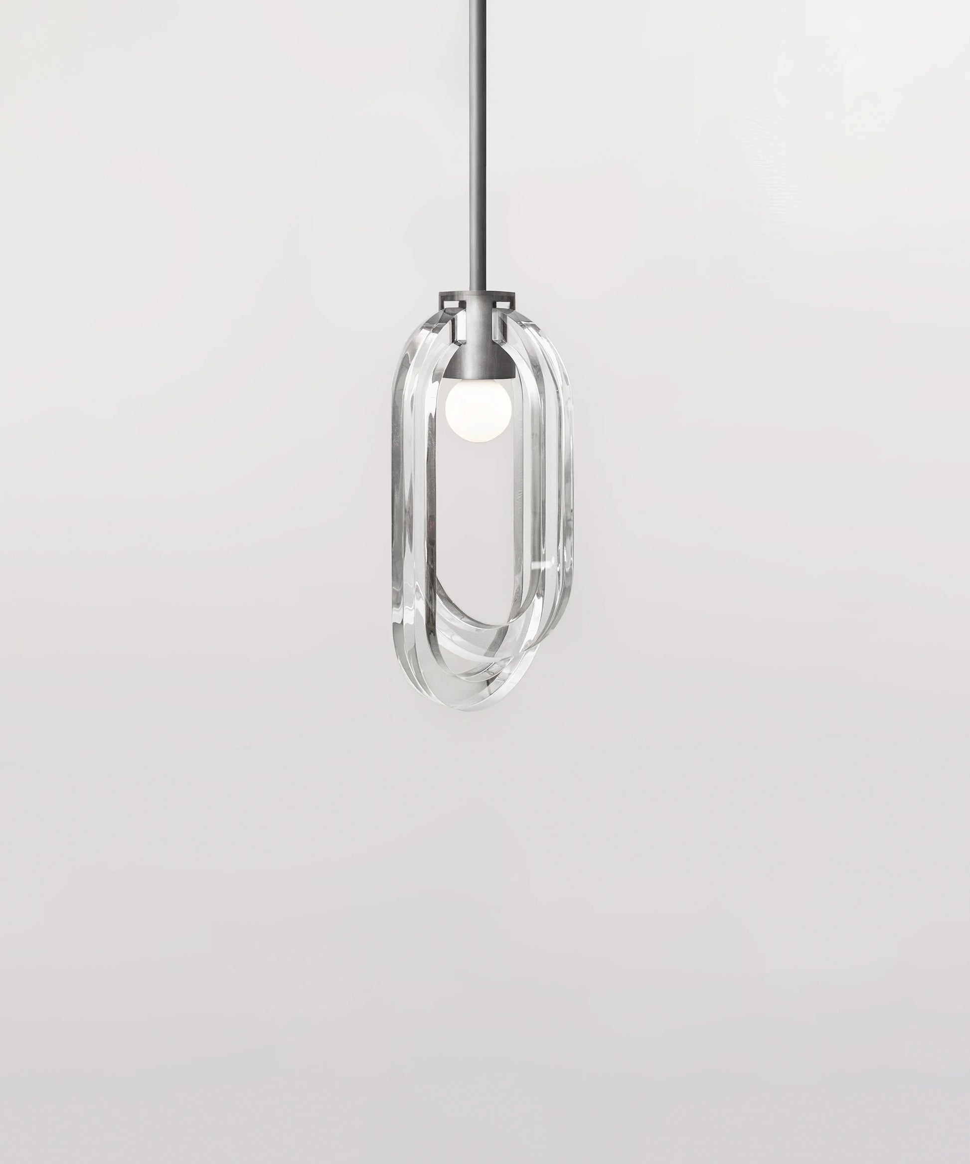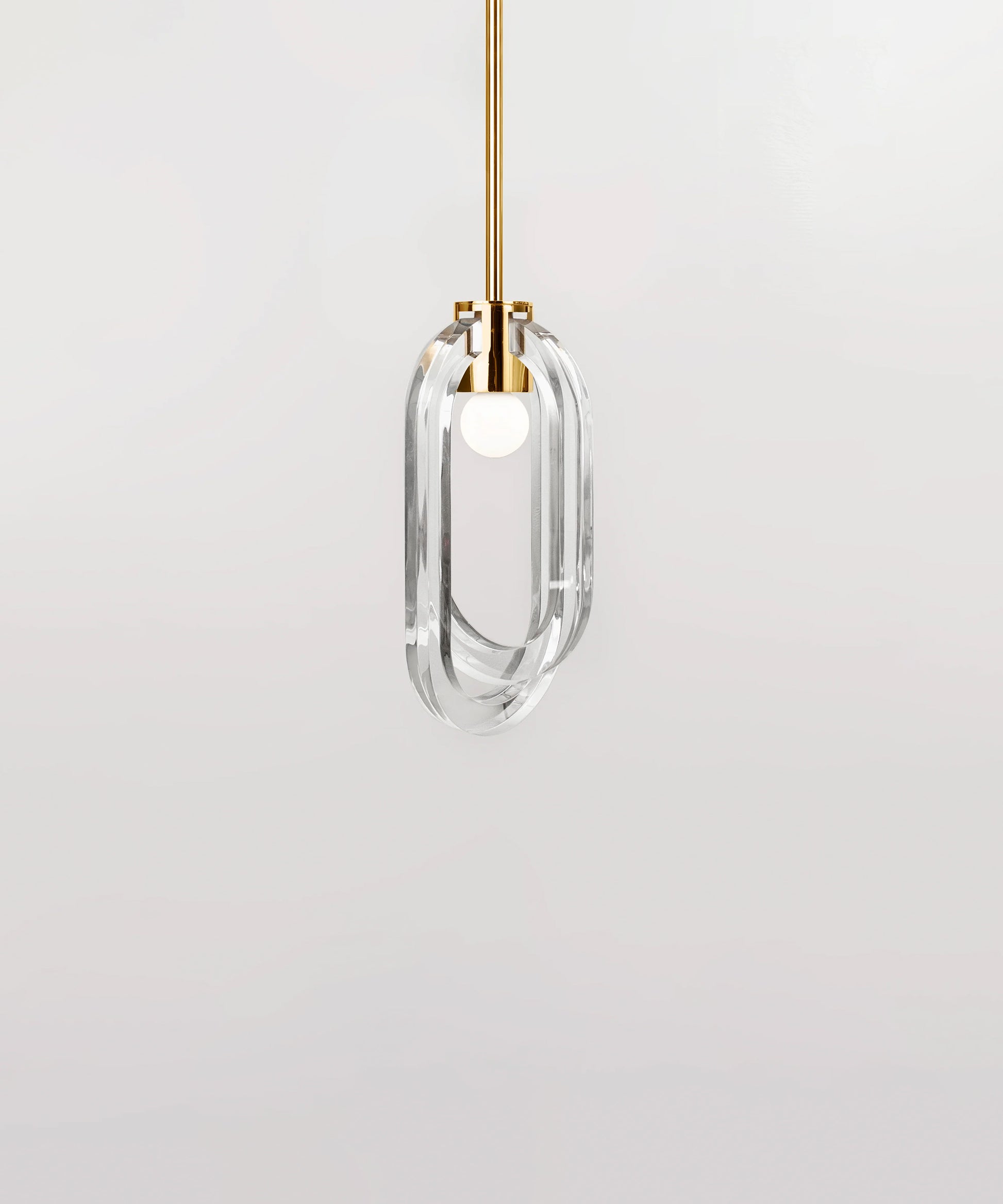 The Cirrus Pendant's two lucite rings are placed perpendicularly around a precision-crafted metal light source, each at varied lengths with one looping under the other to create a composed, jewel-like fixture.
