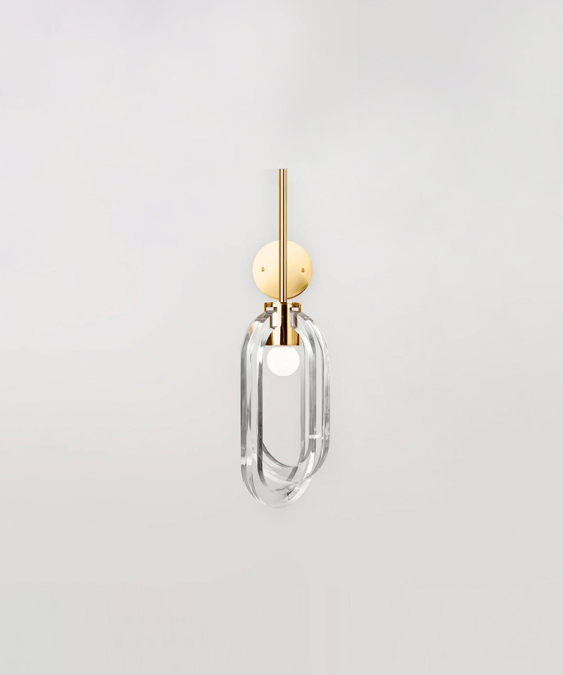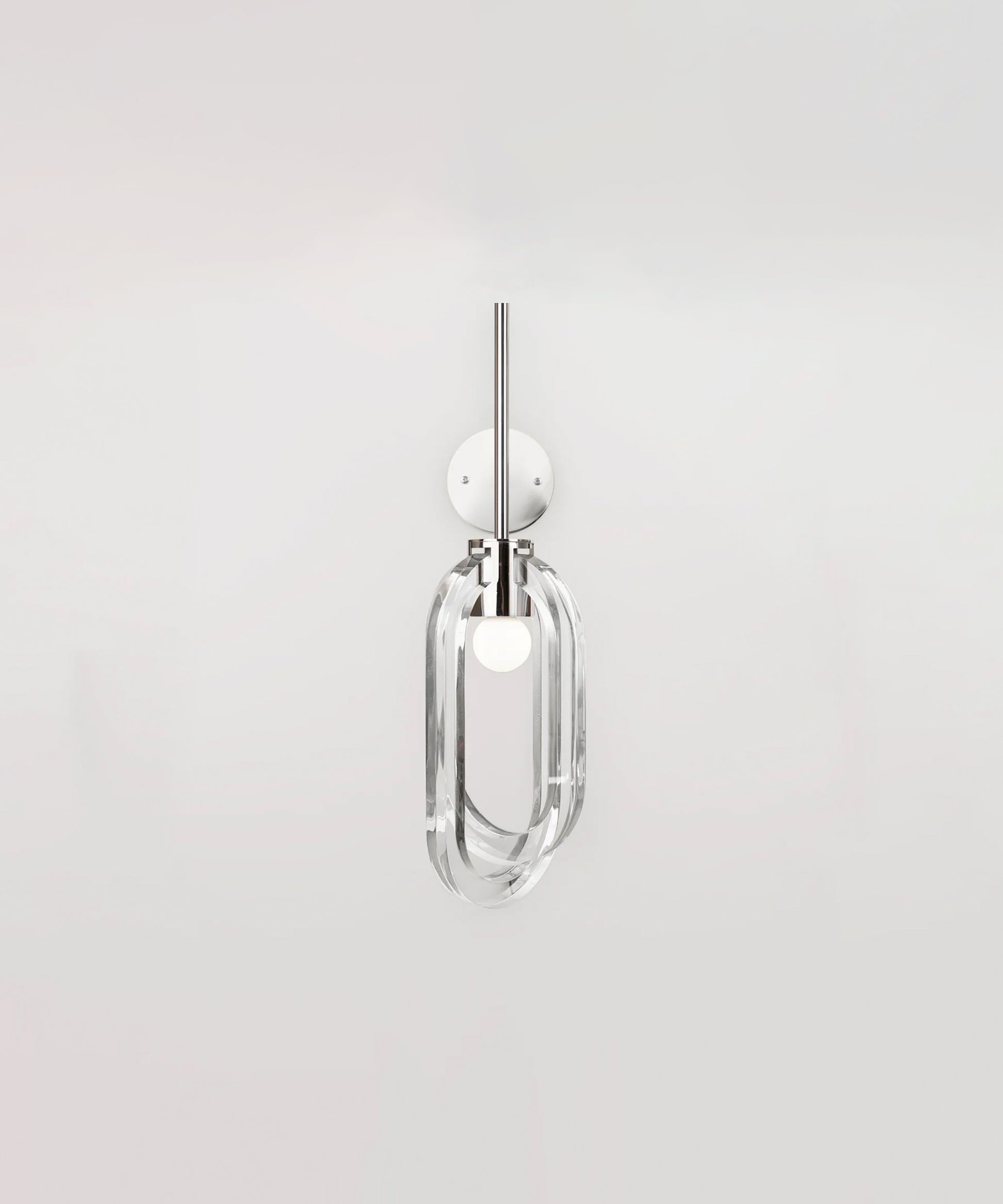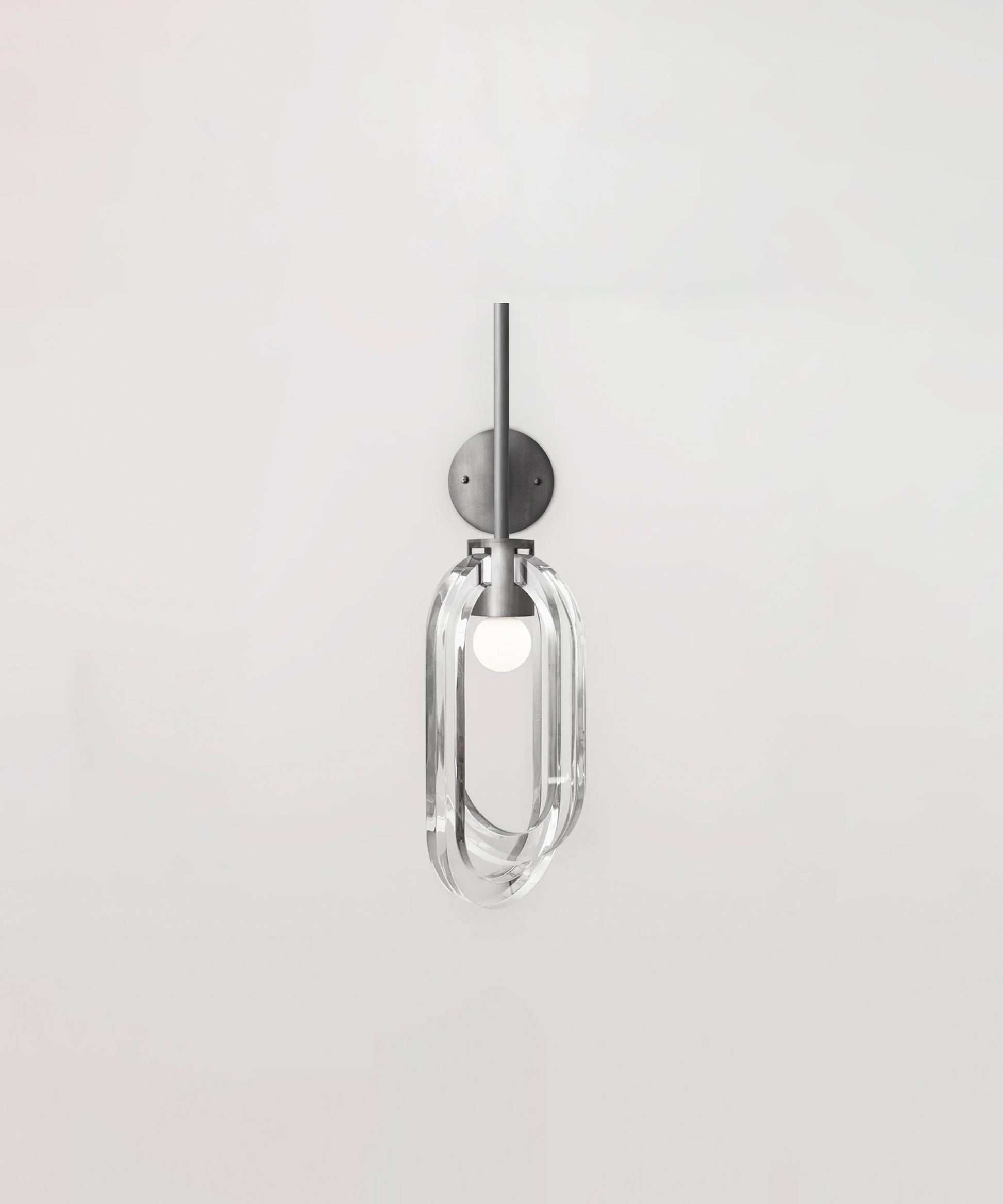 The resin rings are designed to evoke bubble-filled glass while offering the strength and durability of resin. The inside facing of each ring is fogged, allowing the light to carry through the entirety of the ring's loop. The fixture is available in a variety of metal finishes.