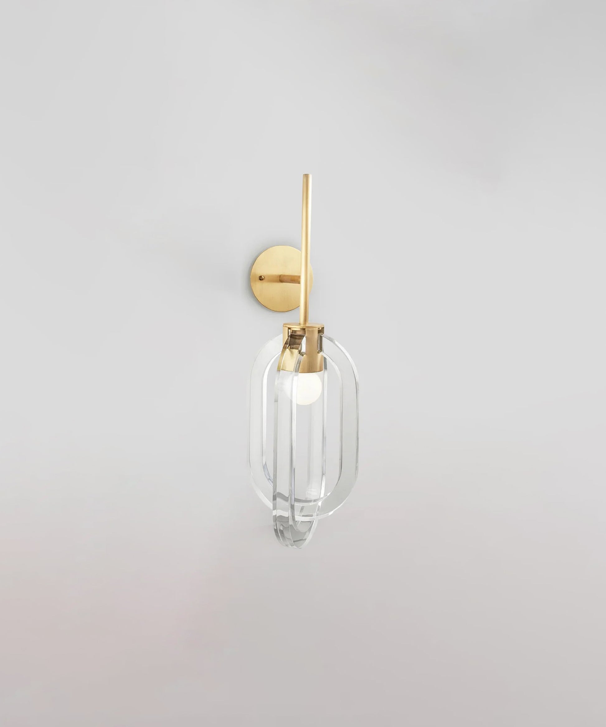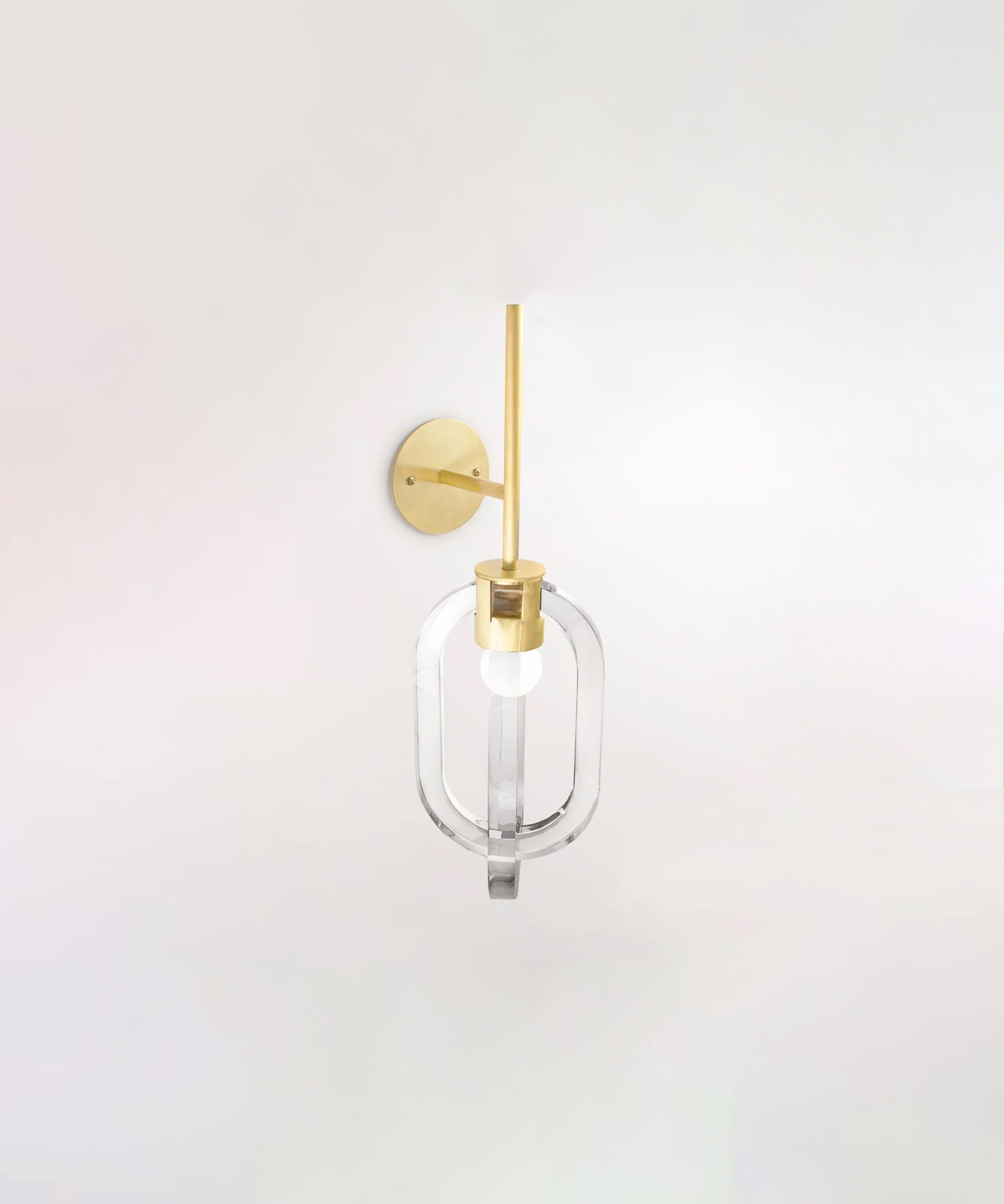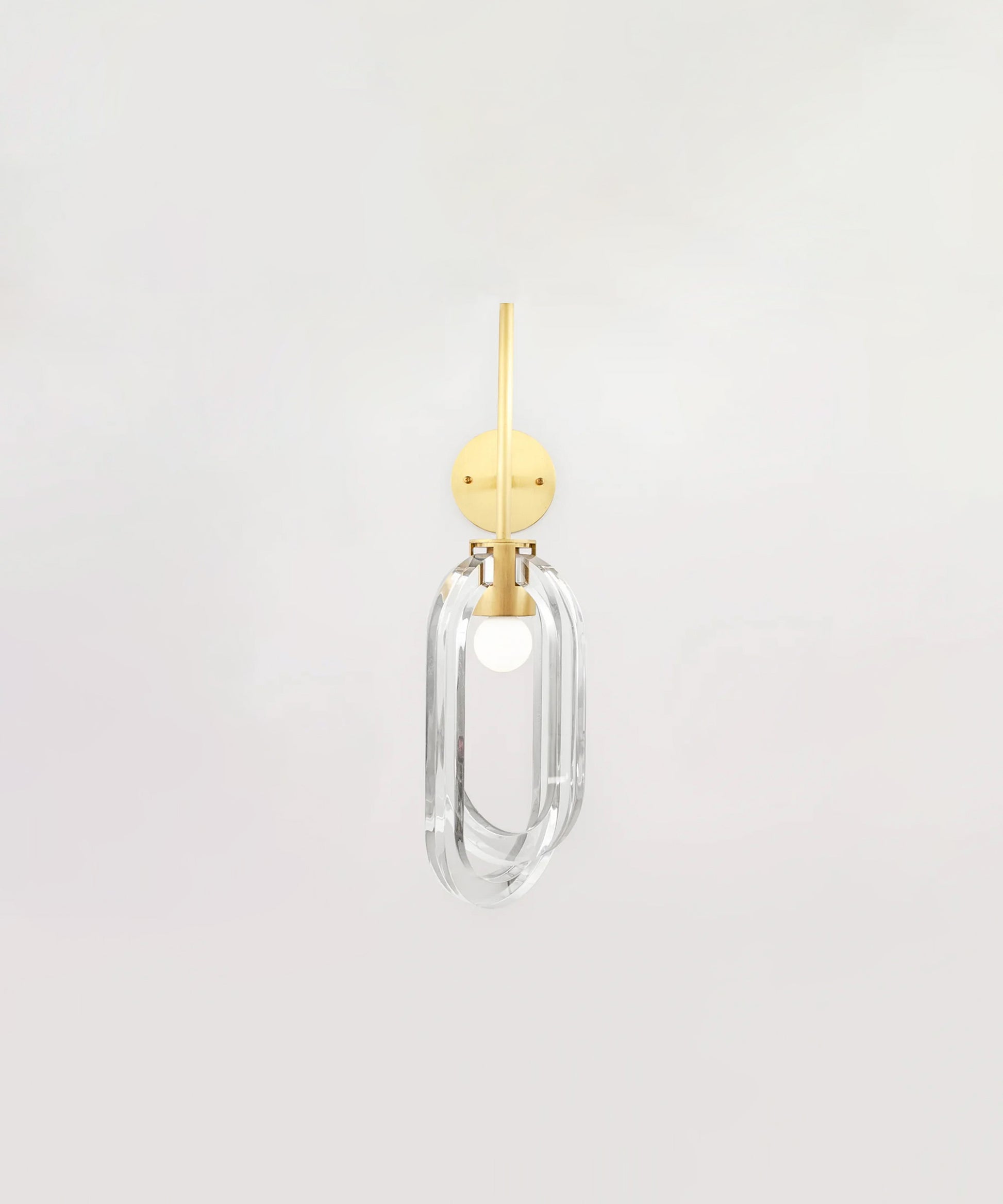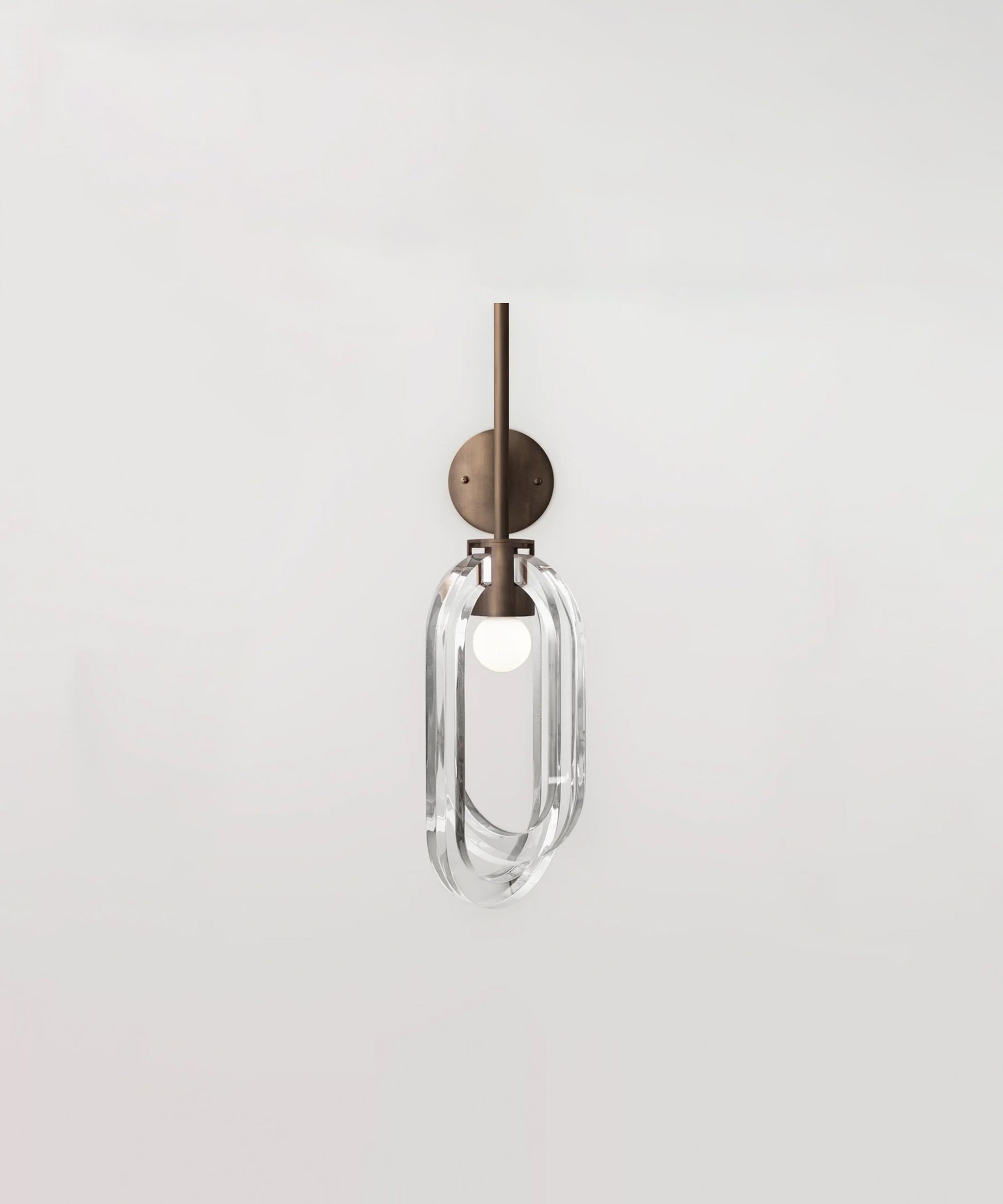 The resin rings are designed to evoke bubble-filled glass while offering the strength and durability of resin. The inside facing of each ring is fogged, allowing the light to carry through the entirety of the ring's loop. The fixture is available in a variety of metal finishes.