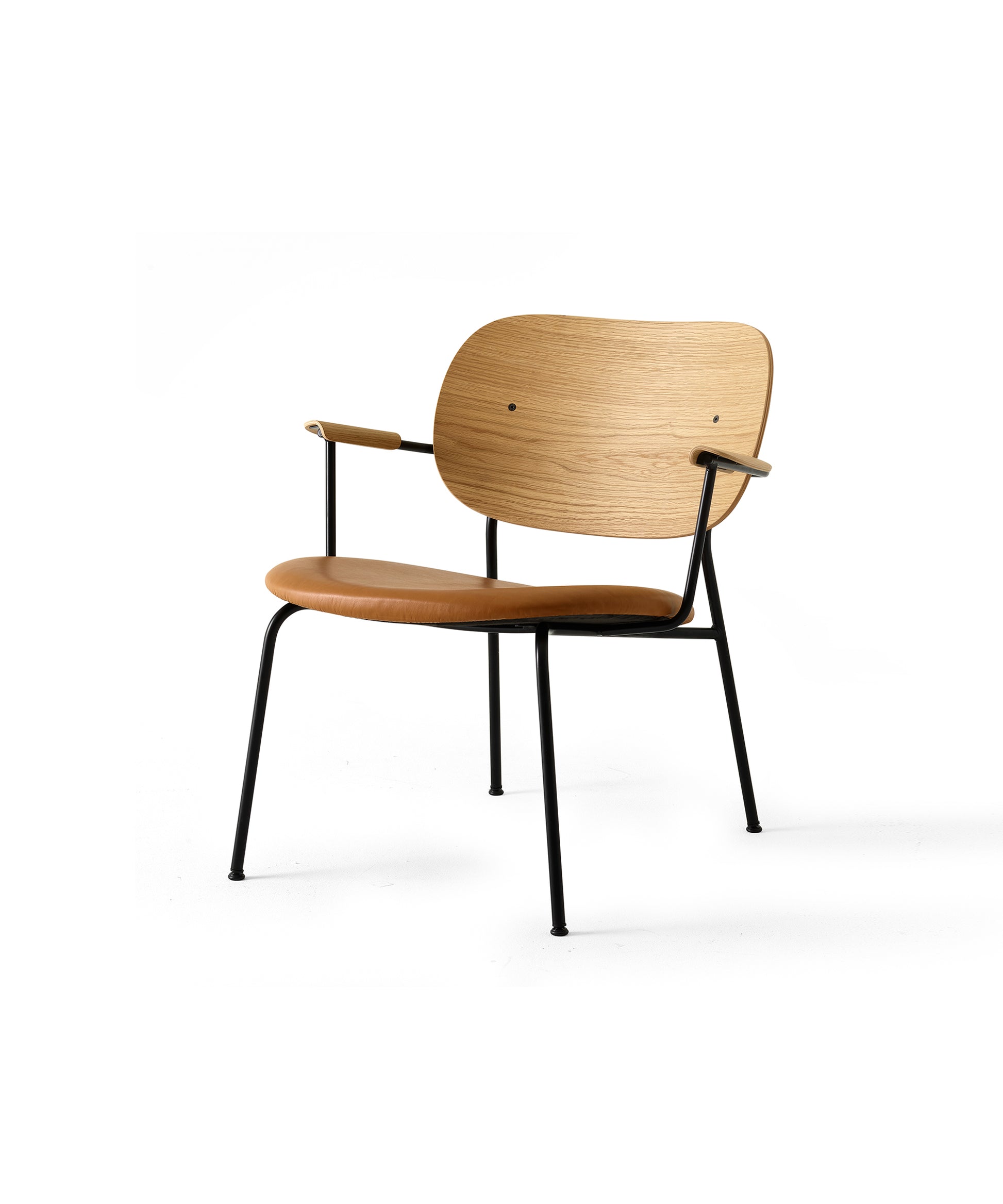 The new Co Lounge Chair continues the collection's legacy, combining steel, woodworking, and upholstering skills and unexpected comfort to create an iconic chair for relaxation that fits seamlessly into any setting. Co Lounge Chair is a new and lightweight lounger with exceptional sitting comfort. Inspired by classic designs that combine metalwork and woodwork to iconic effect, the new iteration purposefully re-spaces its different components to create a lighter, more laid-back look than its dining predecessor. The comfortable design enhances interior spaces rather than demanding attention in a room. The form-pressed wood veneer backrest is angled for comfort and the curved armrests and upholstered seat support and embrace the body. The slender powder-coated steel frame belies its strength, providing a stable and sleek foundation on which to stand. Fully customizable, it melds beautifully with its surroundings — whether at home in a cozy living room corner or placed in a hotel lobby or office reception.