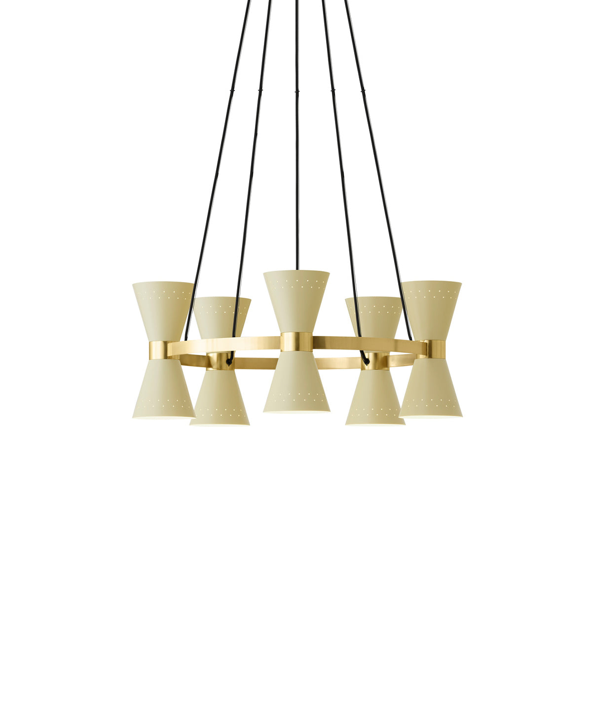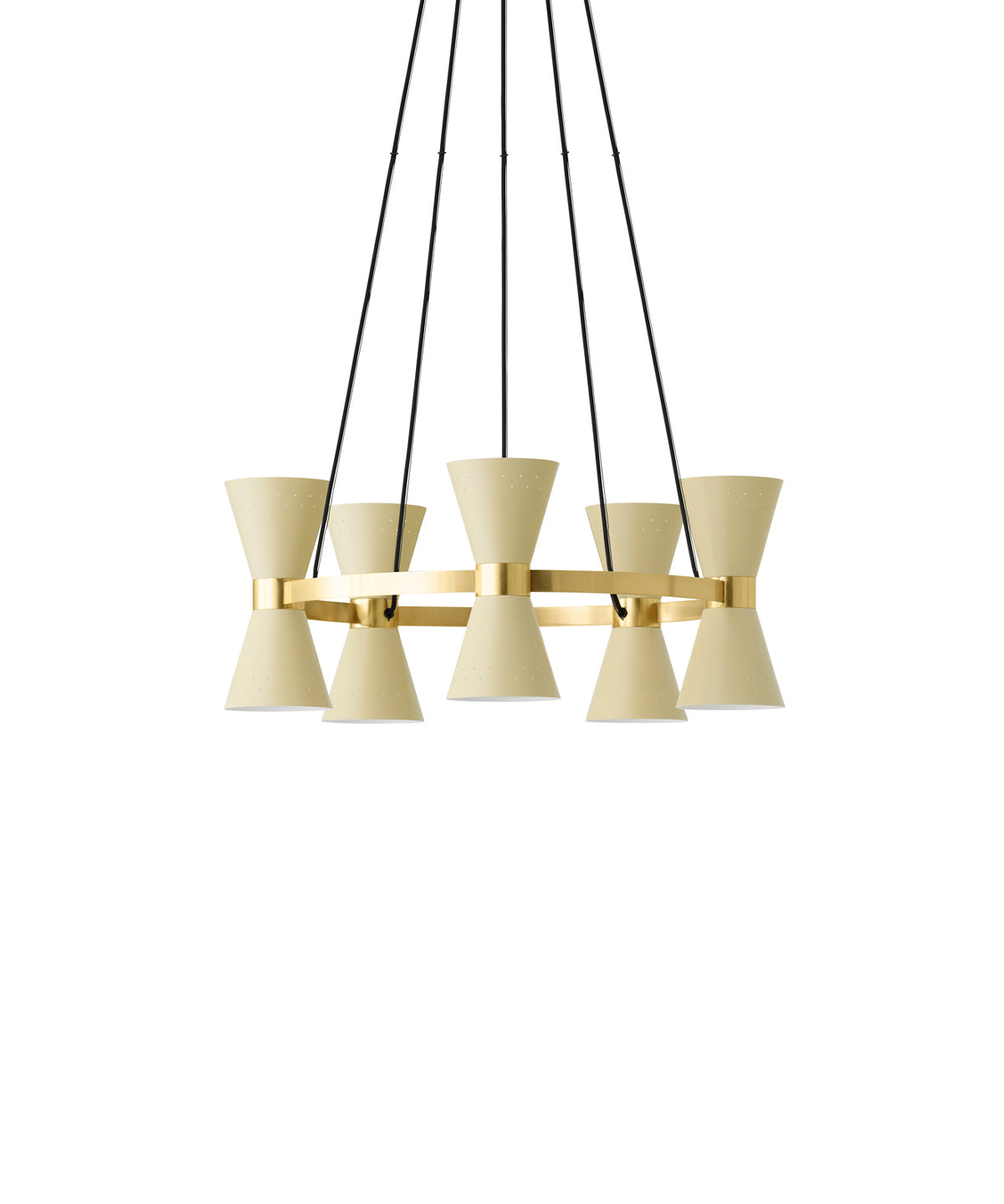 Its band of solid brass holds ten geometric metal shades that direct light both upward and downward. Small perforations in the shades allow further light to shine through. Its timeless look, typical of the Scandinavian Modern period in which it was designed, lends itself to any setting, making it equally at home as an illuminating feature in a public or private space.