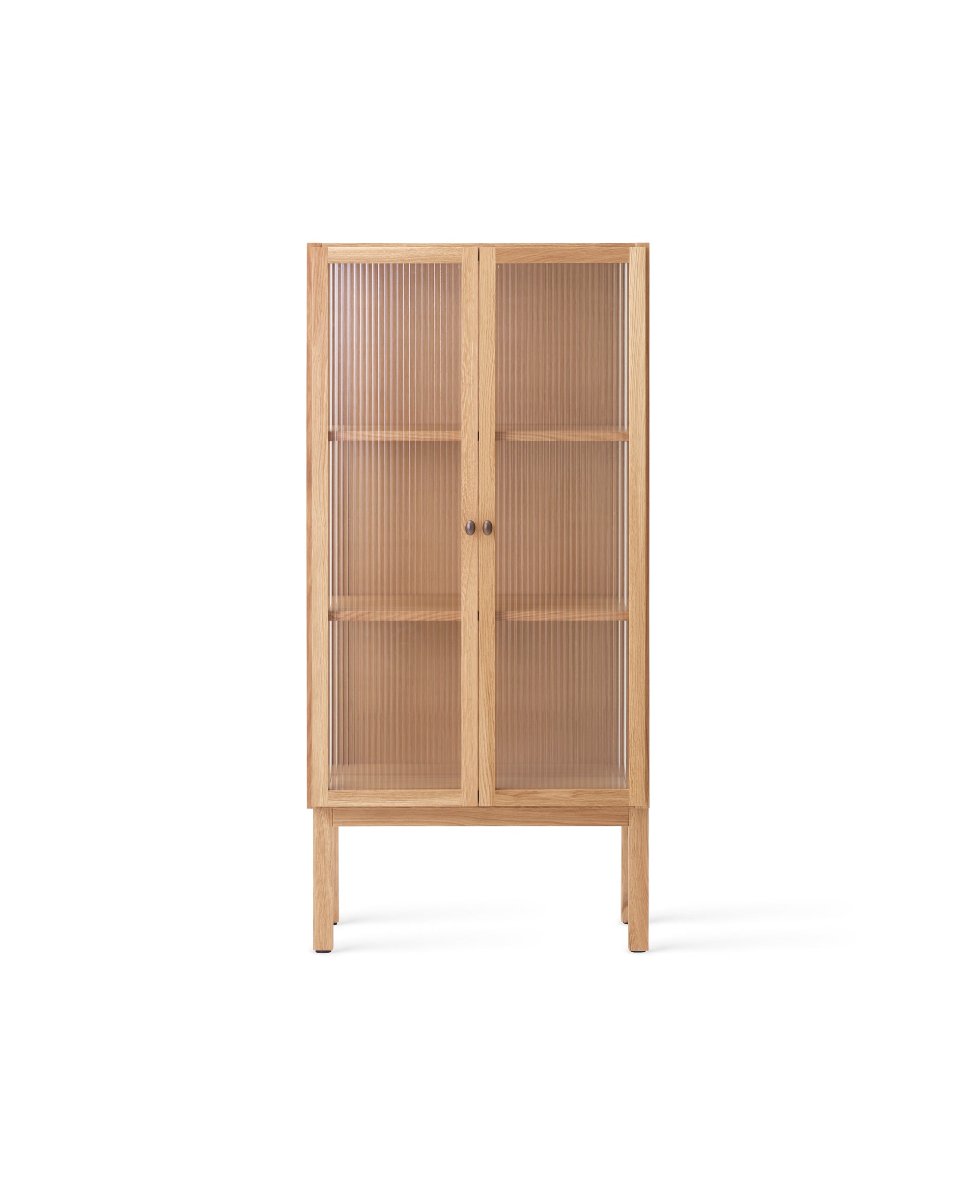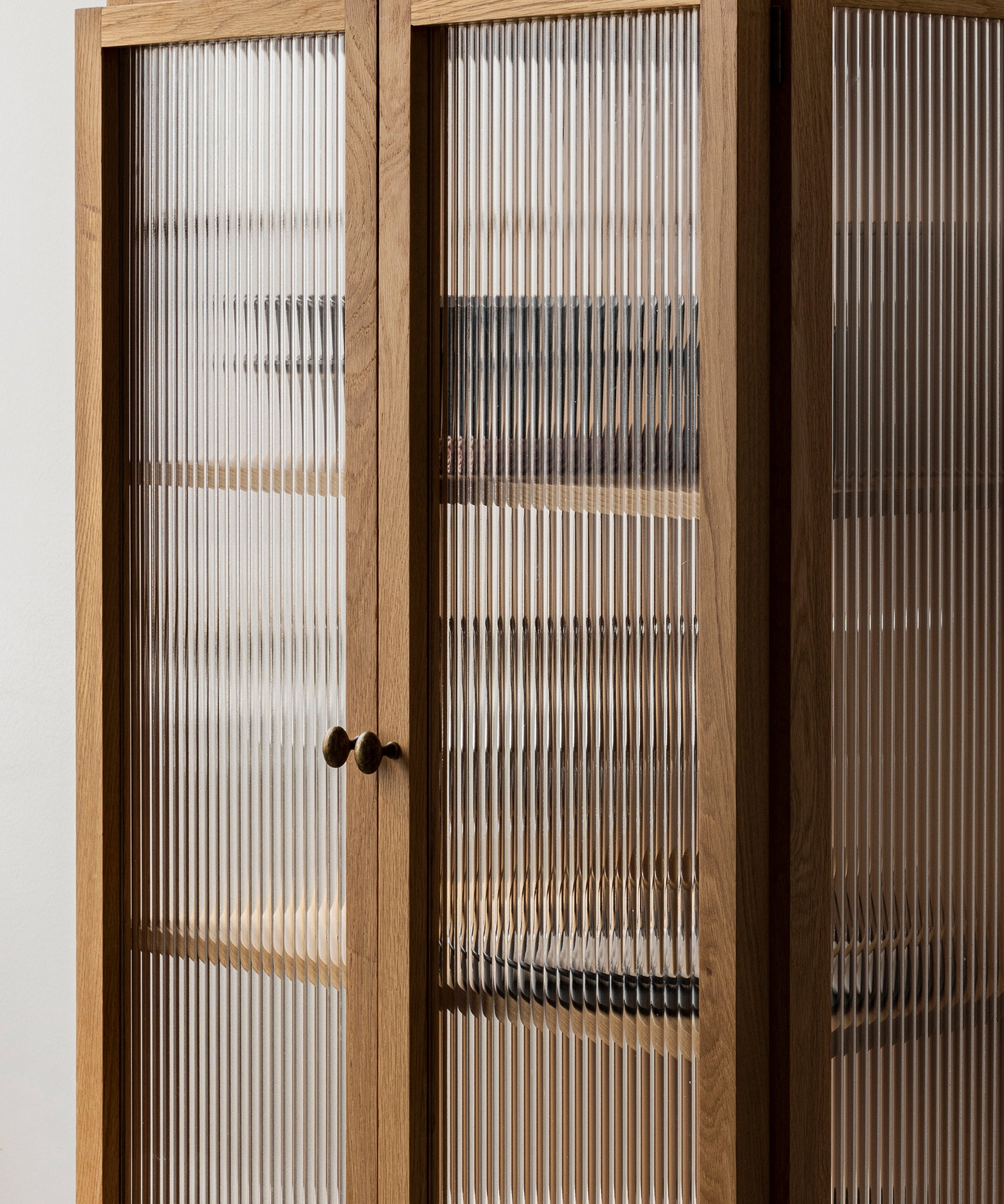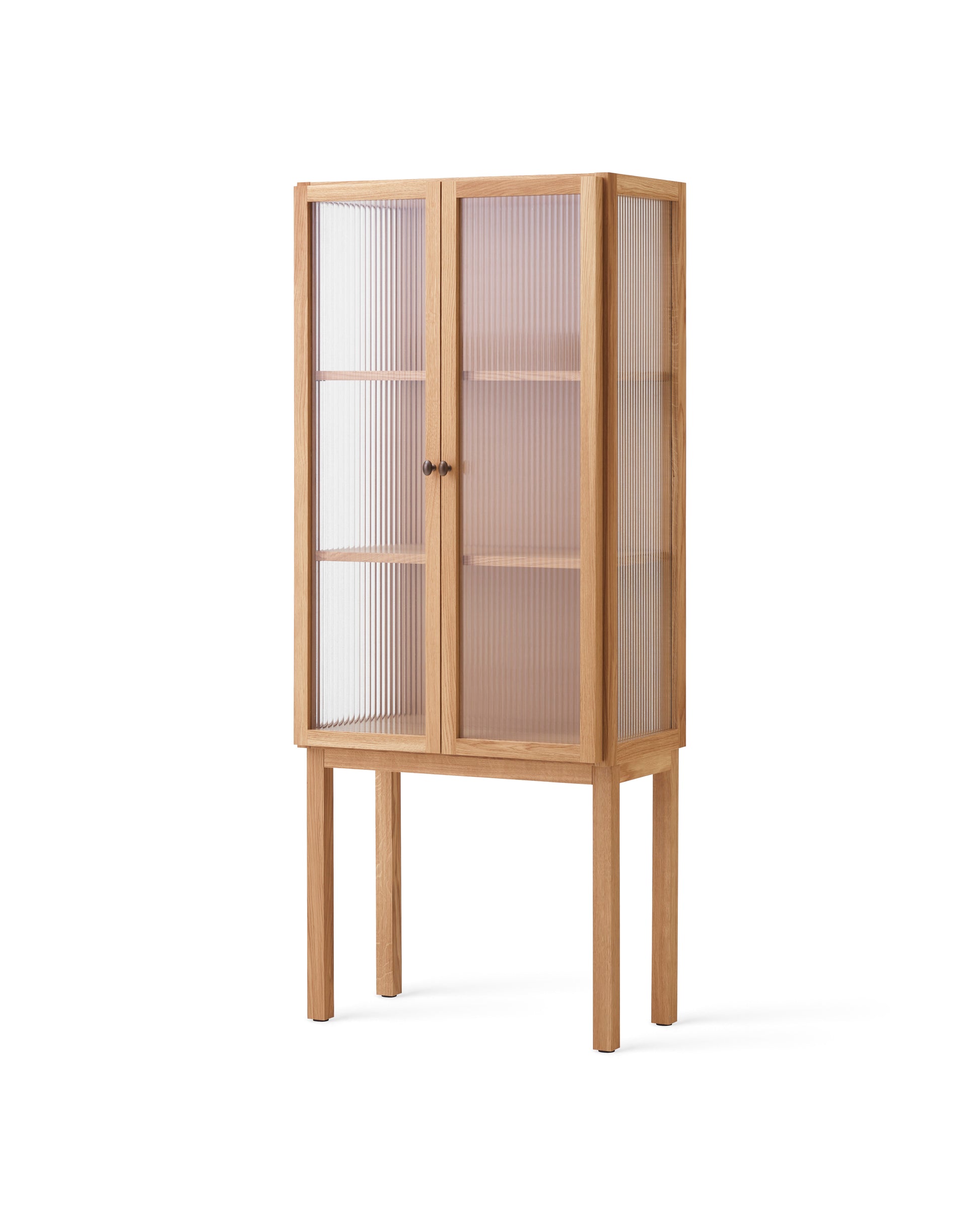Designed to store objects almost out of sight thanks to its elegant reeded glass doors that gently blur the contents within, it opens to reveal two height adjustable oak veneer shelves for ample room to store your objects. Brass hinges and handles complete the design. Available in low and high versions.