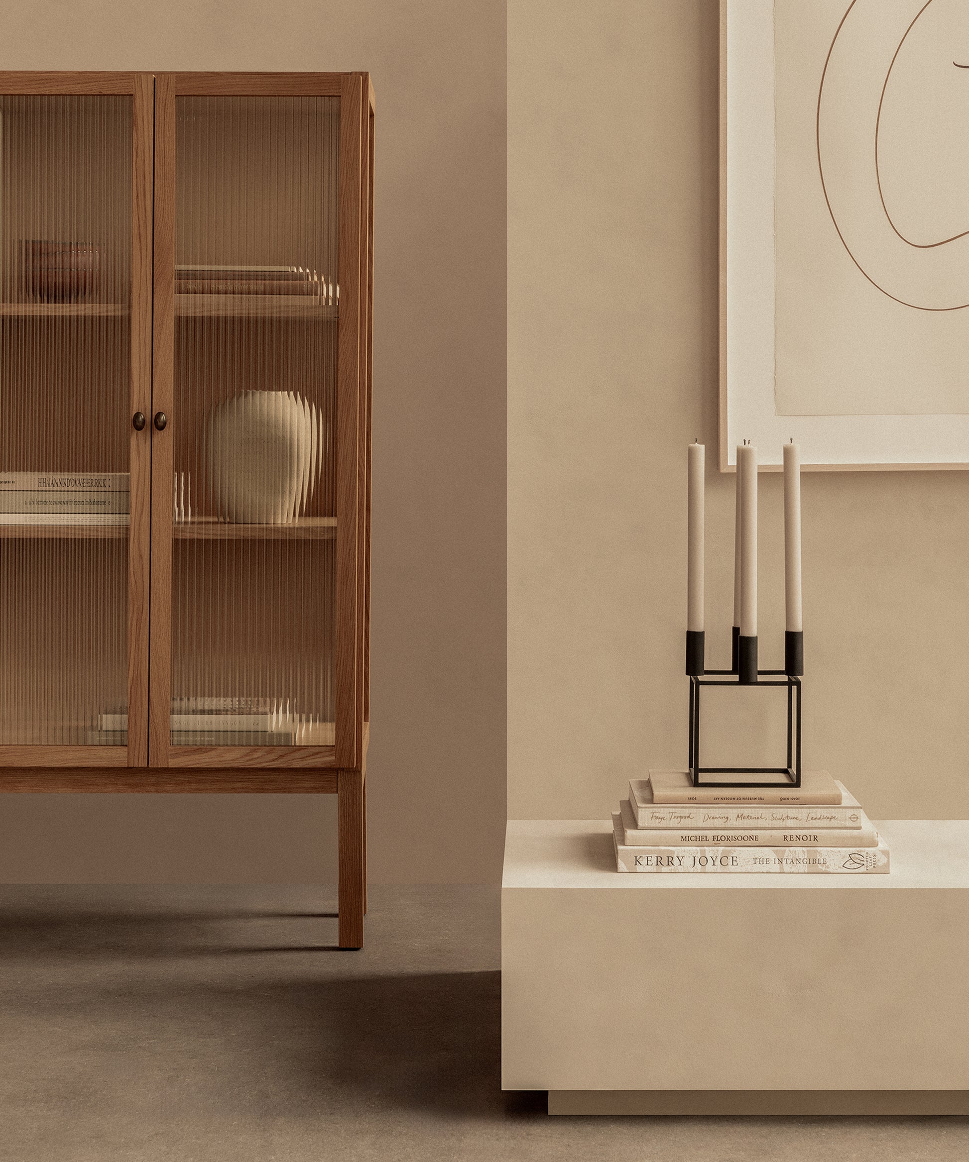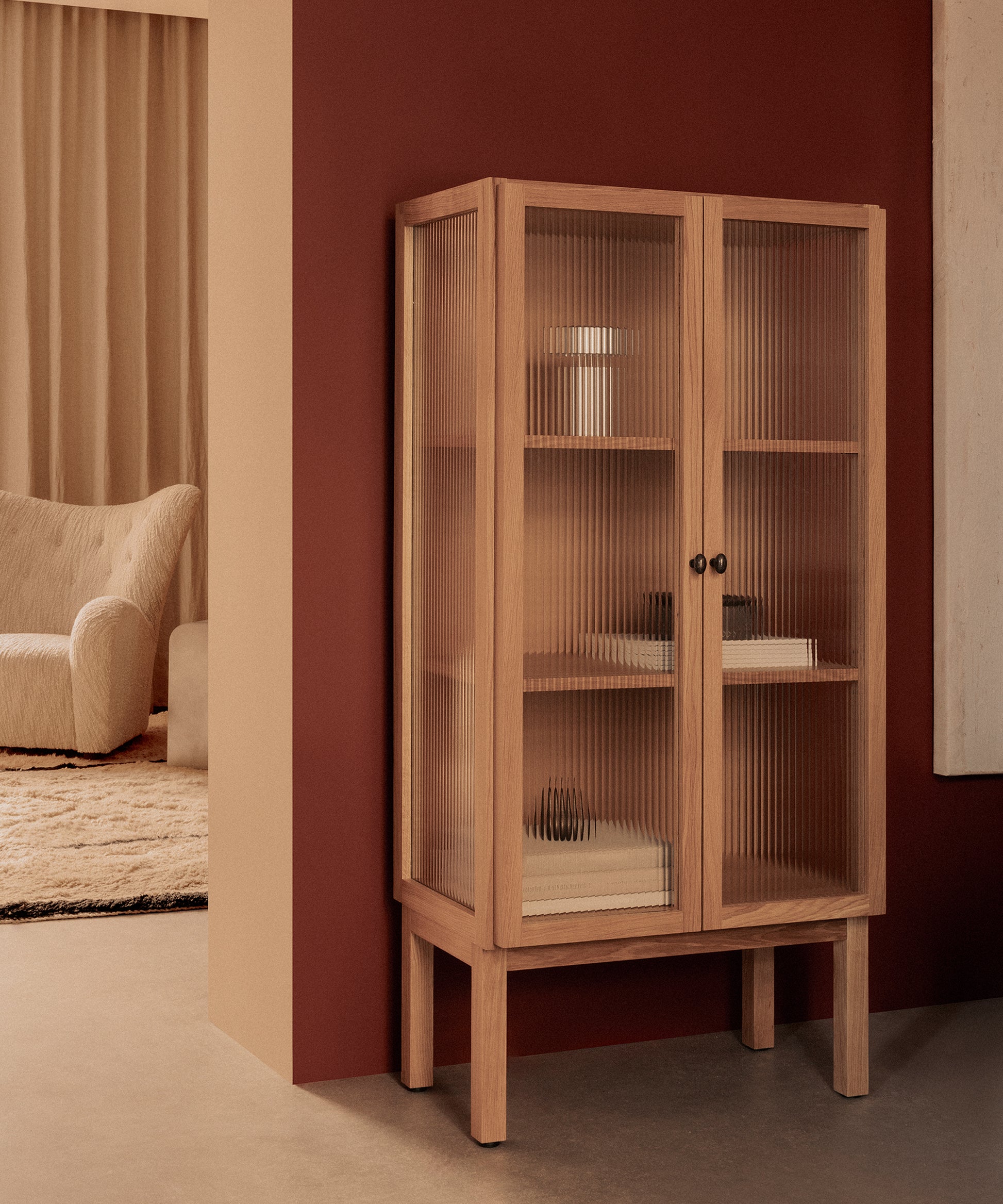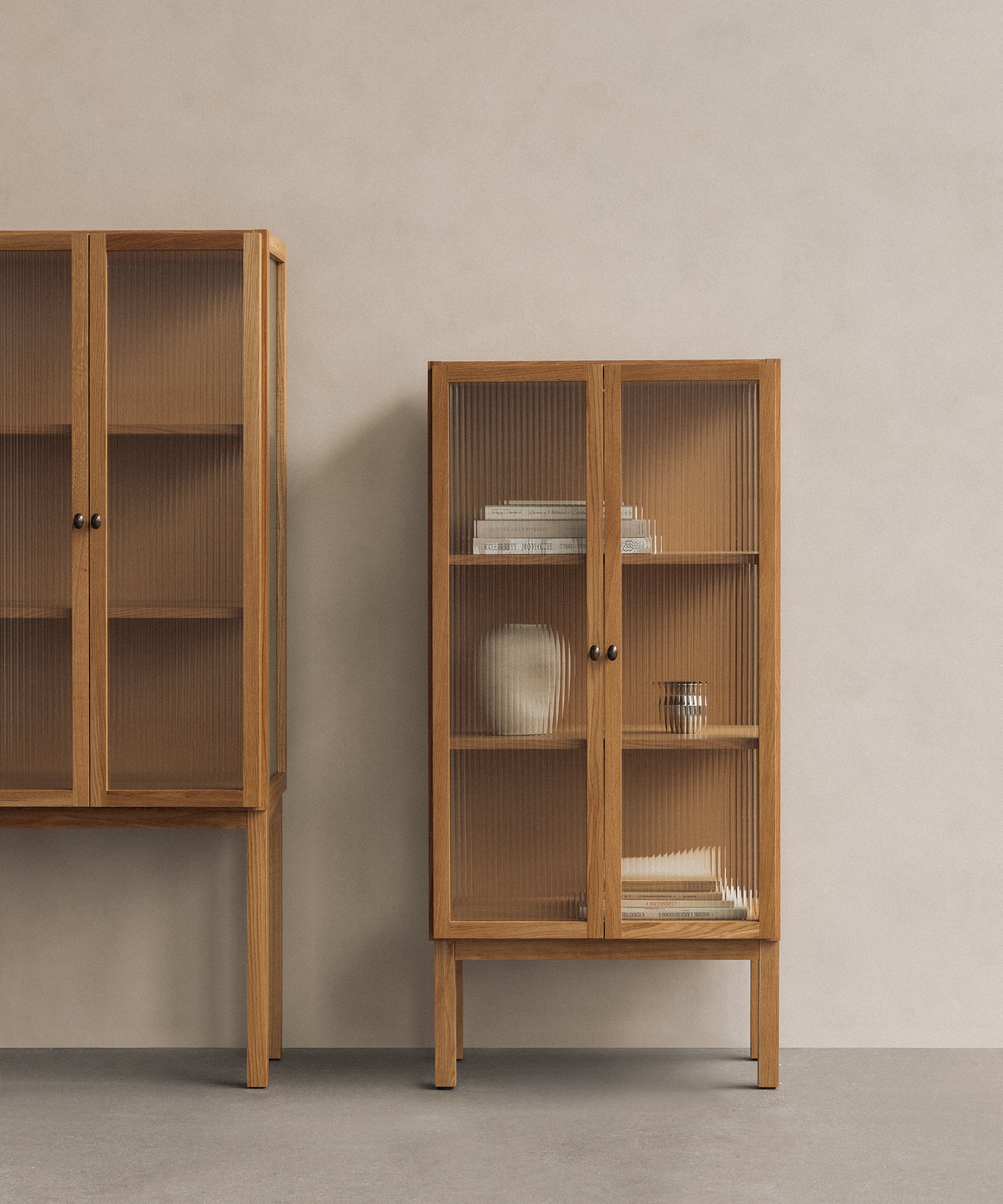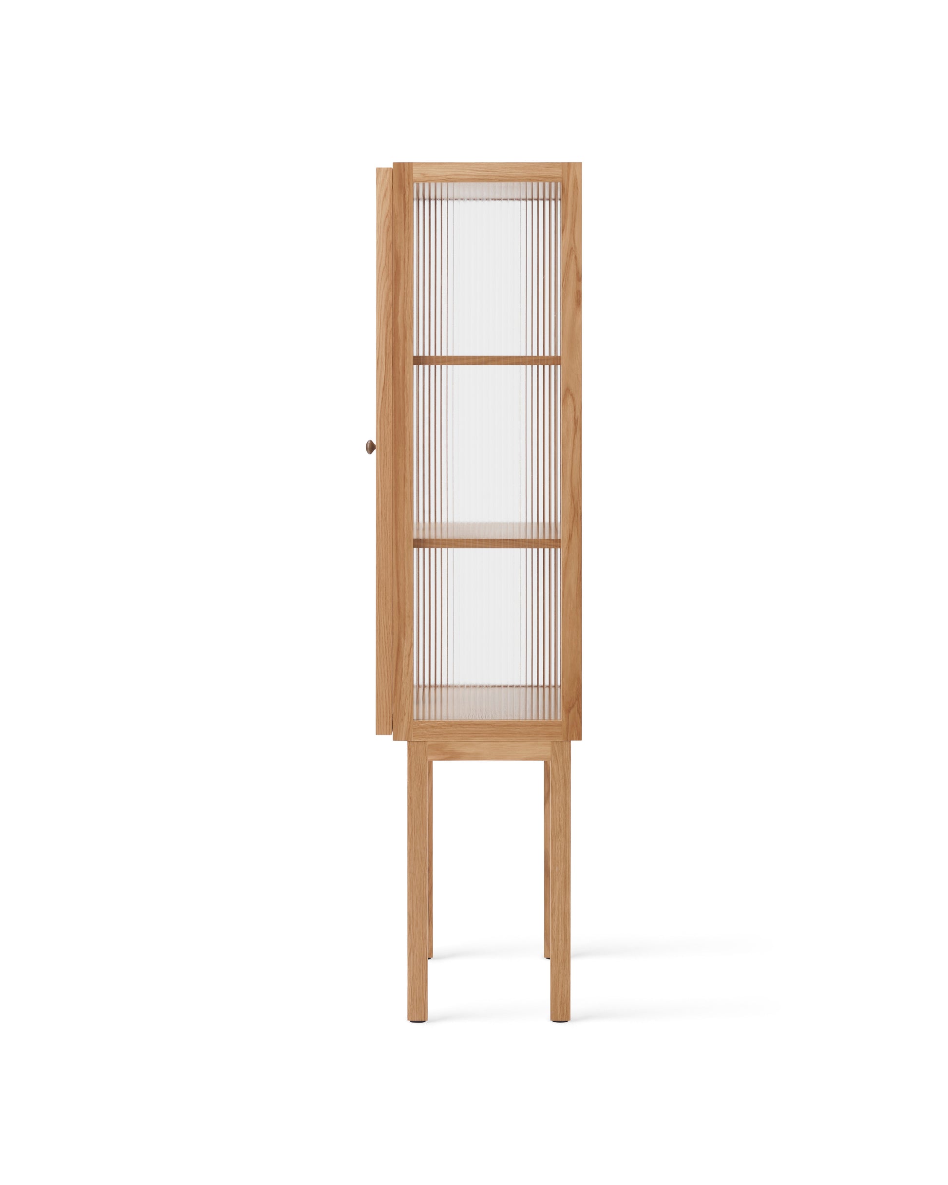 Designed to store objects almost out of sight thanks to its elegant reeded glass doors that gently blur the contents within, it opens to reveal two height adjustable oak veneer shelves for ample room to store your objects. Brass hinges and handles complete the design. Available in low and high versions.