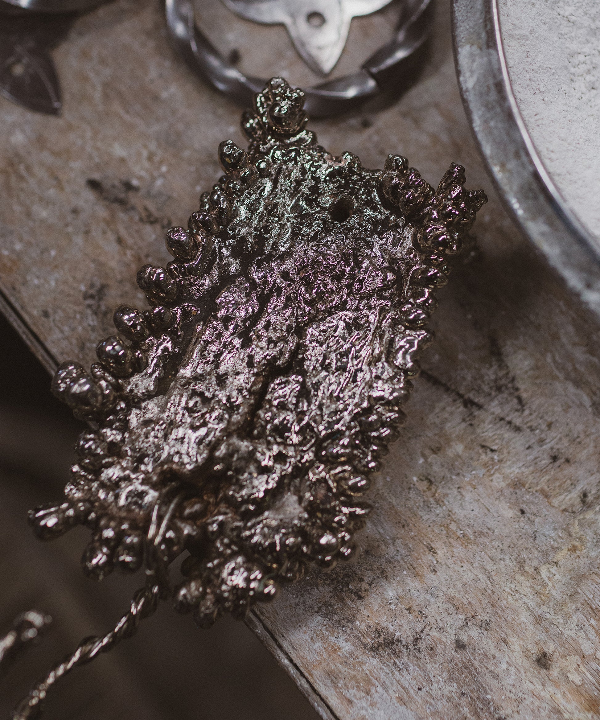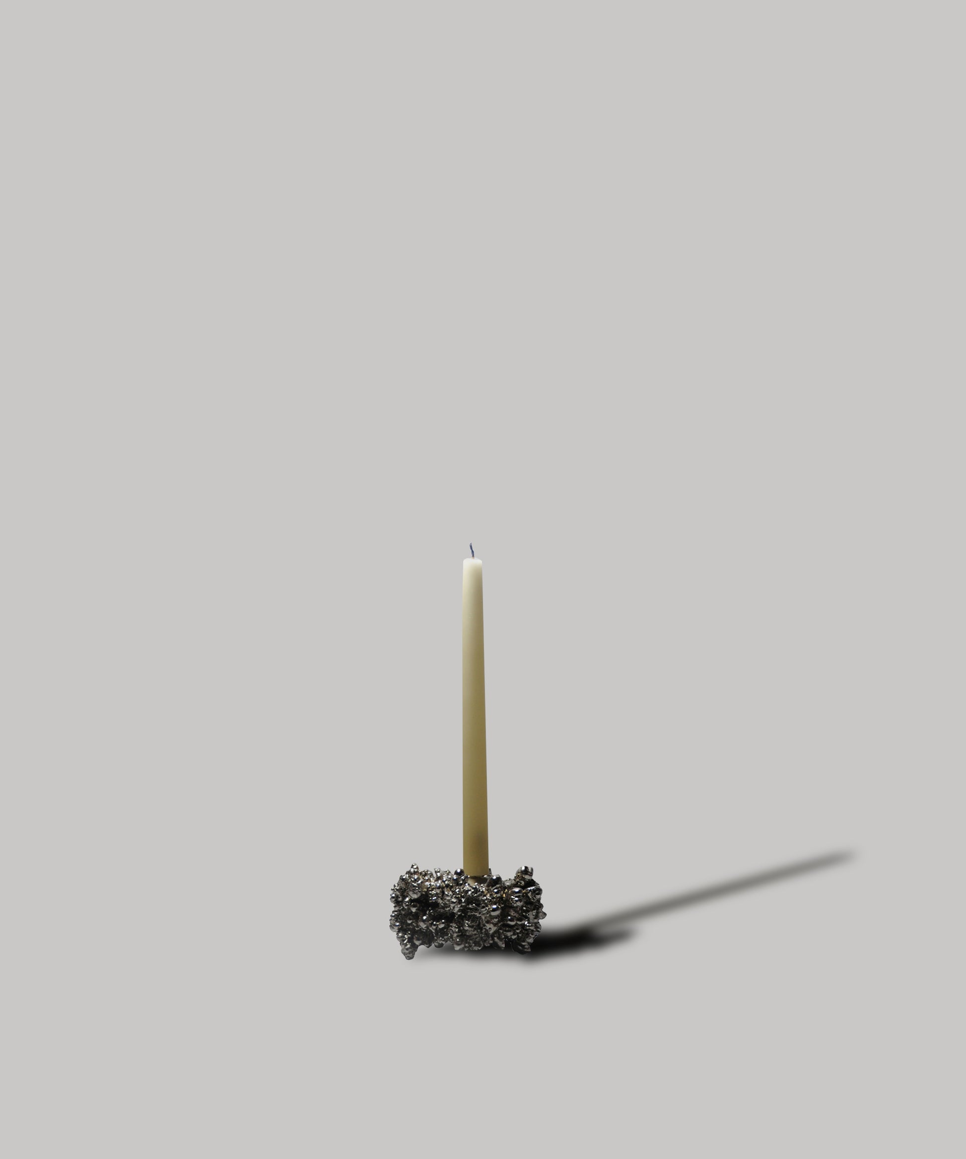 These rods, regularly used for submerging metal items into chrome baths, pile up residue through the years which results in heavy conglomerates of copper, nickel, and chrome. Byproducts of an industrial process but which remit to organic forms. This paradoxical entity whose finish stands as the "stereotype of the artificial" (Enzo Manzini), also directly references the natural, with coral-like formations. The specificity of the material's unique pattern formations reins over the object's final appearance. Chrome Candle Holder reveals itself as foreign, almost alien-like. The piece seems to have been recovered from the bottom of the ocean on a lost planet. It is generative in the sense that it accidentally opens a narrative. An object that generates a fissure from which fantasy spills into reality. Informing an imaginative play and creating a scenography from a parallel fiction.