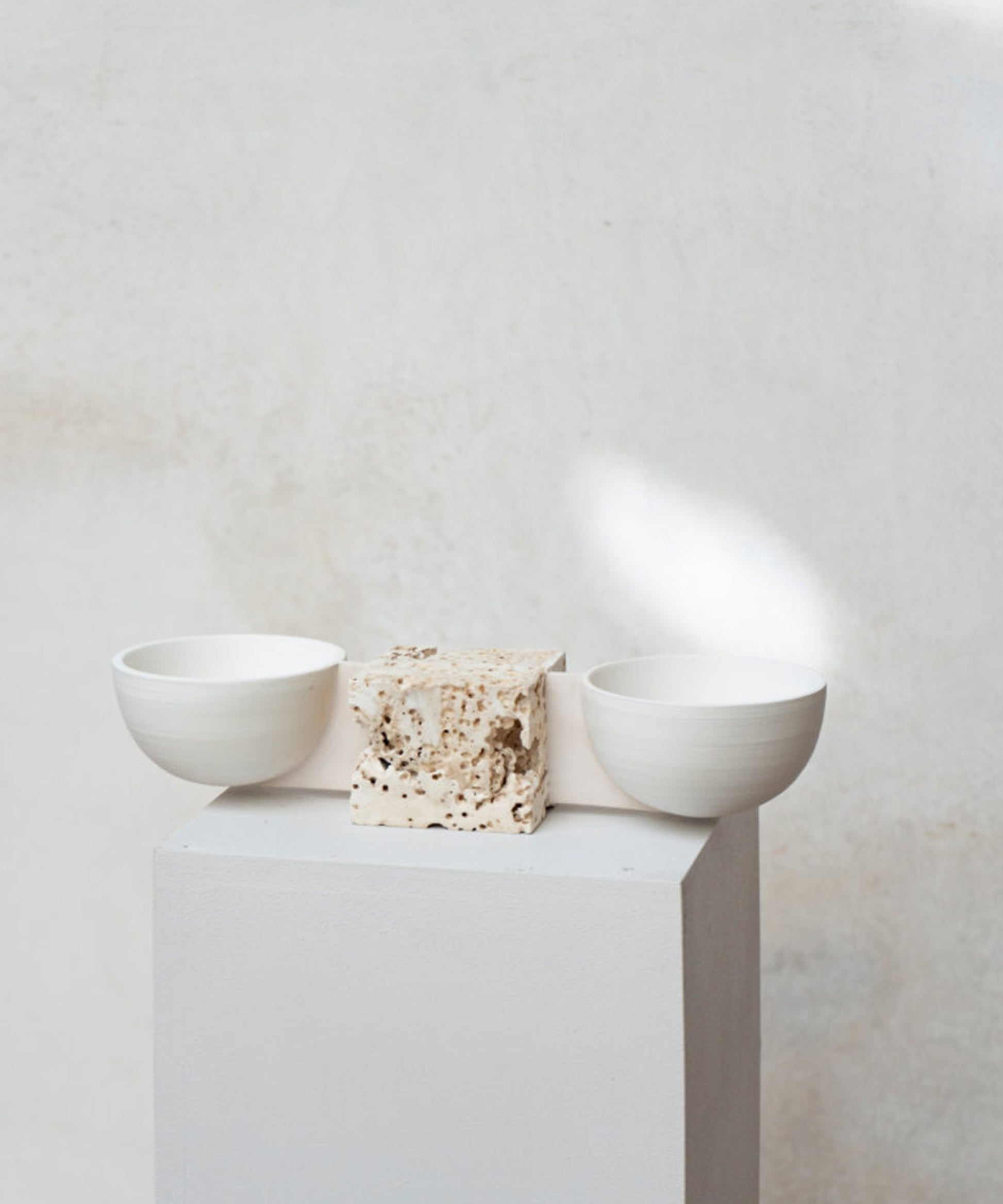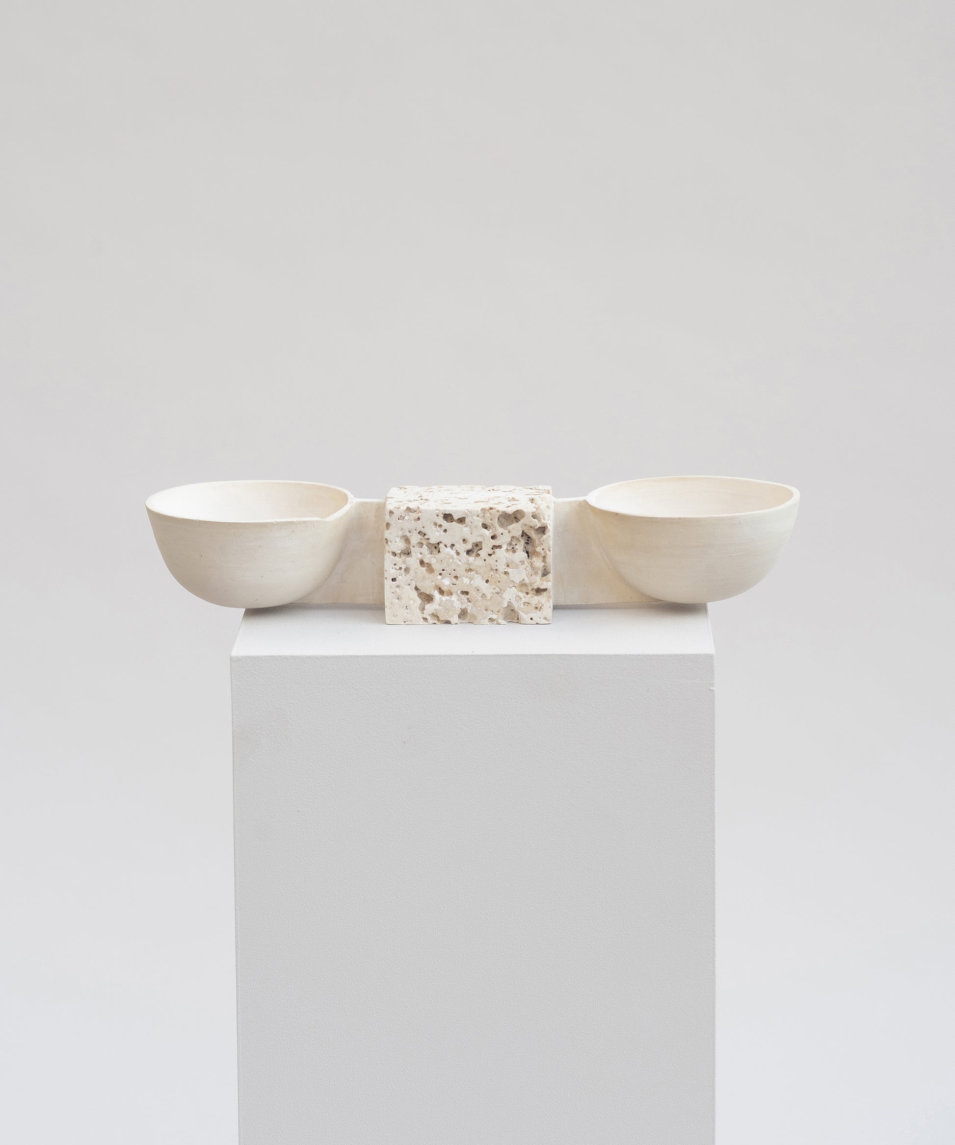 The pieces are inspired by traditional pottery and made up of intersecting earth and stone through fired clay and stone cast. The concept starts from the concave and circular shapes of the bowl and plate, depriving them of their original functionality. As an archeological site, the pieces operate as time capsules: searching for leads from their material remains, thinking of possible futures in the past.