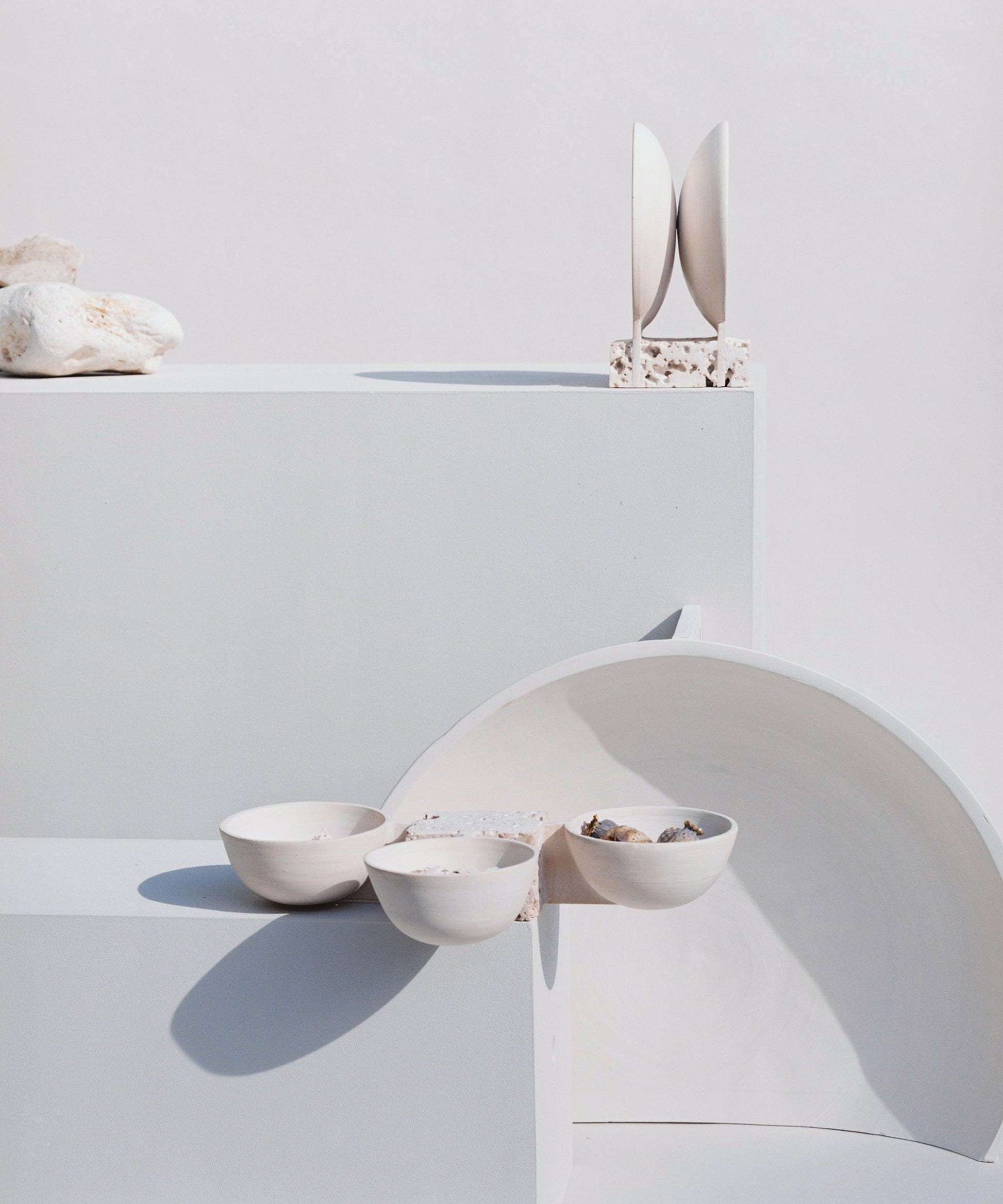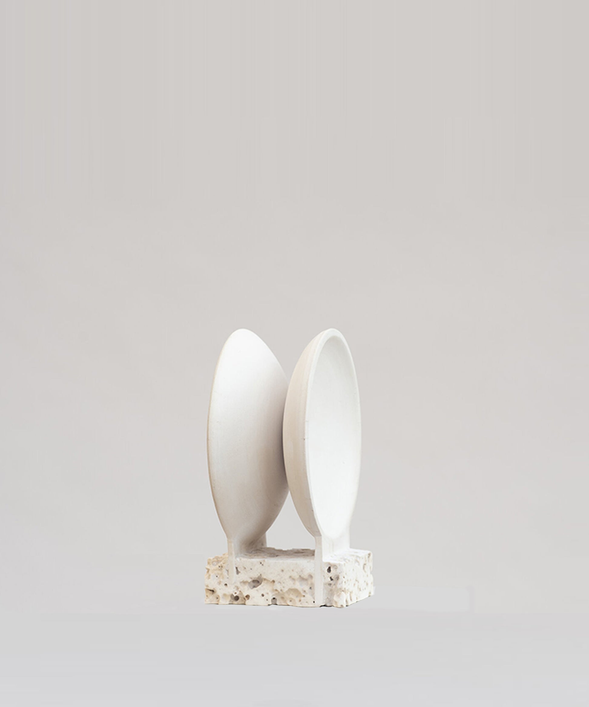 The pieces are inspired by traditional pottery and made up of intersecting earth and stone through fired clay and stone cast. The concept starts from the concave and circular shapes of the bowl and plate, depriving them of their original functionality. As an archeological site, the pieces operate as time capsules: searching for leads from their material remains, thinking of possible futures in the past.
