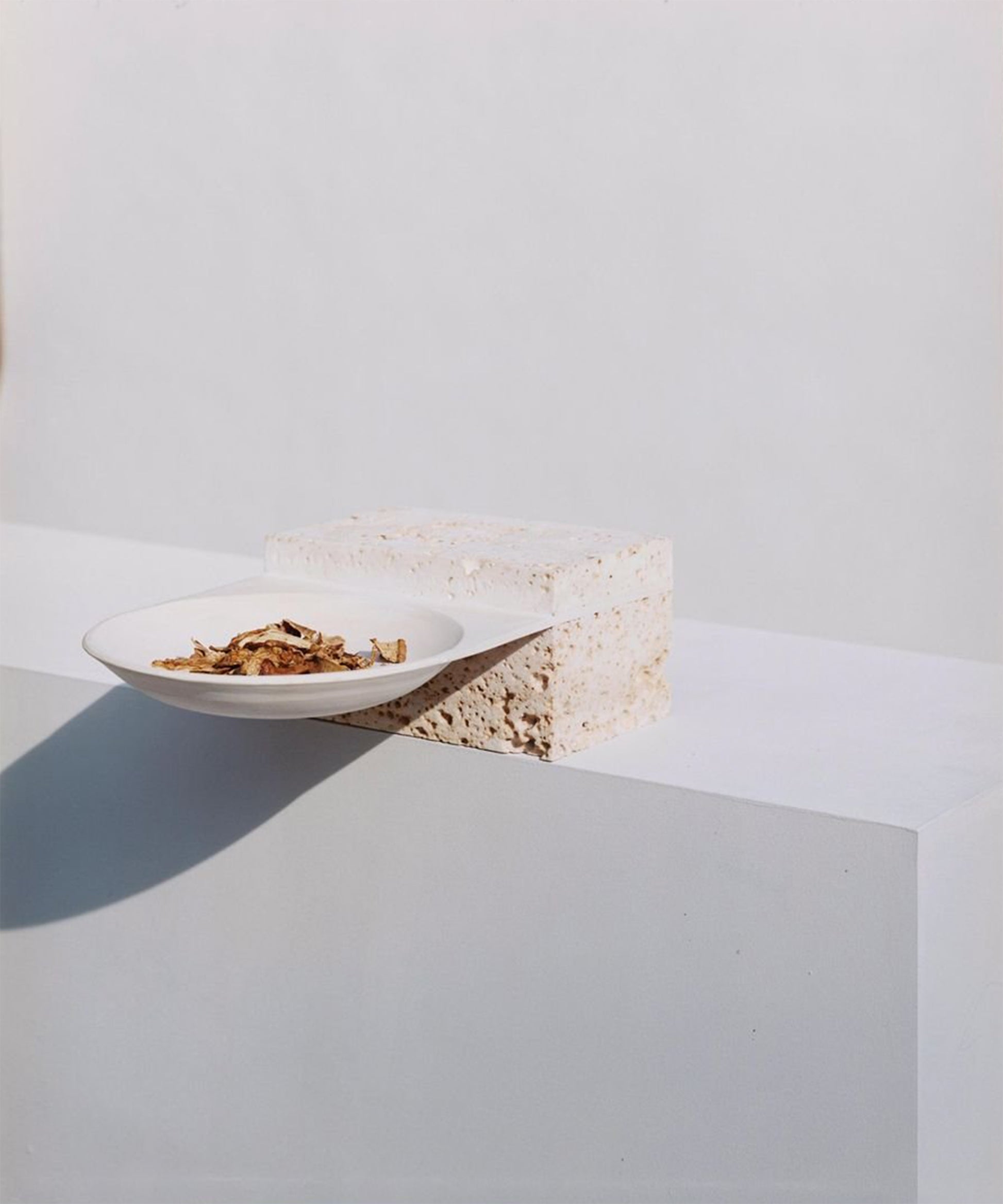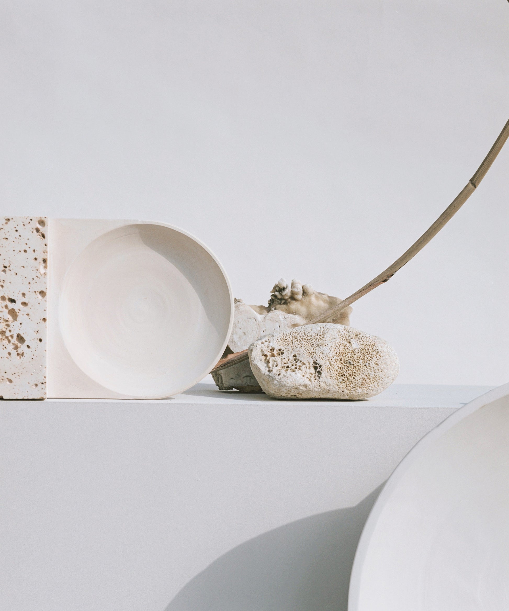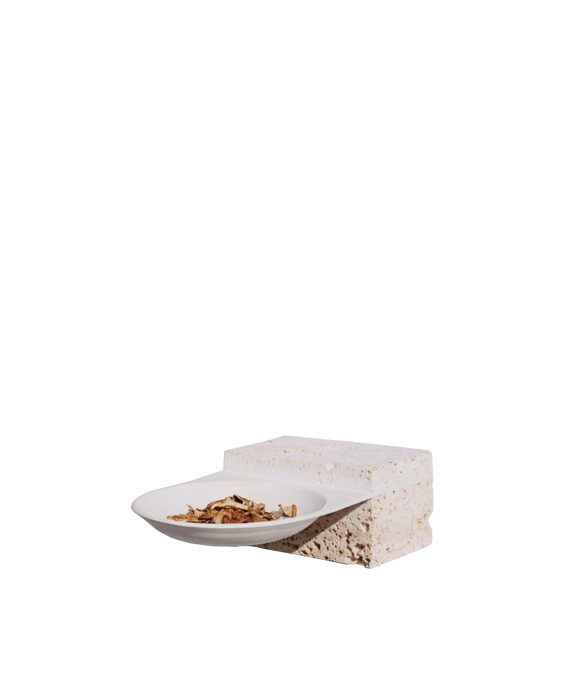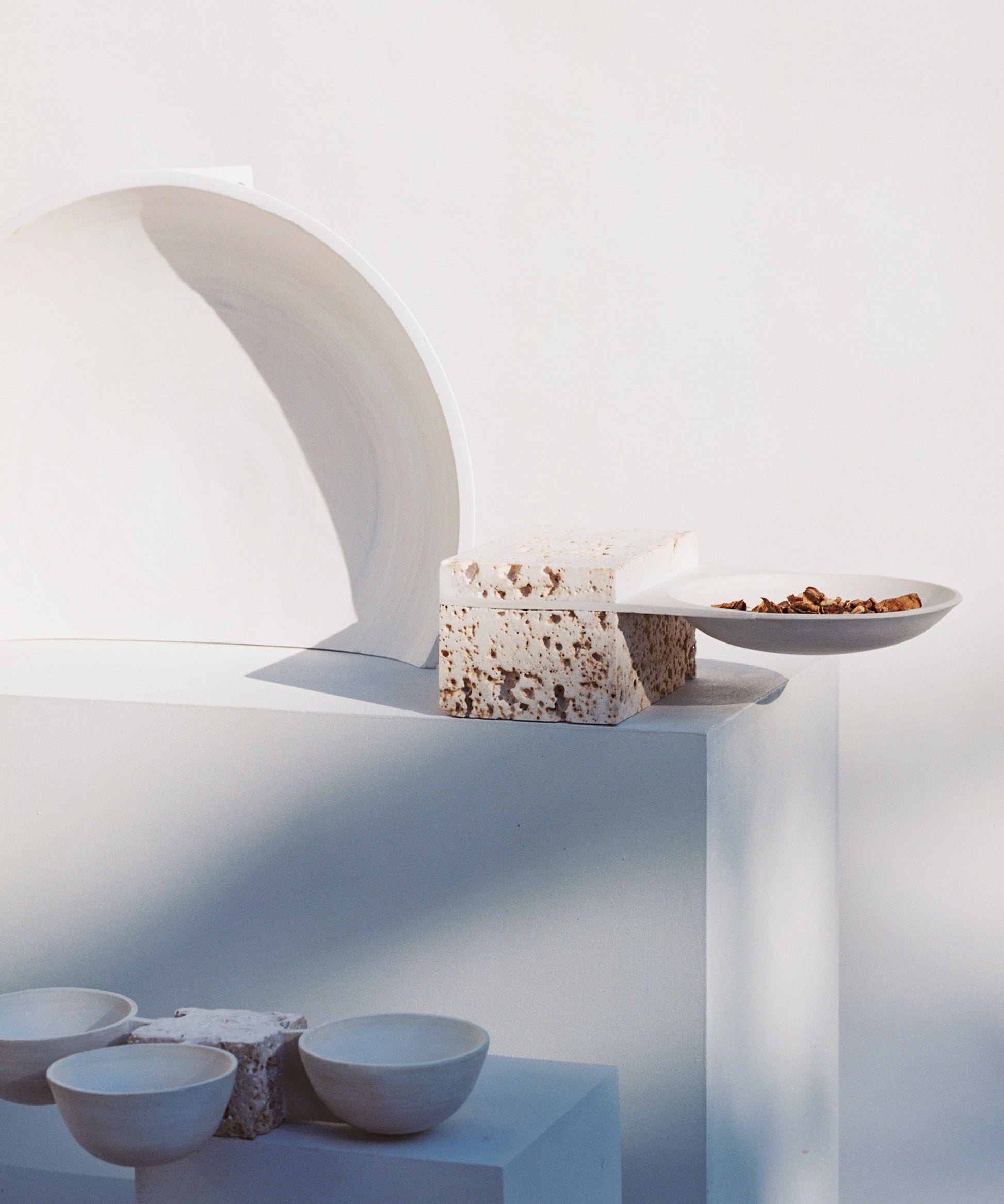 The pieces are inspired by traditional pottery and made up of intersecting earth and stone through fired clay and stone cast. The concept starts from the concave and circular shapes of the bowl and plate, depriving them of their original functionality. As an archeological site, the pieces operate as time capsules: searching for leads from their material remains, thinking of possible futures in the past.