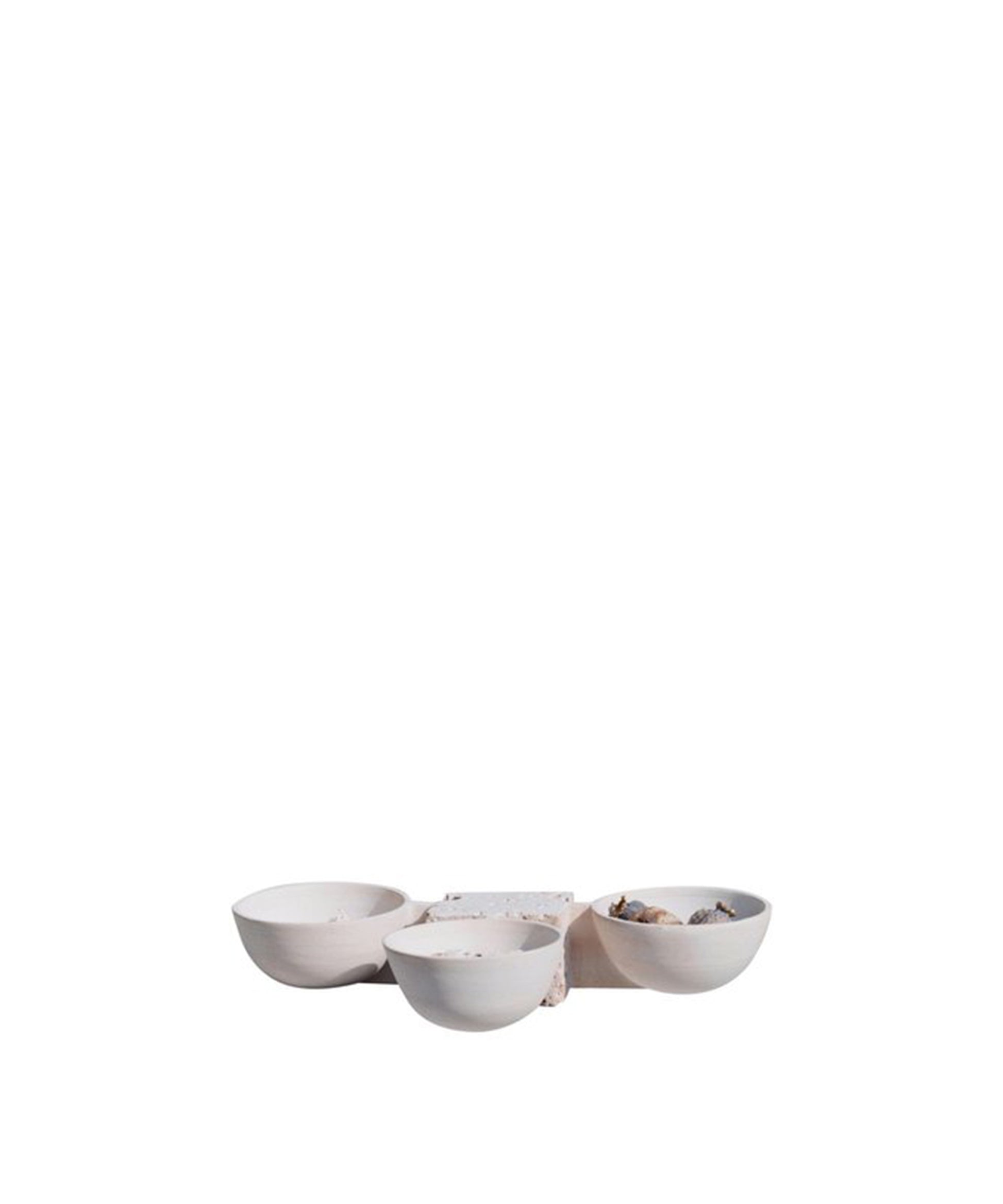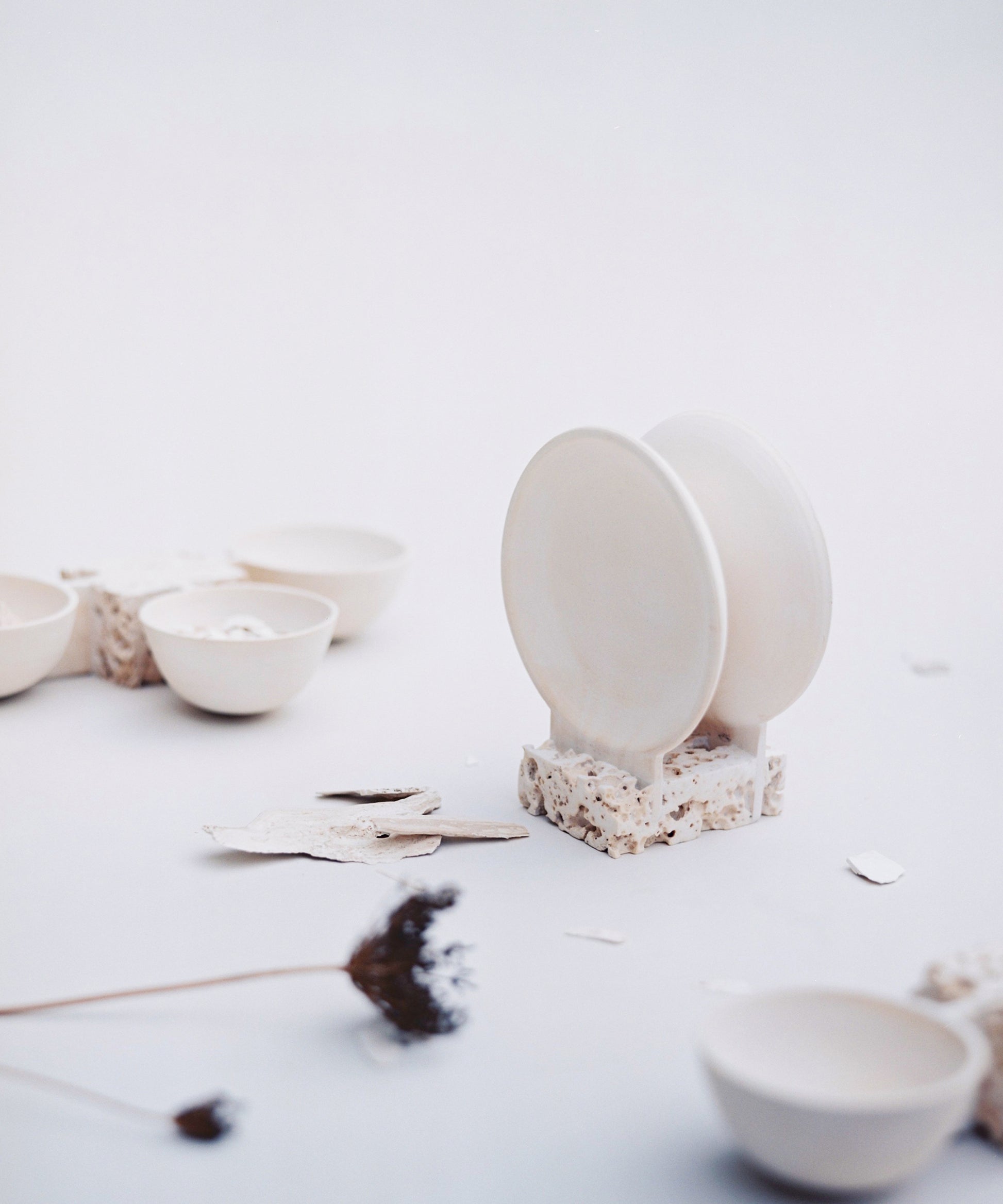 The pieces are inspired by traditional pottery and made up of intersecting earth and stone through fired clay and stone cast. The concept starts from the concave and circular shapes of the bowl and plate, depriving them of their original functionality. As an archeological site, the pieces operate as time capsules: searching for leads from their material remains, thinking of possible futures in the past.