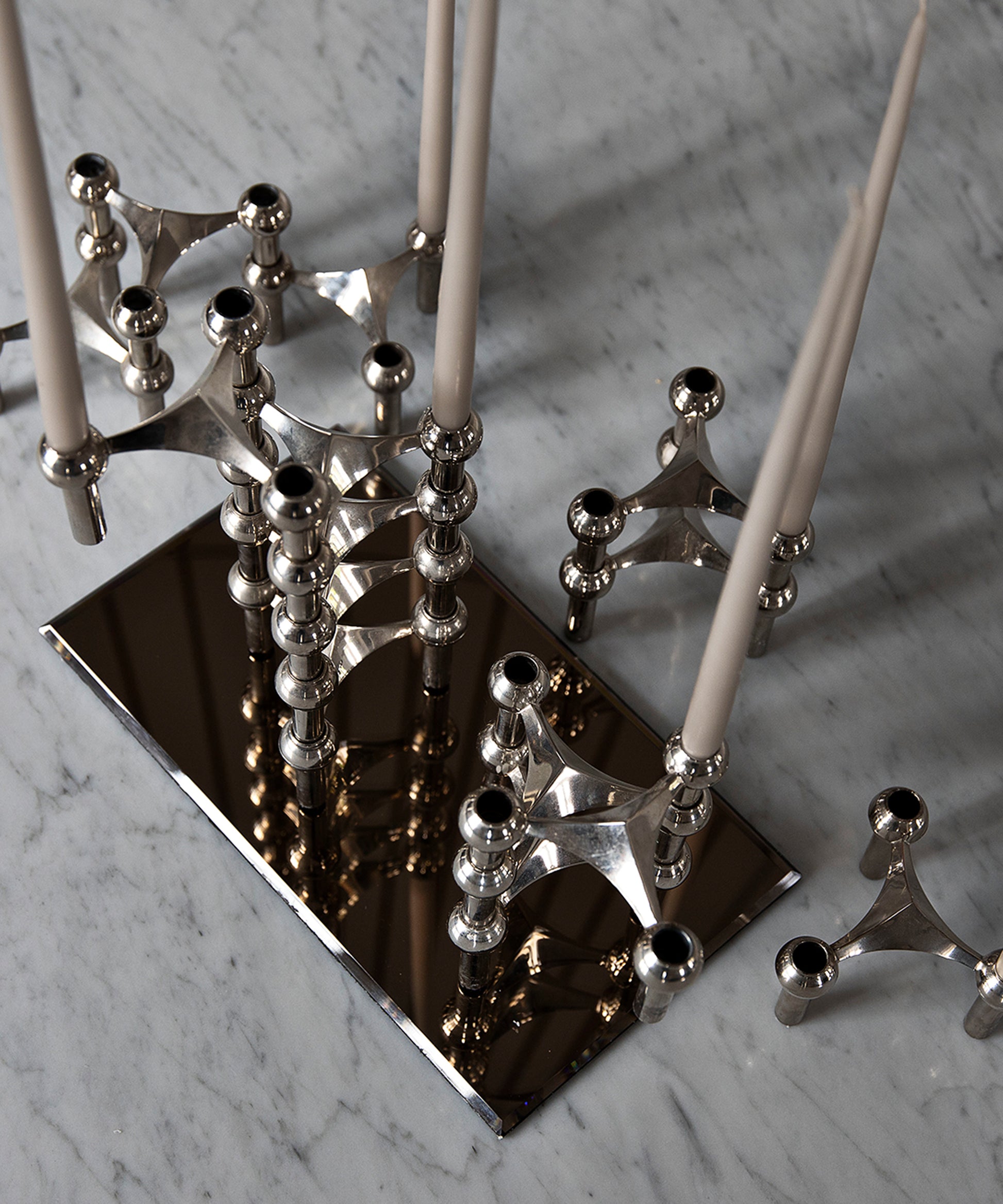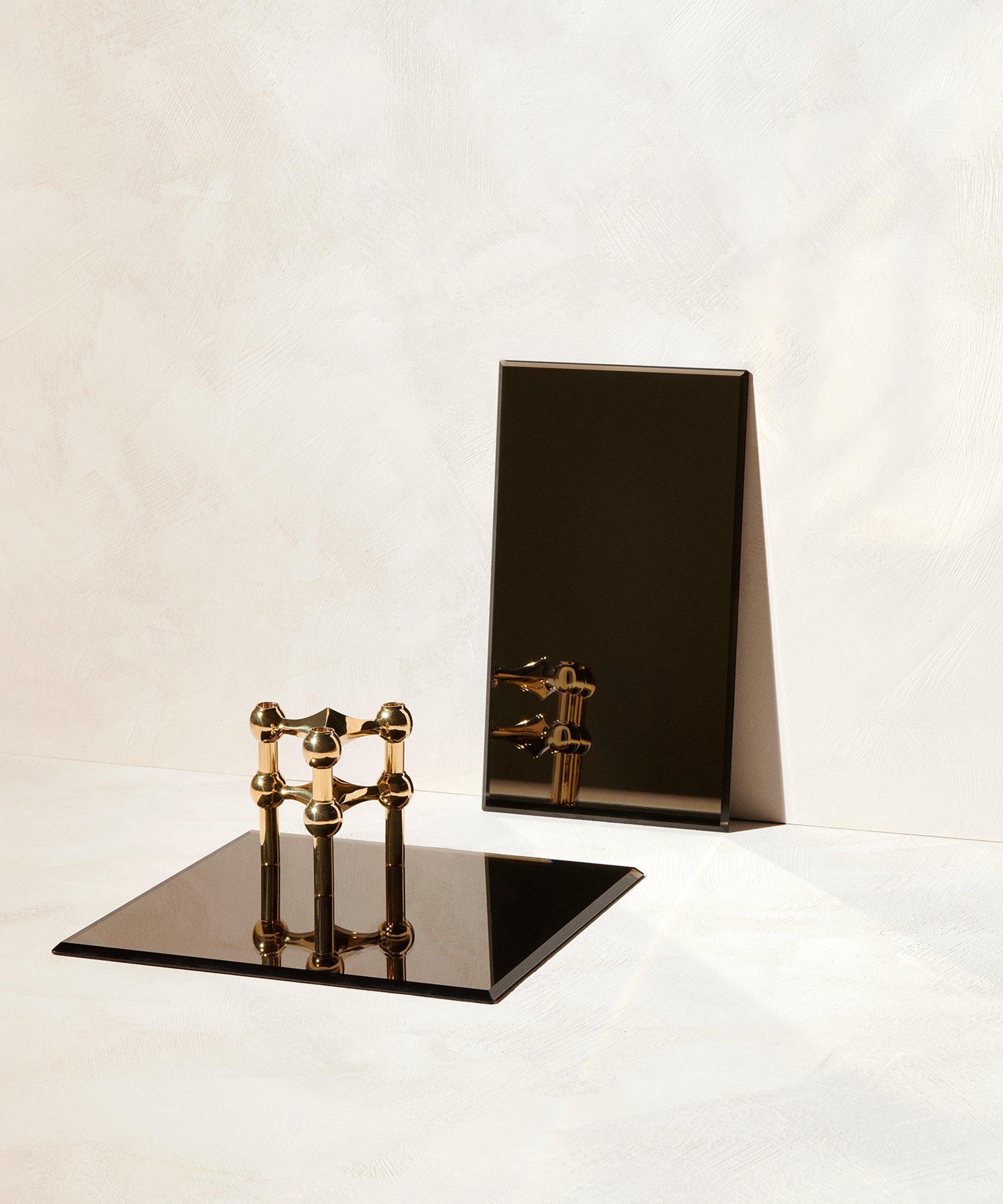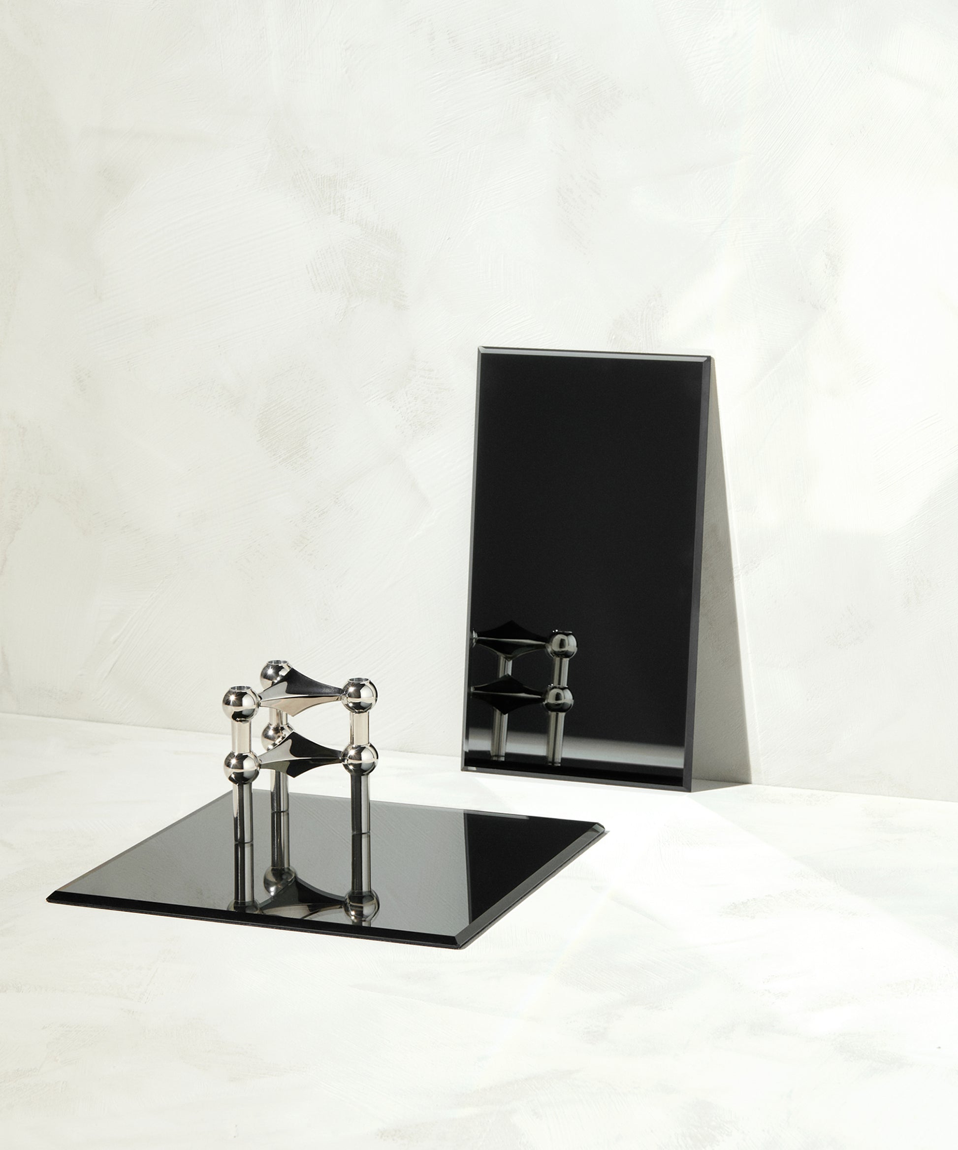 Glass base is an exclusive addition to the STOFF Nagel family. The special mirror effect embraces the light and elegantly captures the sculptural reflections of the candle holders.