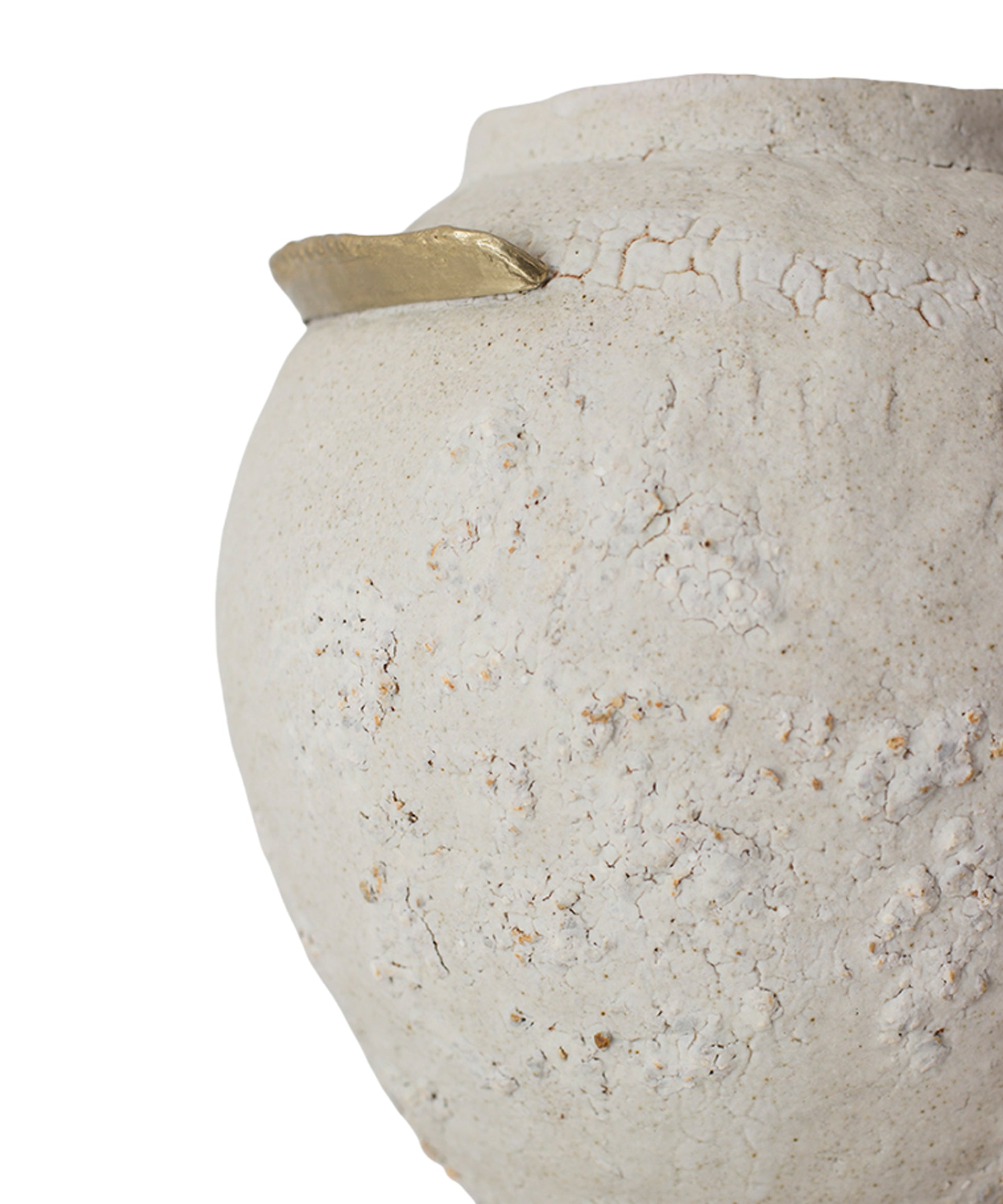 The "Isolated" series by Canoa Lab is comprised of reworked and redesigned forms and shapes from ancient Mediterranean vases. Each piece is designed in isolation and with larger dimensions, using the coiling technique. In some of these vases, metal is used, by employing precious metalworking techniques, such as wax-modelling and lost-wax casting. All of the pieces in this series are made of stoneware with grog from Manises (Valencia), and self-formulated glazes. The metal pieces are made of cast brass.