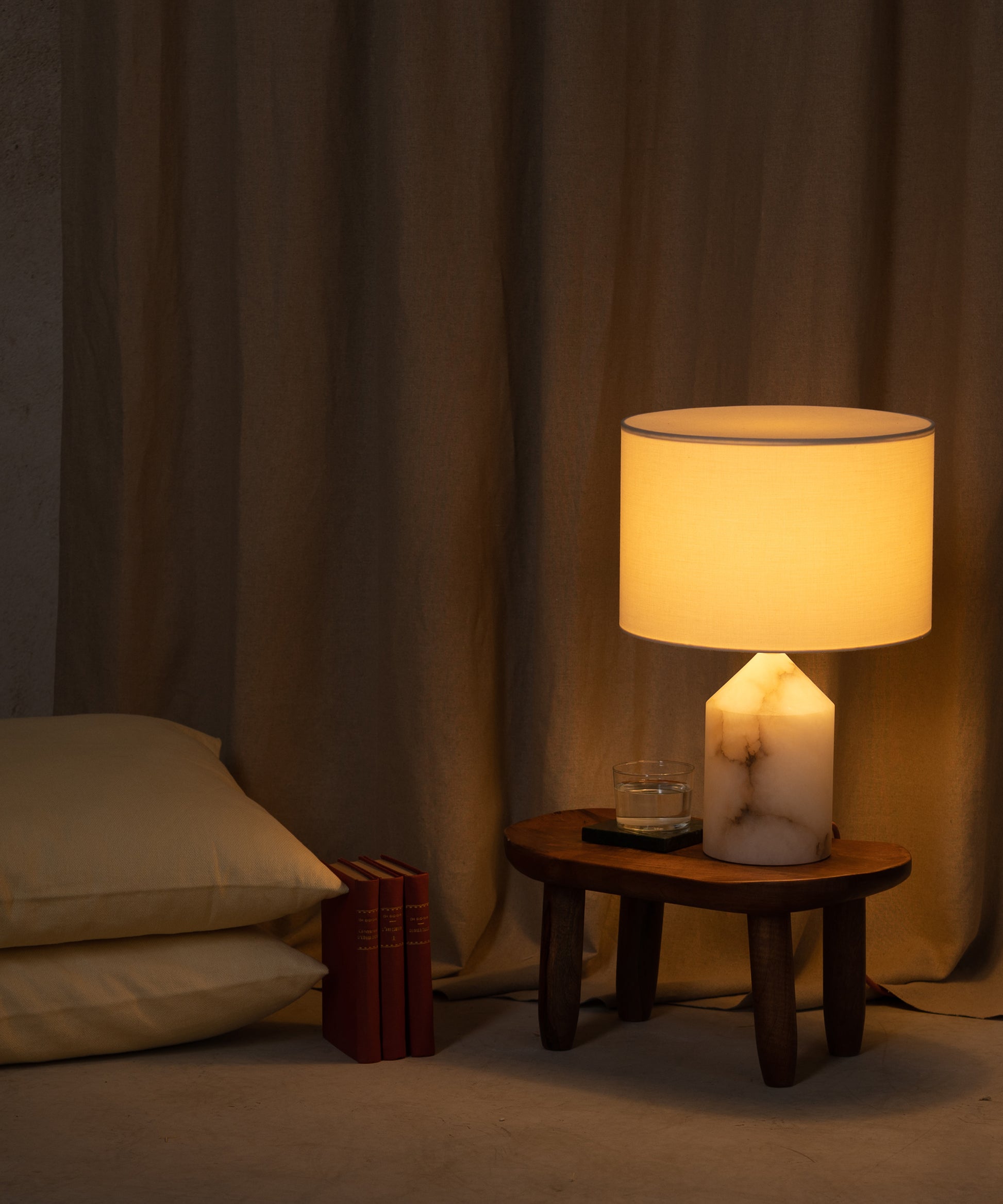 A perfect nightstand table lamp available in various finishes and colors (stone, ceramic, and wood)