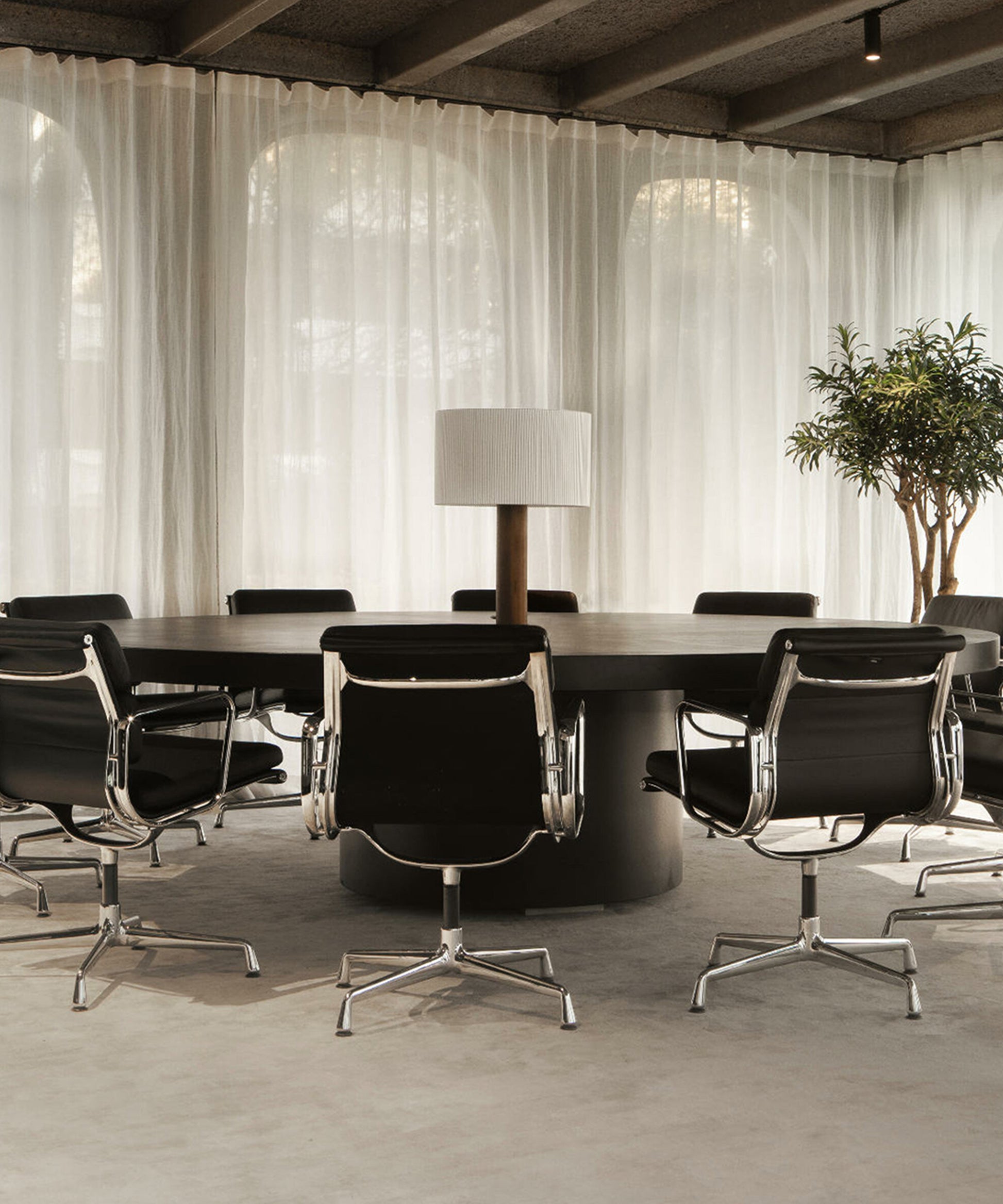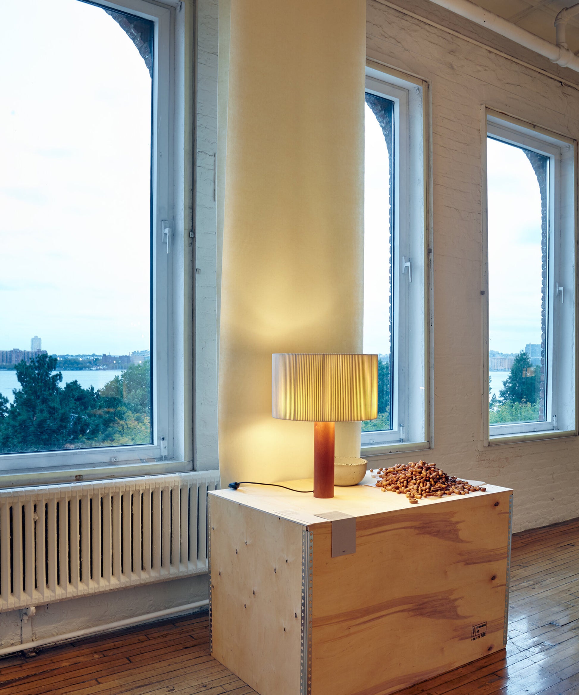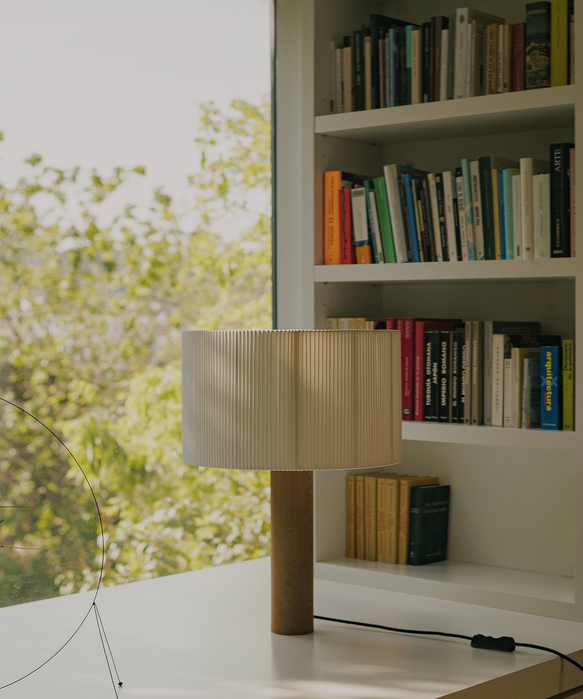 The shade is made from cotton ribbon and has a thread running along the edge, reminiscent of bookbinding, forming an asymmetry that creates a splendid contrast of light and shadow.