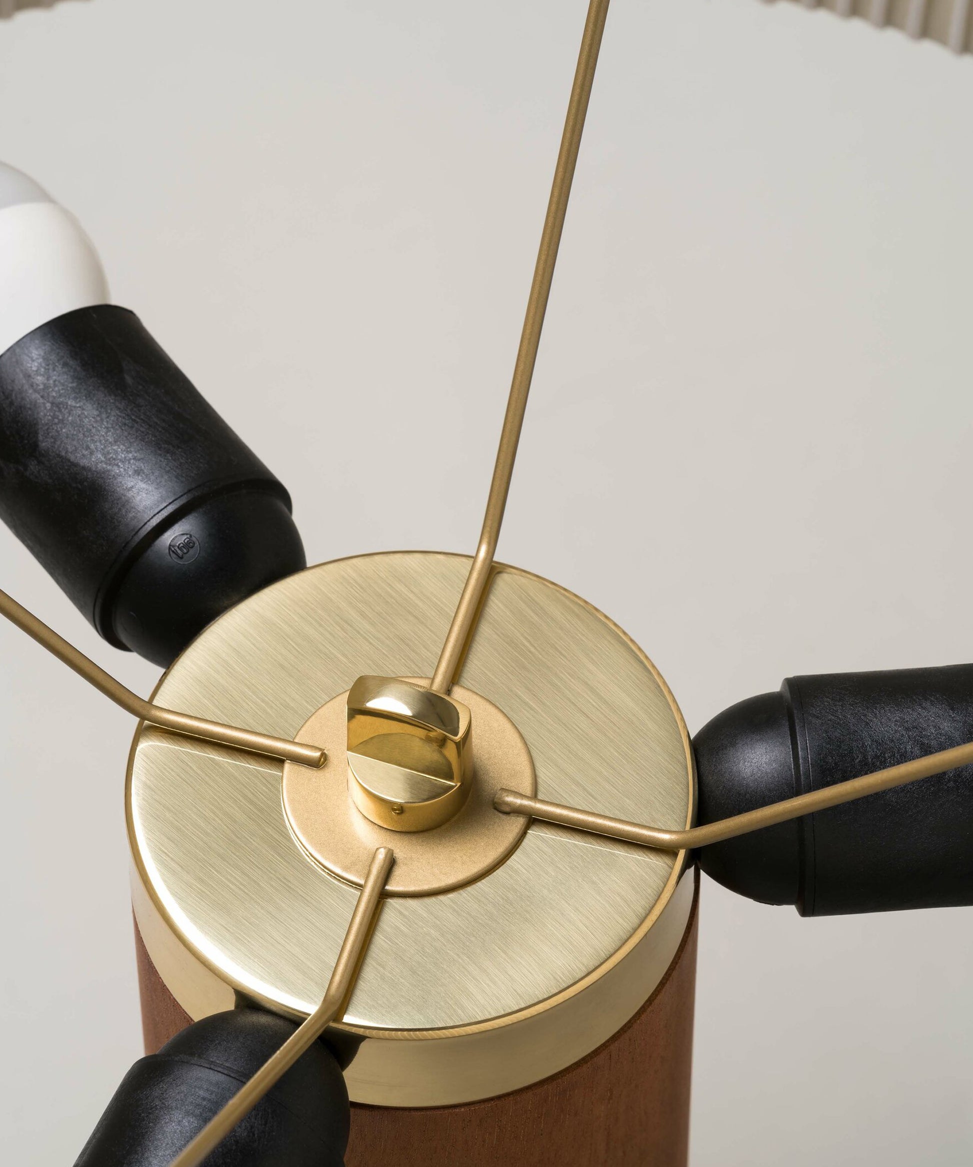 • A sturdy wooden cylinder supports a head with three bulbs, surrounded by a generous circular shade.
