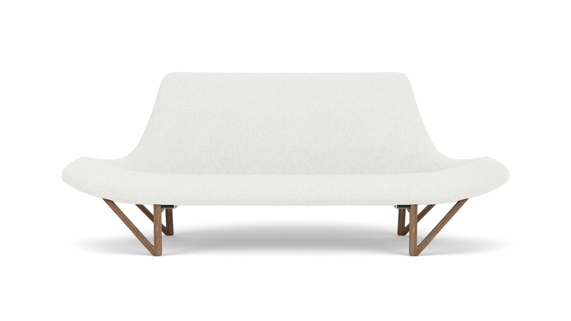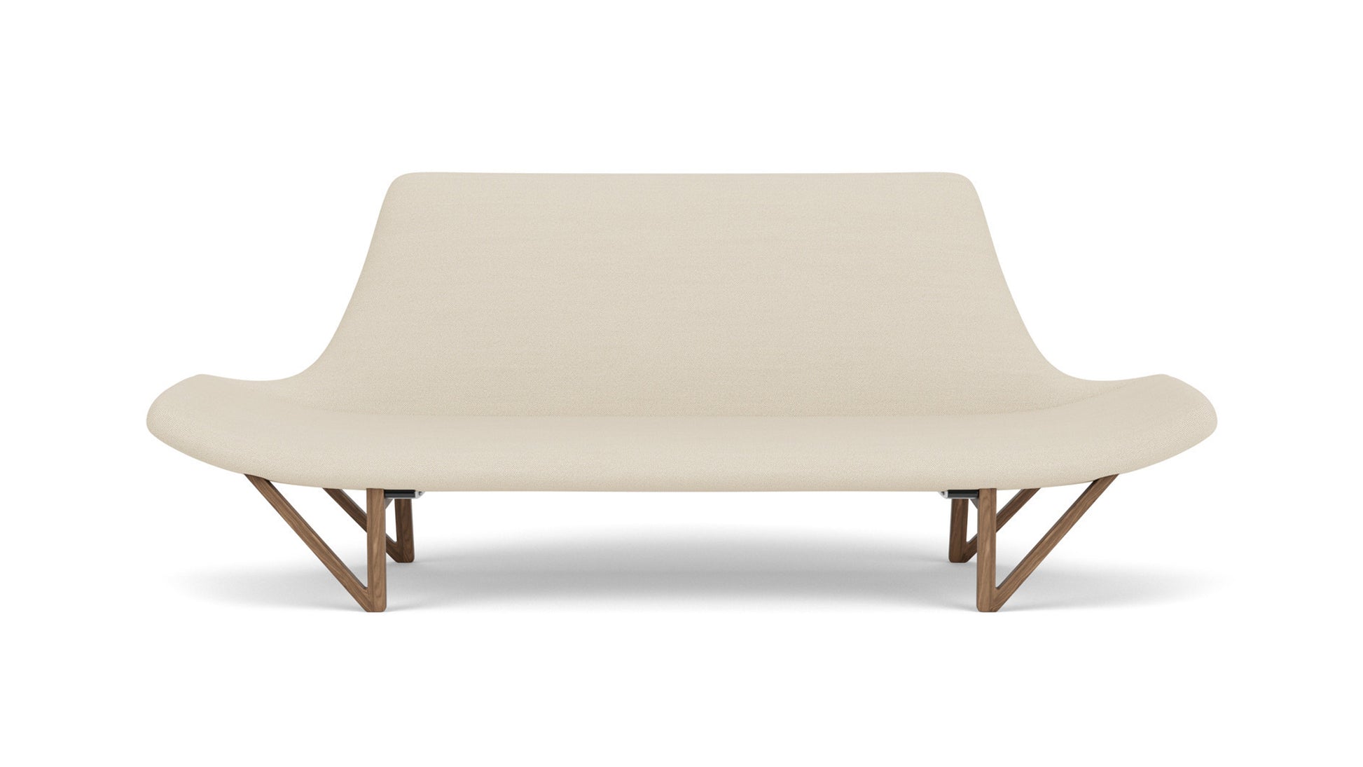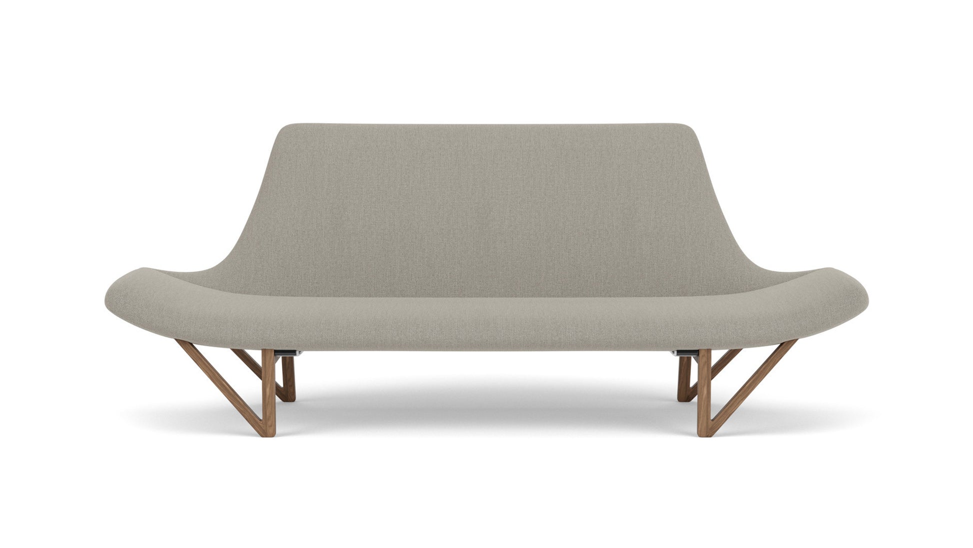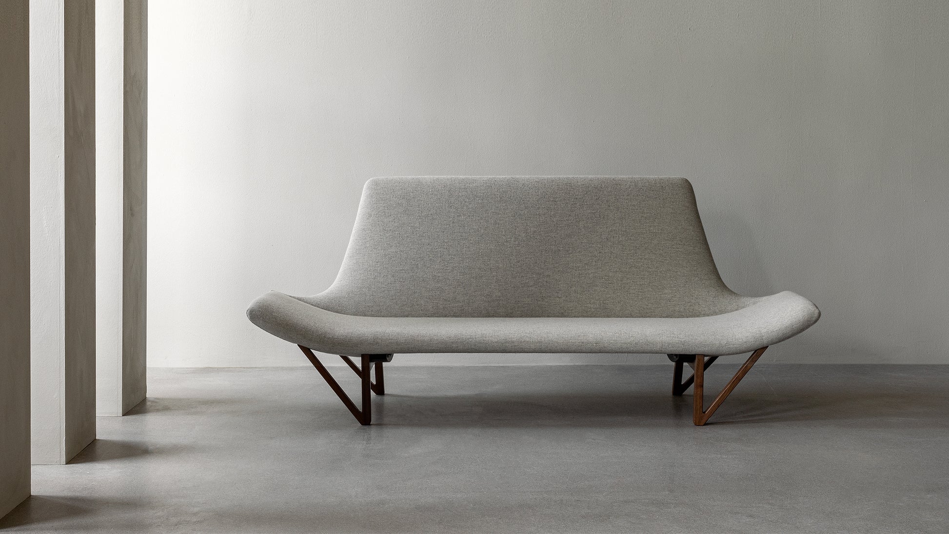 The inventive, curvilinear shape of the Pagode Sofa is as relevant today as it was when first designed in 1956. Looking to Asian architecture and temples for inspiration, the elegant design features beautifully crafted V-shaped wooden legs and a low seat with distinctive armrests, and a high back to cradle and support.