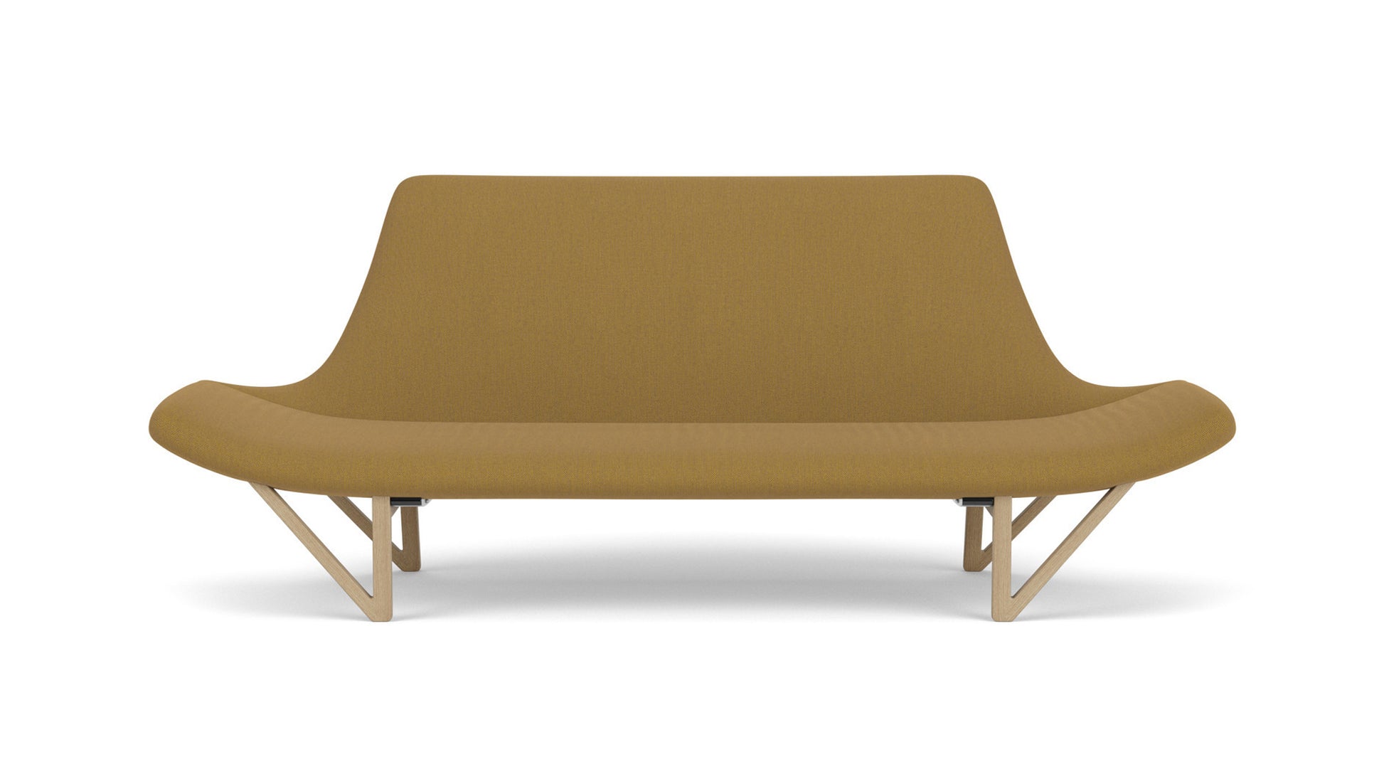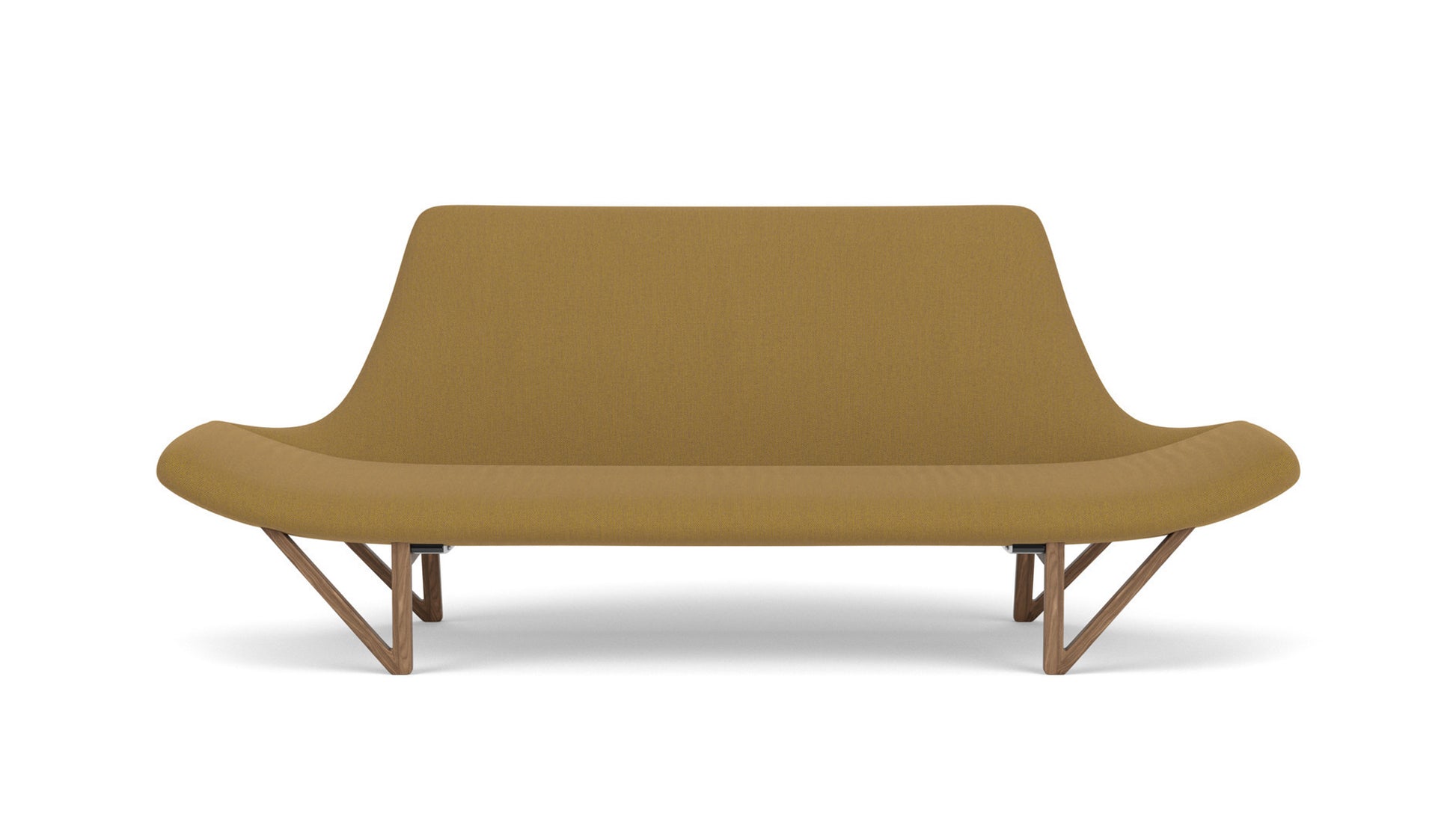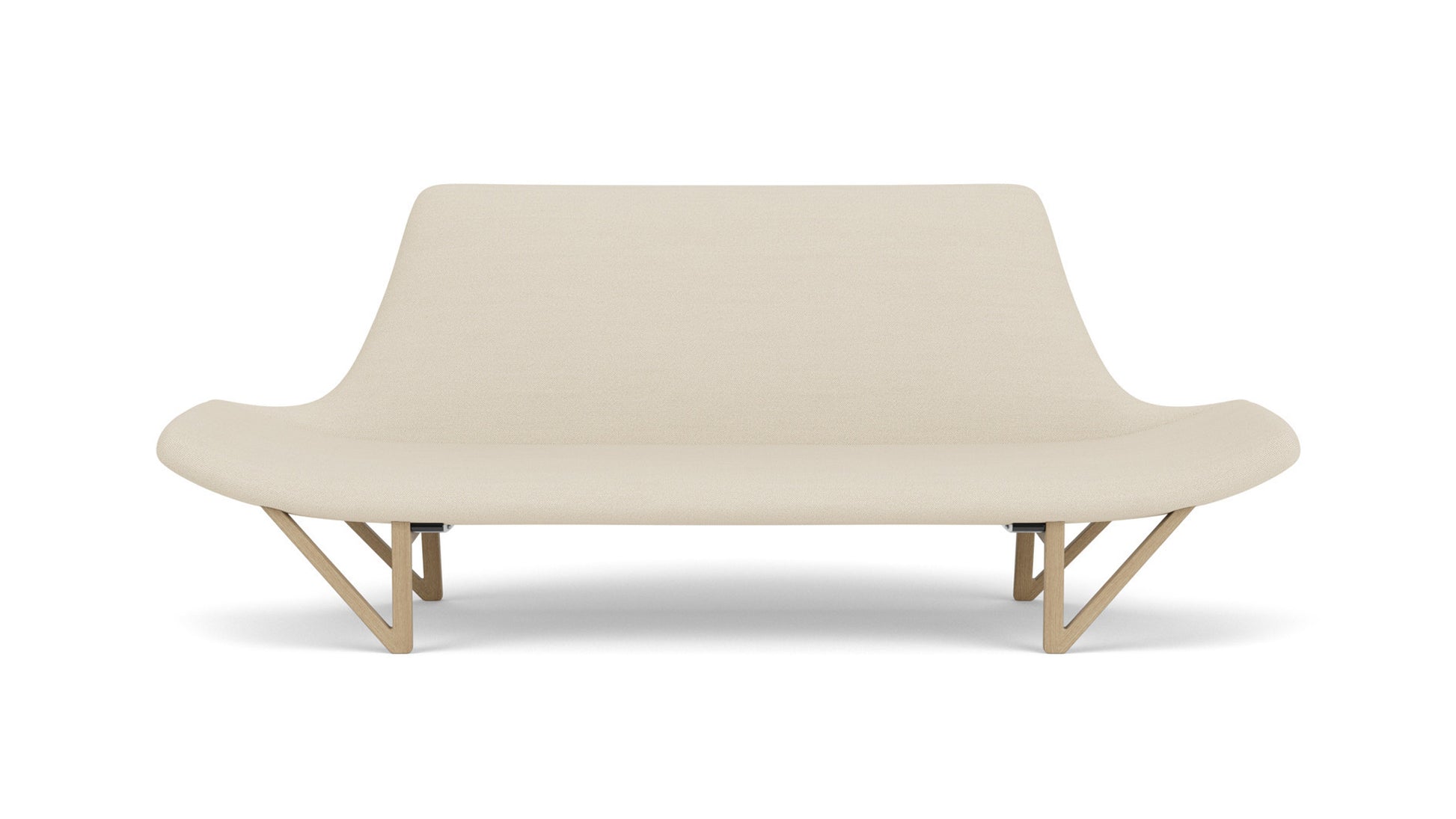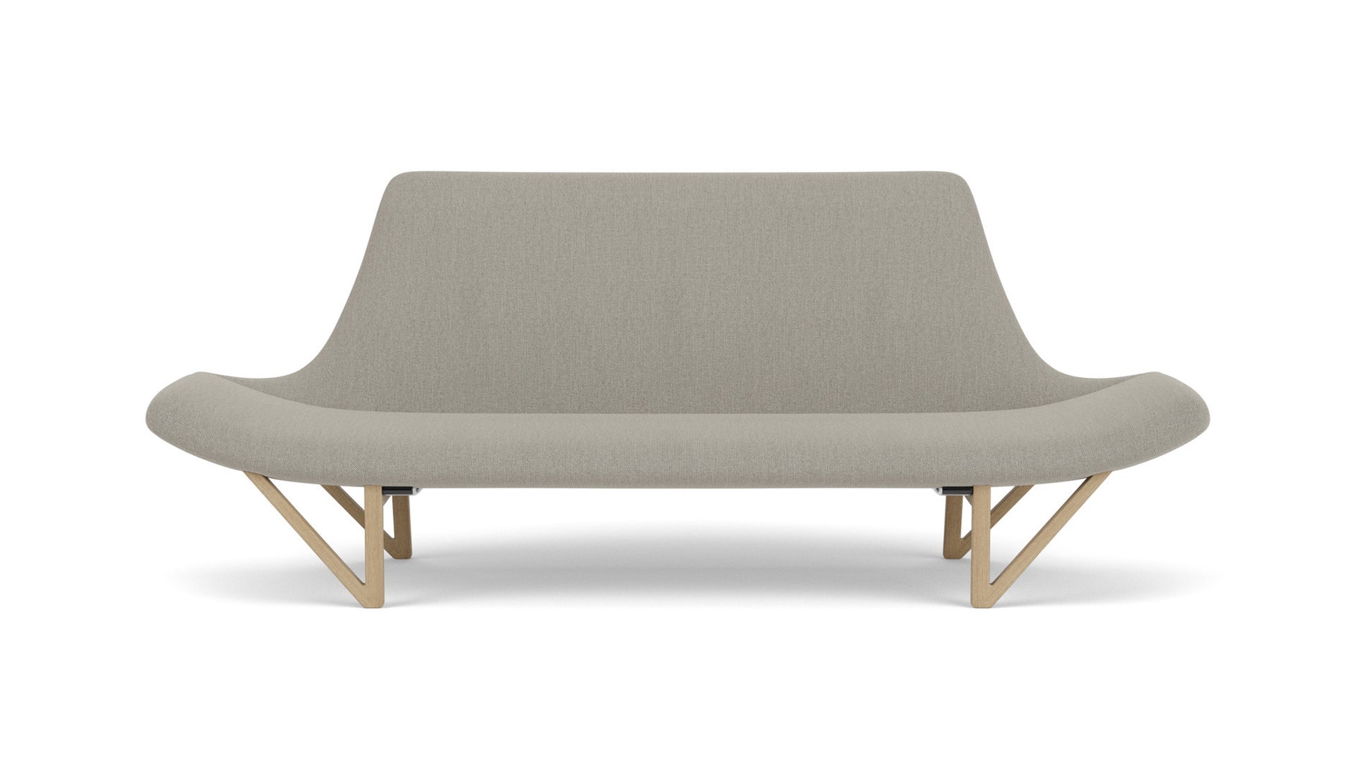 The inventive, curvilinear shape of the Pagode Sofa is as relevant today as it was when first designed in 1956. Looking to Asian architecture and temples for inspiration, the elegant design features beautifully crafted V-shaped wooden legs and a low seat with distinctive armrests, and a high back to cradle and support.