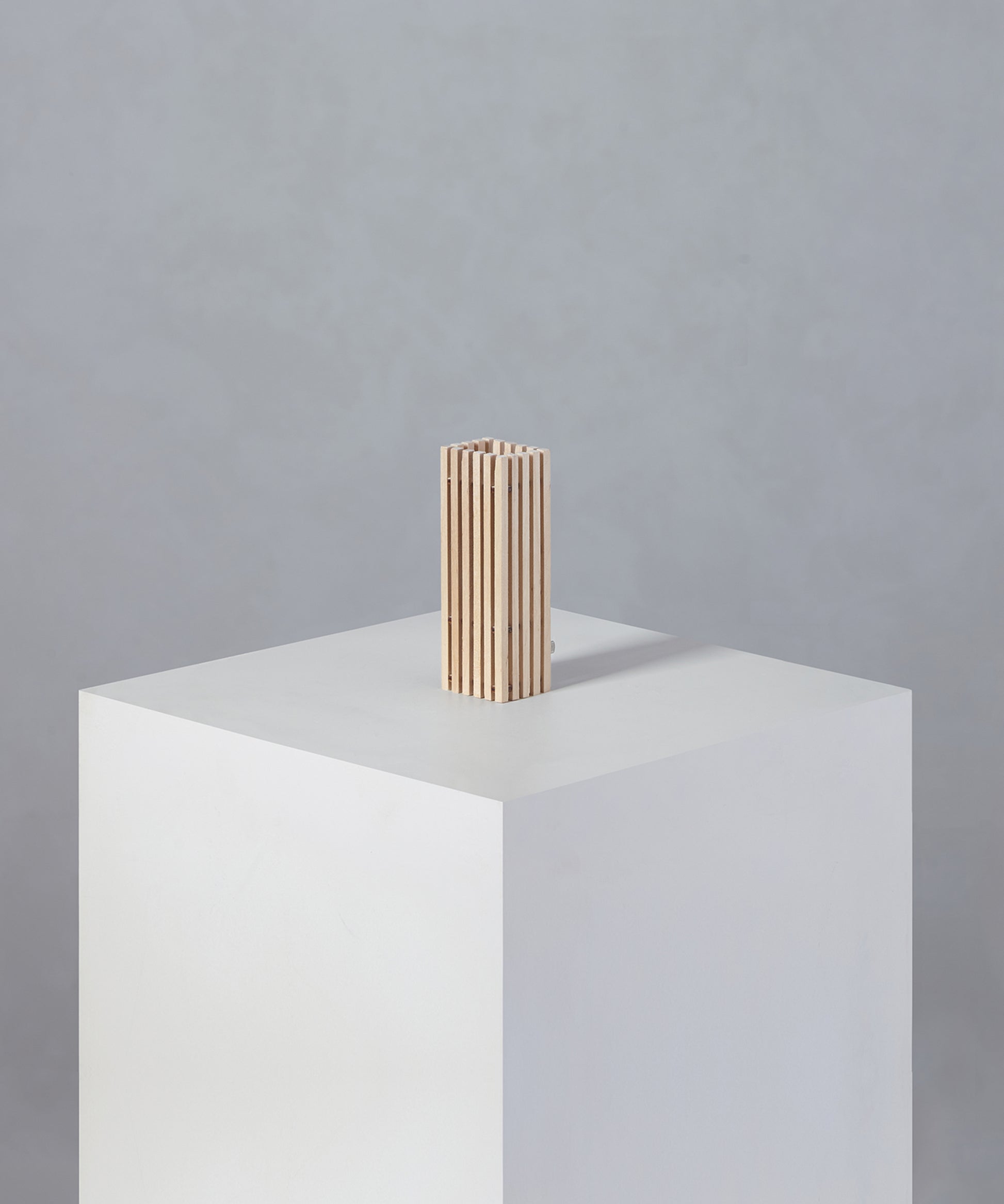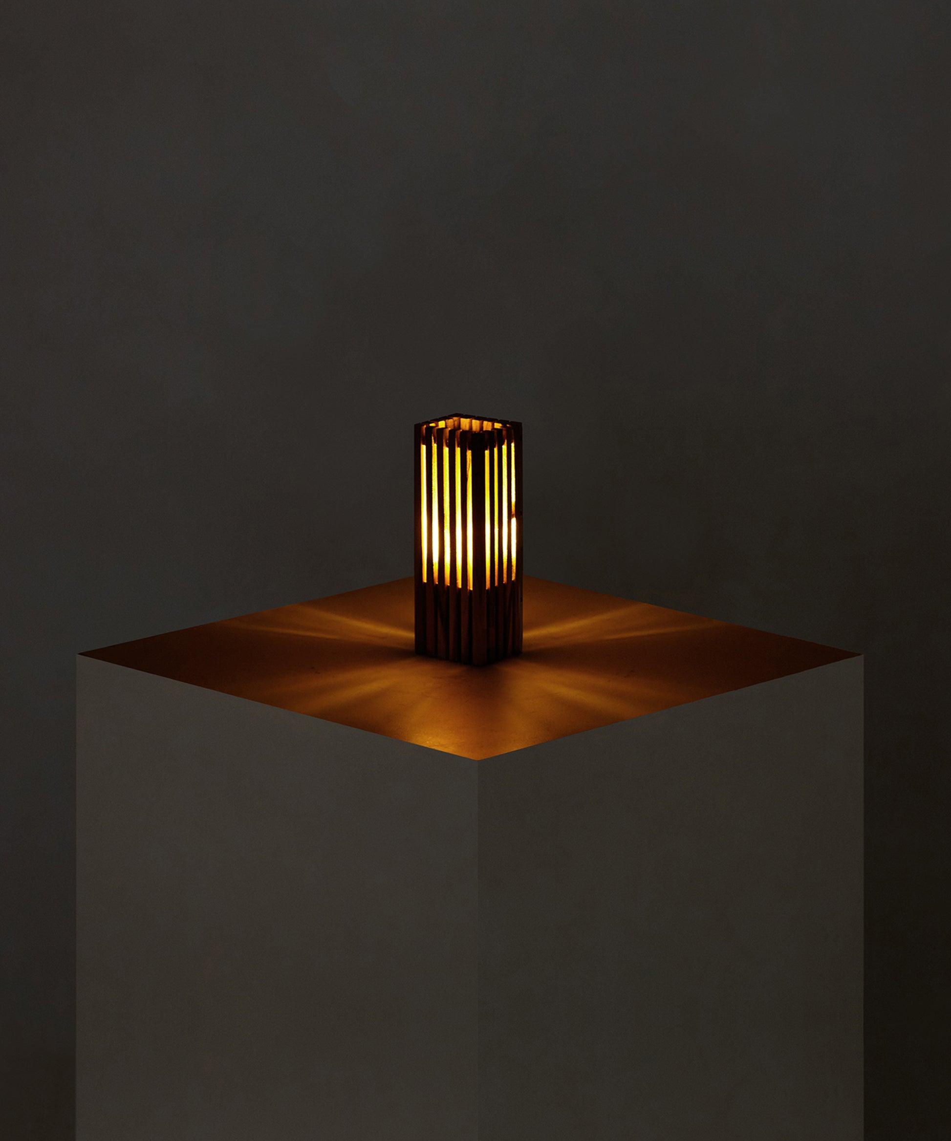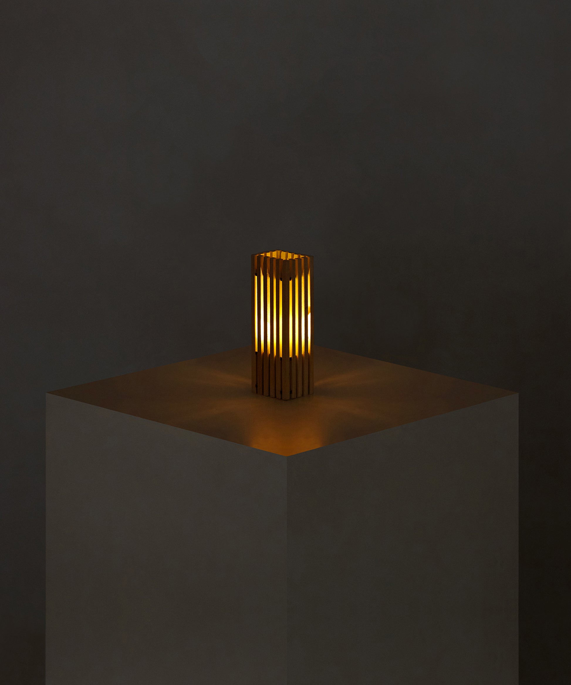 Foregoing the larger models’ removable top shade, the night light is subtle in its elegance. Hand-brushed wooden dowels conceal a light-sensitive LED bulb, which turns on automatically in low light.