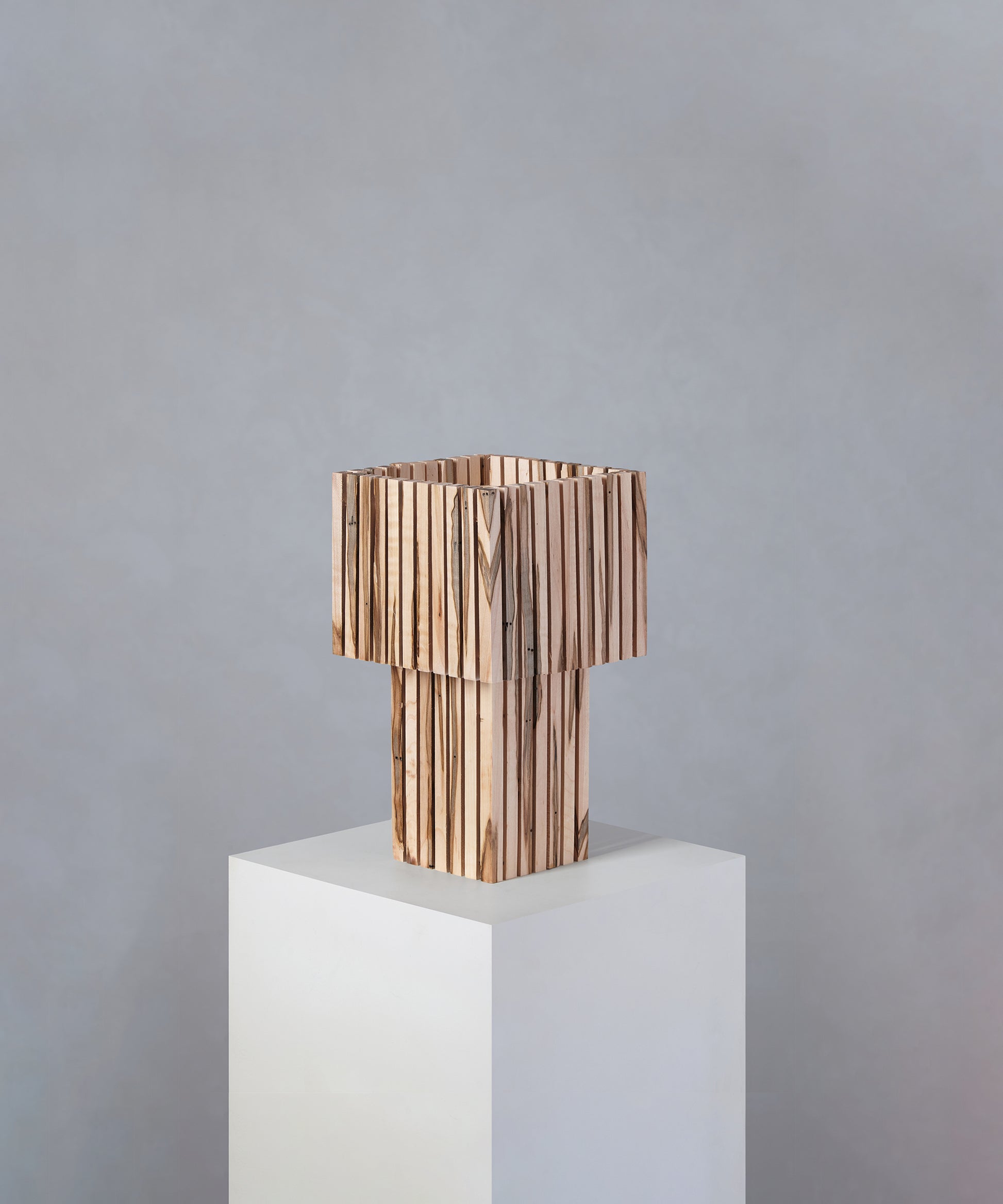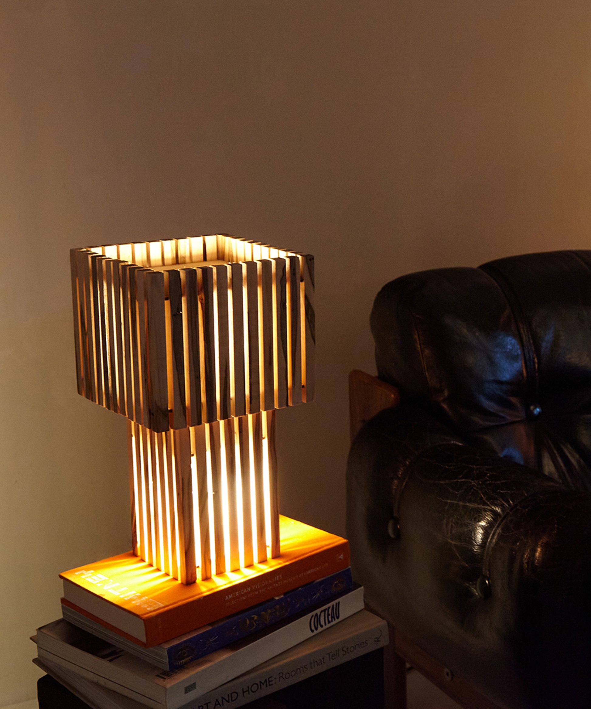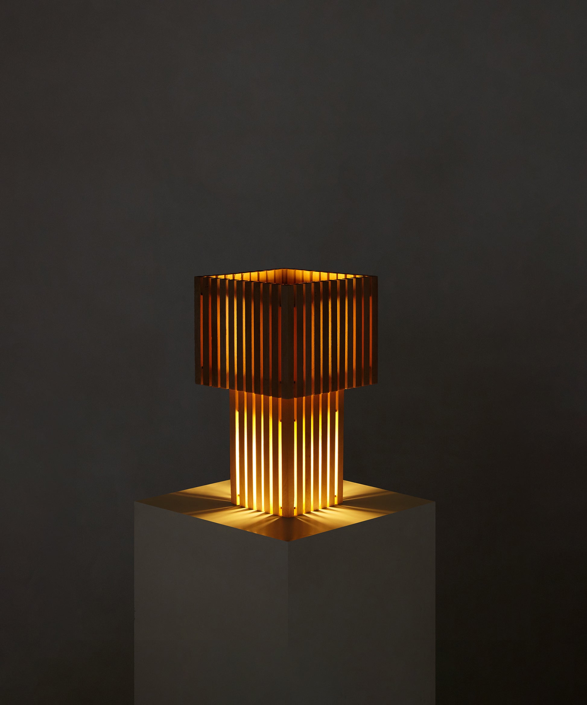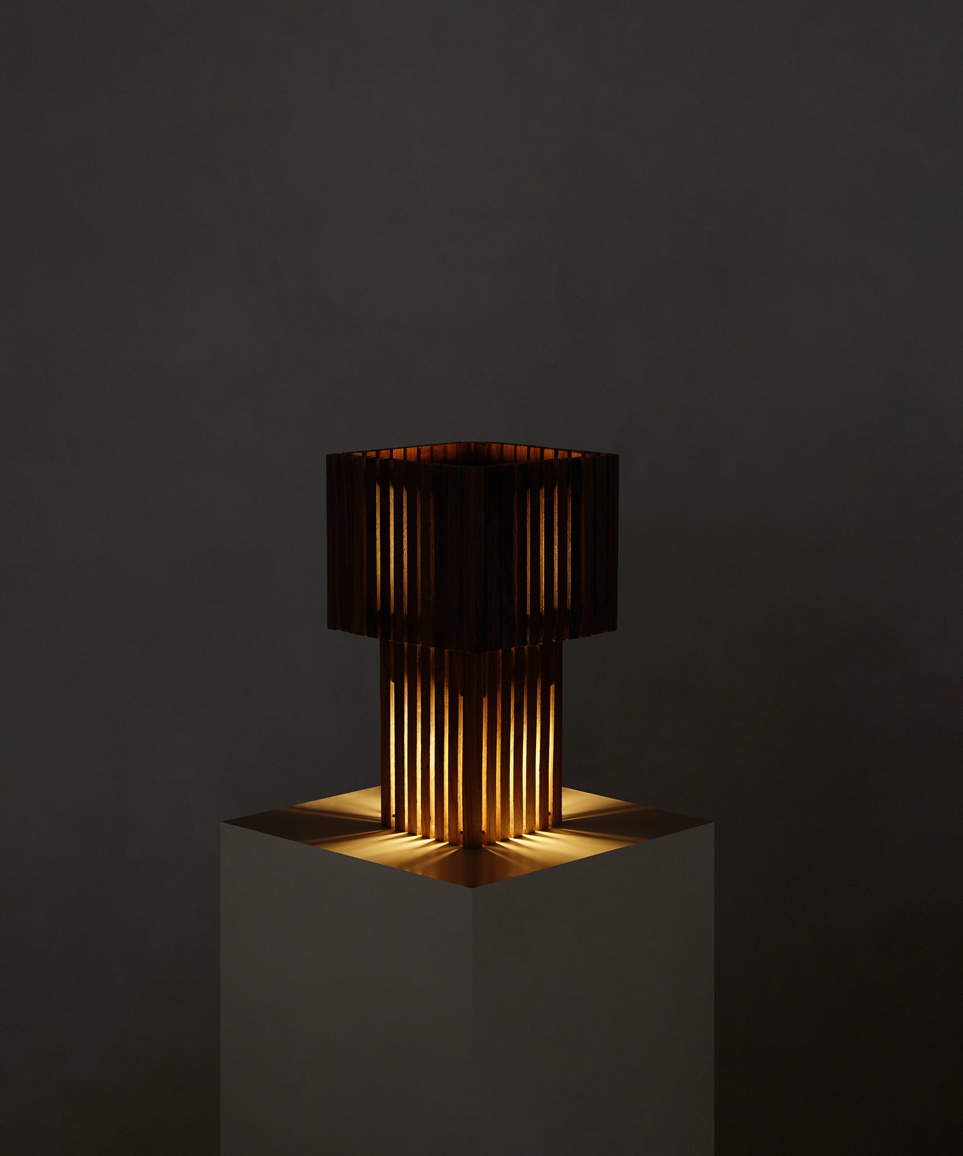 Hand-brushed wooden dowels both block and direct the lamp’s concealed LED bulb, casting an uneven glow through the vertical strips of the lamp’s body. The removable top-shade functions as a manual dimmer, allowing the lamp to transform in shape and in intensity.