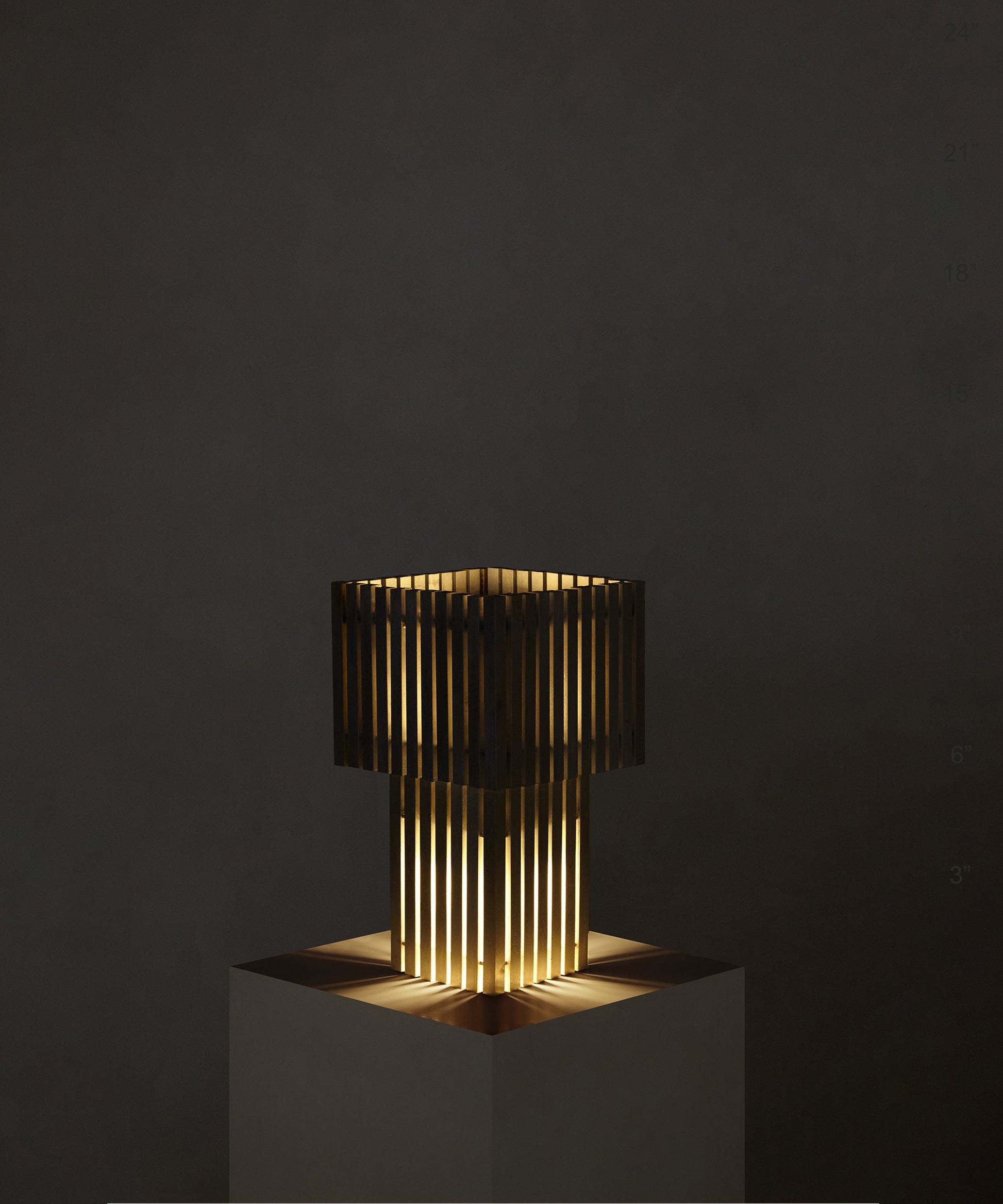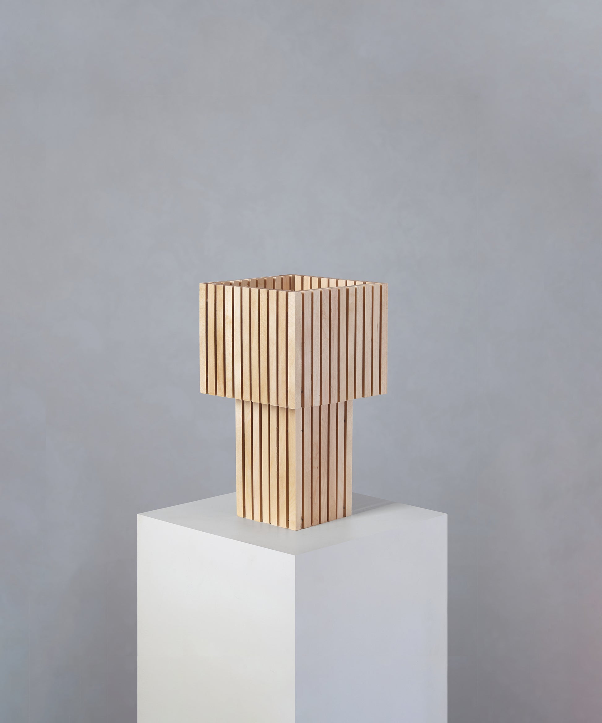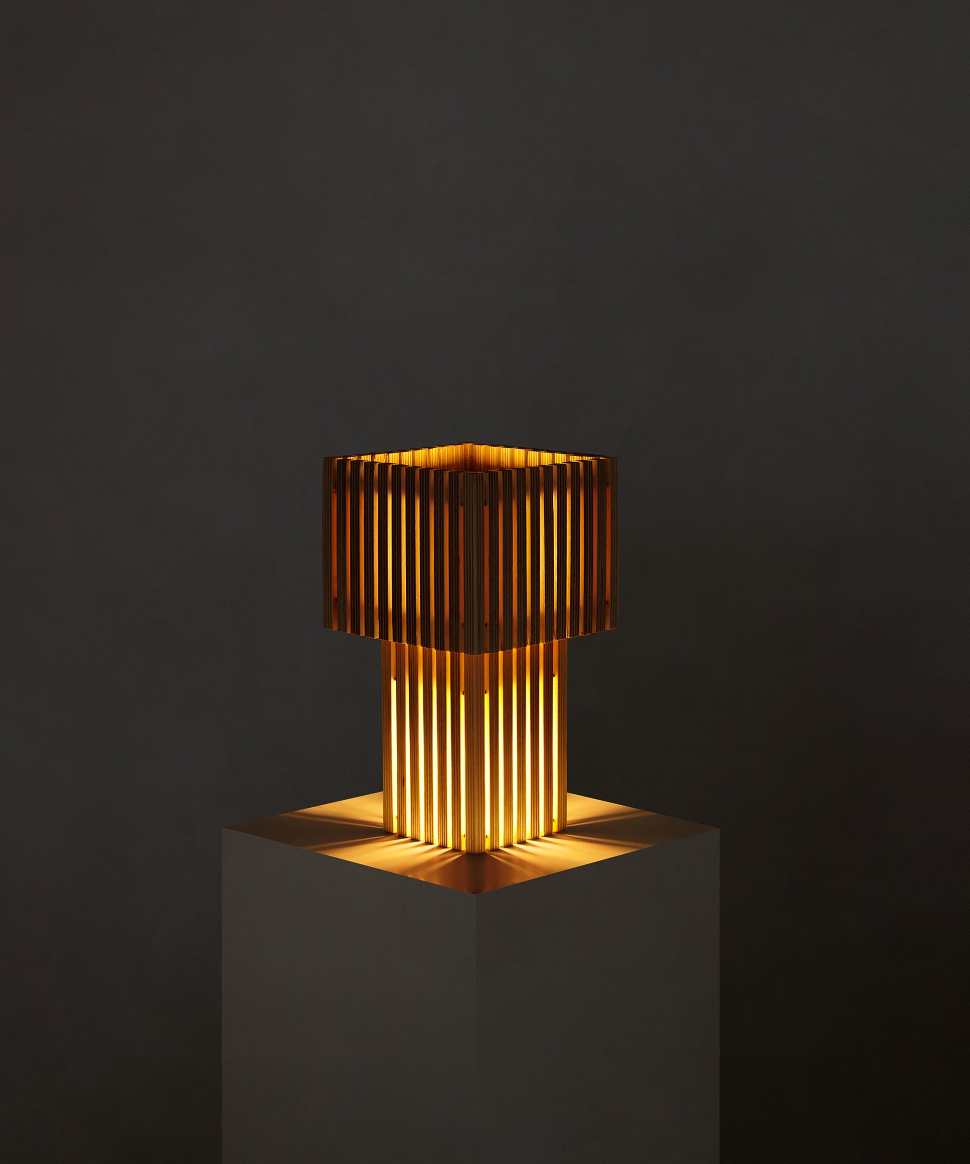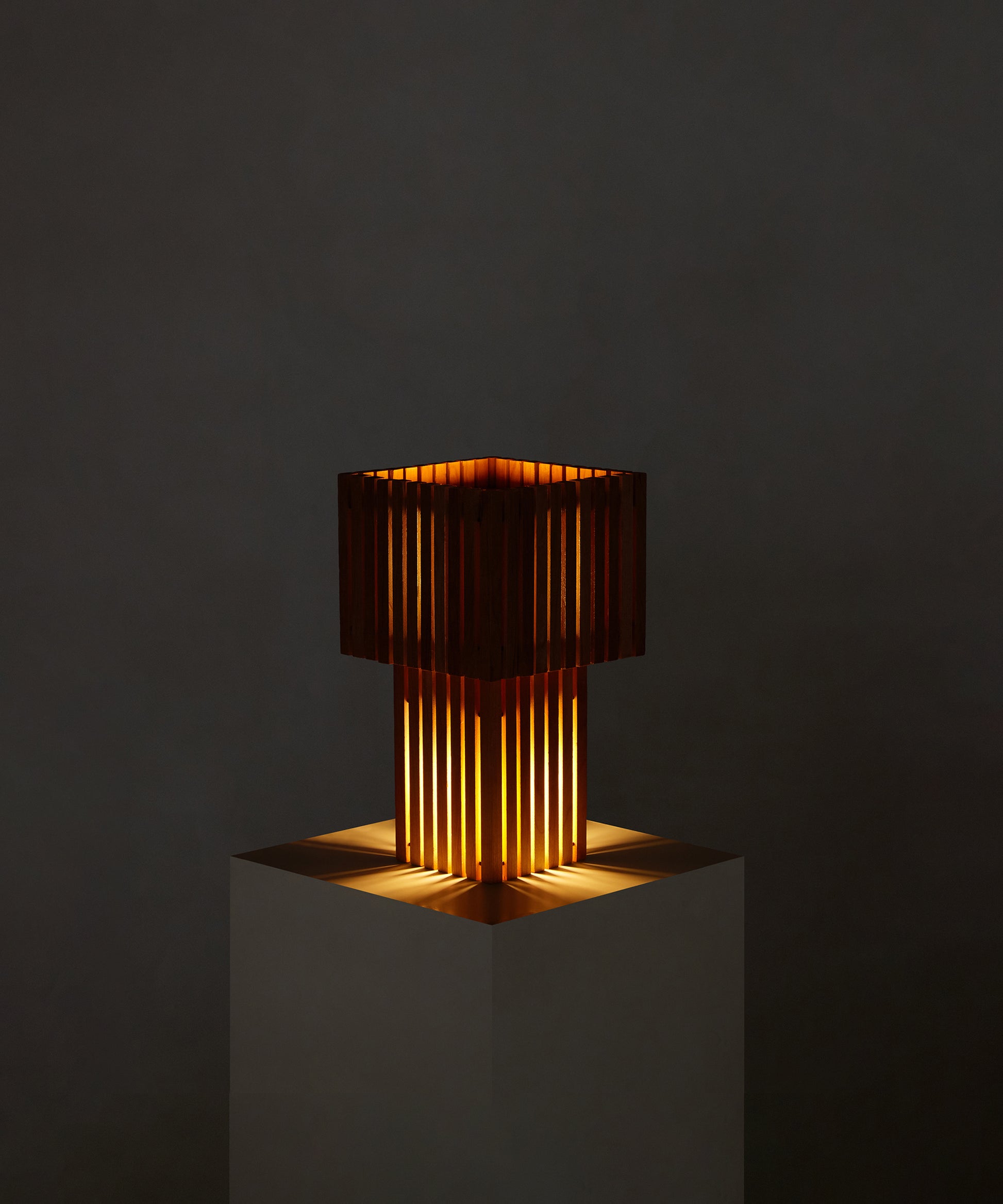 Hand-brushed wooden dowels both block and direct the lamp’s concealed LED bulb, casting an uneven glow through the vertical strips of the lamp’s body. The removable top-shade functions as a manual dimmer, allowing the lamp to transform in shape and in intensity.