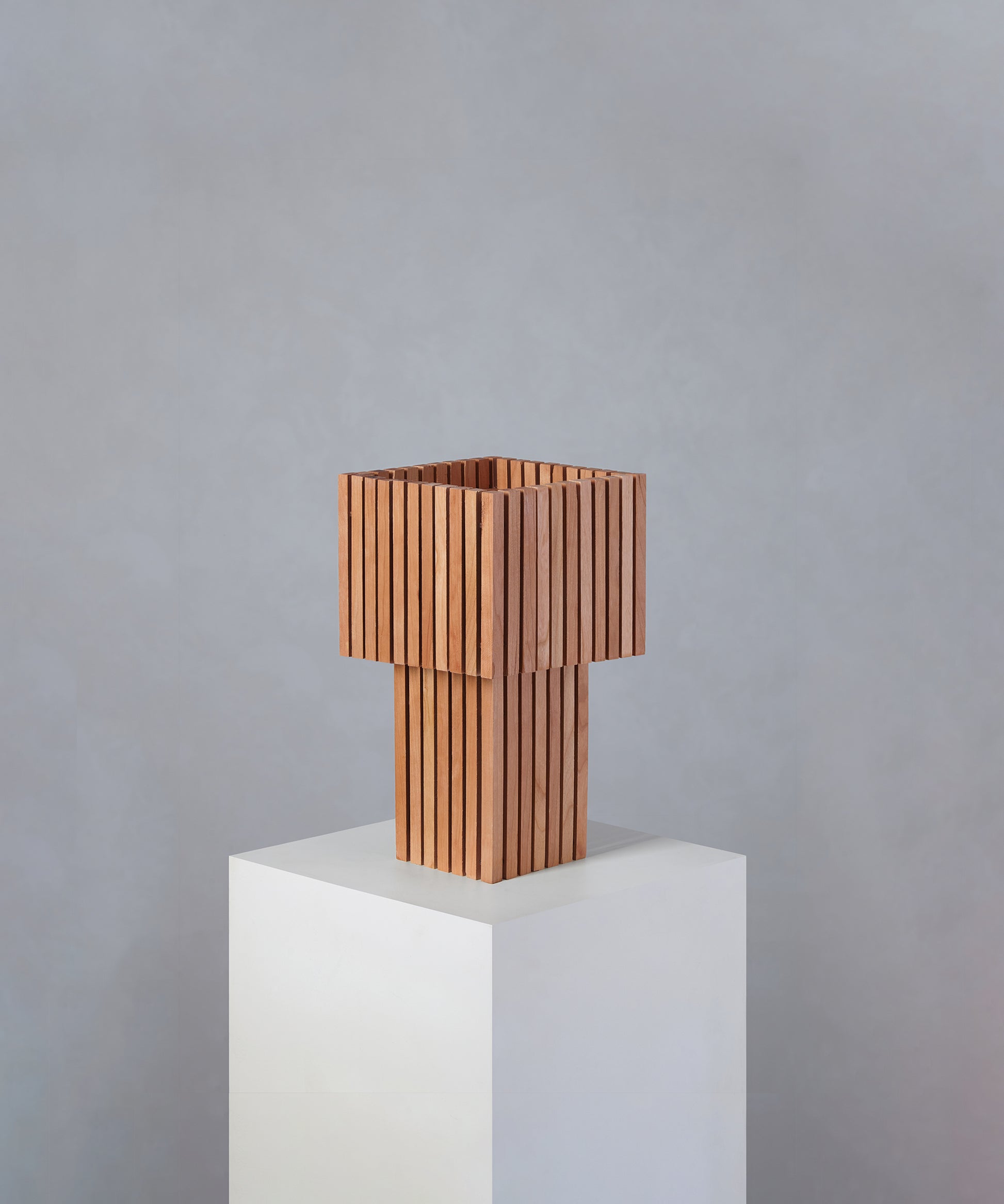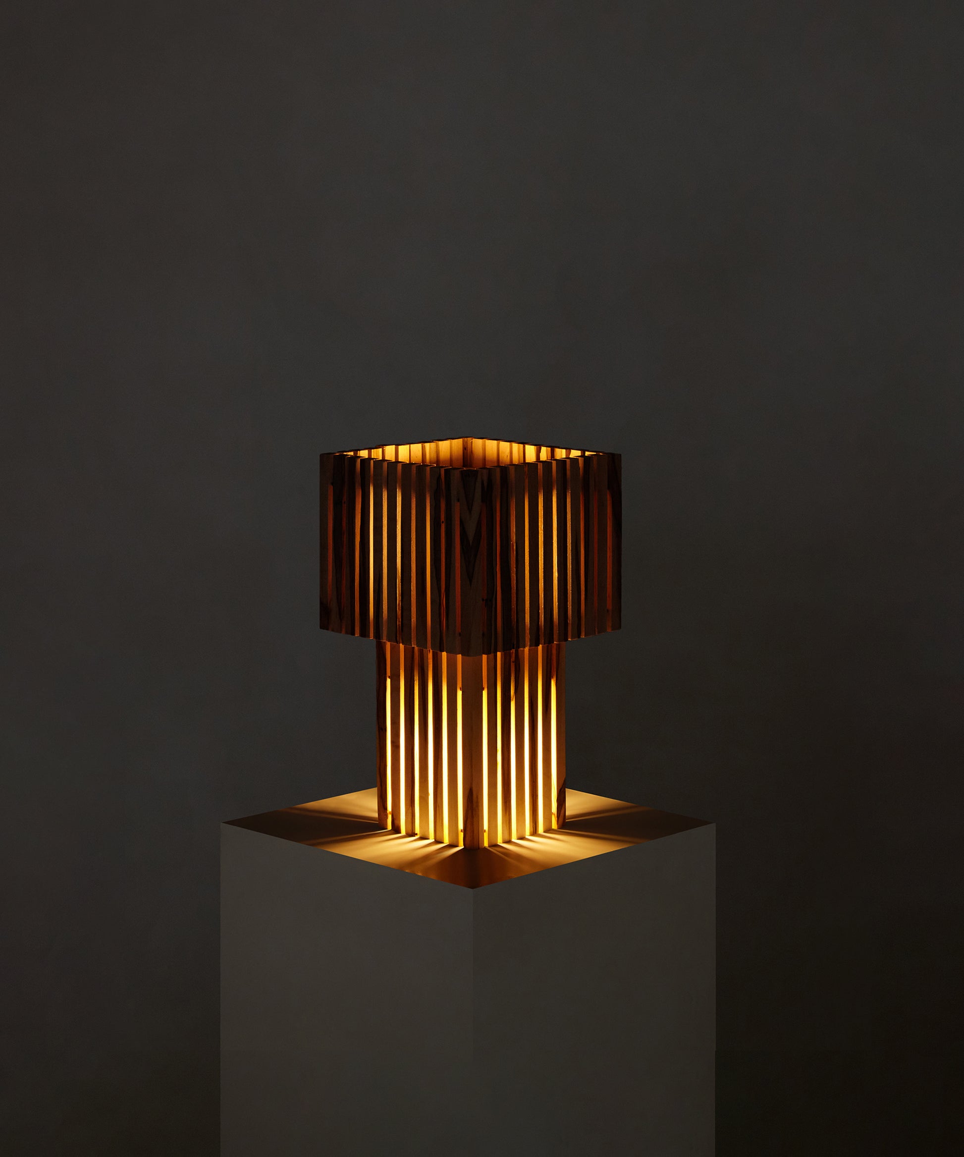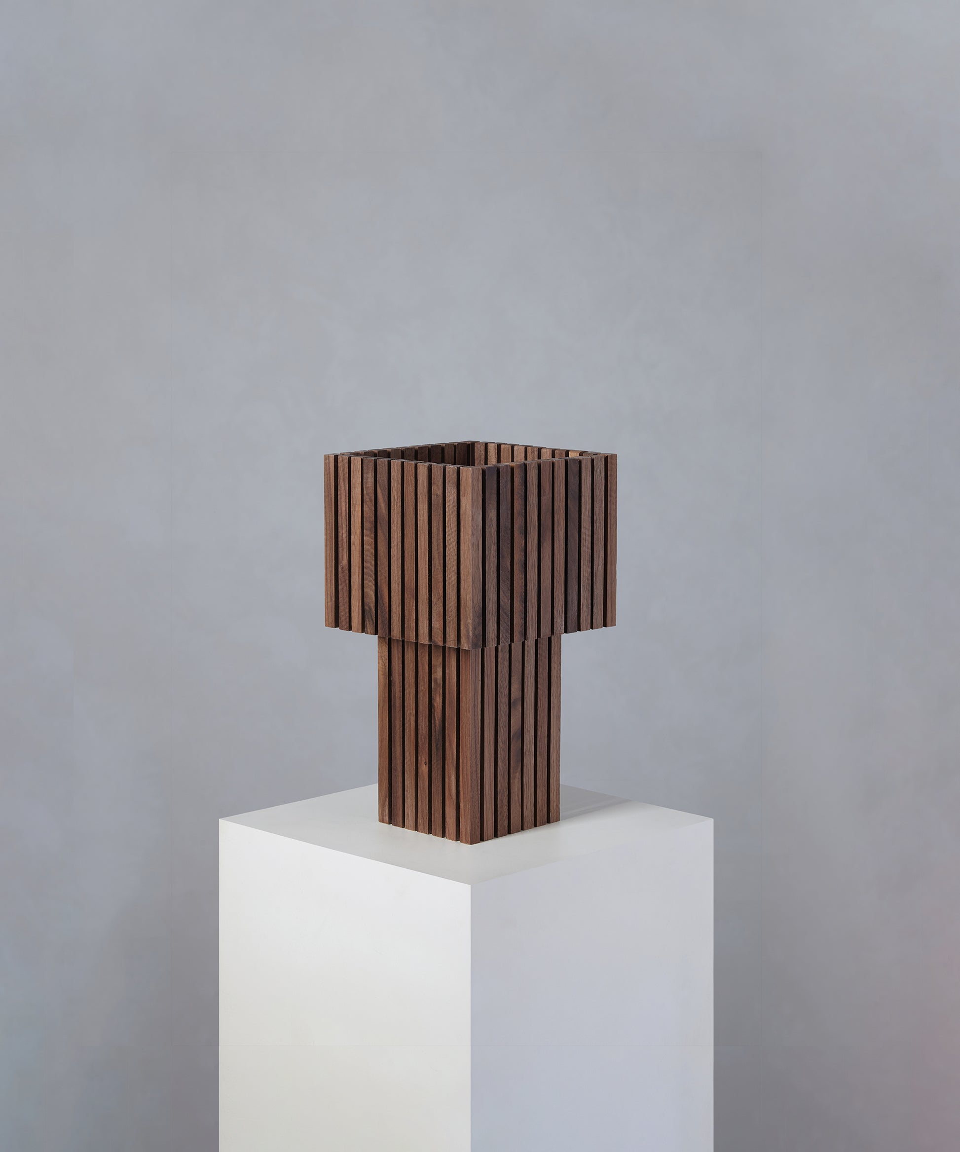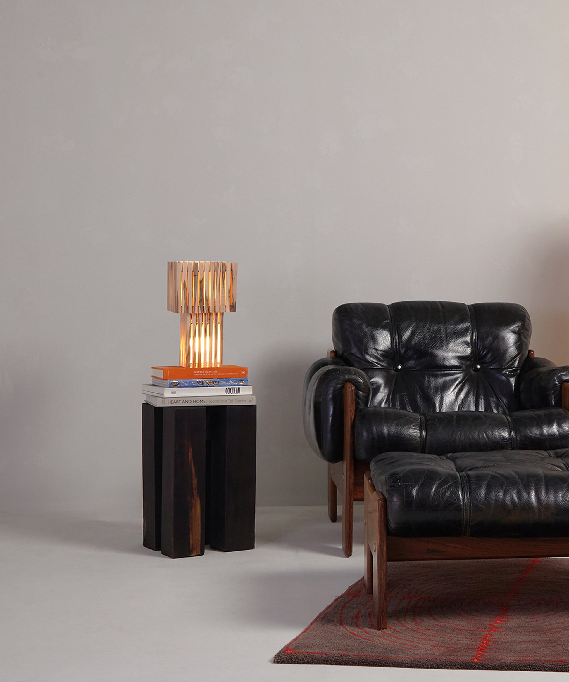 Hand-brushed wooden dowels both block and direct the lamp’s concealed LED bulb, casting an uneven glow through the vertical strips of the lamp’s body. The removable top-shade functions as a manual dimmer, allowing the lamp to transform in shape and in intensity.