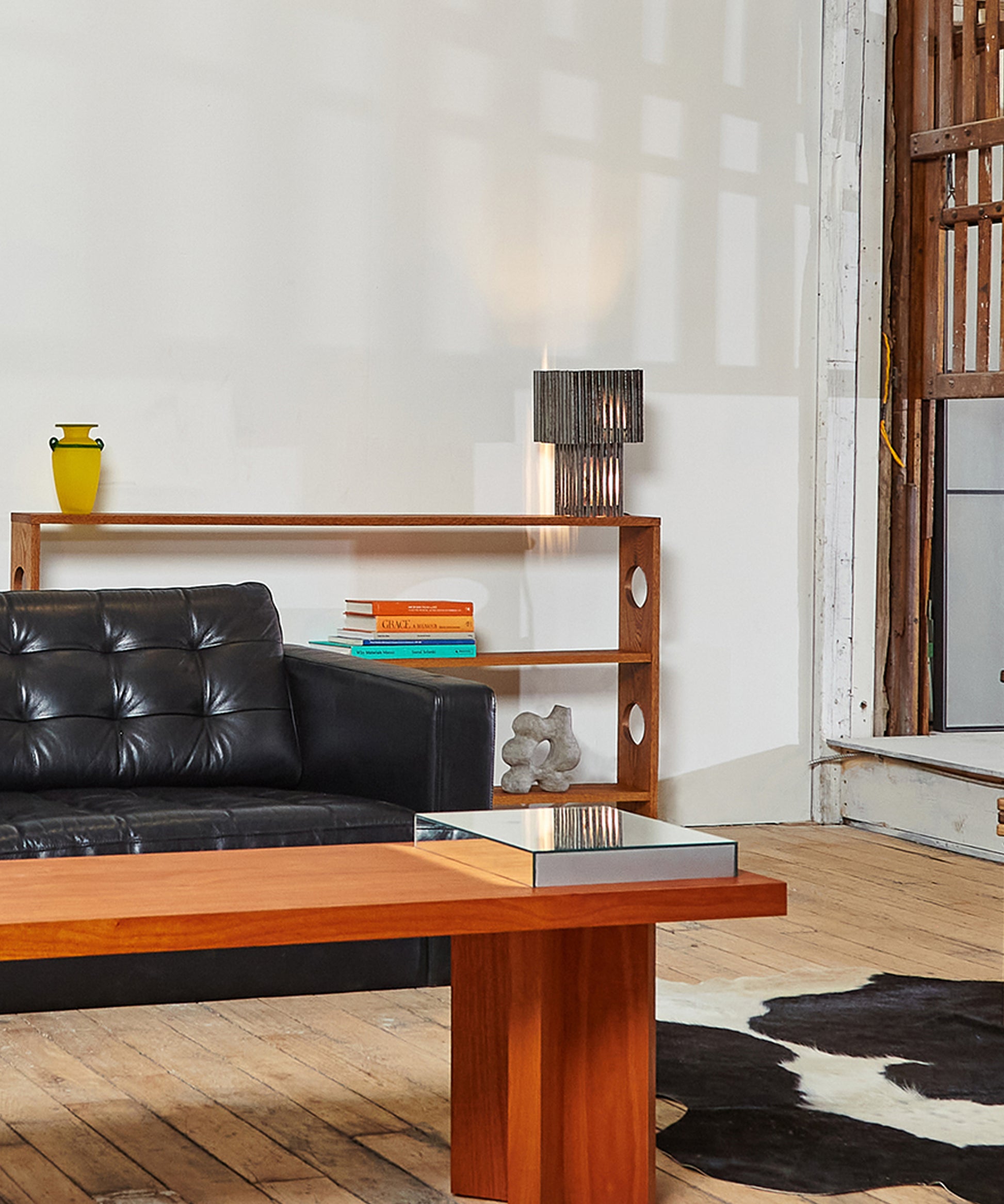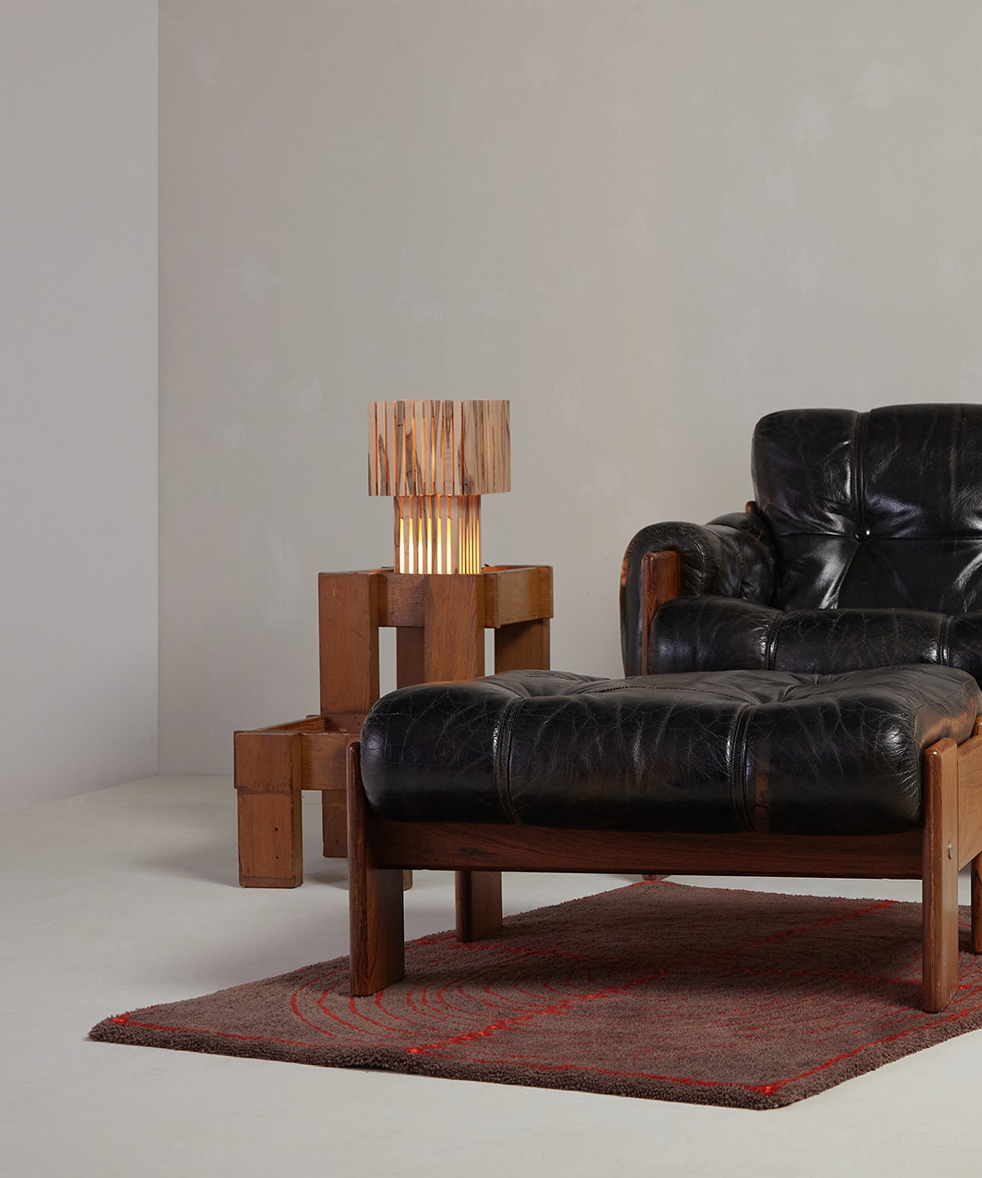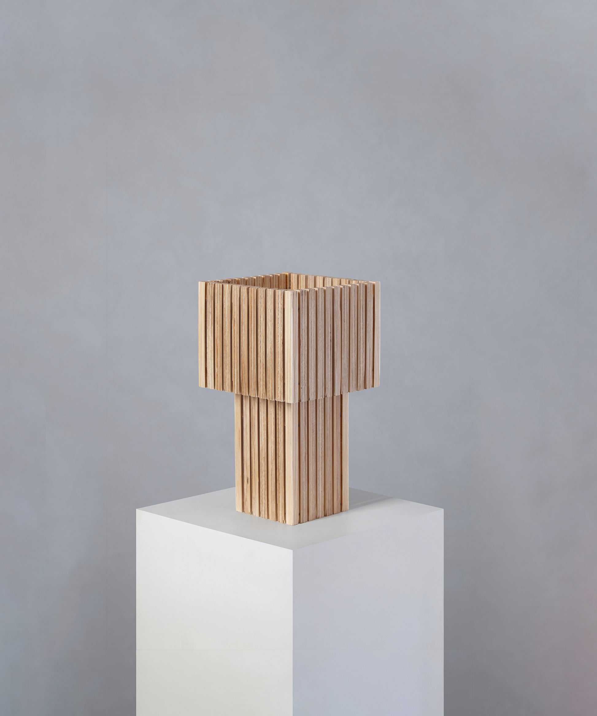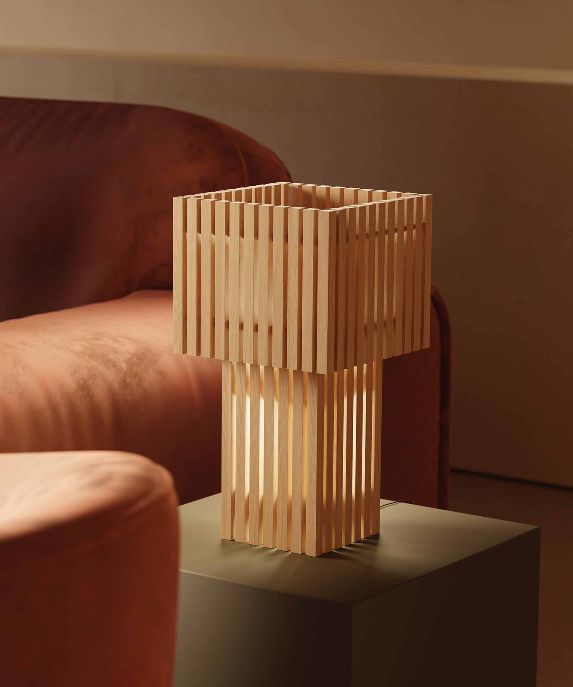 Hand-brushed wooden dowels both block and direct the lamp’s concealed LED bulb, casting an uneven glow through the vertical strips of the lamp’s body. The removable top-shade functions as a manual dimmer, allowing the lamp to transform in shape and in intensity.