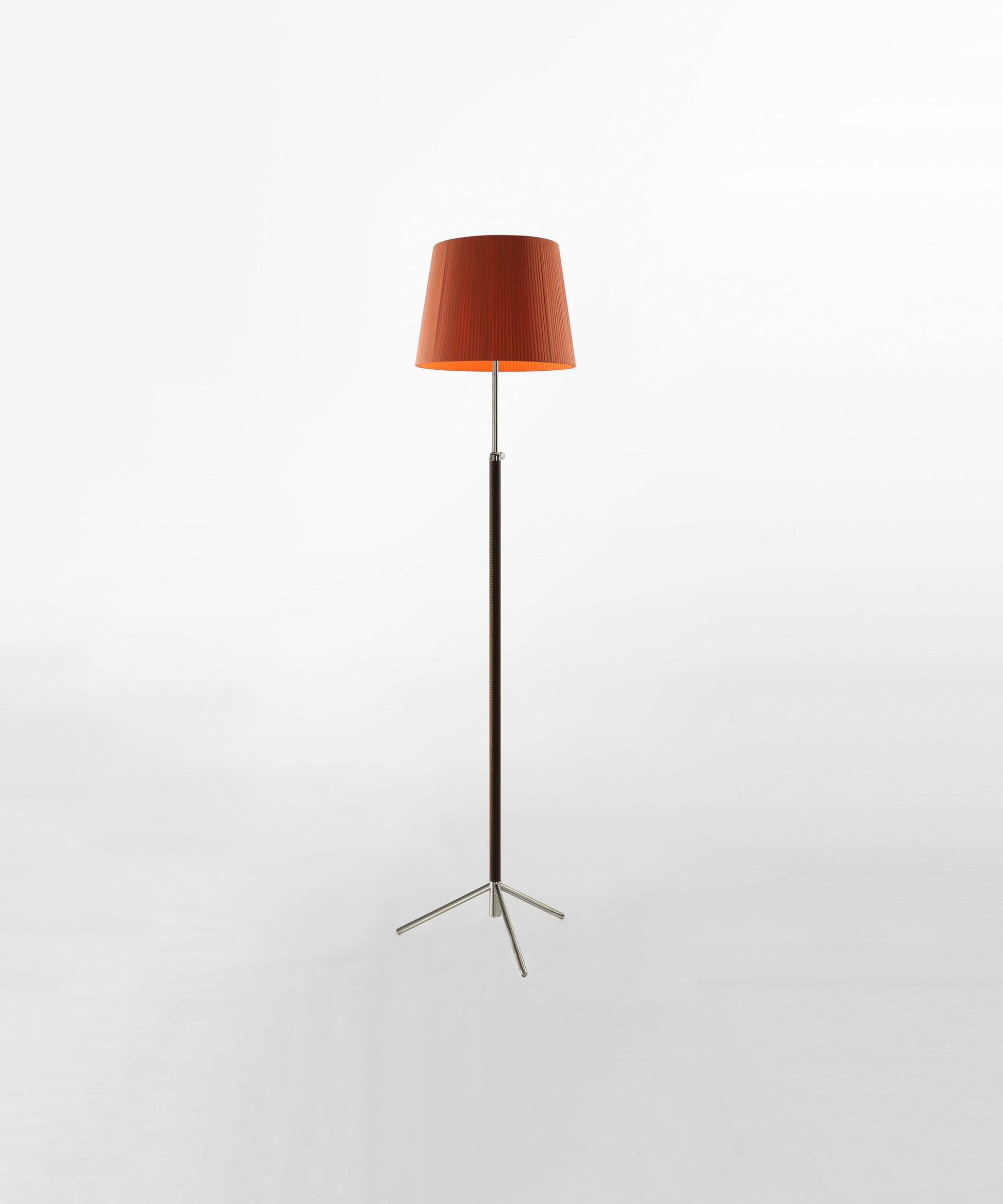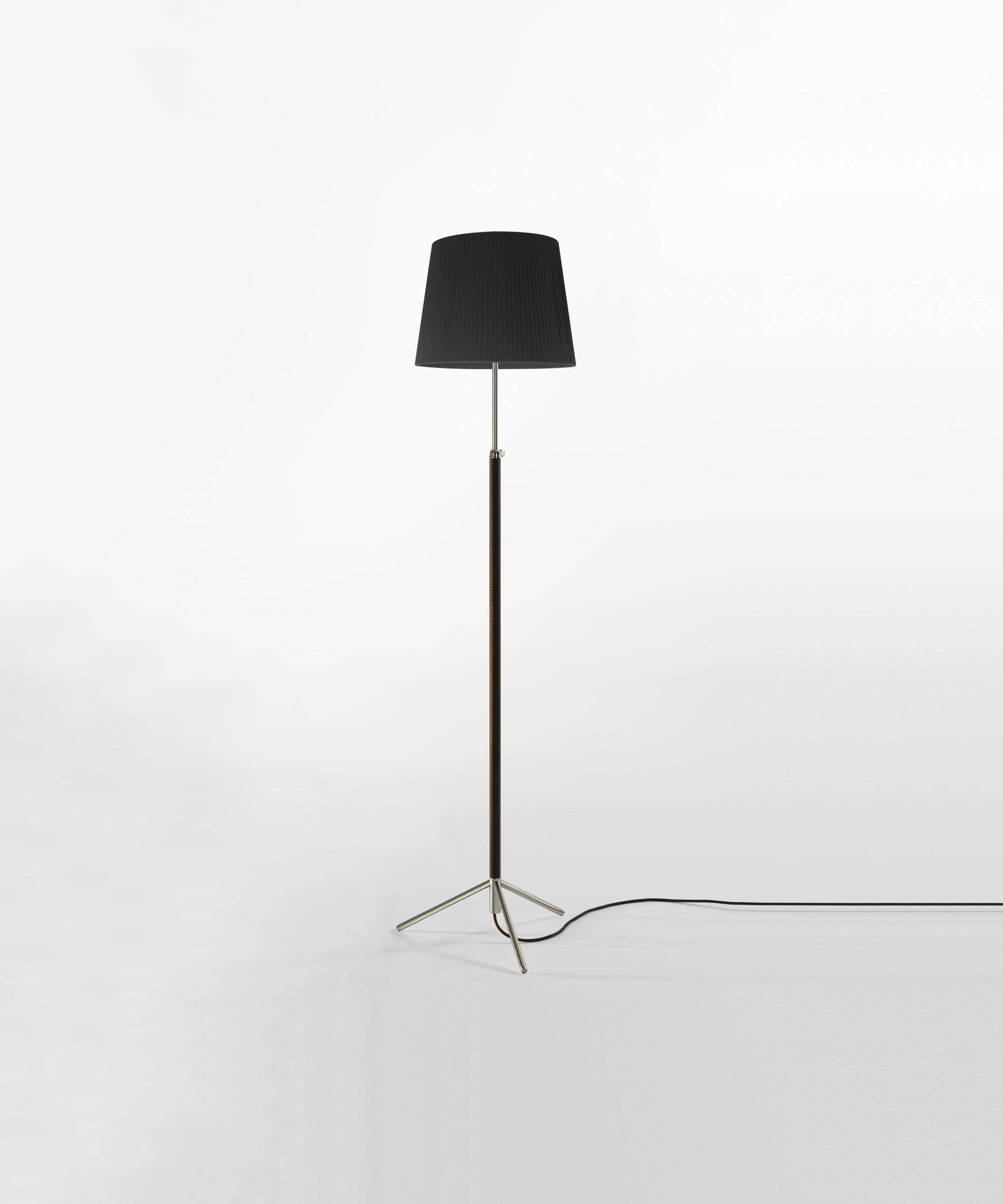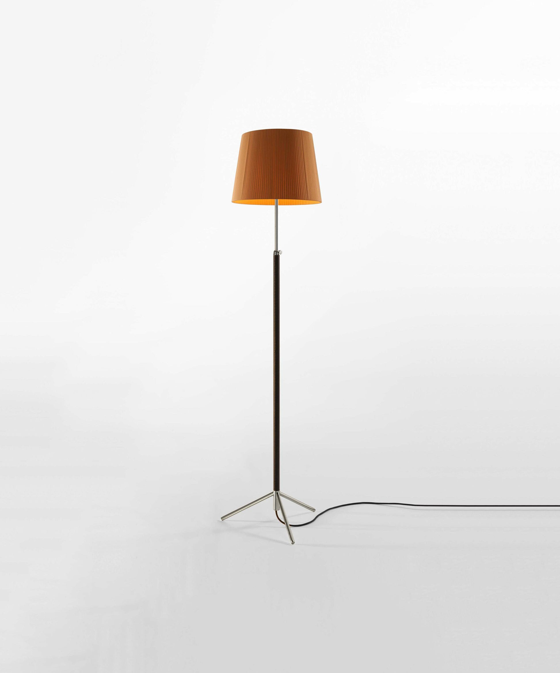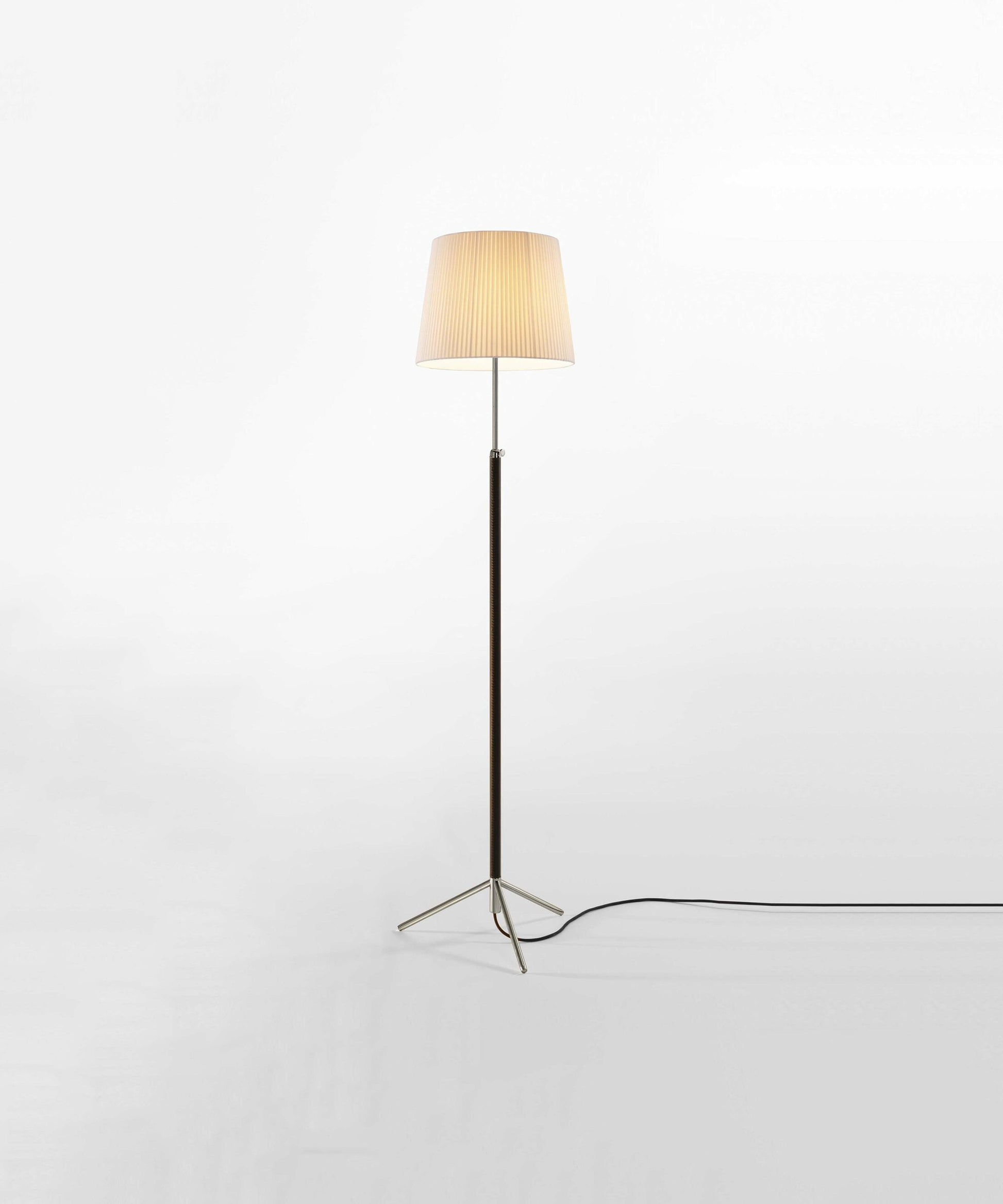 Sans focused on the design of furniture for his own household, which is how the remarkable Pie de Salón or Peana Molina lamps were created, and later edited by Santa & Cole. A sleek reinterpretation of traditional symmetrical lamps, with a chrome shaft. The stem of the lamp is adjustable and is leather-covered for a luxurious feel, opening up into a tripod base that allows the cable to easily go through. A perfect example of industrial craftsmanship. It features three distinct shades in three different materials and eight color options that exude timeless elegance