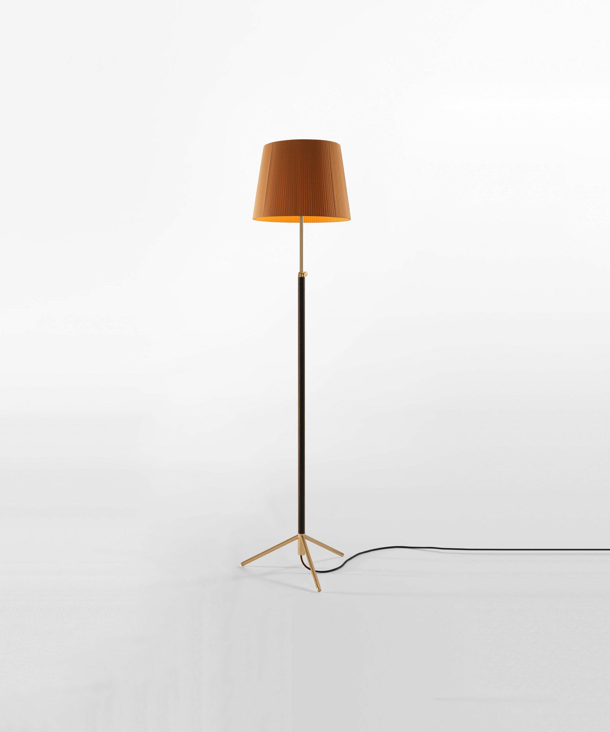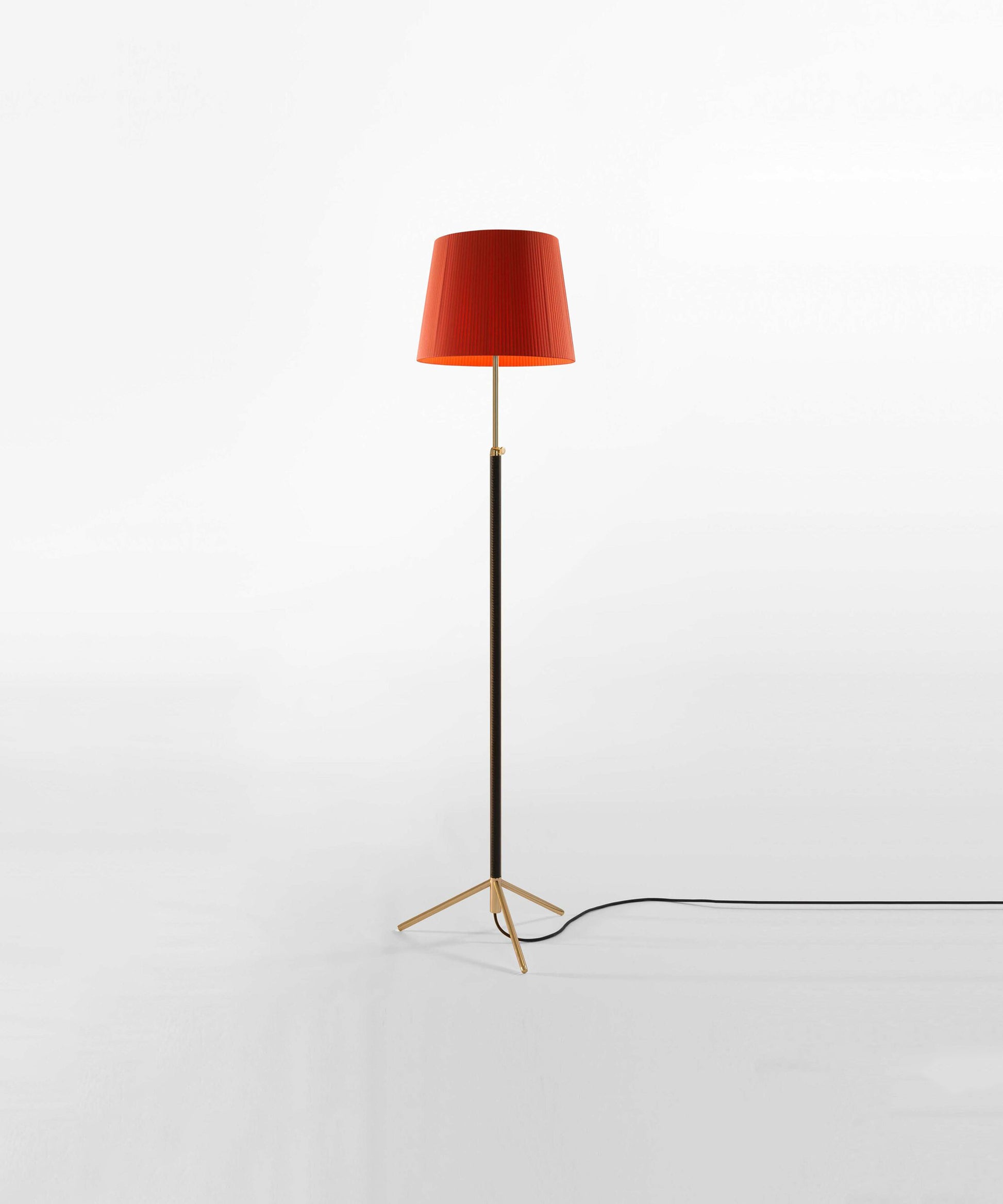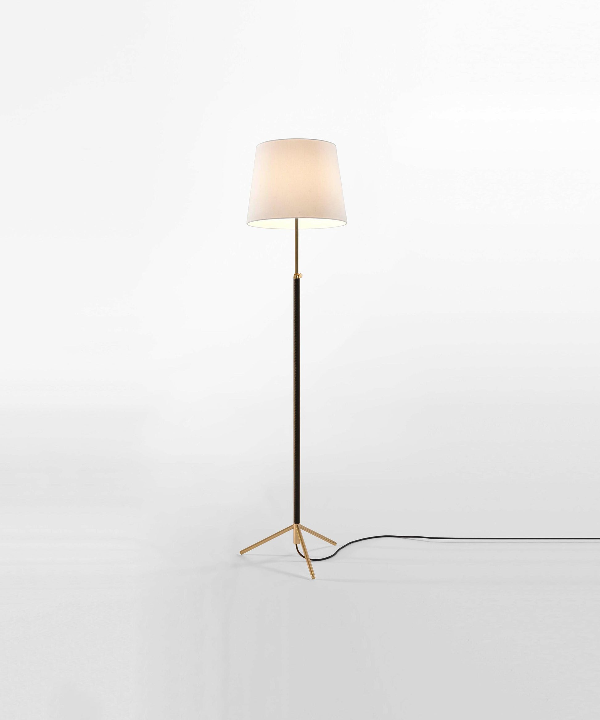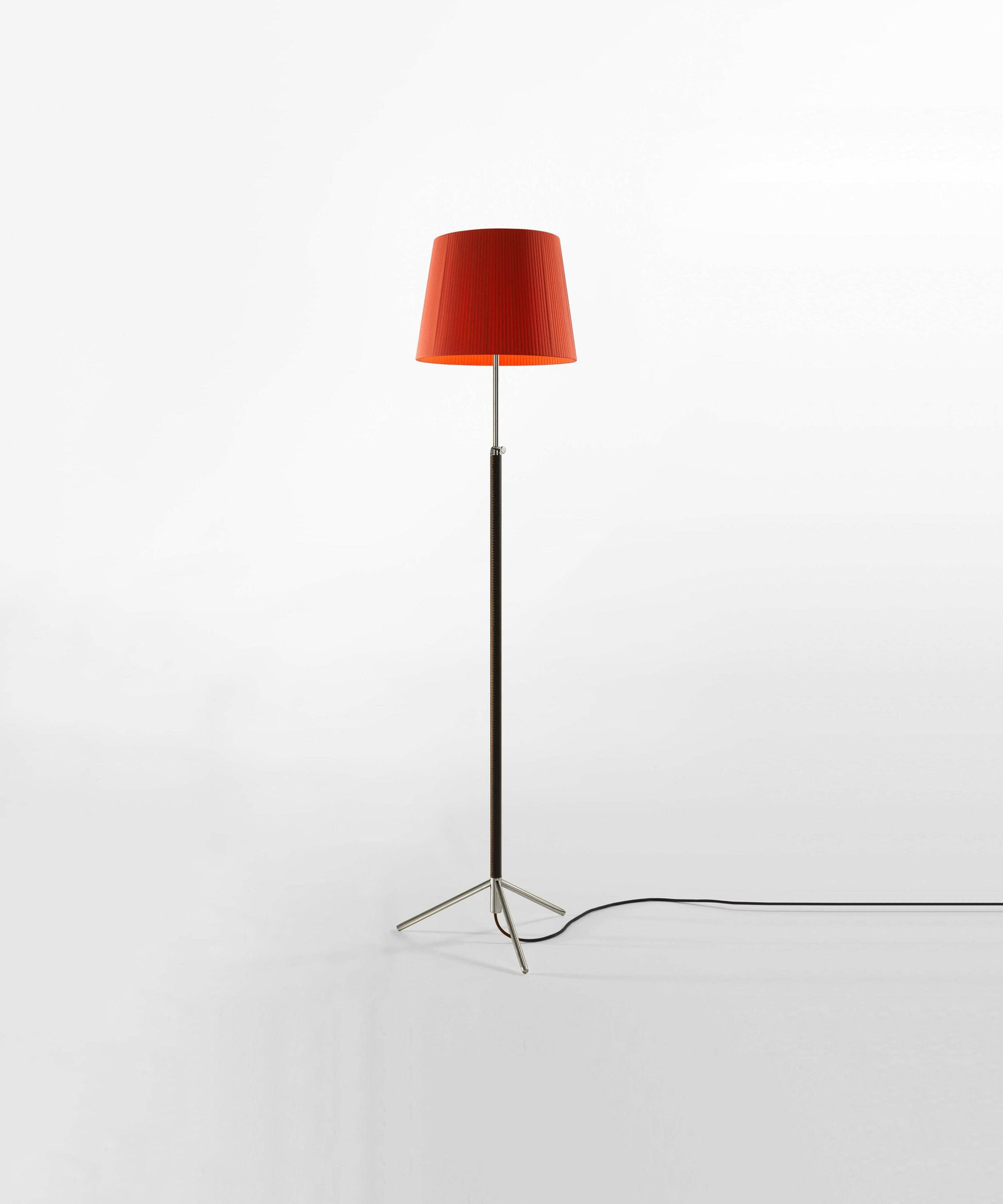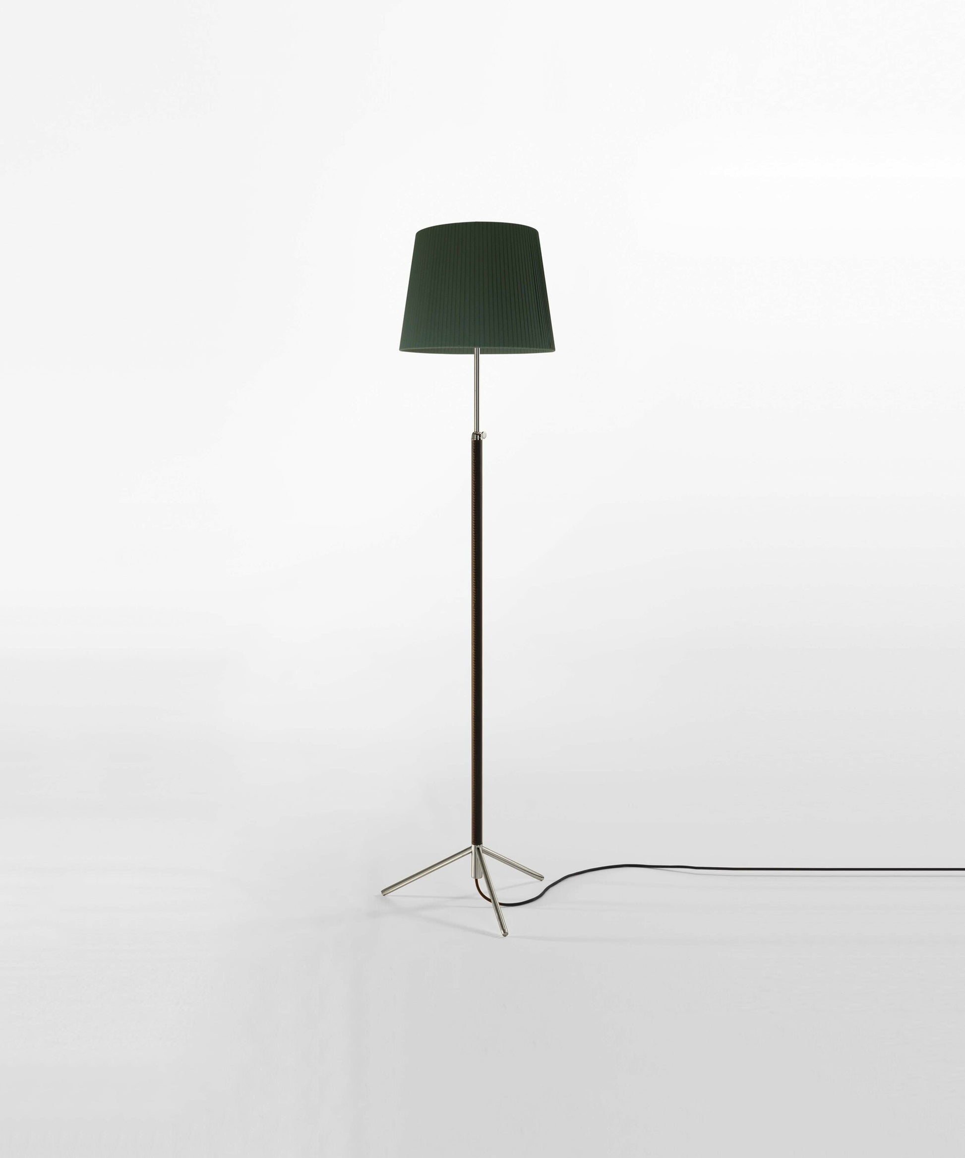 Sans focused on the design of furniture for his own household, which is how the remarkable Pie de Salón or Peana Molina lamps were created, and later edited by Santa & Cole. A sleek reinterpretation of traditional symmetrical lamps, with a chrome shaft. The stem of the lamp is adjustable and is leather-covered for a luxurious feel, opening up into a tripod base that allows the cable to easily go through. A perfect example of industrial craftsmanship. It features three distinct shades in three different materials and eight color options that exude timeless elegance