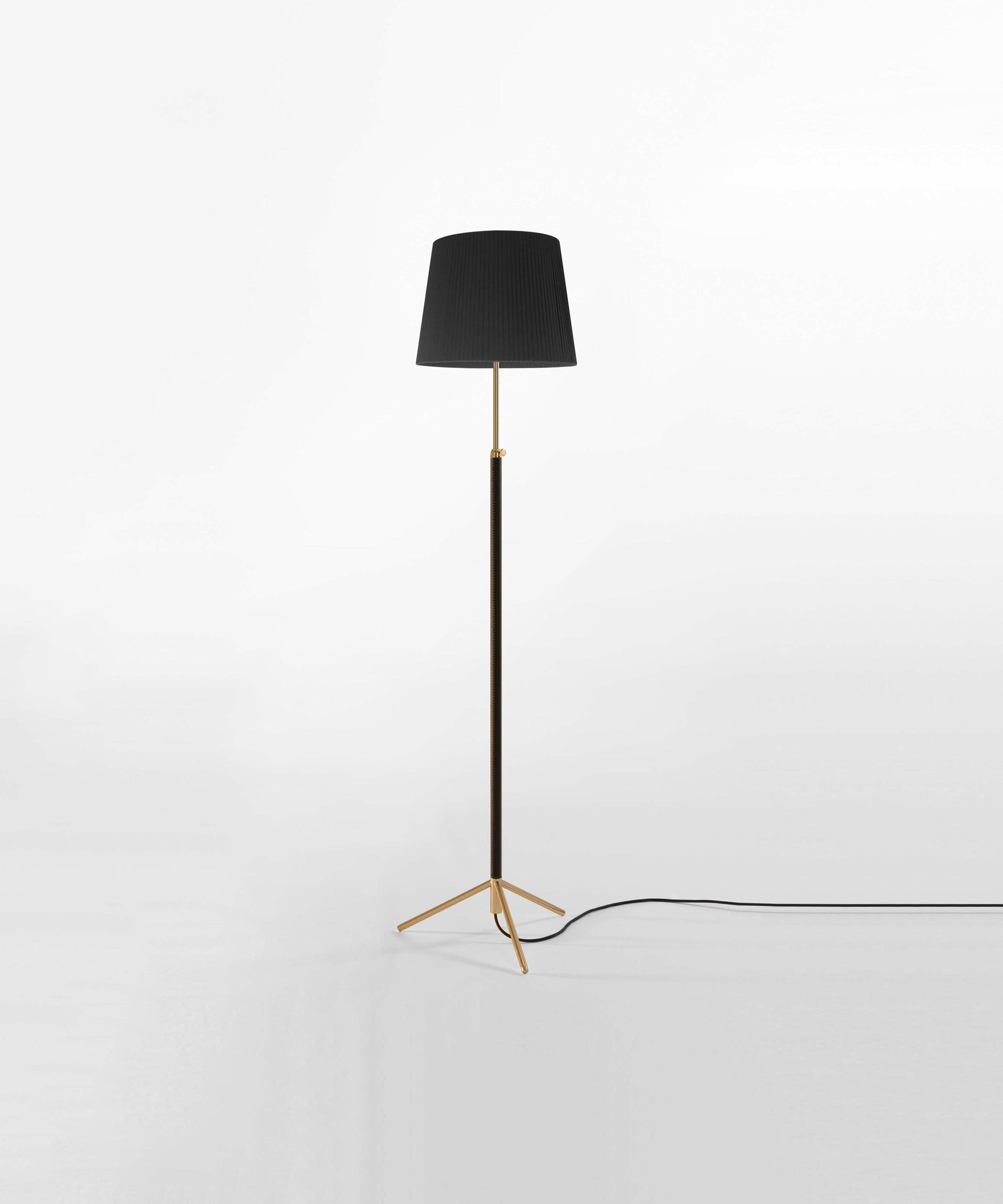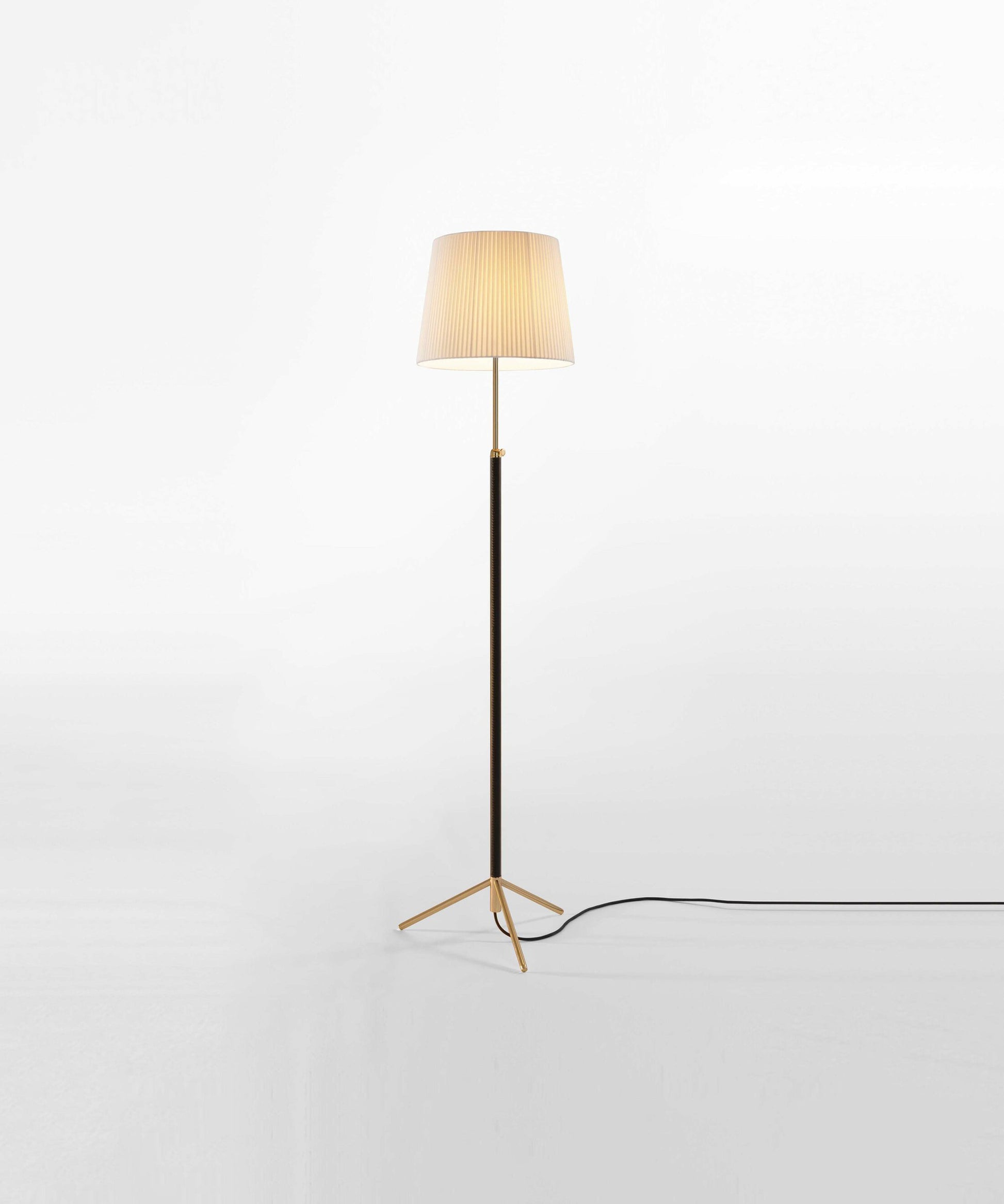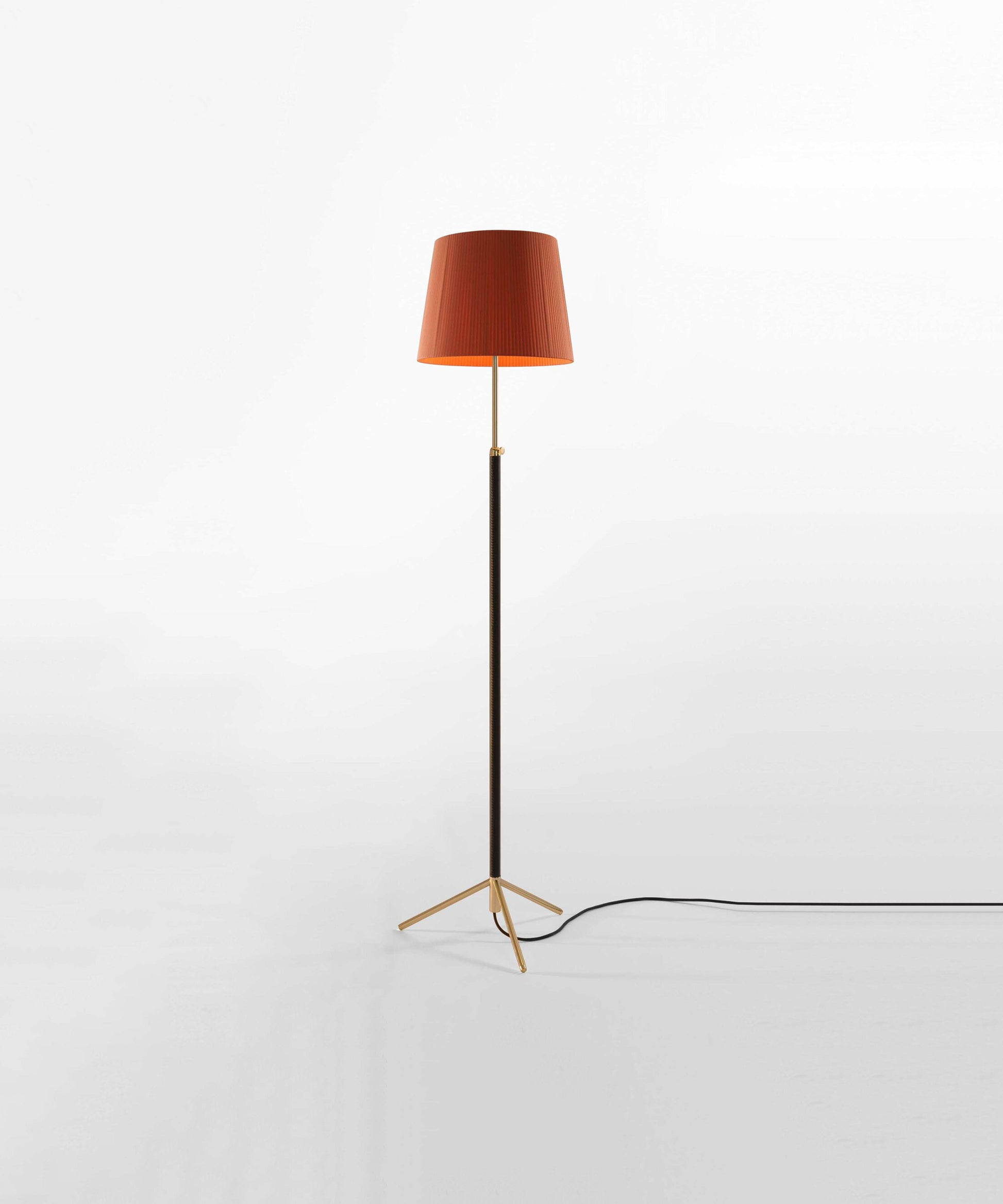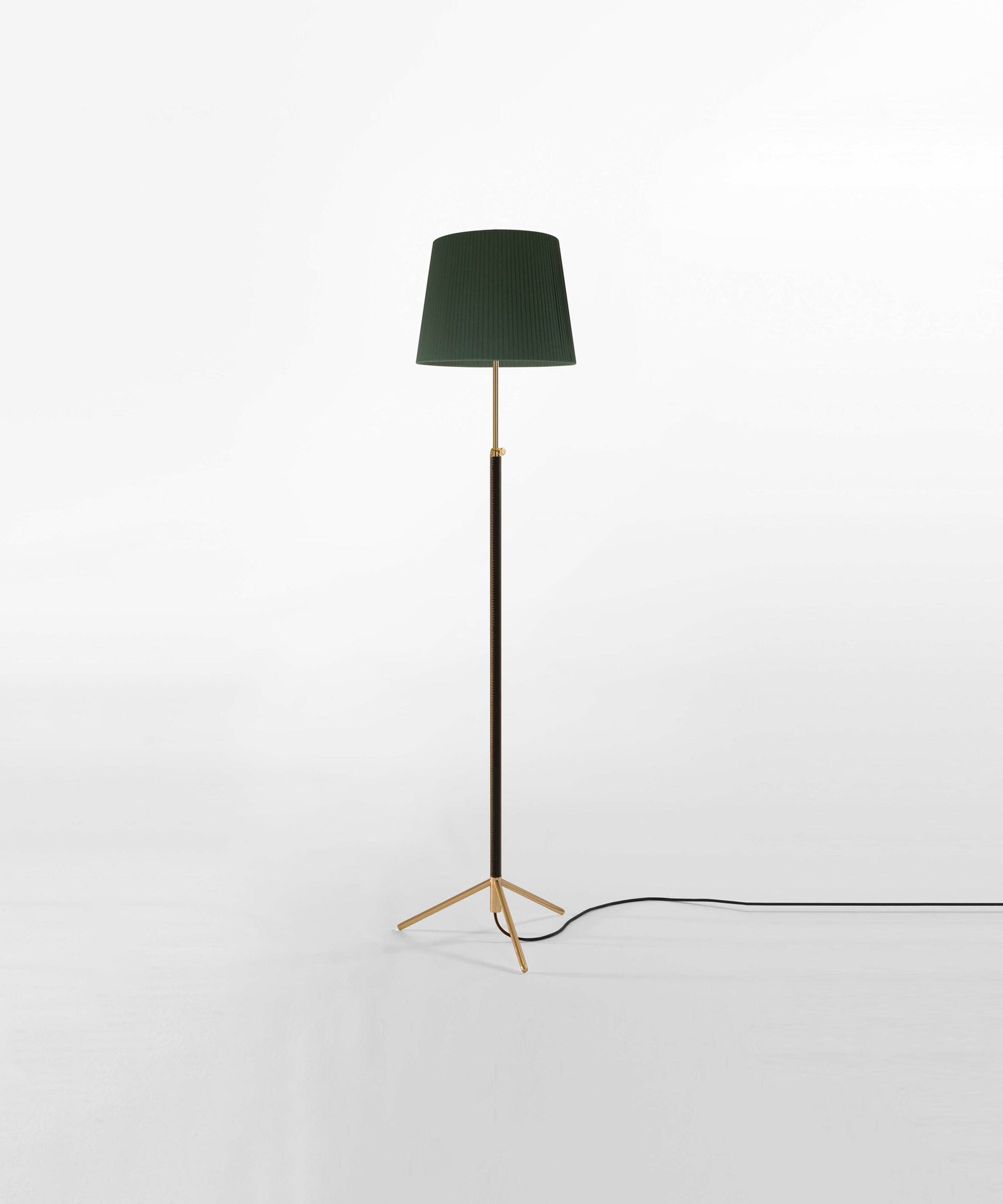 Sans focused on the design of furniture for his own household, which is how the remarkable Pie de Salón or Peana Molina lamps were created, and later edited by Santa & Cole. A sleek reinterpretation of traditional symmetrical lamps, with a chrome shaft. The stem of the lamp is adjustable and is leather-covered for a luxurious feel, opening up into a tripod base that allows the cable to easily go through. A perfect example of industrial craftsmanship. It features three distinct shades in three different materials and eight color options that exude timeless elegance
