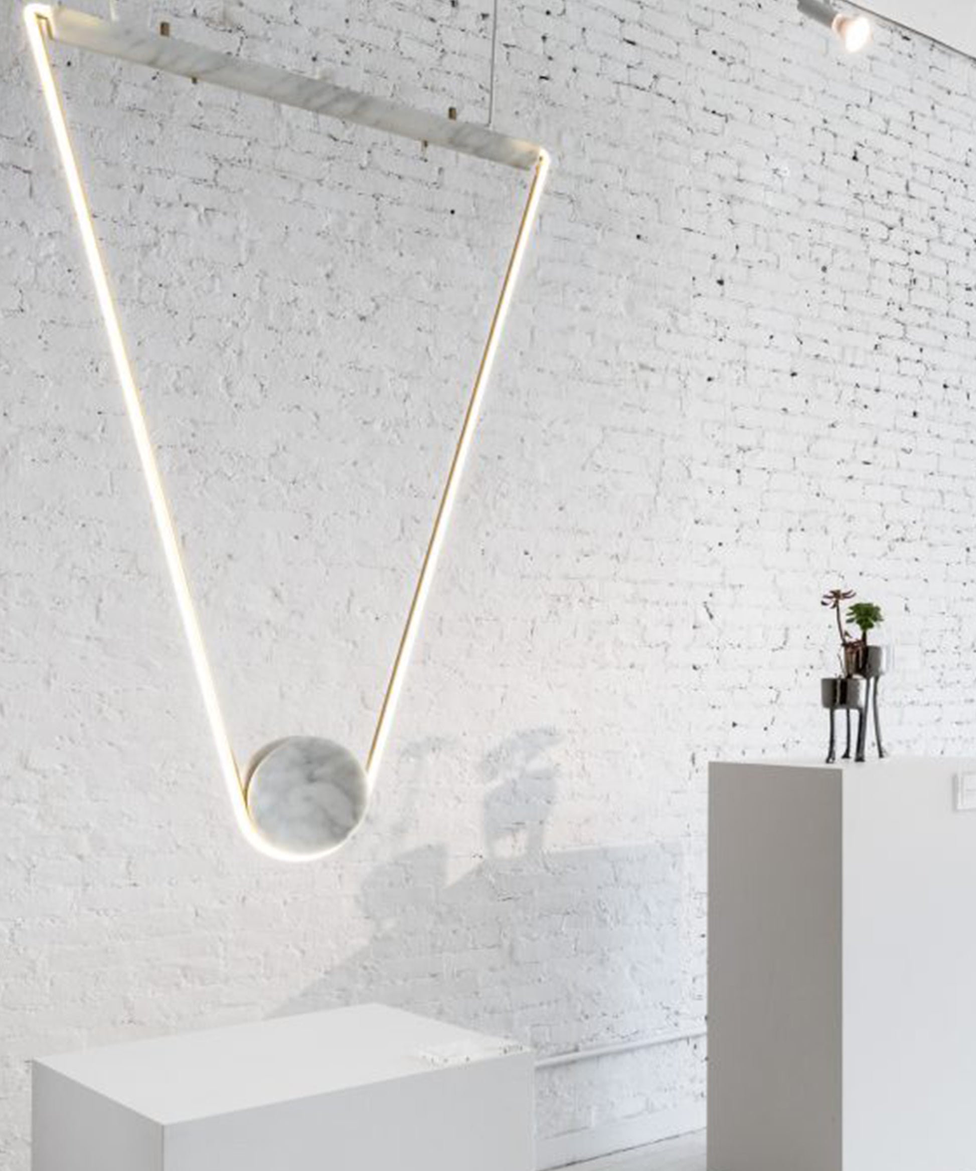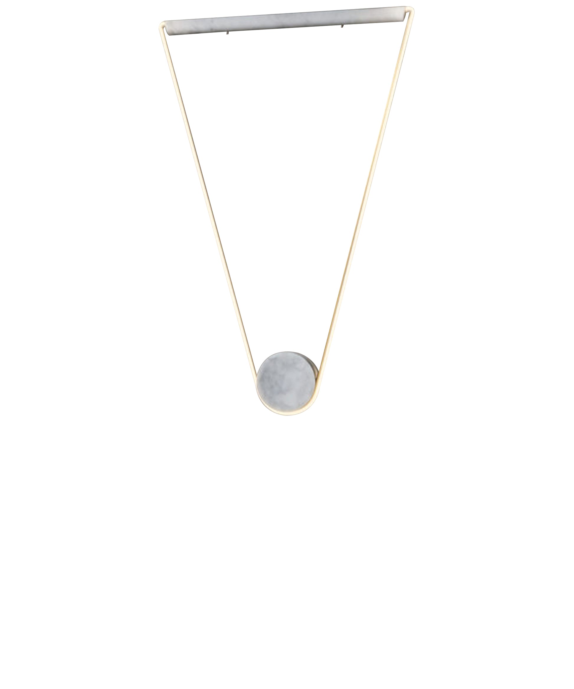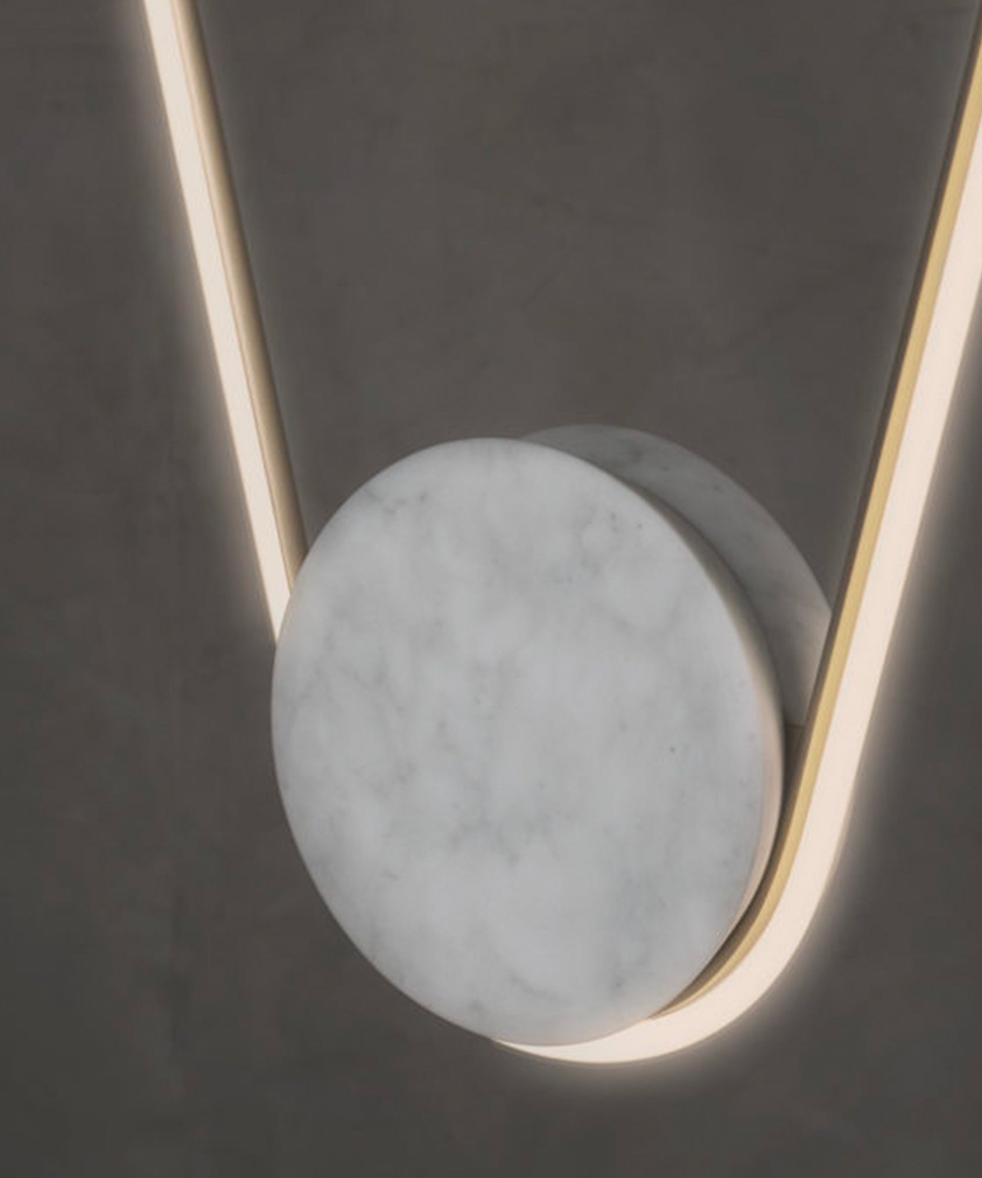The large pendants made of Carrera marble, neon, and brass play with the illusion of weight and strength.The 36" horizontal marble bar is the ceiling canopy and is installed flush to the ceiling.