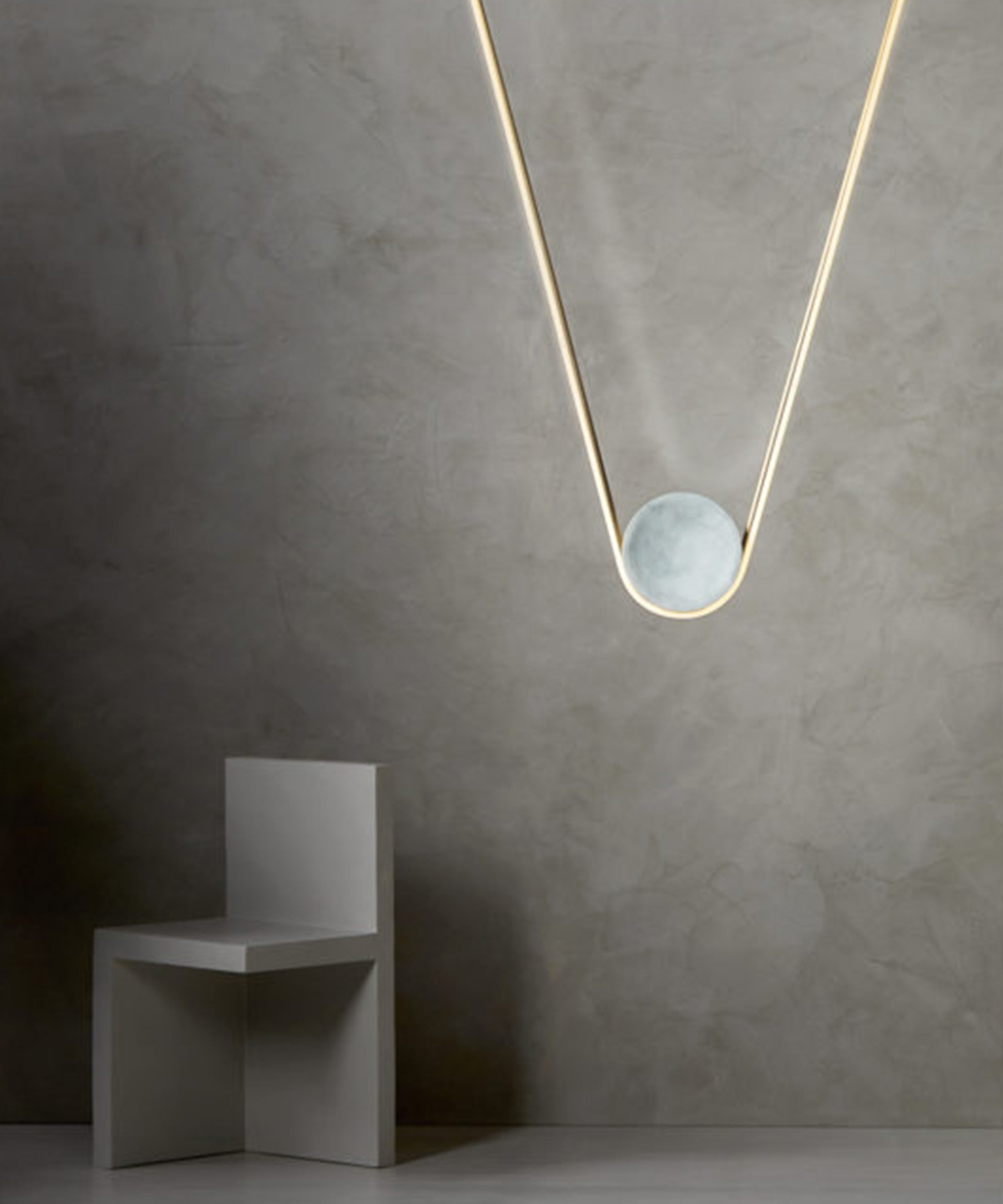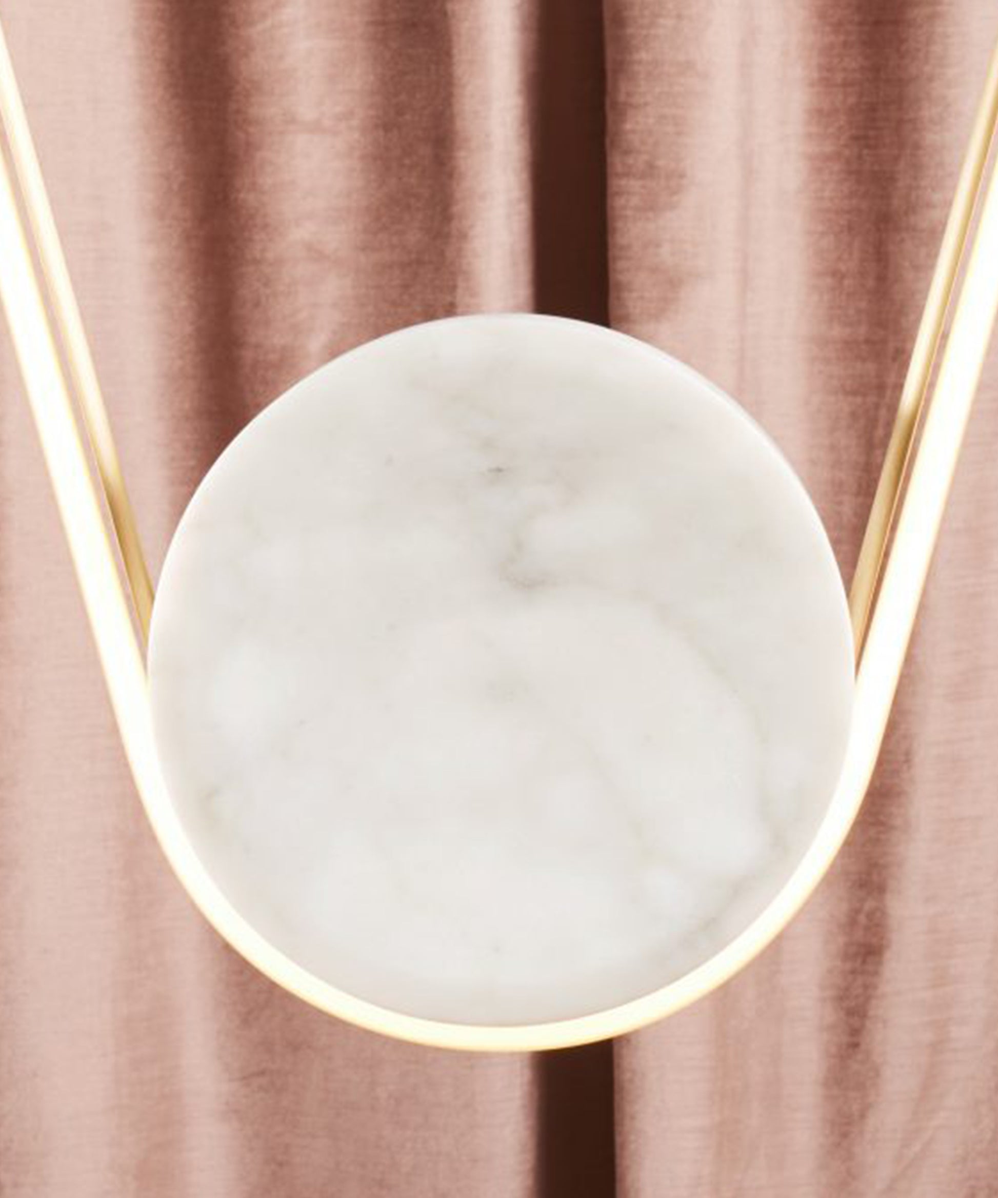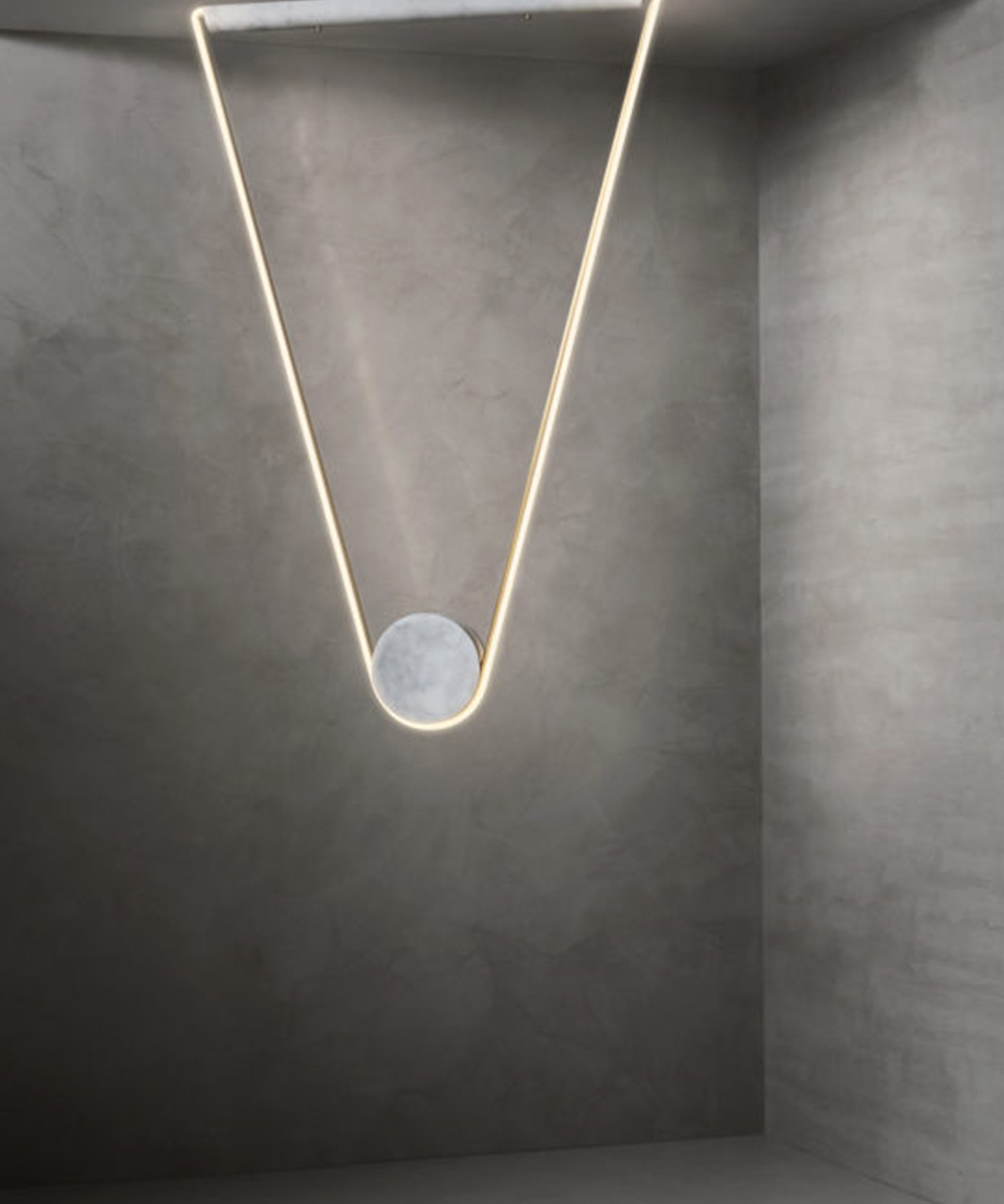 The large pendants made of Carrera marble, neon, and brass play with the illusion of weight and strength.The 36" horizontal marble bar is the ceiling canopy and is installed flush to the ceiling.