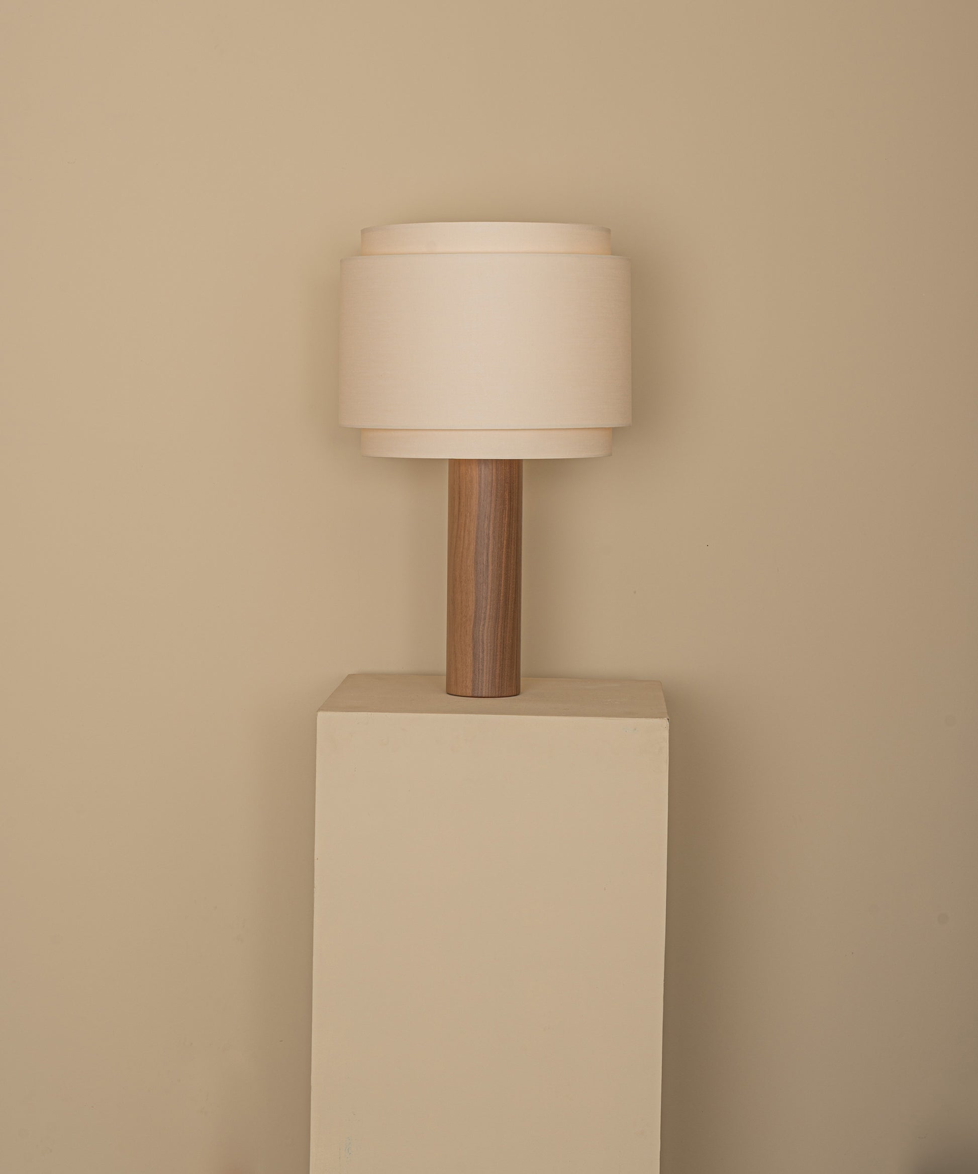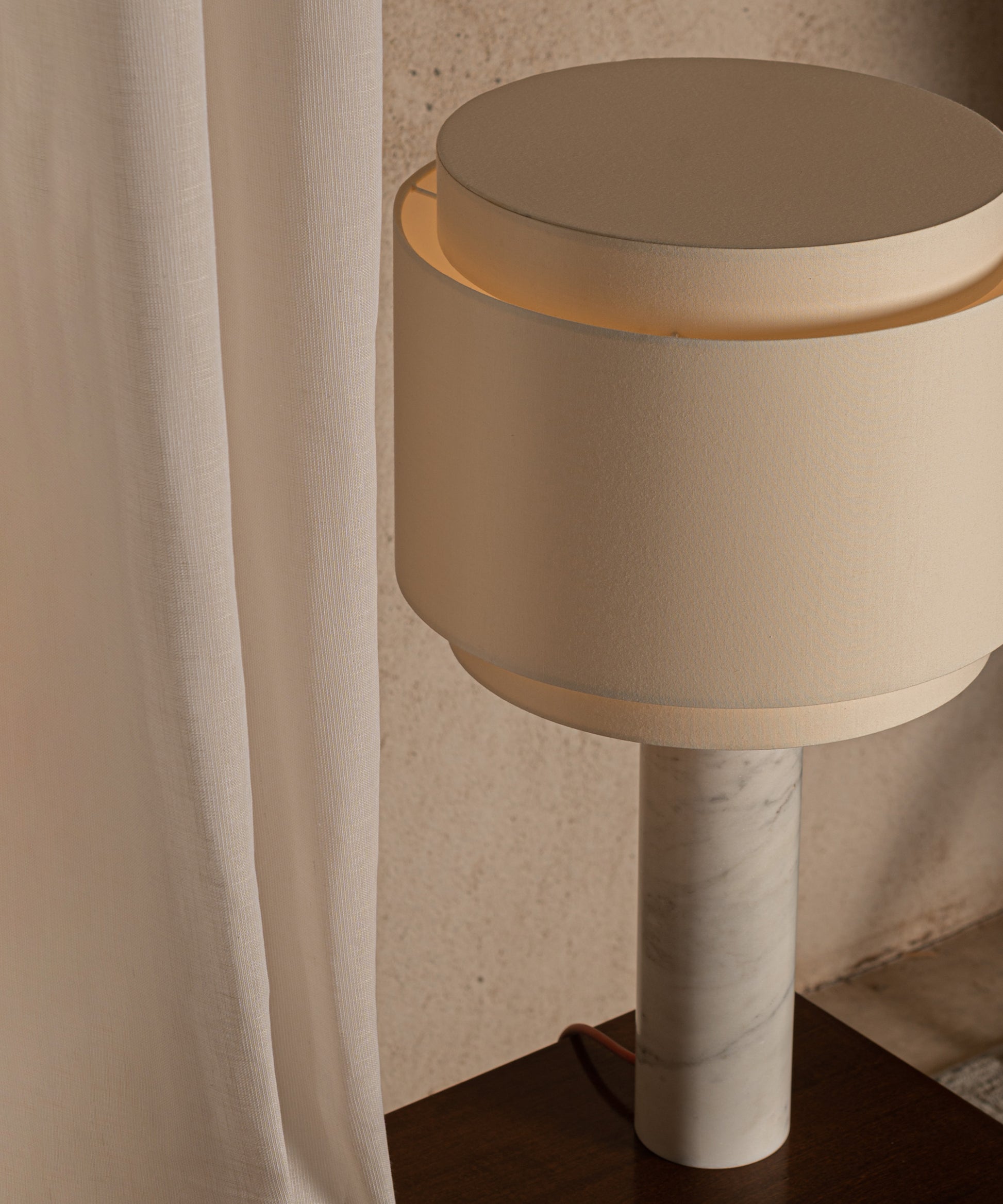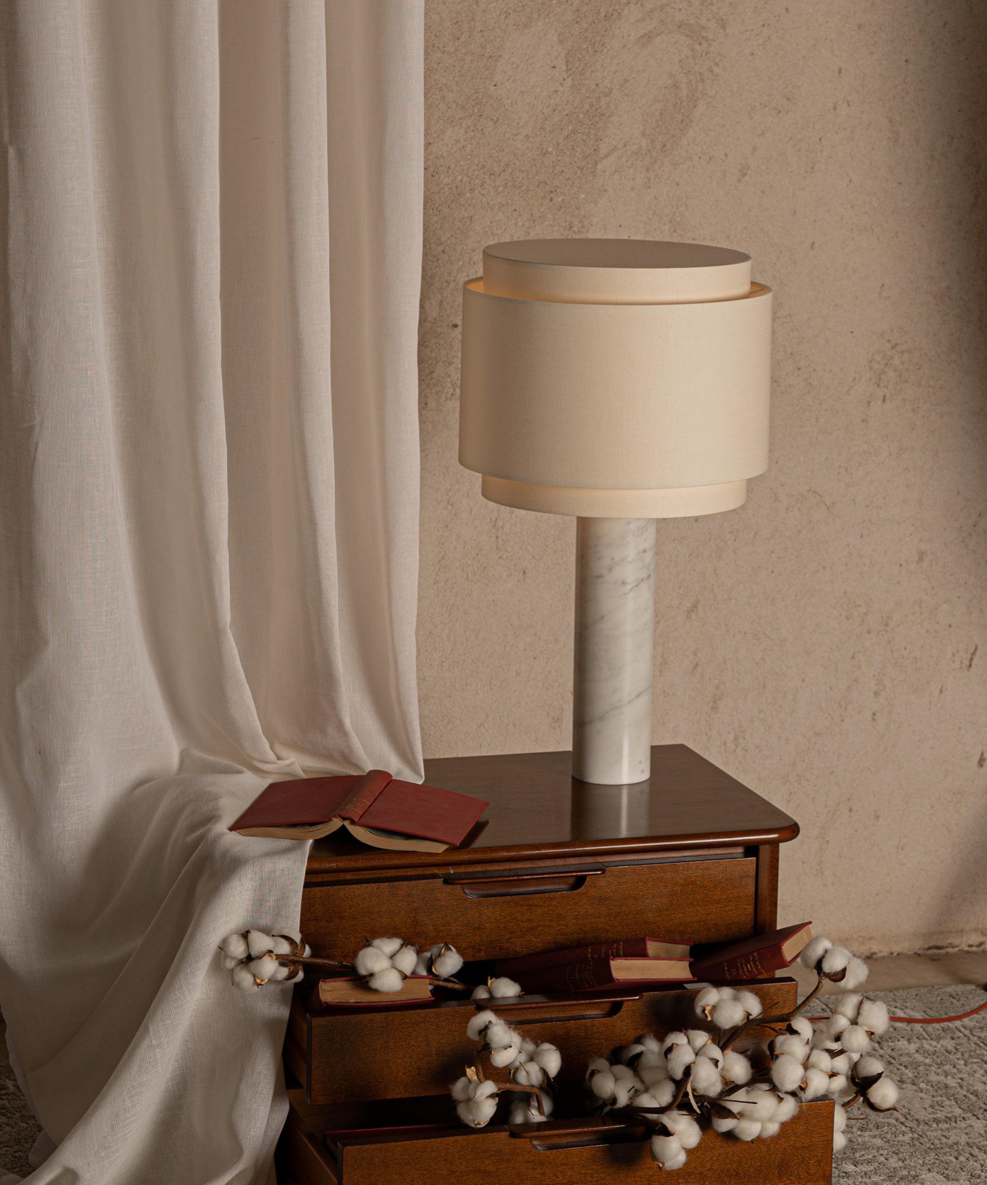 A unique lampshade in which geometries, materials, and superpositions merge to diffuse a soft light, sitting on the edge of a marble or wooden cylinder.
