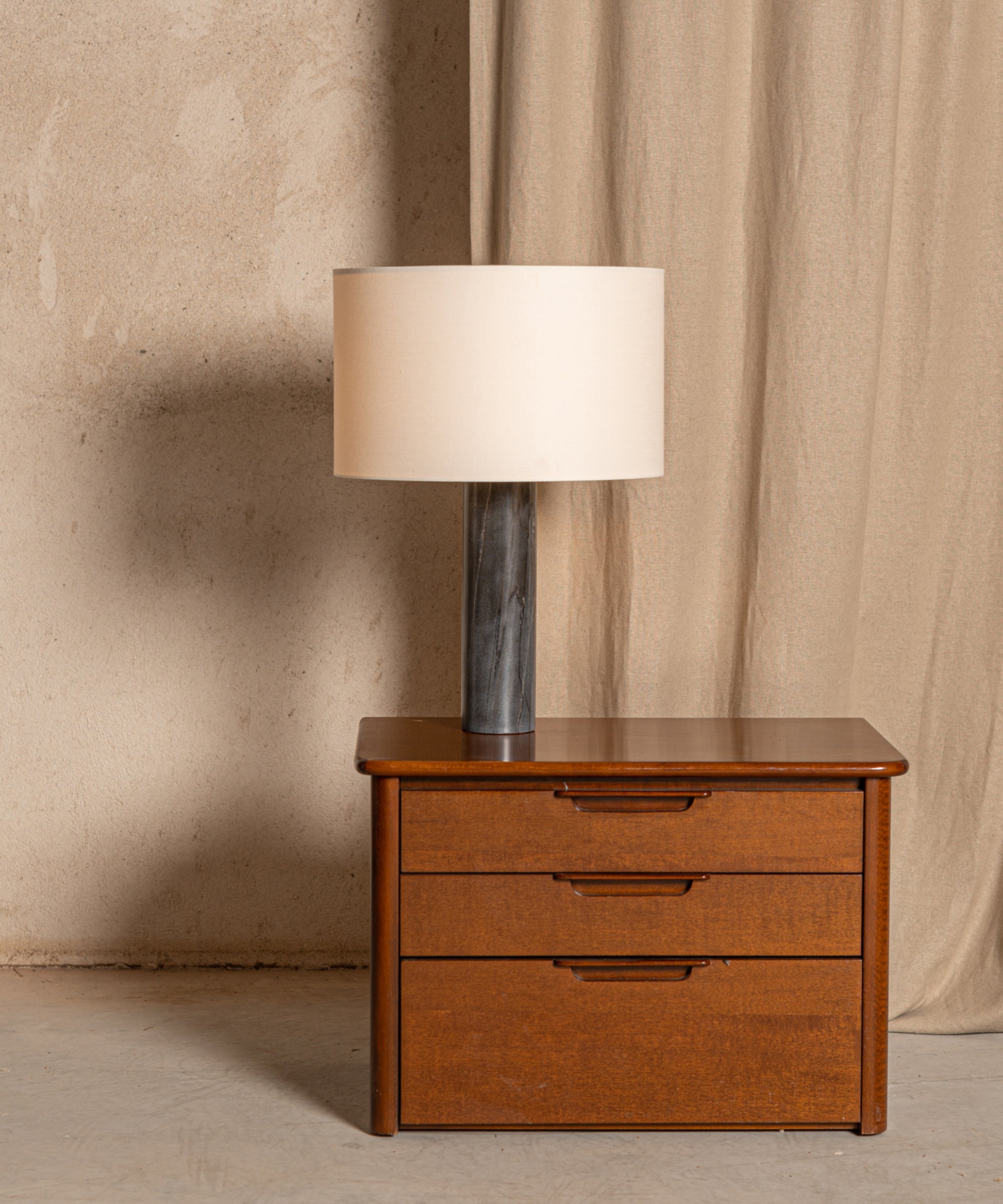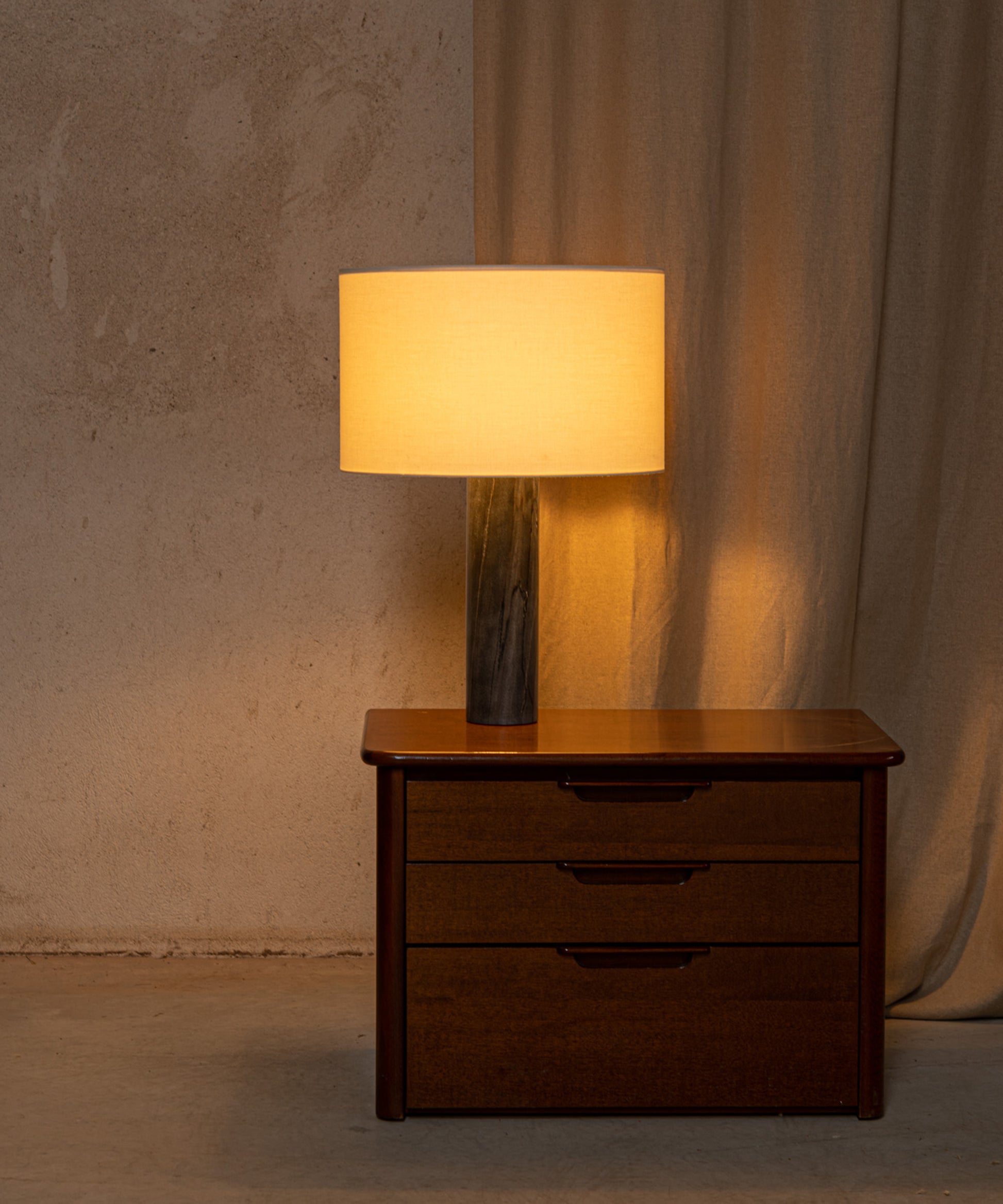 A selection of natural marble or hardwood colors match Simone & Marcel's unique cotton drum lampshade.
