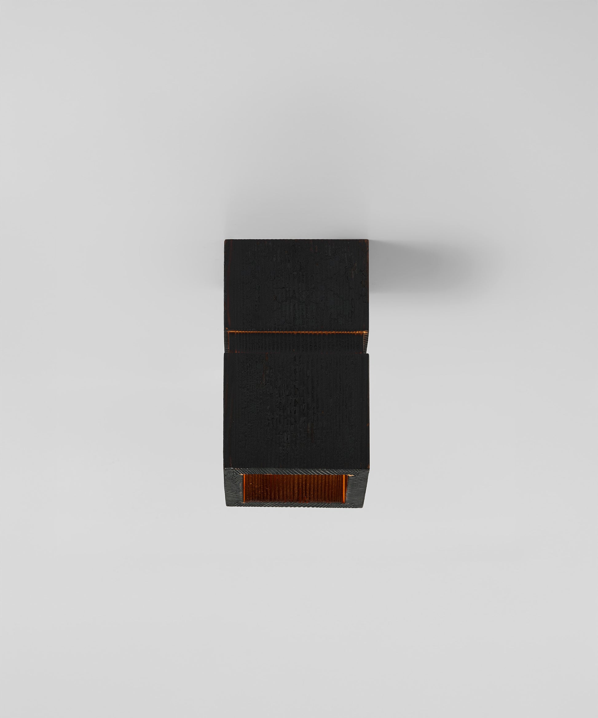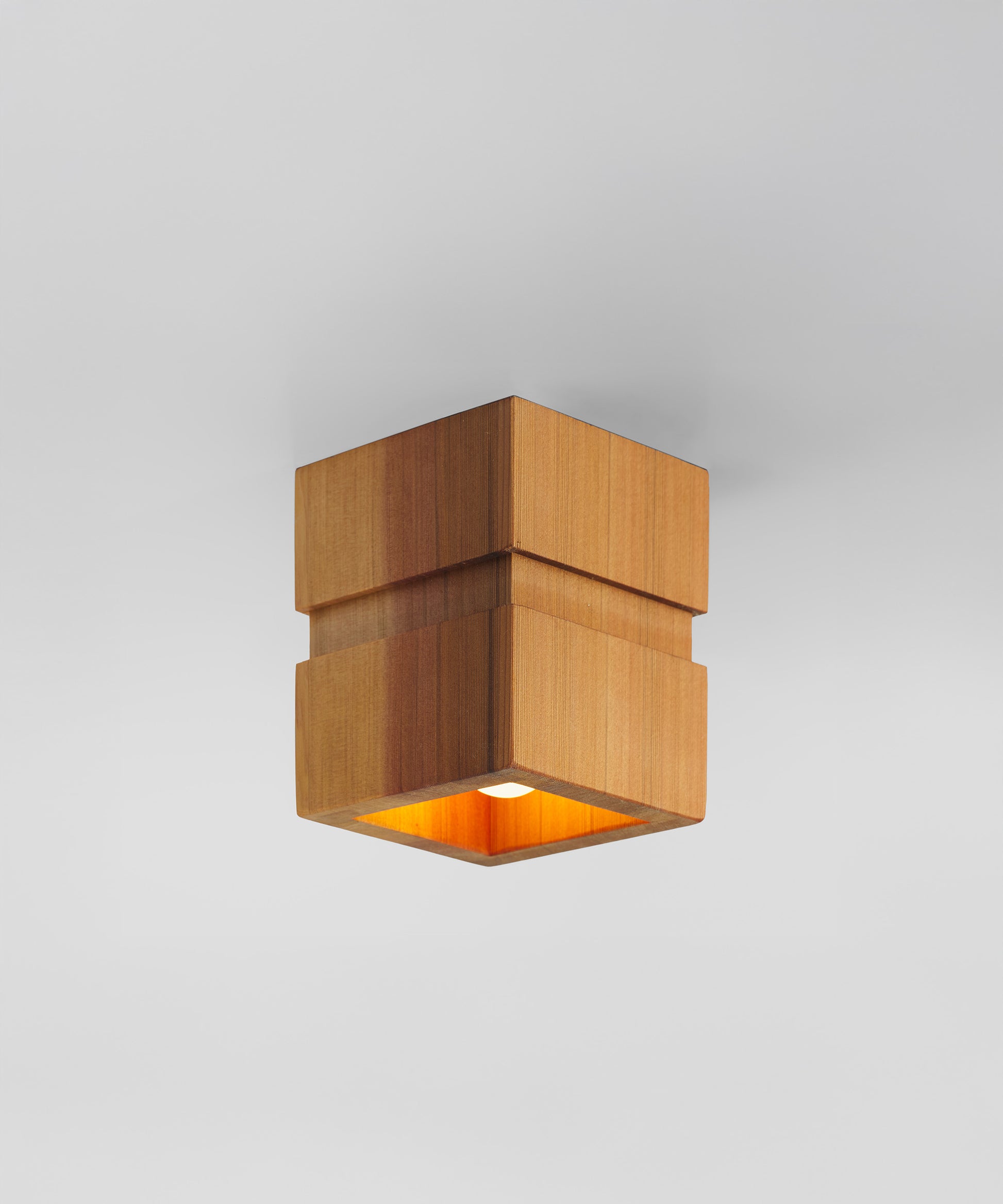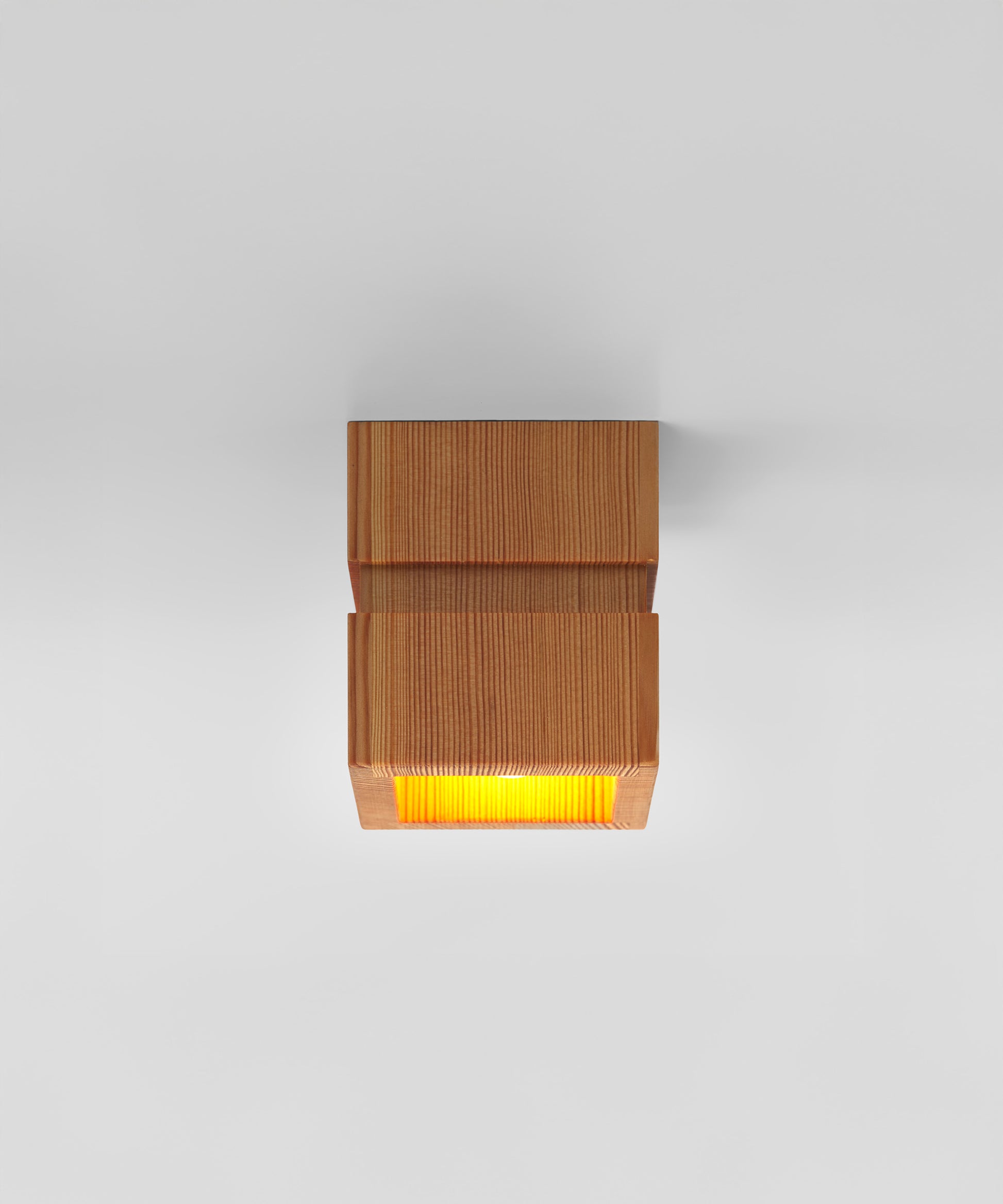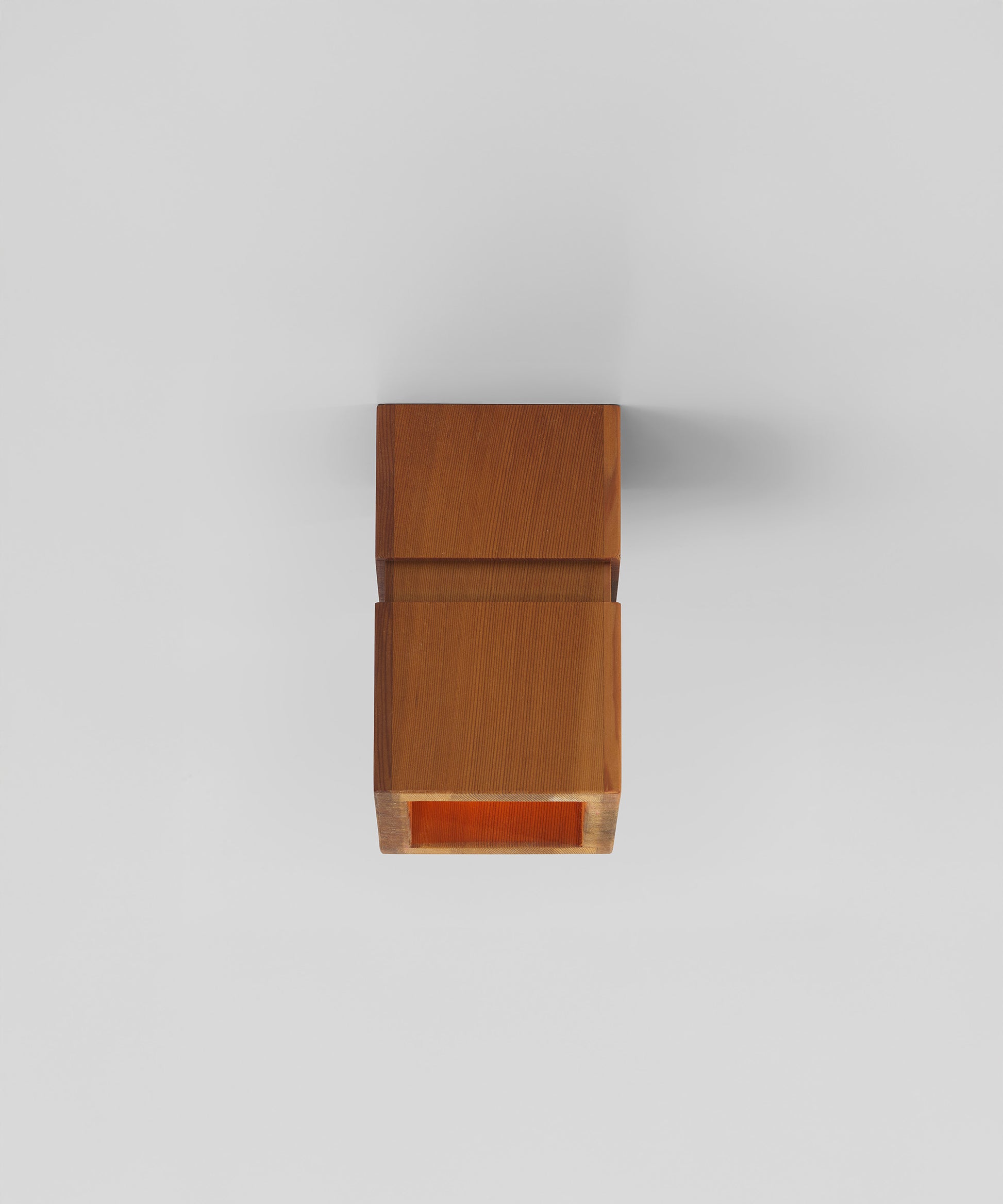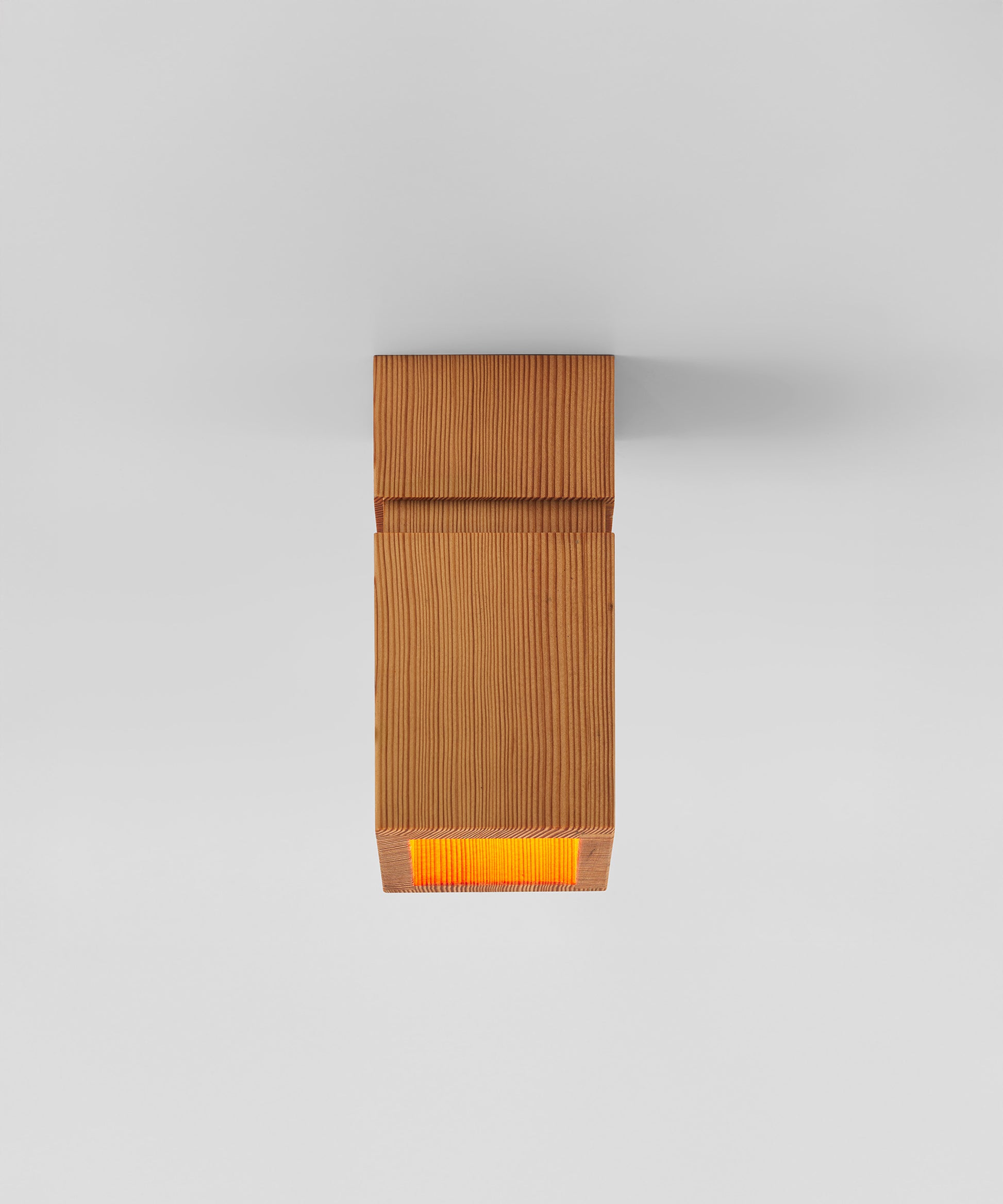 The flush mounts are composed of two rectangular elements in the same proportions as the table lamp. The lamp is pulled up into the fixture to illuminate the wood within the rectangular barrel. Designed for both indoor and outdoor use, the fixtures are quiet elements that bring warmth to the ceiling plane. Flush mounts are available in three sizes.