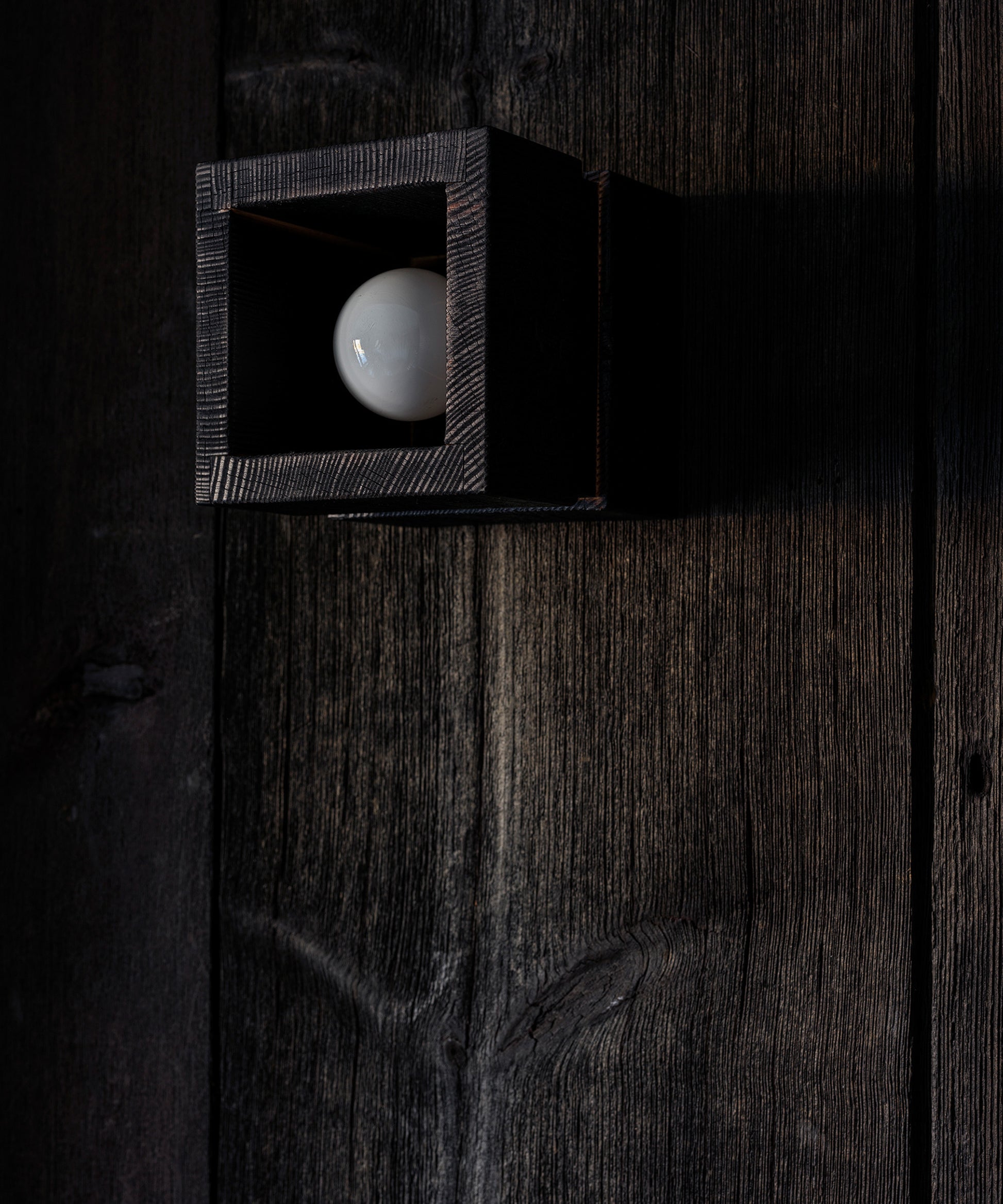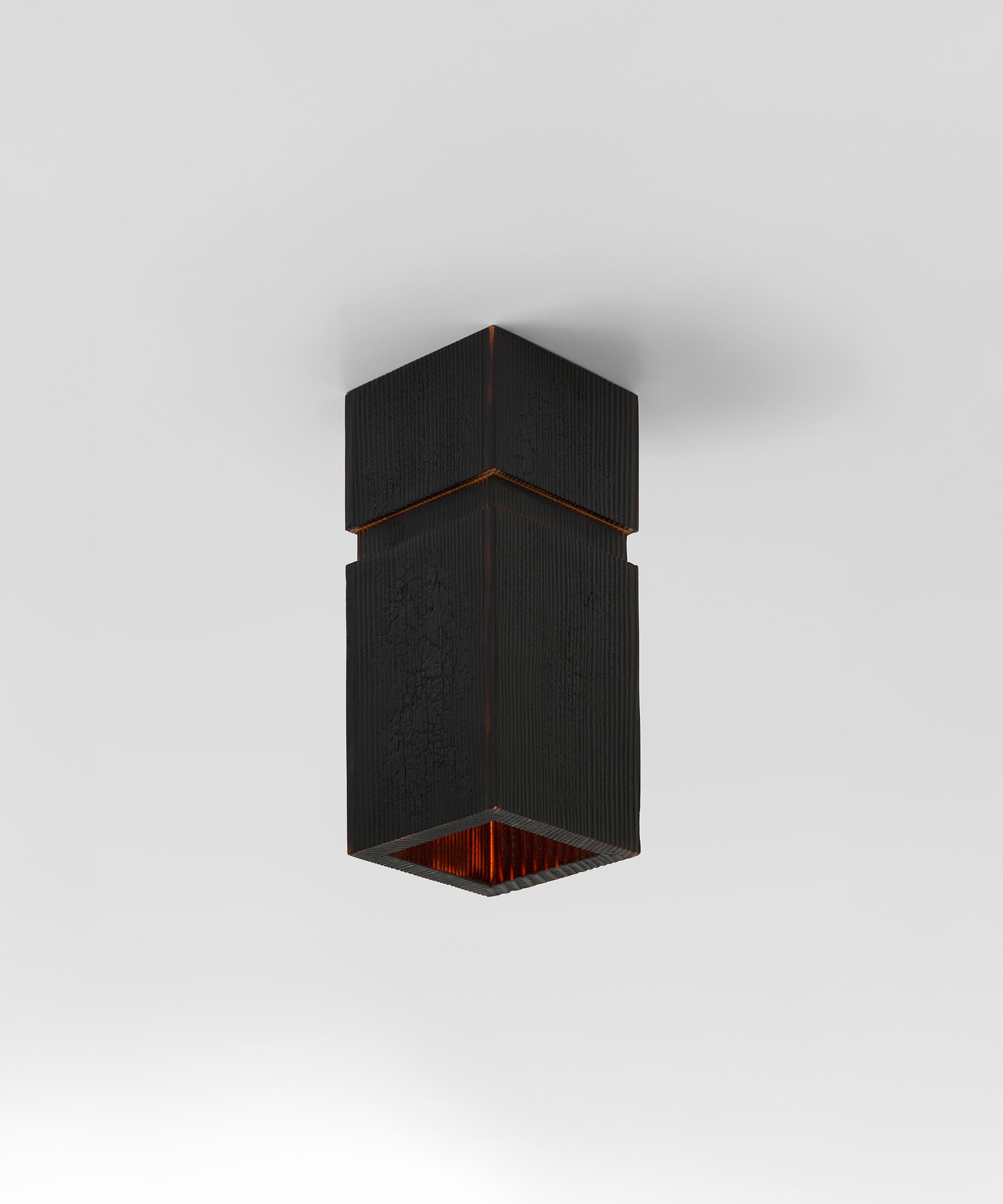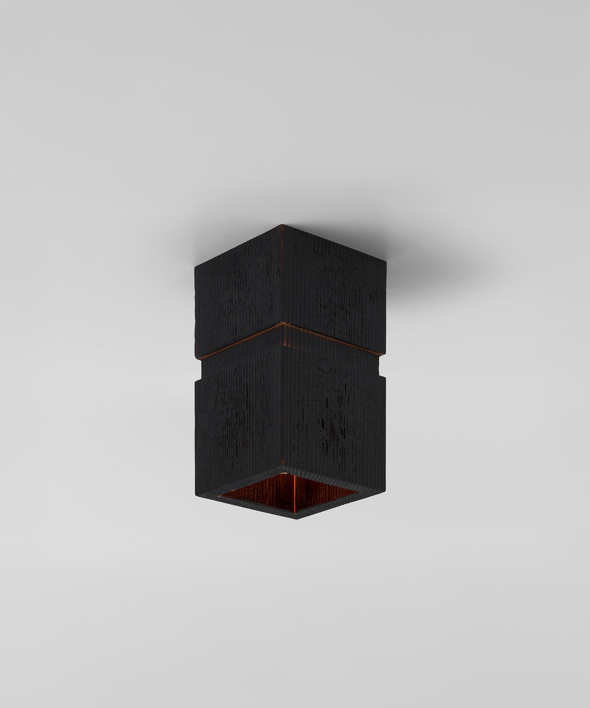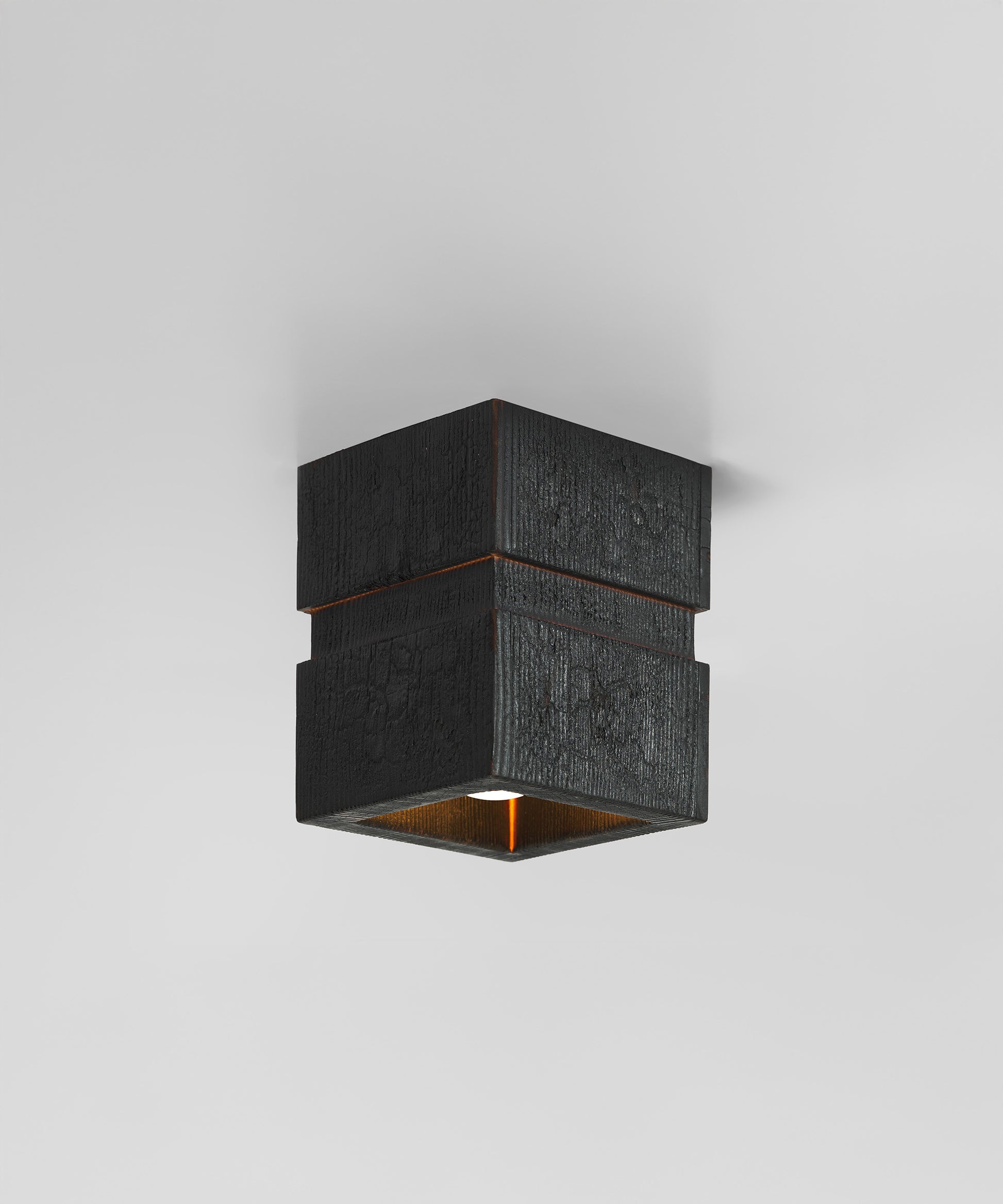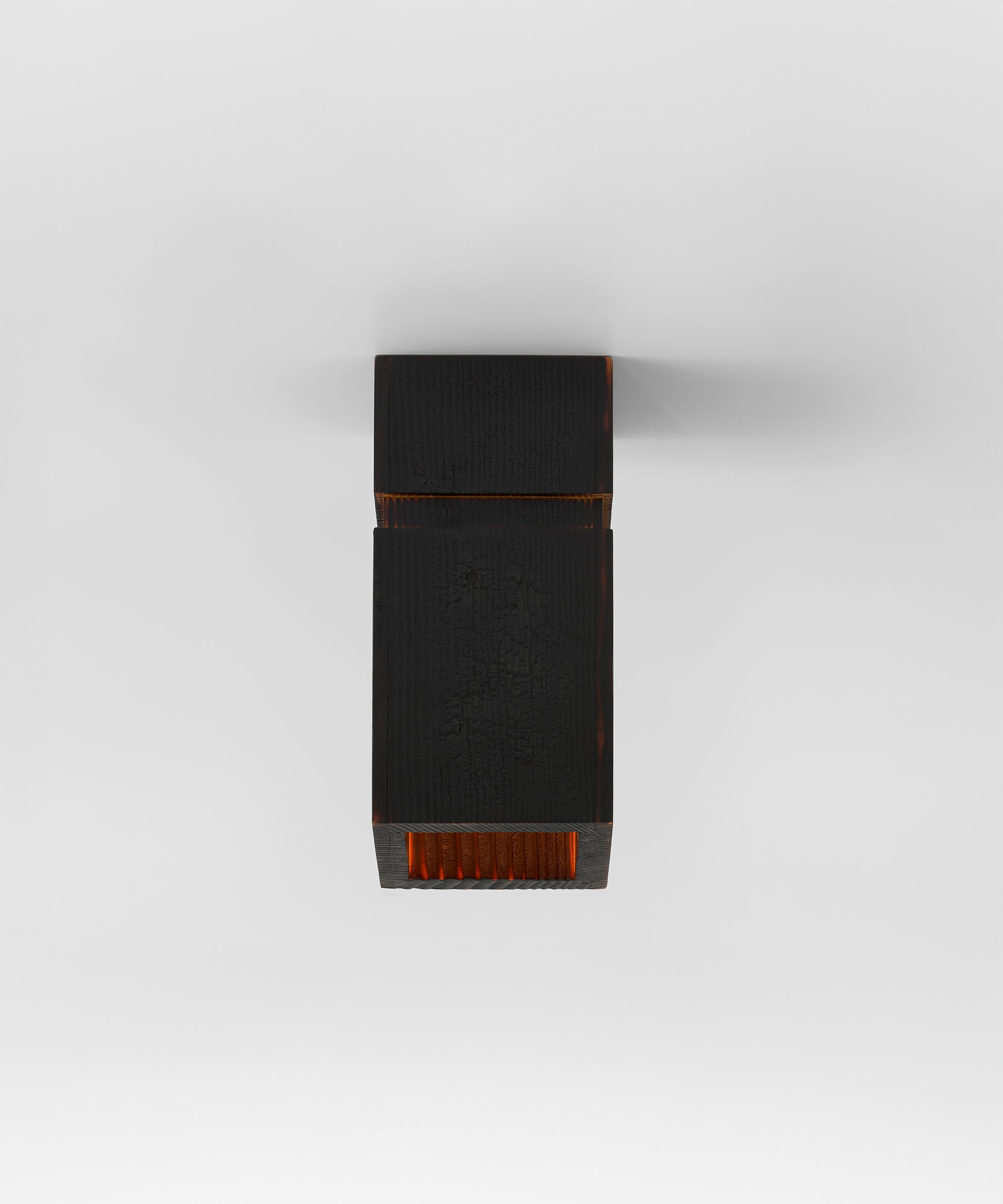 The flush mounts are composed of two rectangular elements in the same proportions as the table lamp. The lamp is pulled up into the fixture to illuminate the wood within the rectangular barrel. Designed for both indoor and outdoor use, the fixtures are quiet elements that bring warmth to the ceiling plane. Flush mounts are available in three sizes.