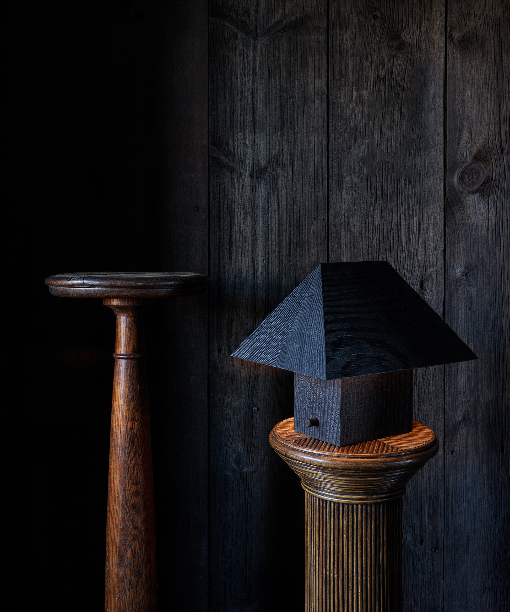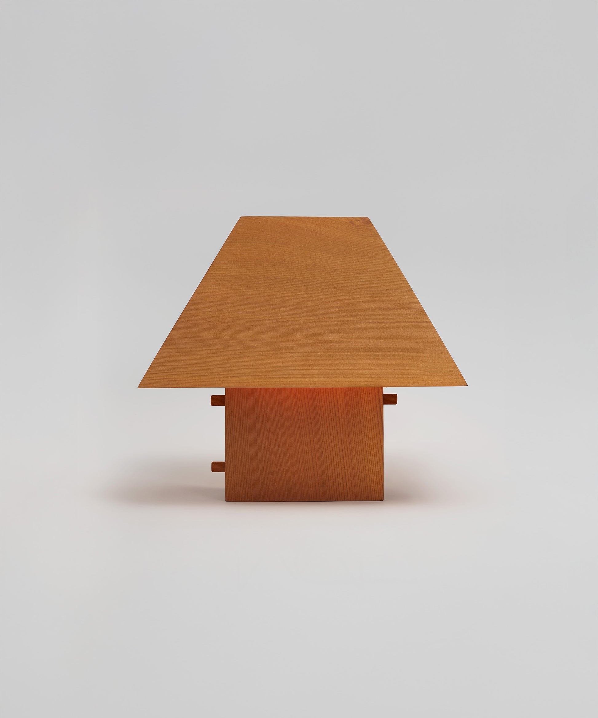 The table lamp is conceived of two elemental forms, a pyramidal shade and a rectangular base. Both elements are carved from single pieces of timber, a feat that takes both skill of craft and sourcing of a scale of material. The lamping within the base is affixed by a wooden peg, a reference to traditional mortise and tenon timber joinery of early barns and historic wood structures. The peg language is also utilized in the form of a dimmer that controls the fixture’s light output. When lit at night, the pyramidal shape fades into the dark, so that it mysteriously illuminates the orthogonal base and highlights the unique character of each heirloom-grade fixture.
